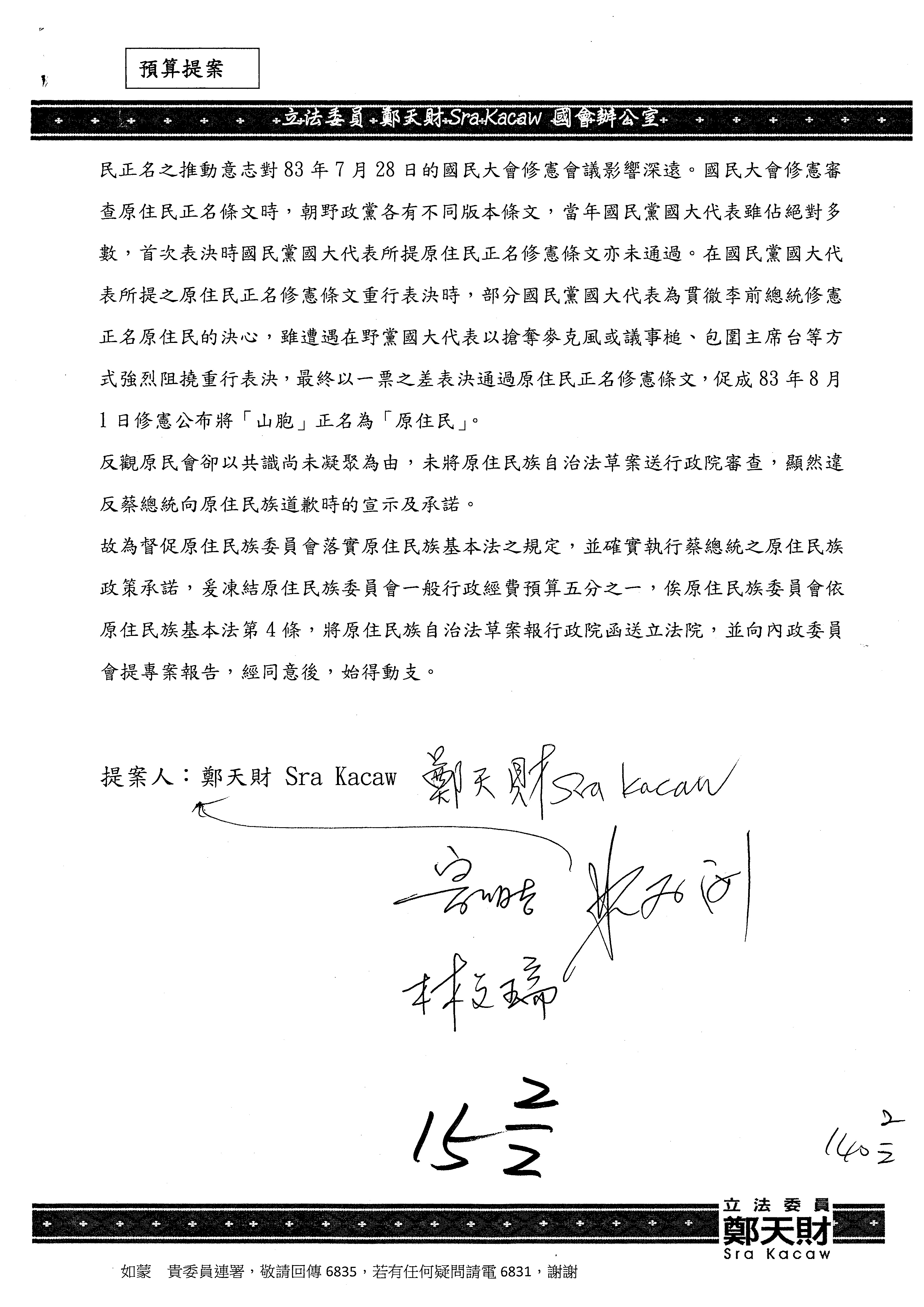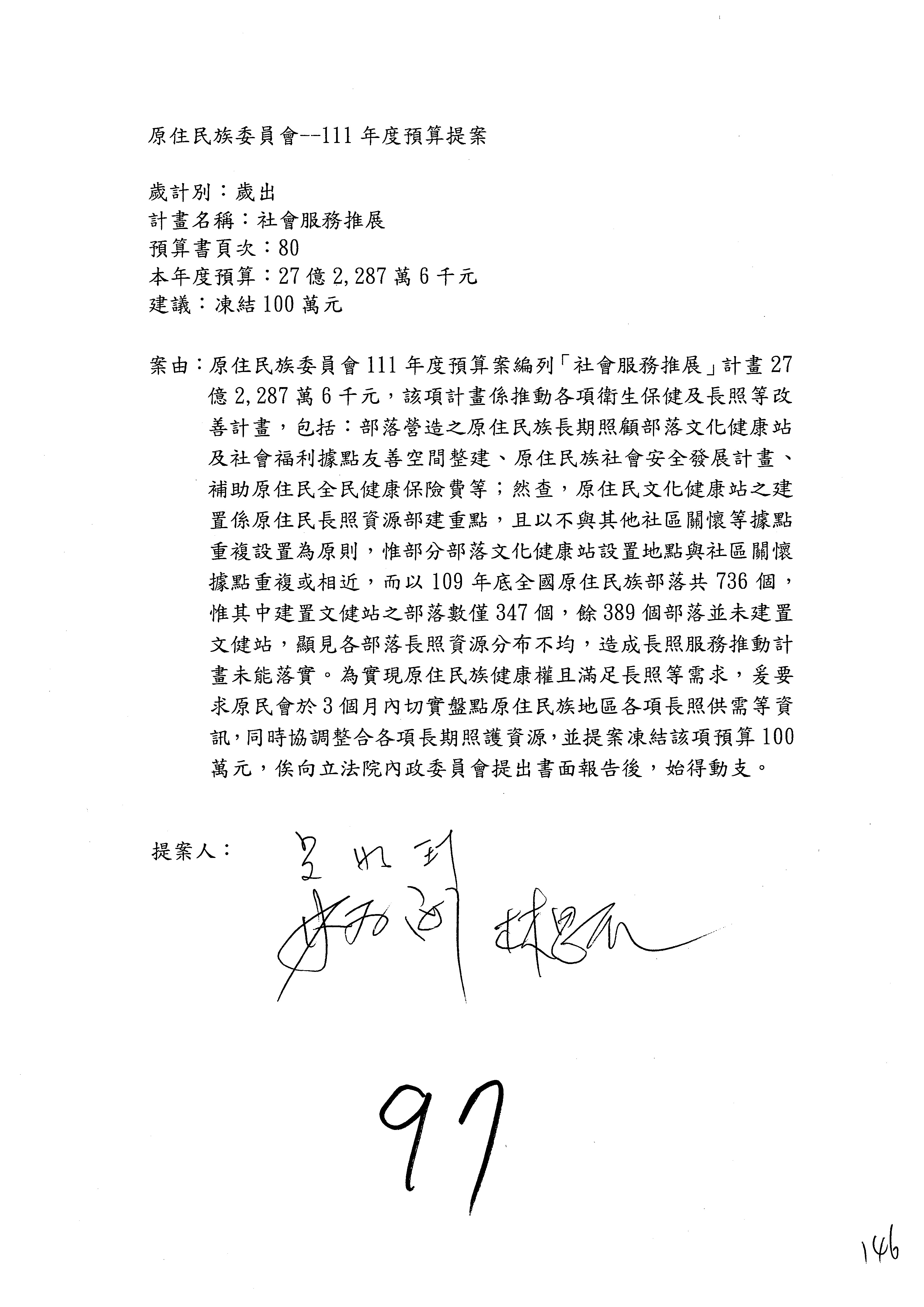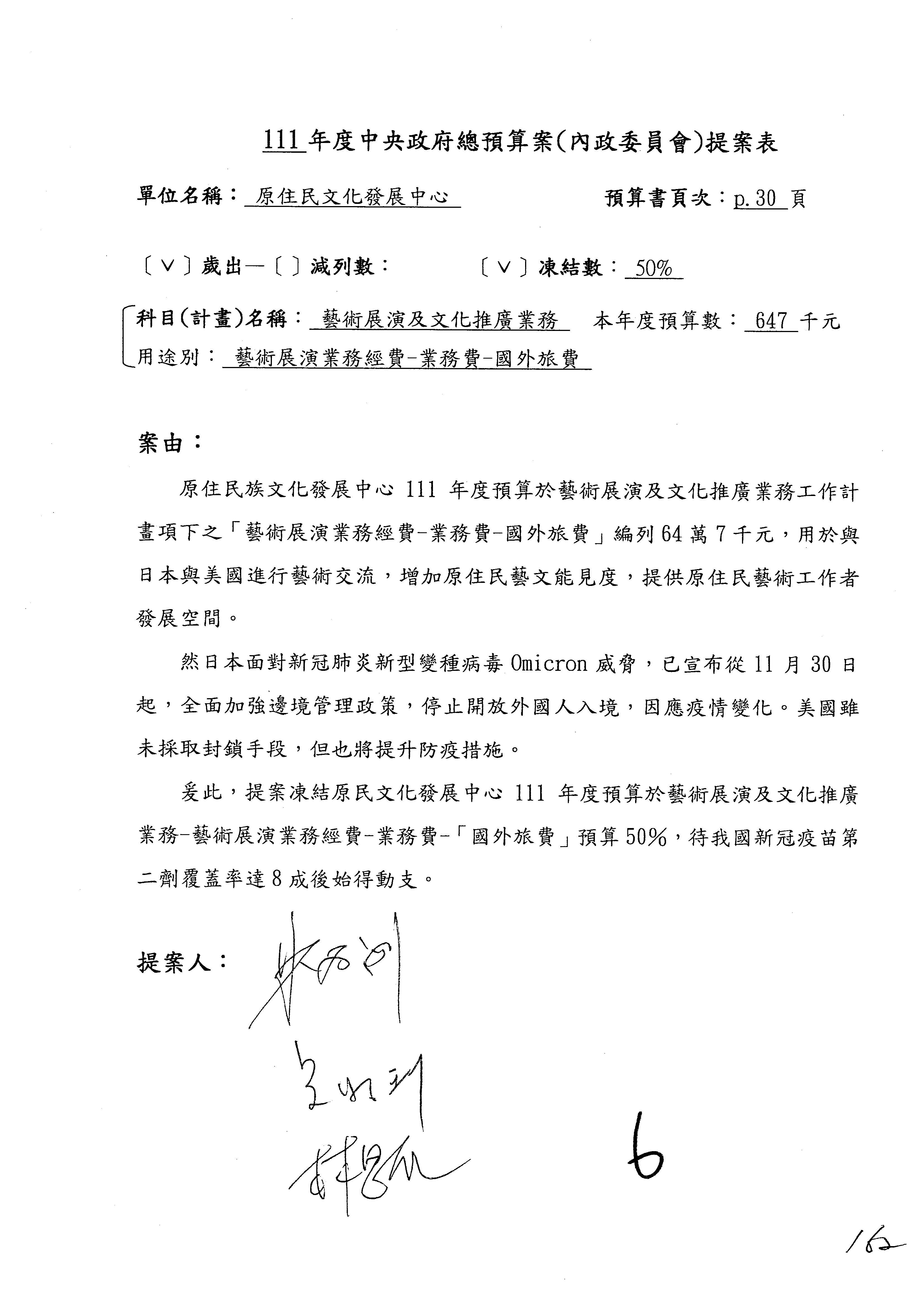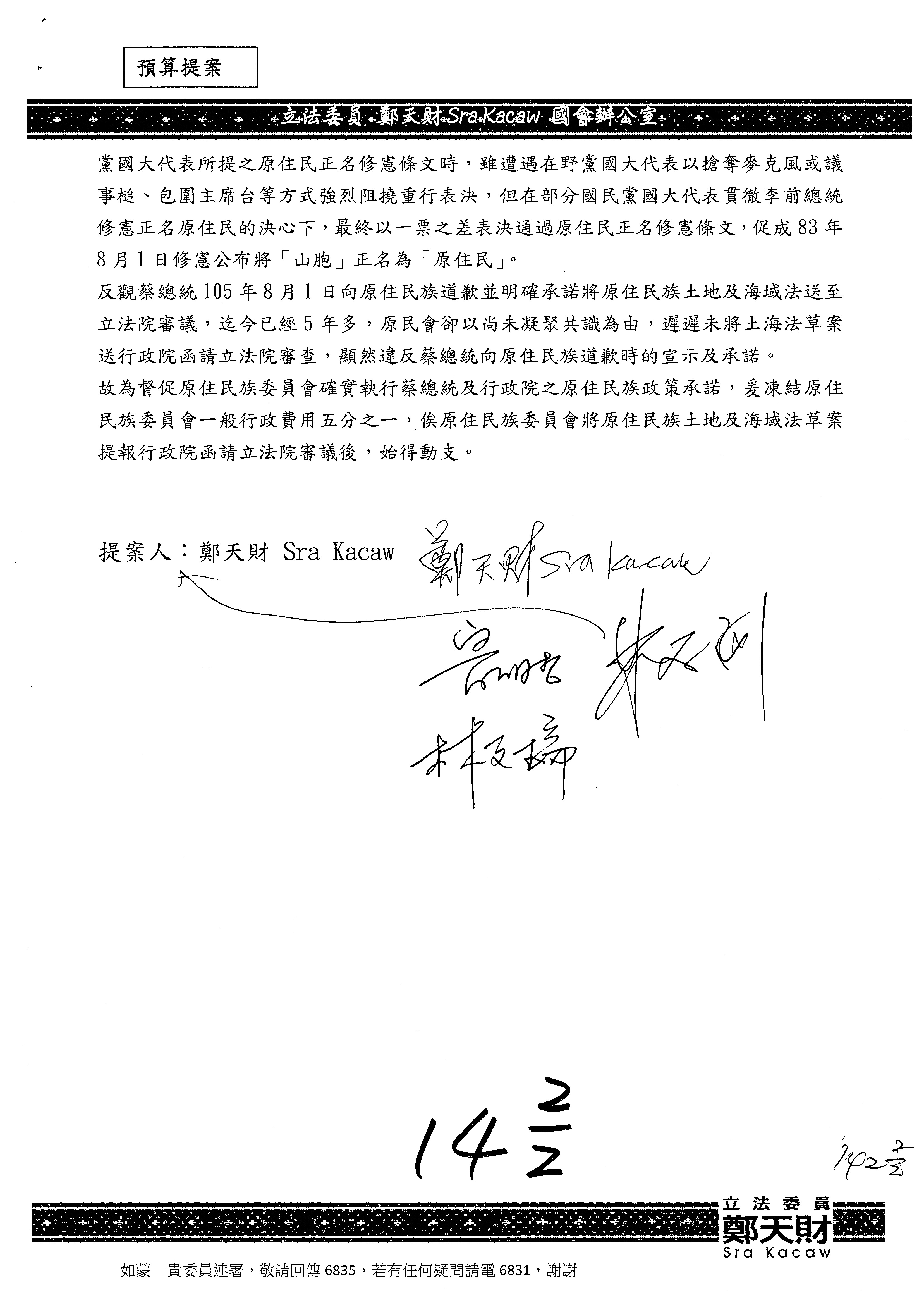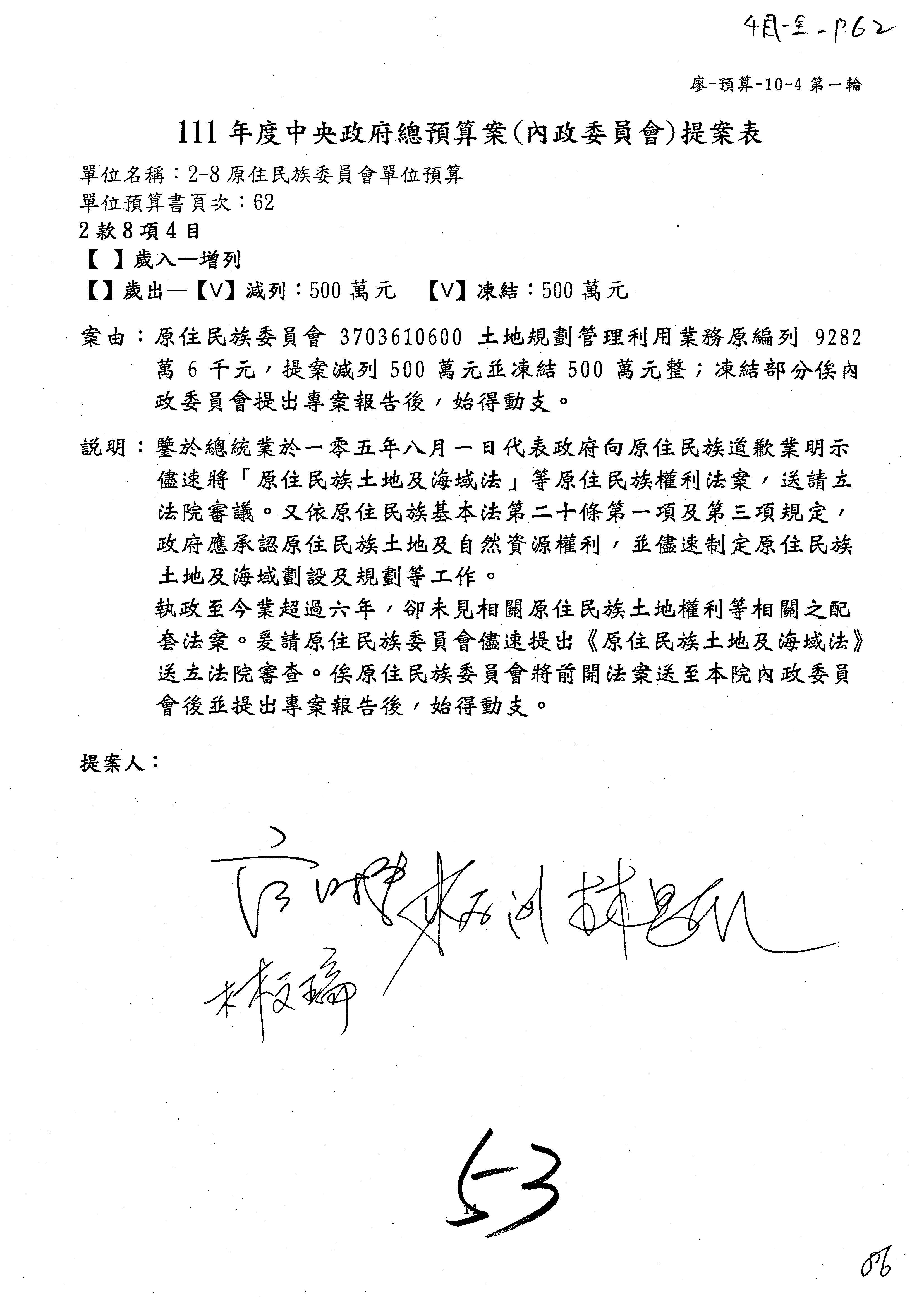 主席:好,跟大家先宣告一下,110年度中央政府總預算案關於原住民族委員會、原住民族文化發展中心預算,詢答的部分已經在110年12月1日完成,今天就直接進行預算之處理。