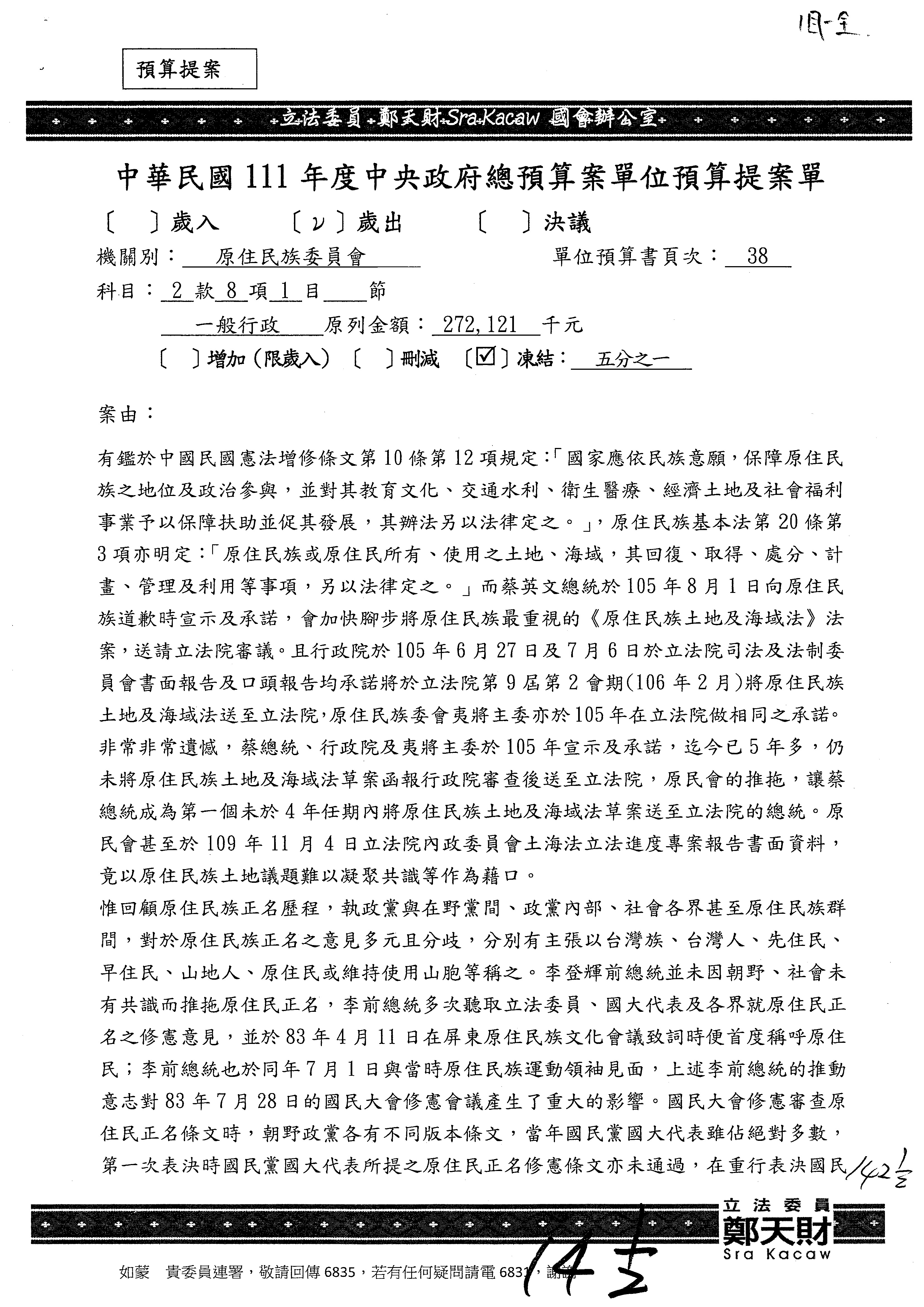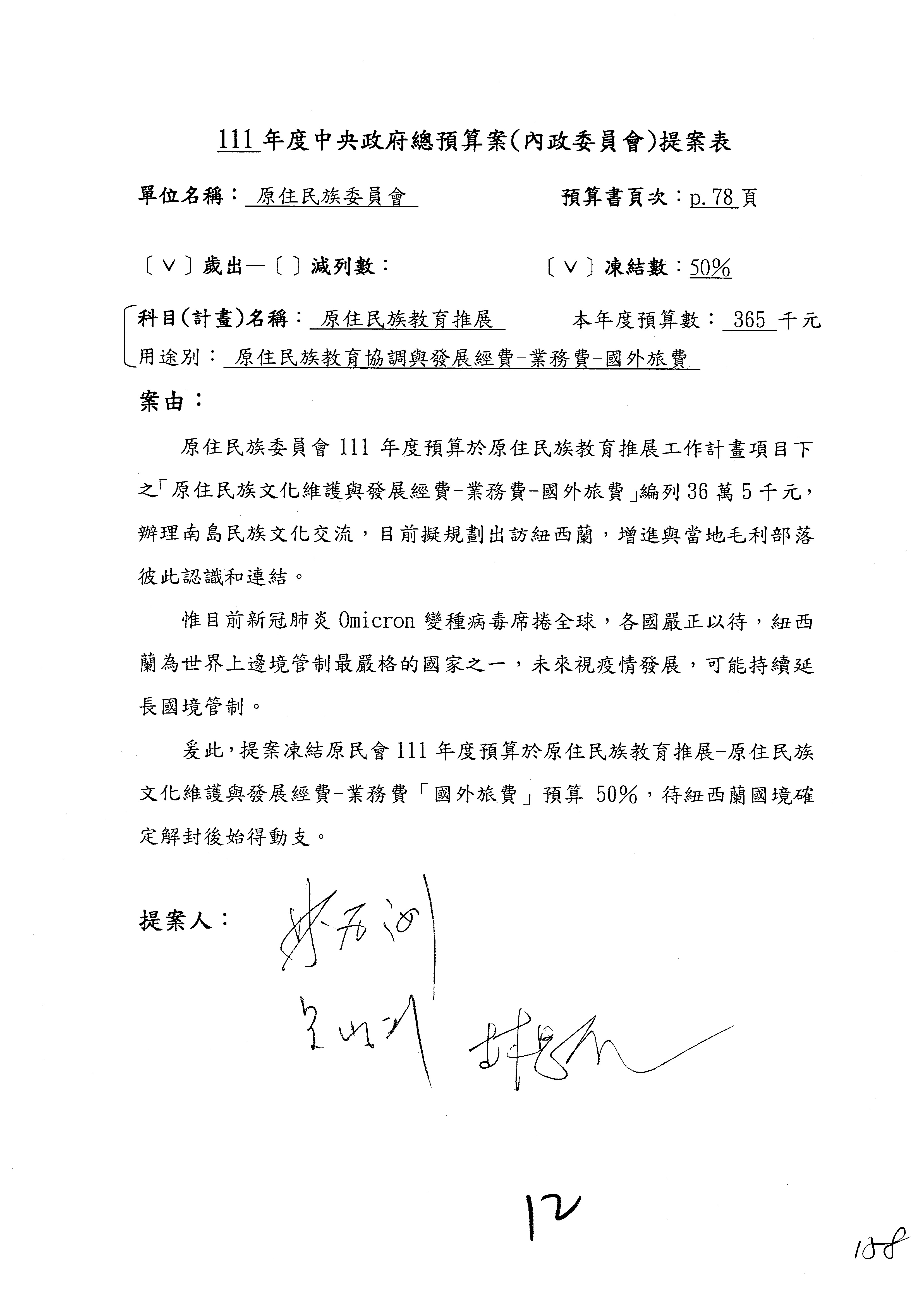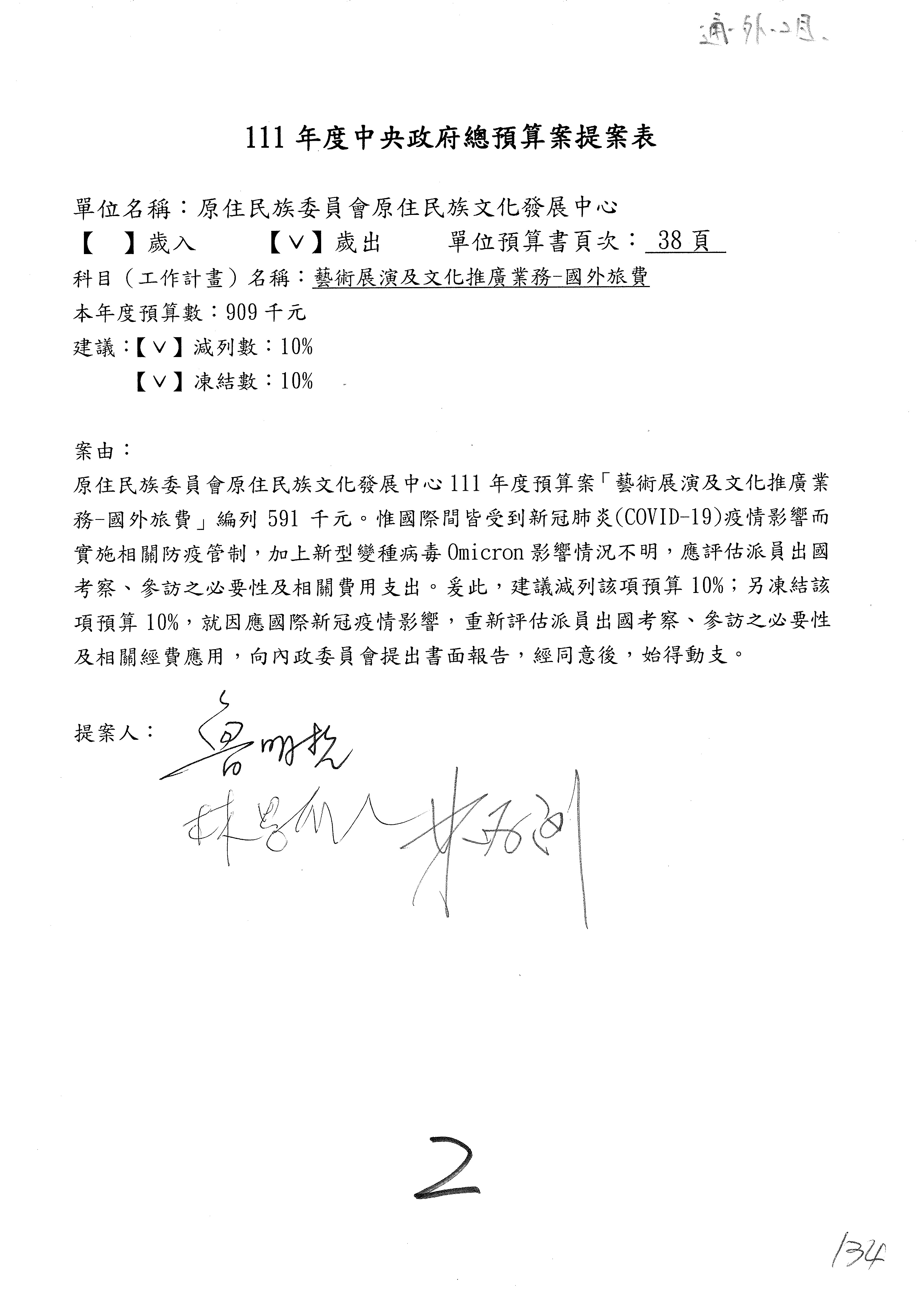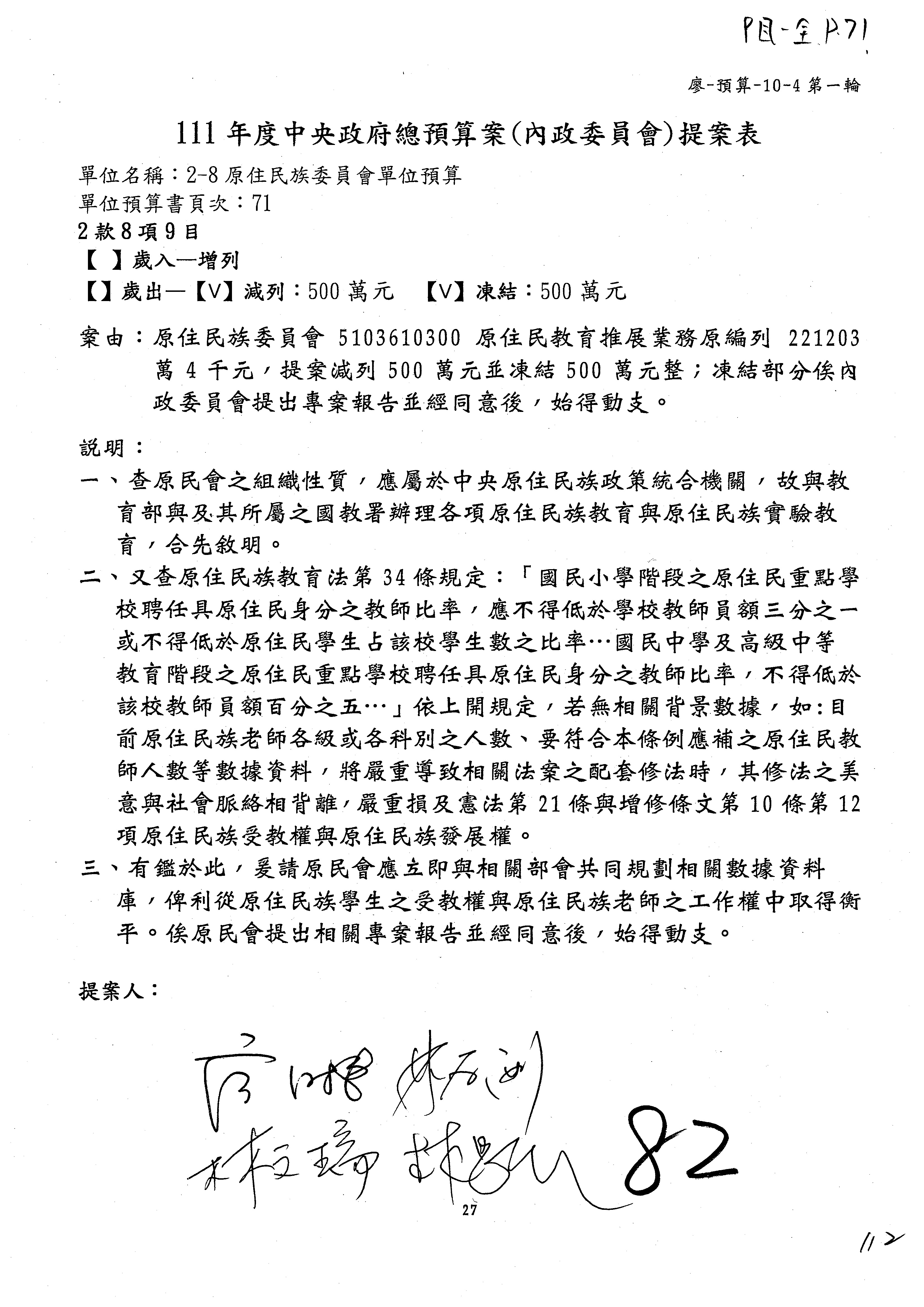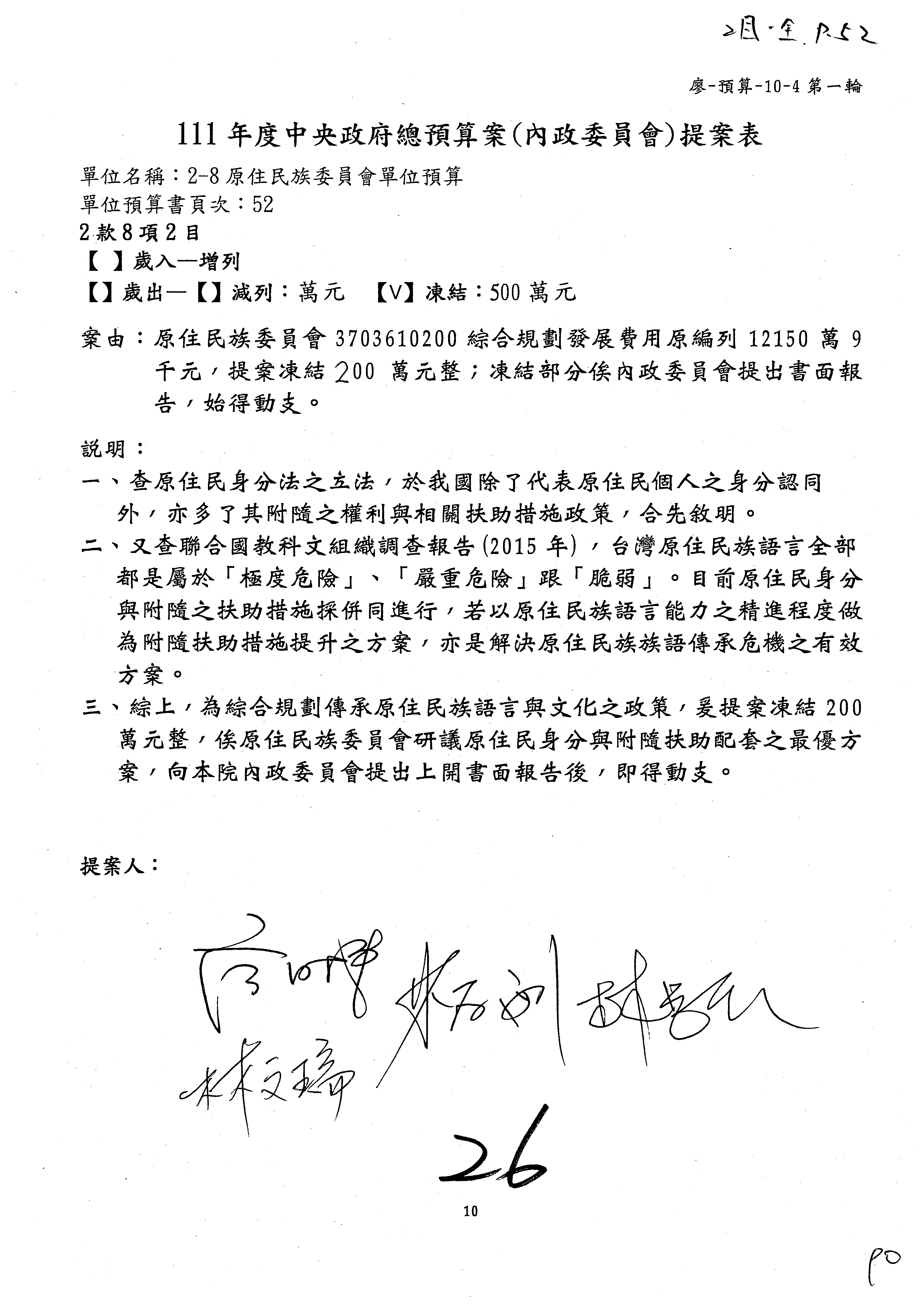 主席:好,跟大家先宣告一下,110年度中央政府總預算案關於原住民族委員會、原住民族文化發展中心預算,詢答的部分已經在110年12月1日完成,今天就直接進行預算之處理。