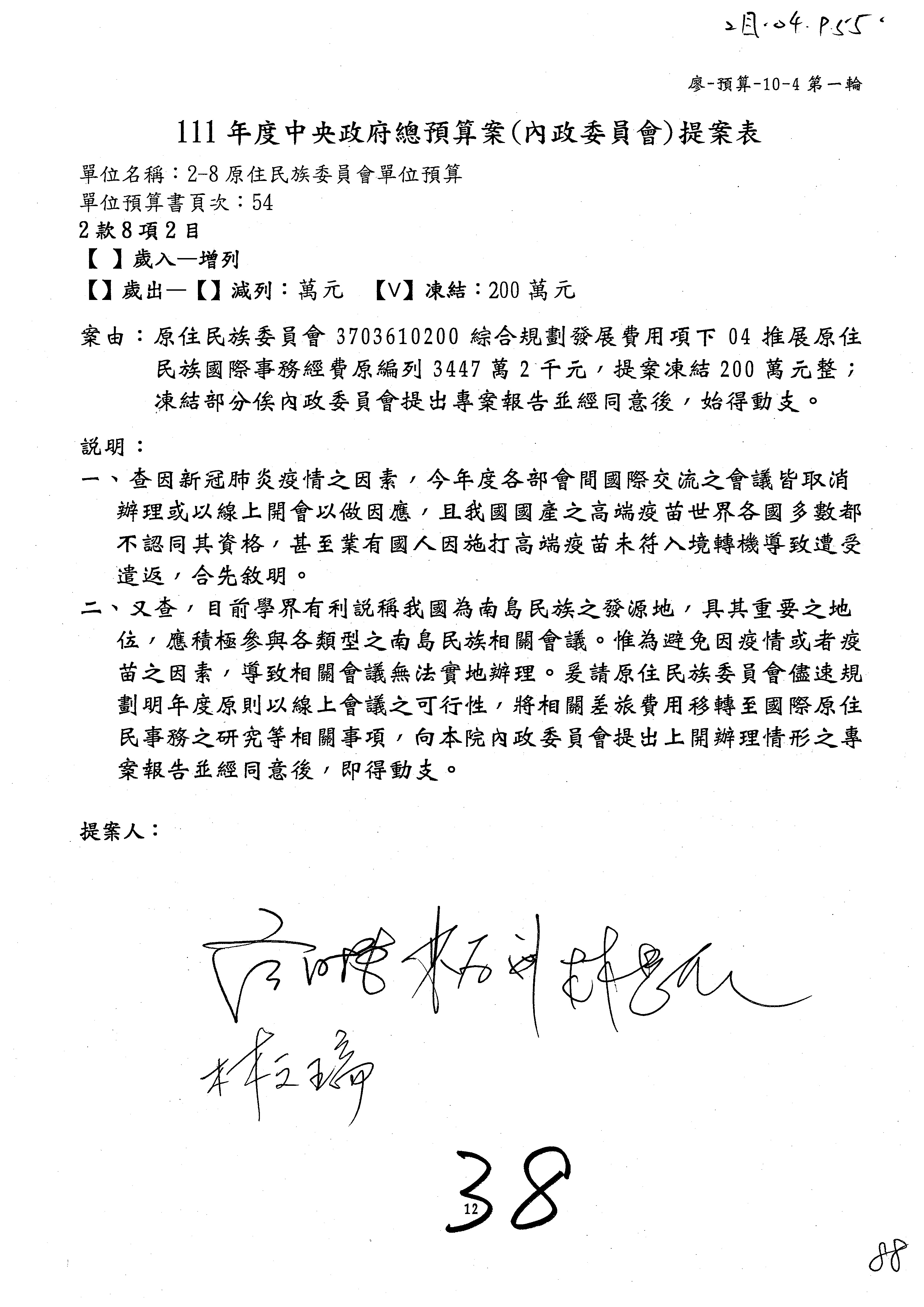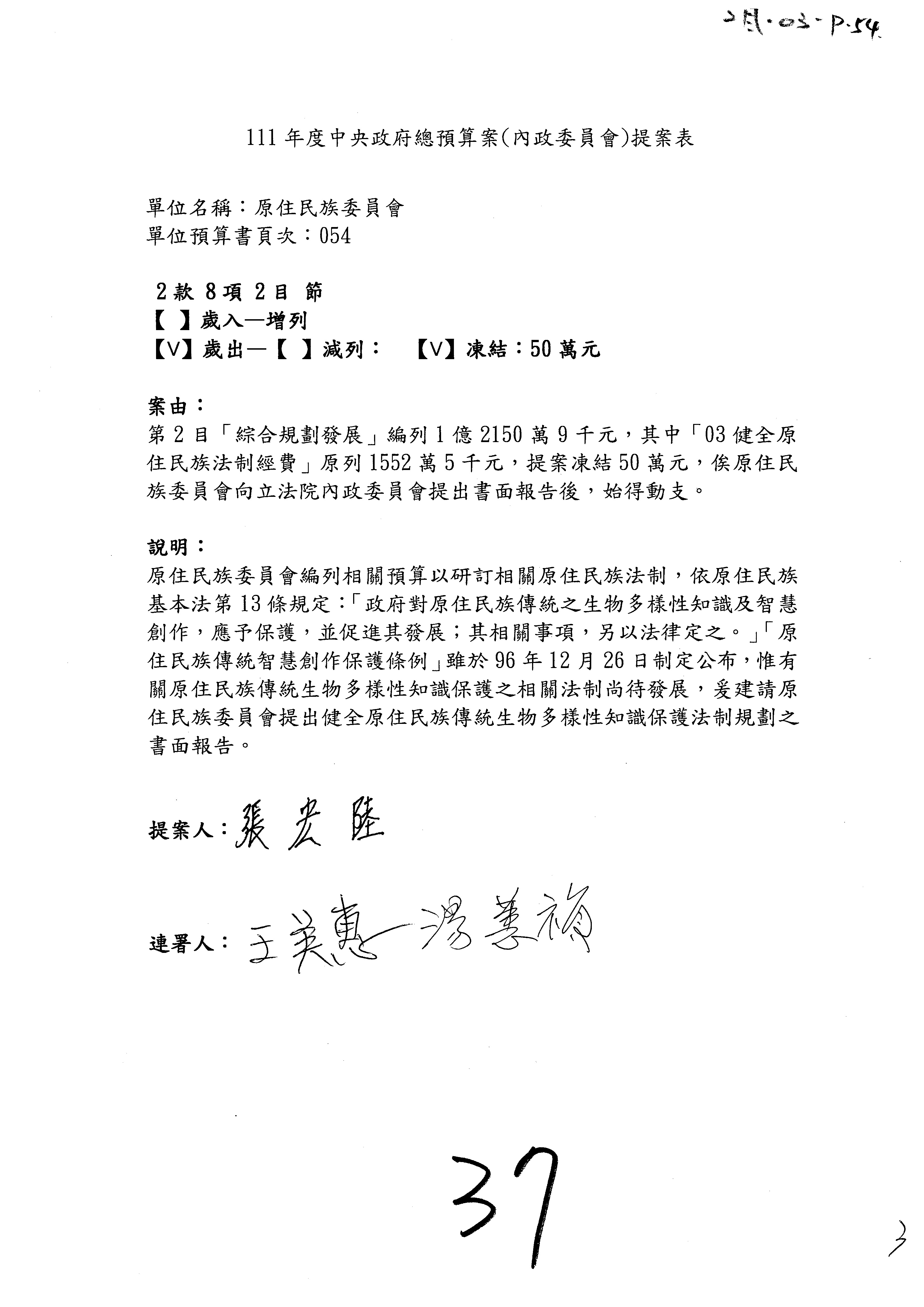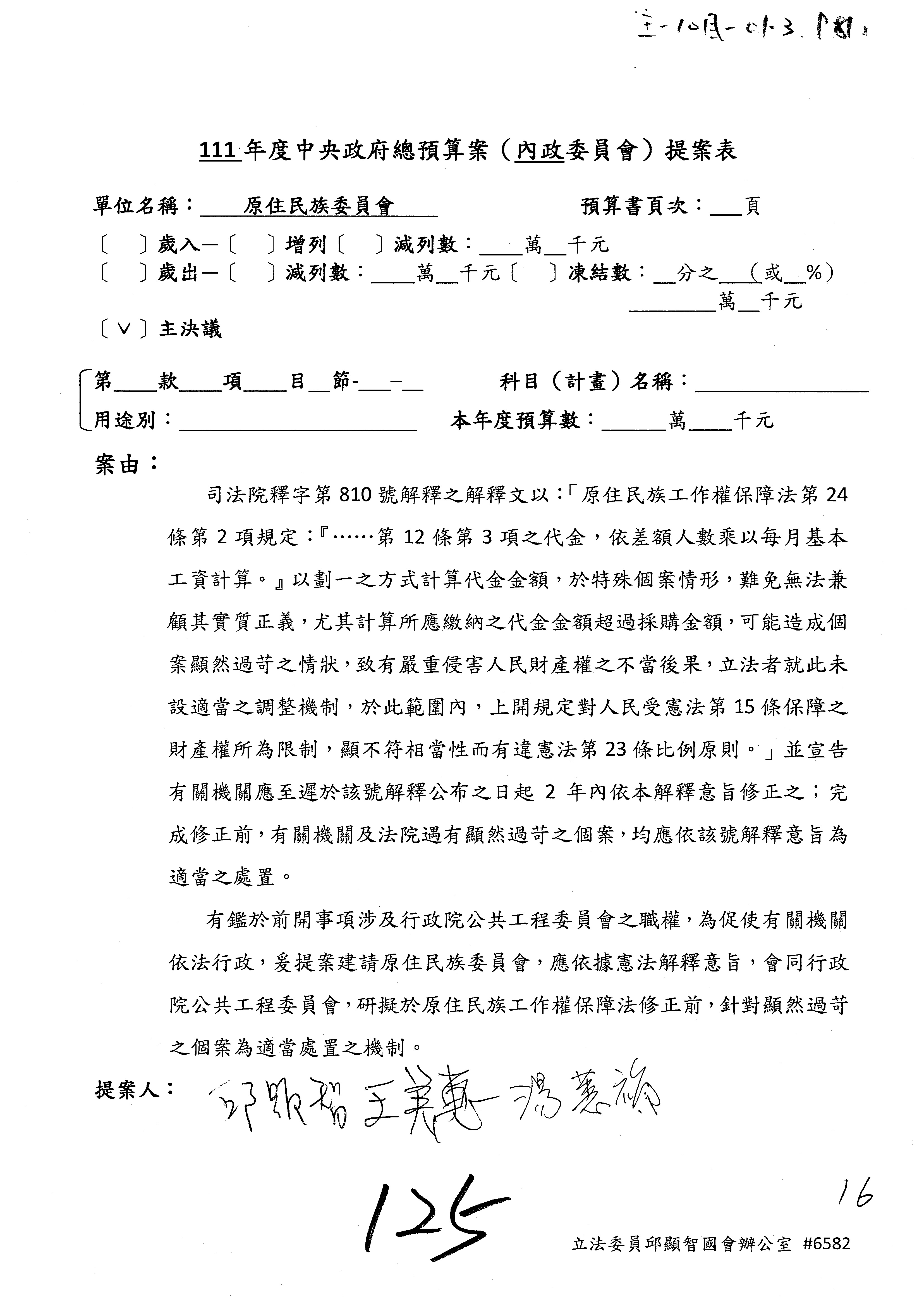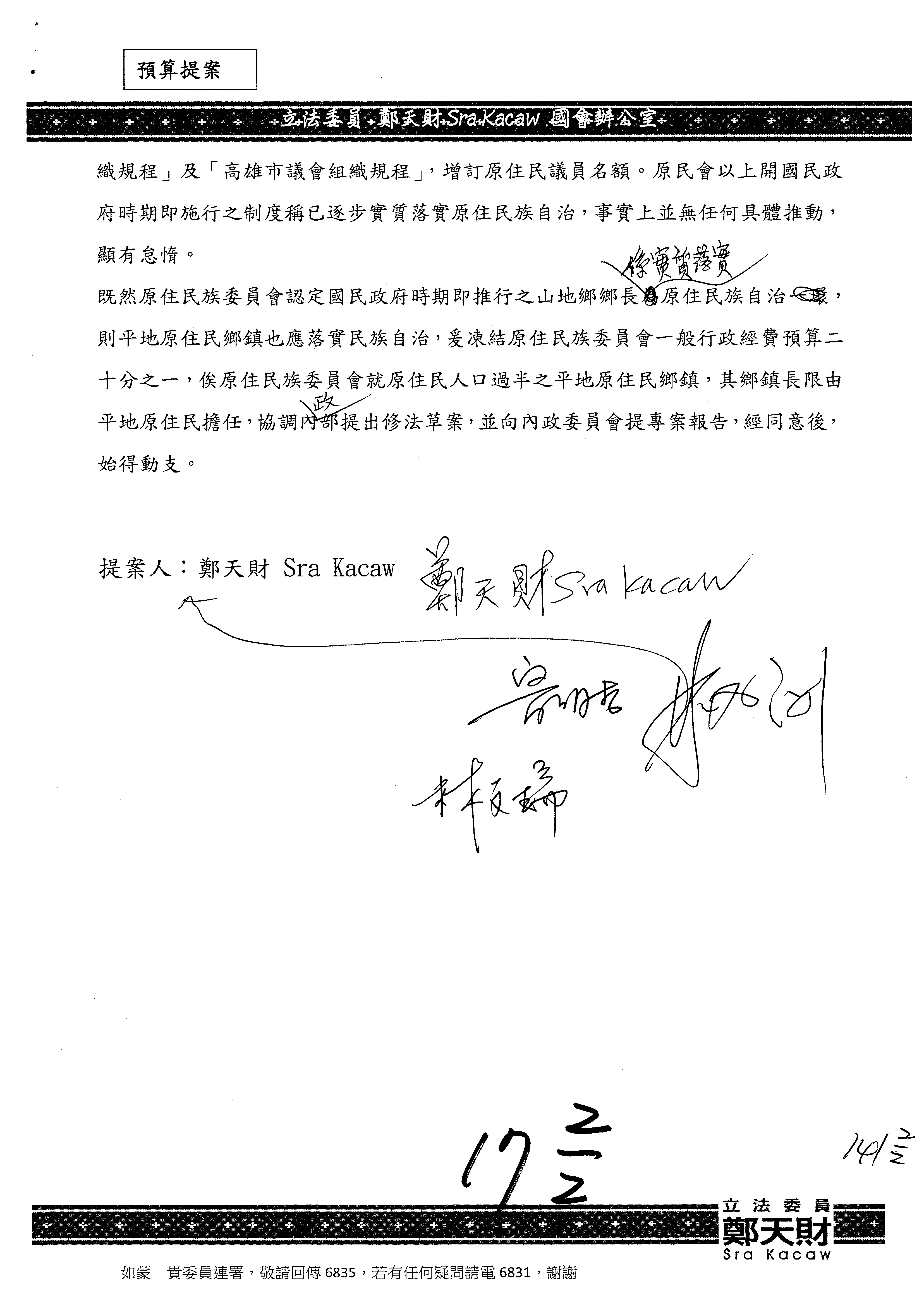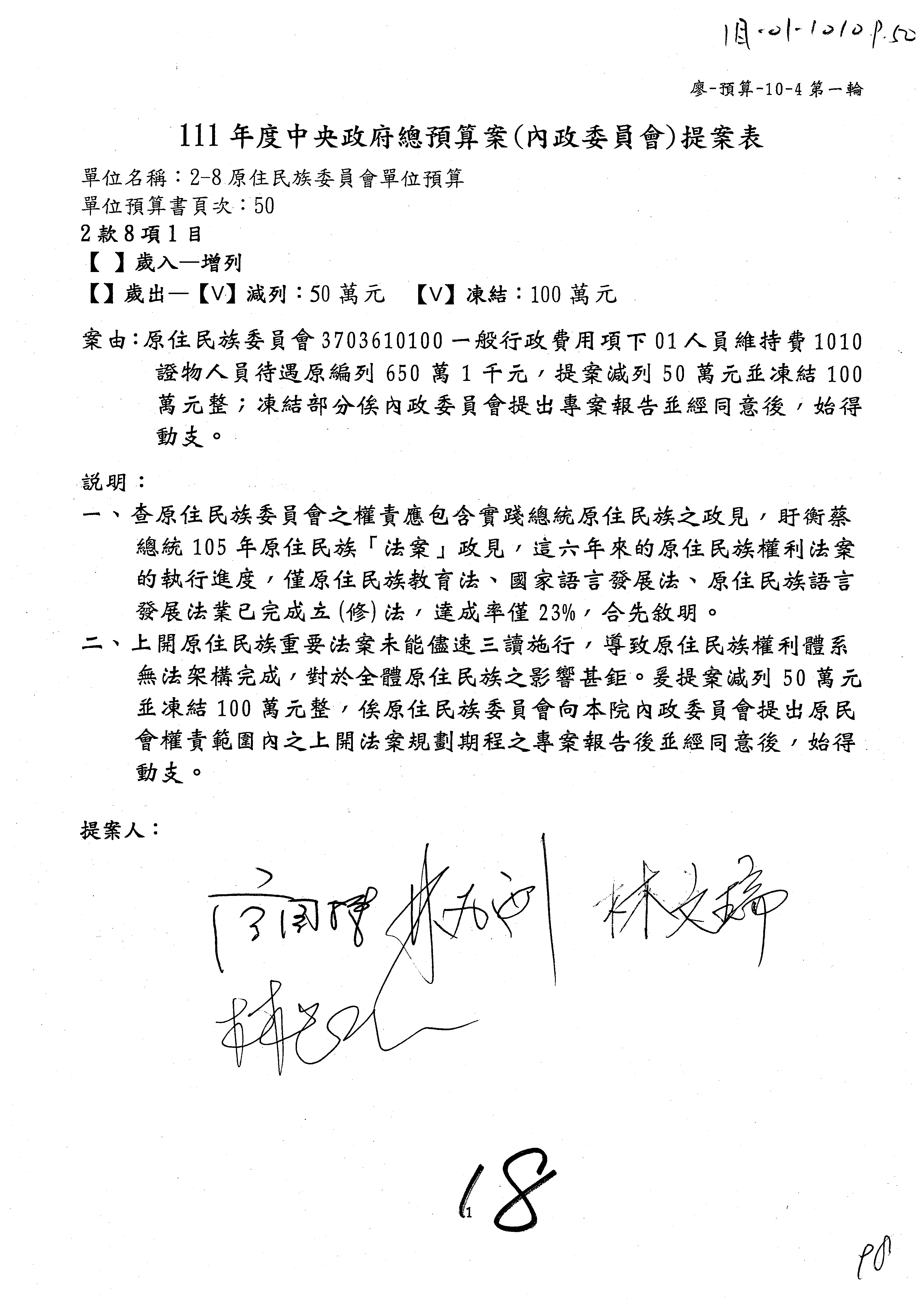 主席:好,跟大家先宣告一下,110年度中央政府總預算案關於原住民族委員會、原住民族文化發展中心預算,詢答的部分已經在110年12月1日完成,今天就直接進行預算之處理。