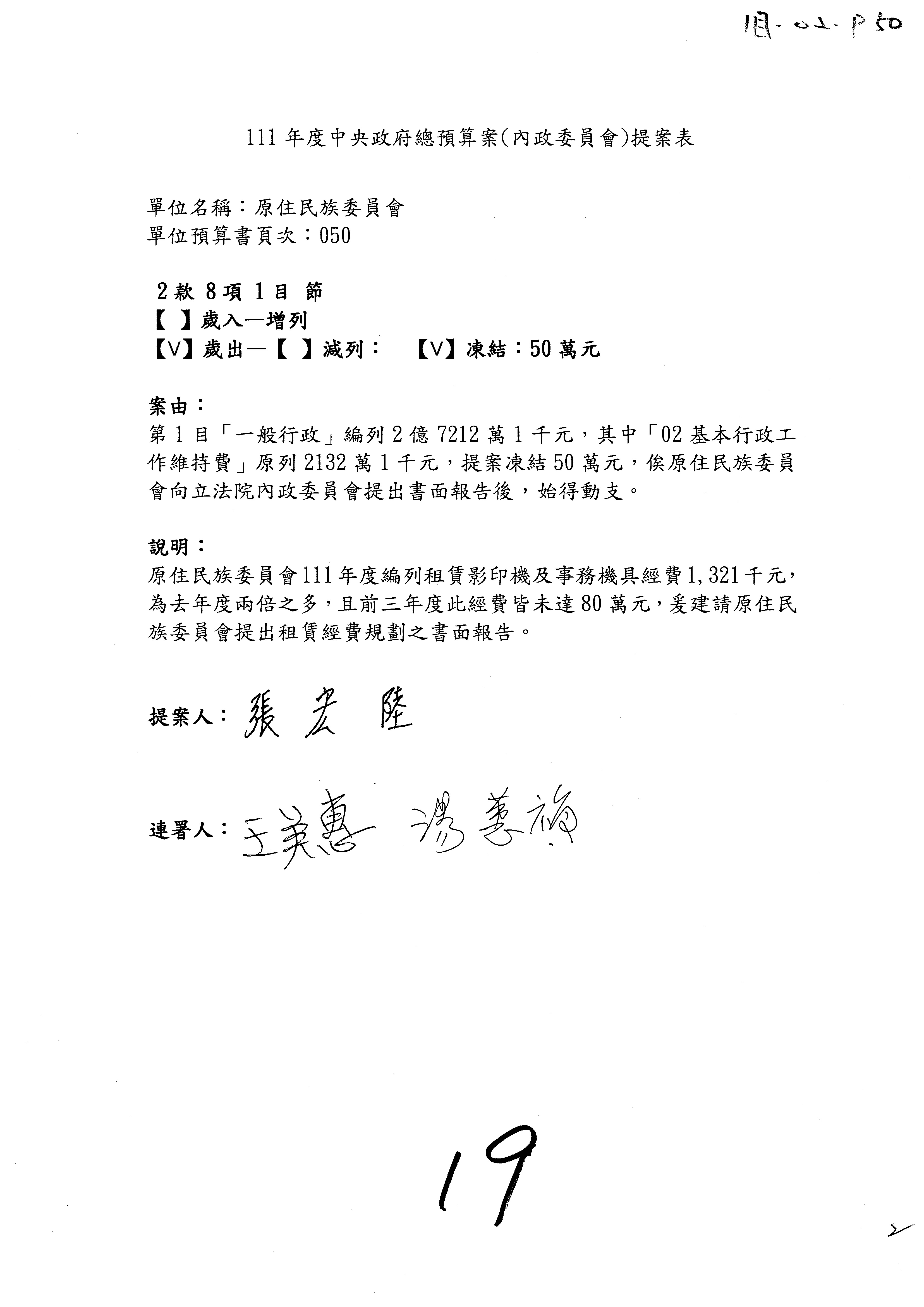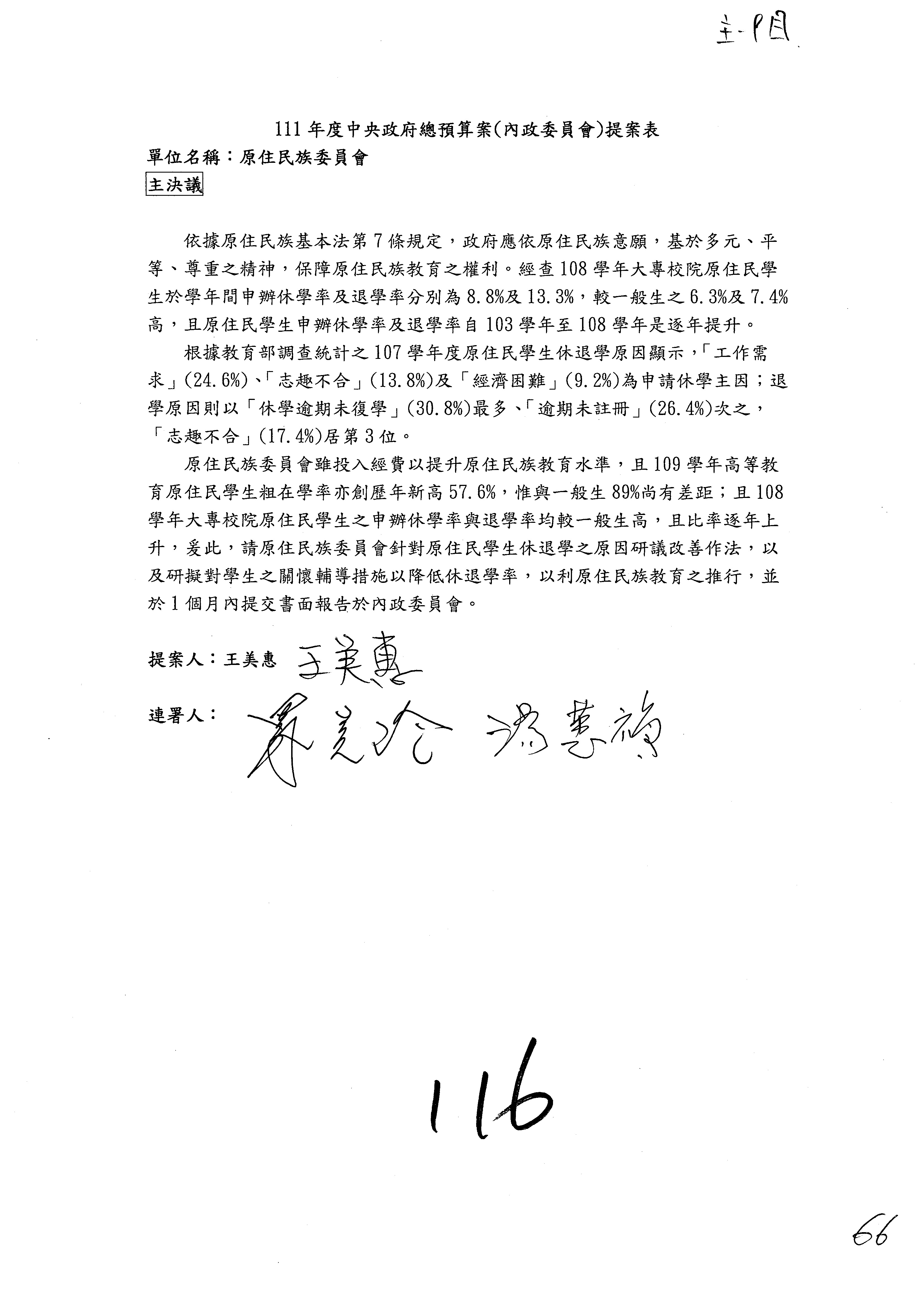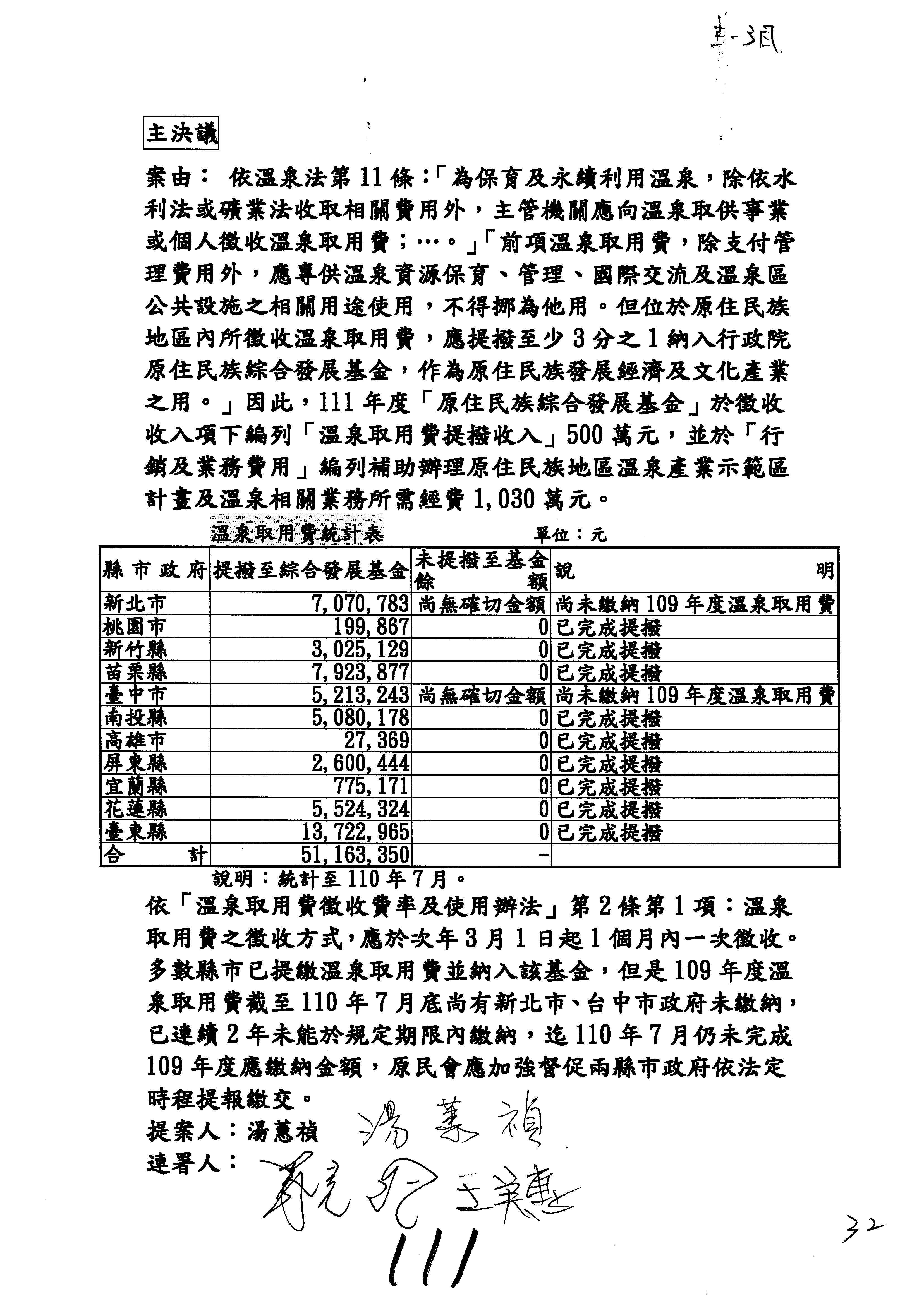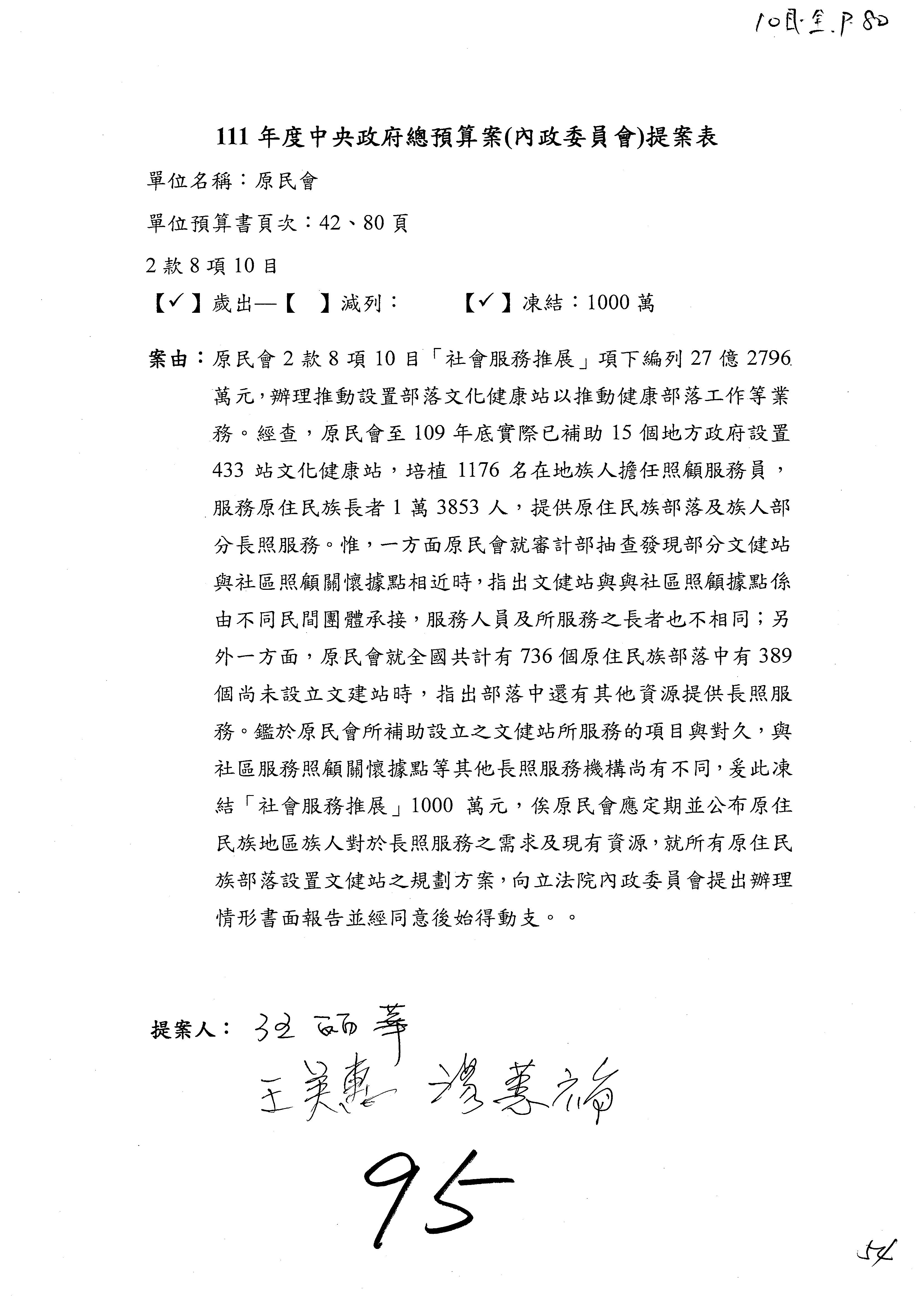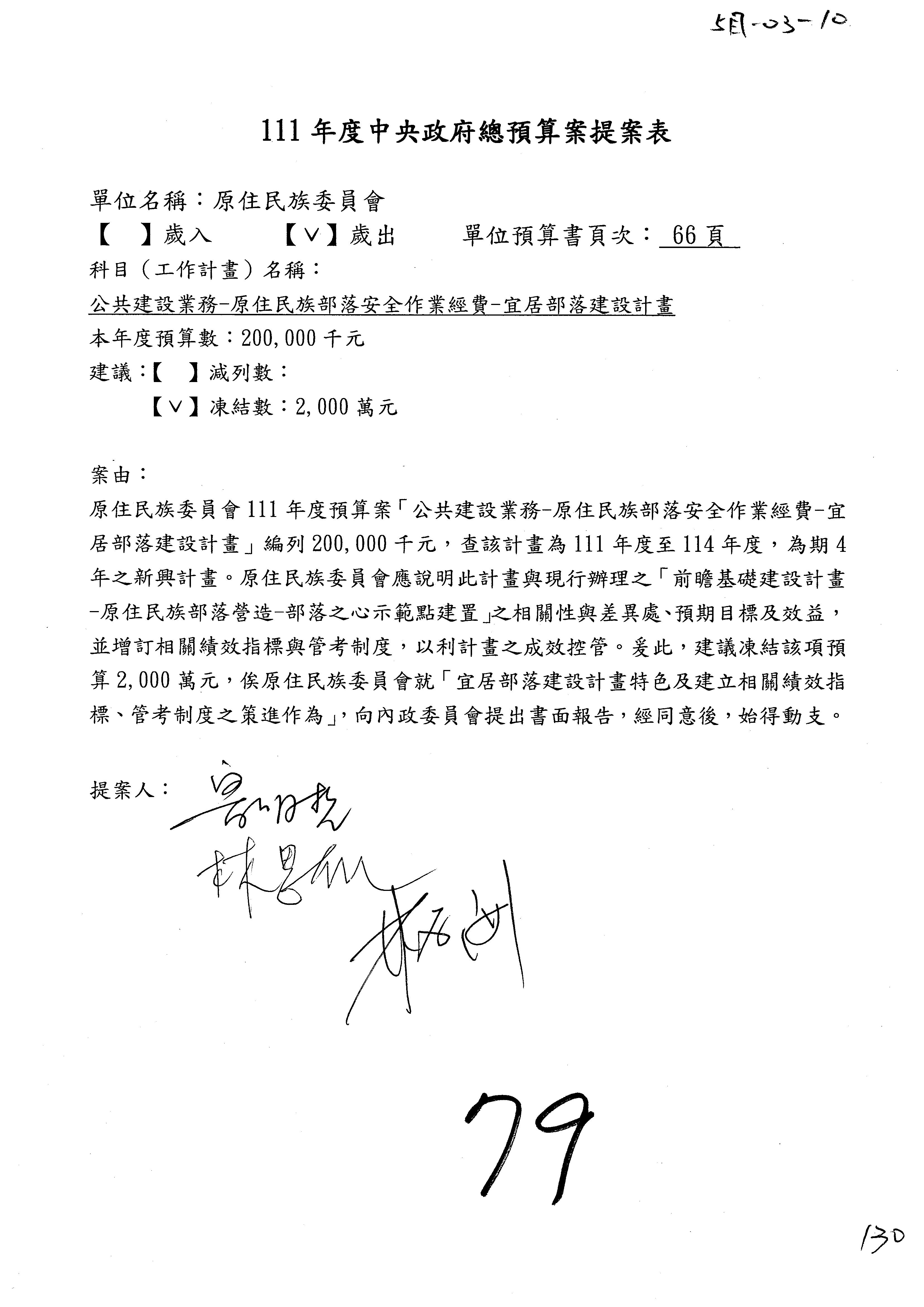 主席:好,跟大家先宣告一下,110年度中央政府總預算案關於原住民族委員會、原住民族文化發展中心預算,詢答的部分已經在110年12月1日完成,今天就直接進行預算之處理。