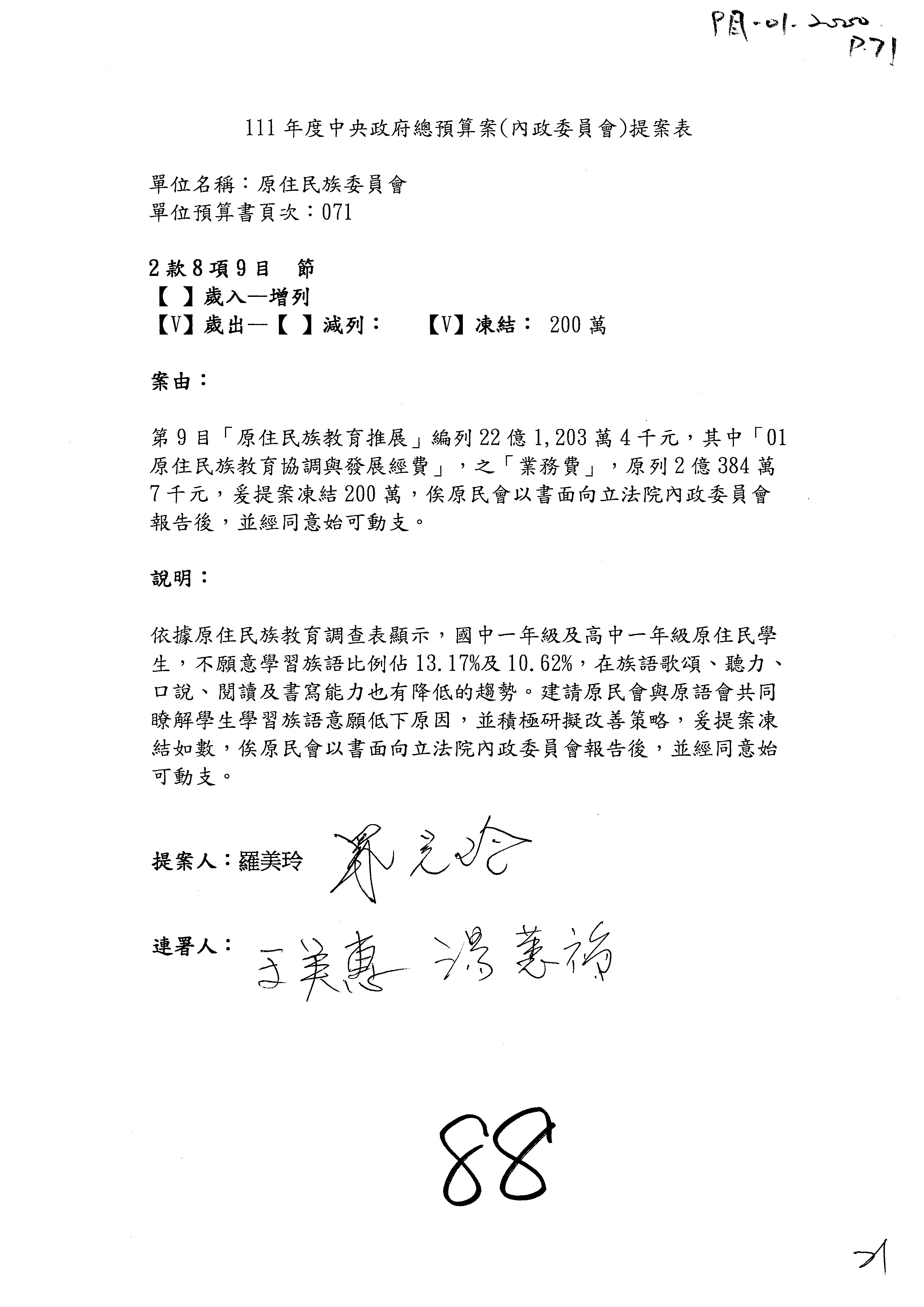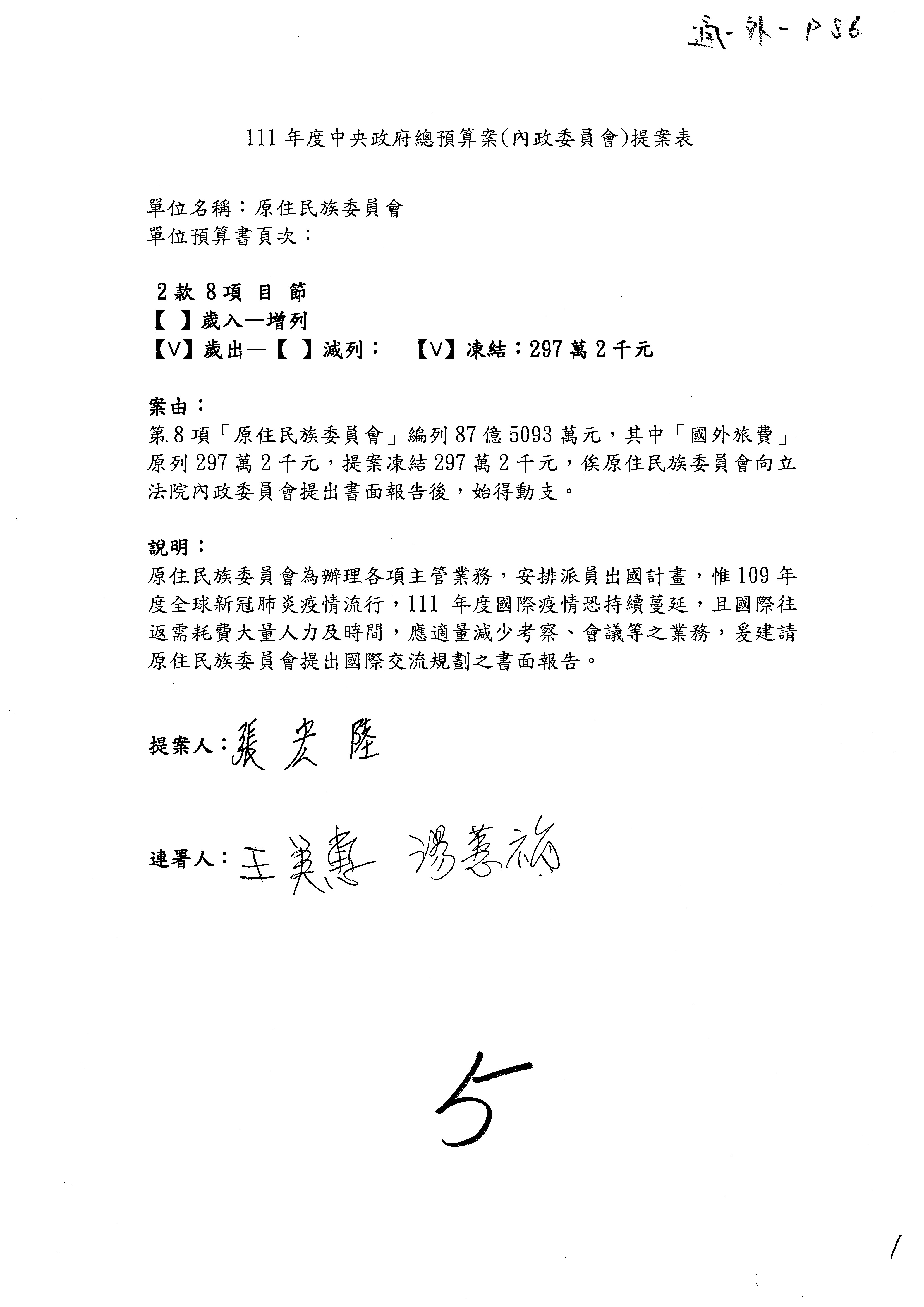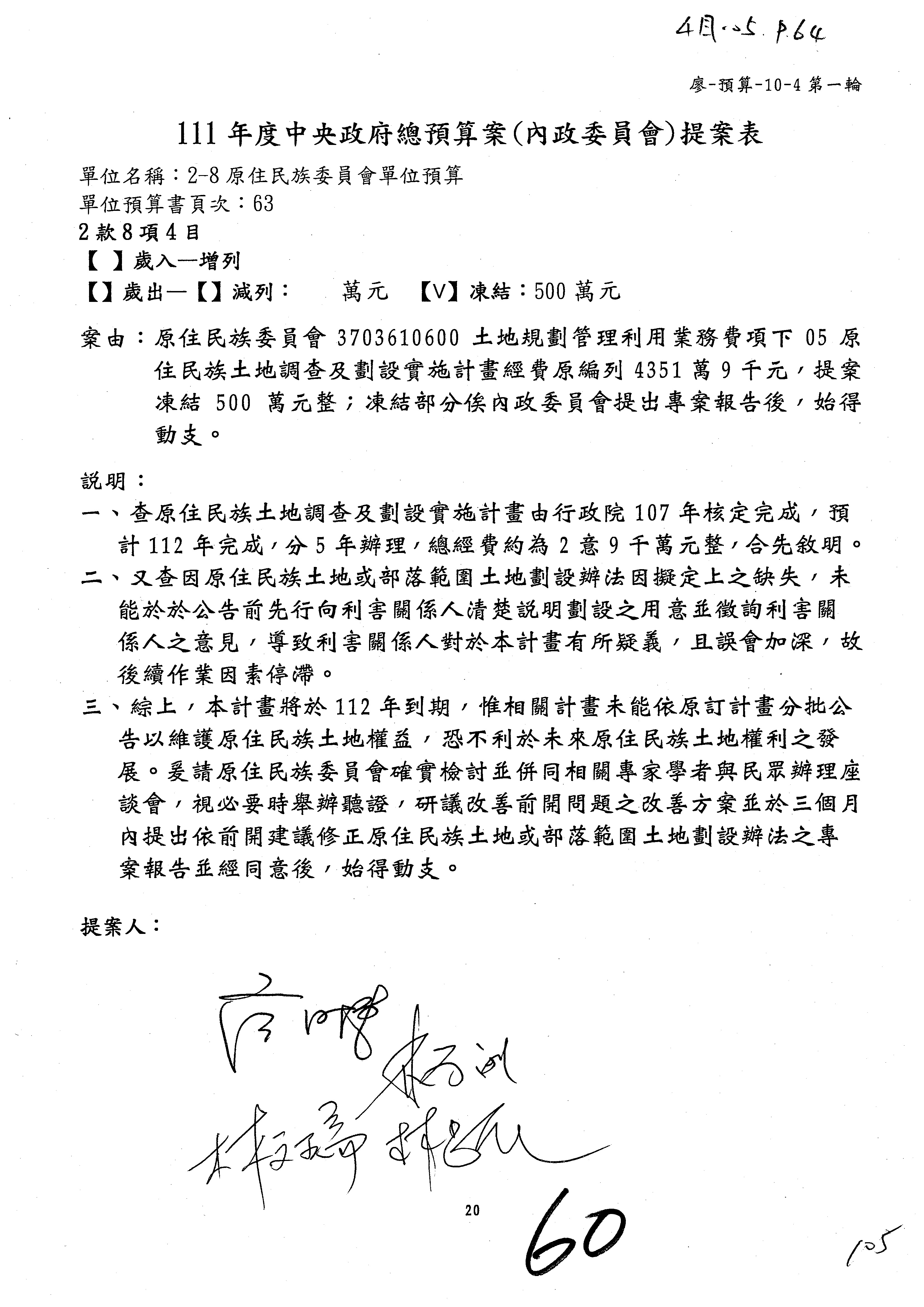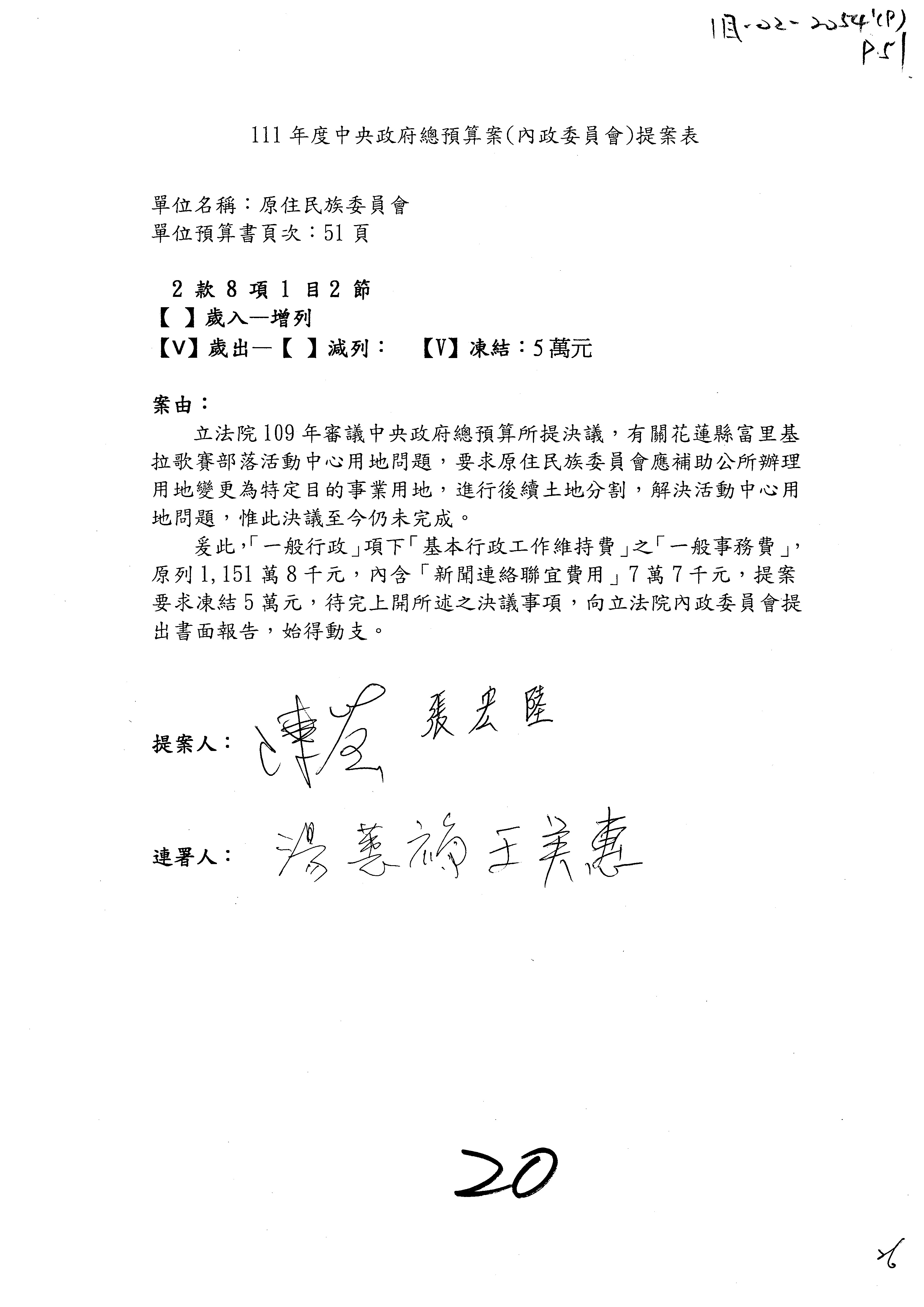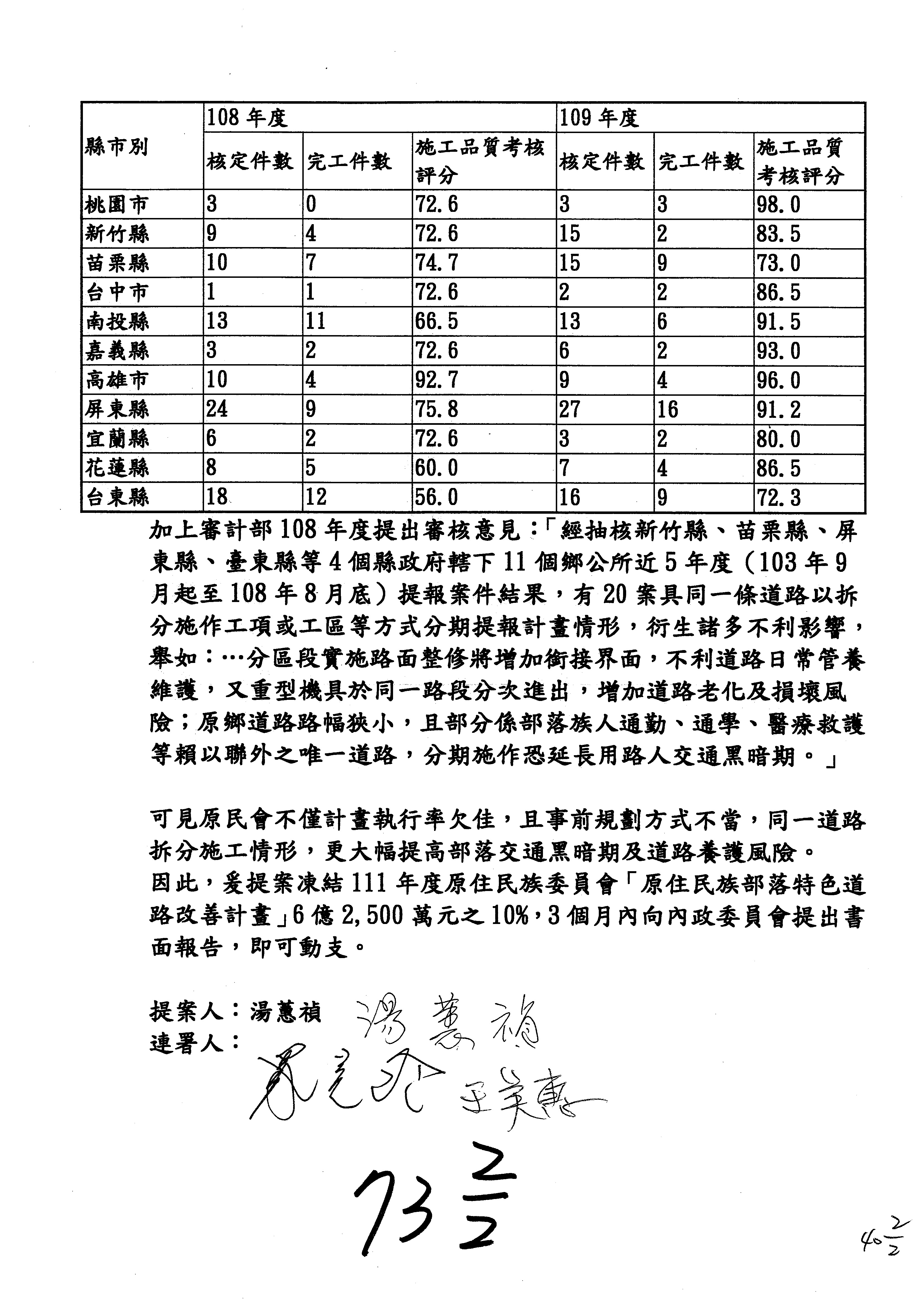 主席:好,跟大家先宣告一下,110年度中央政府總預算案關於原住民族委員會、原住民族文化發展中心預算,詢答的部分已經在110年12月1日完成,今天就直接進行預算之處理。