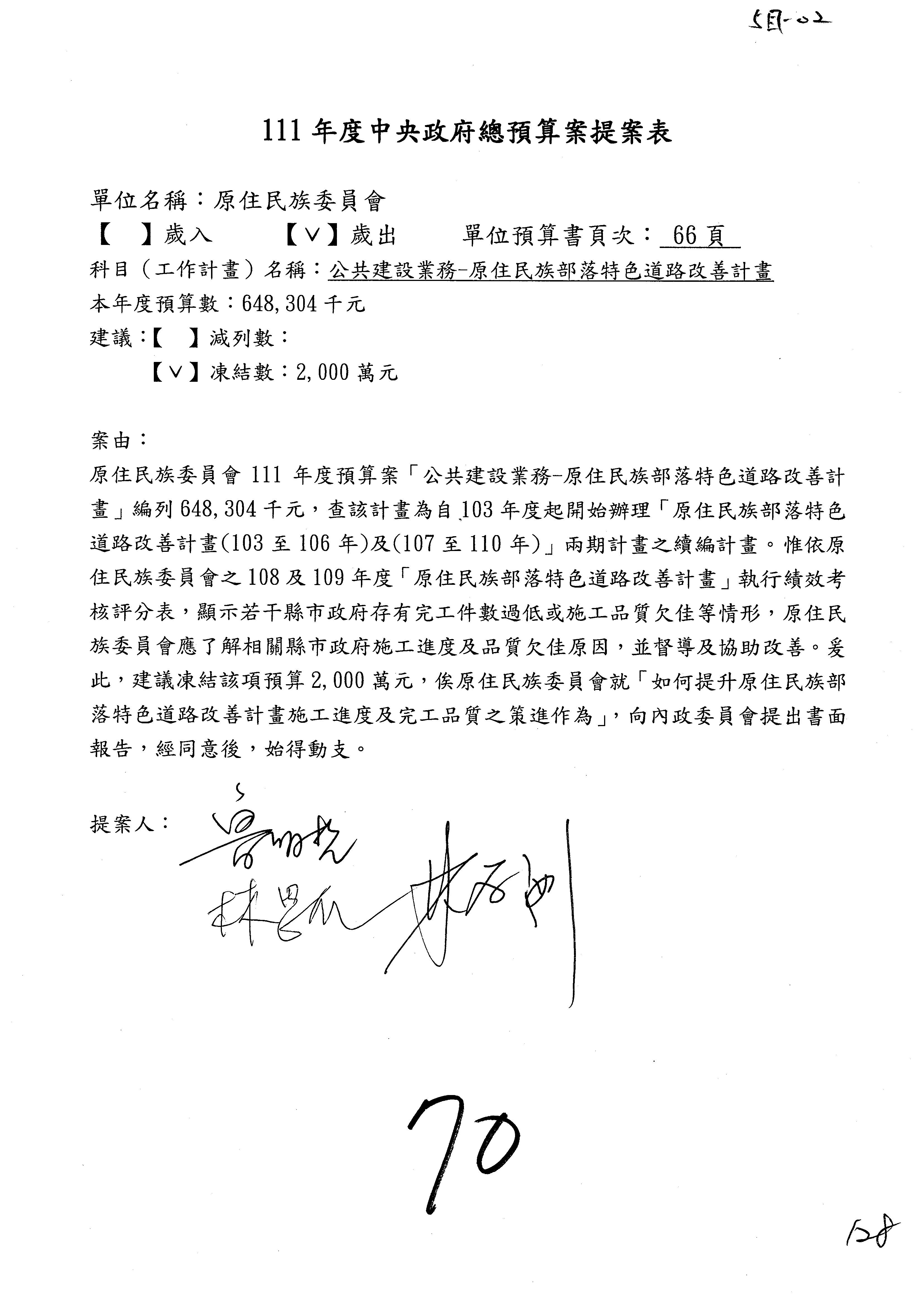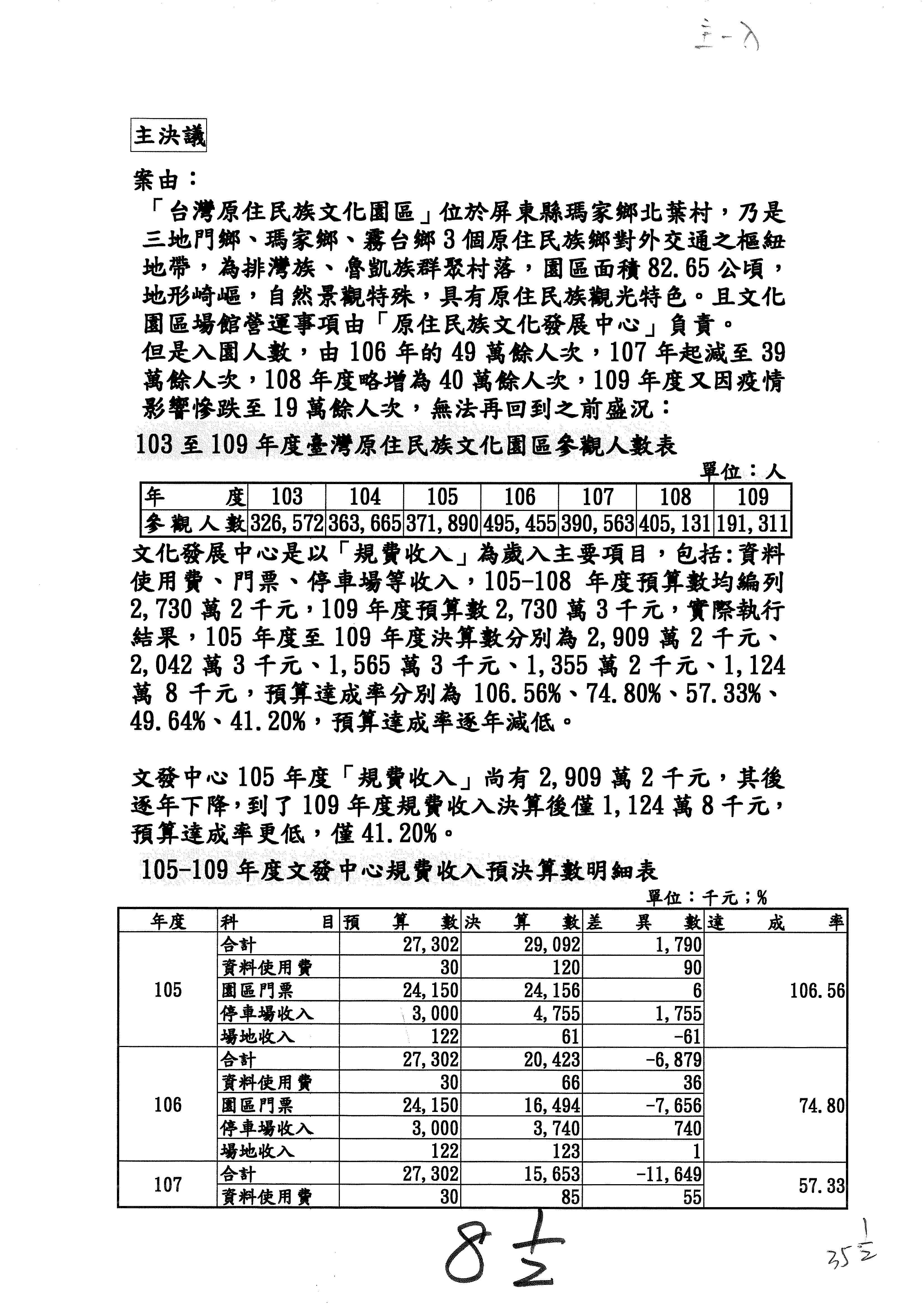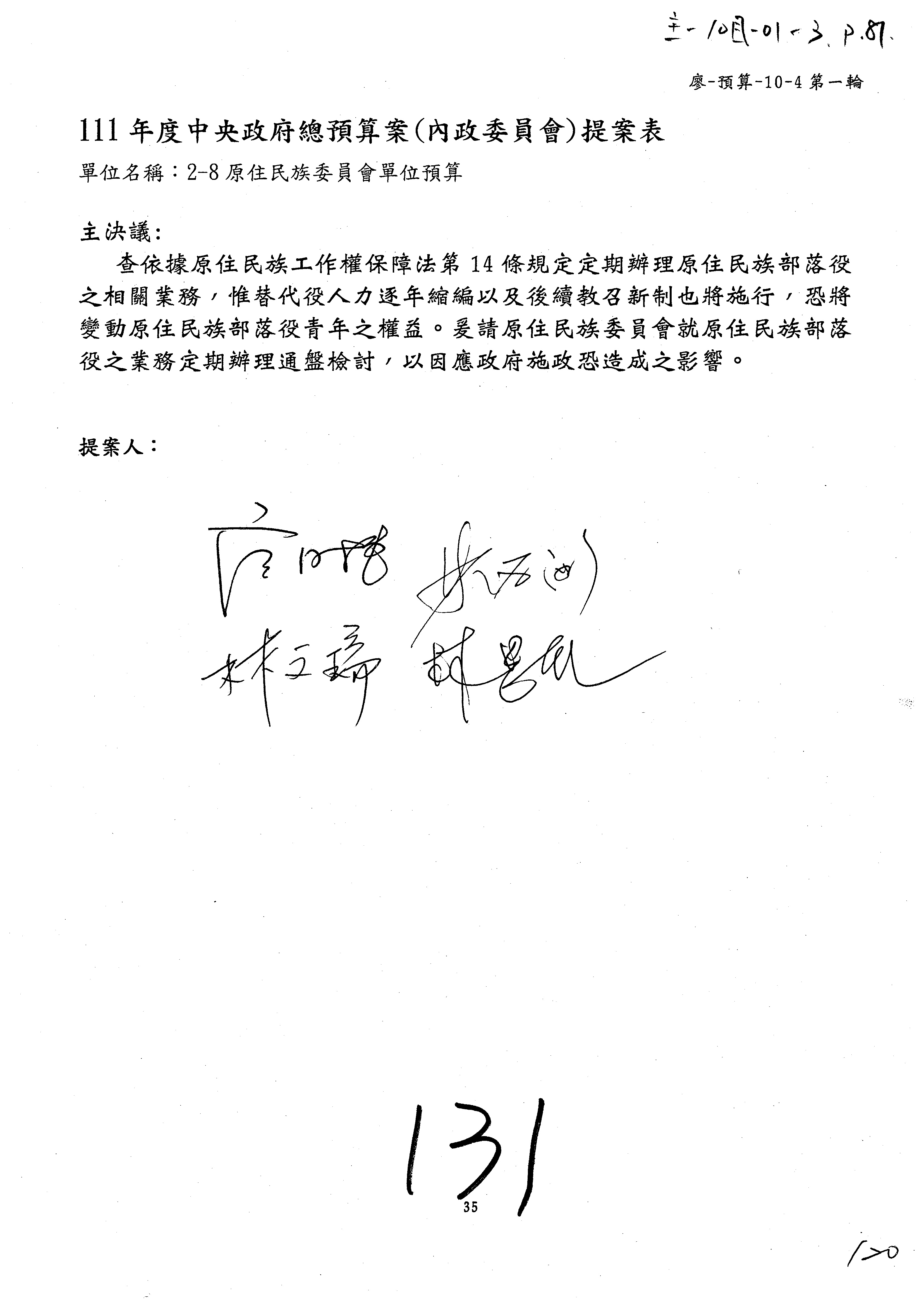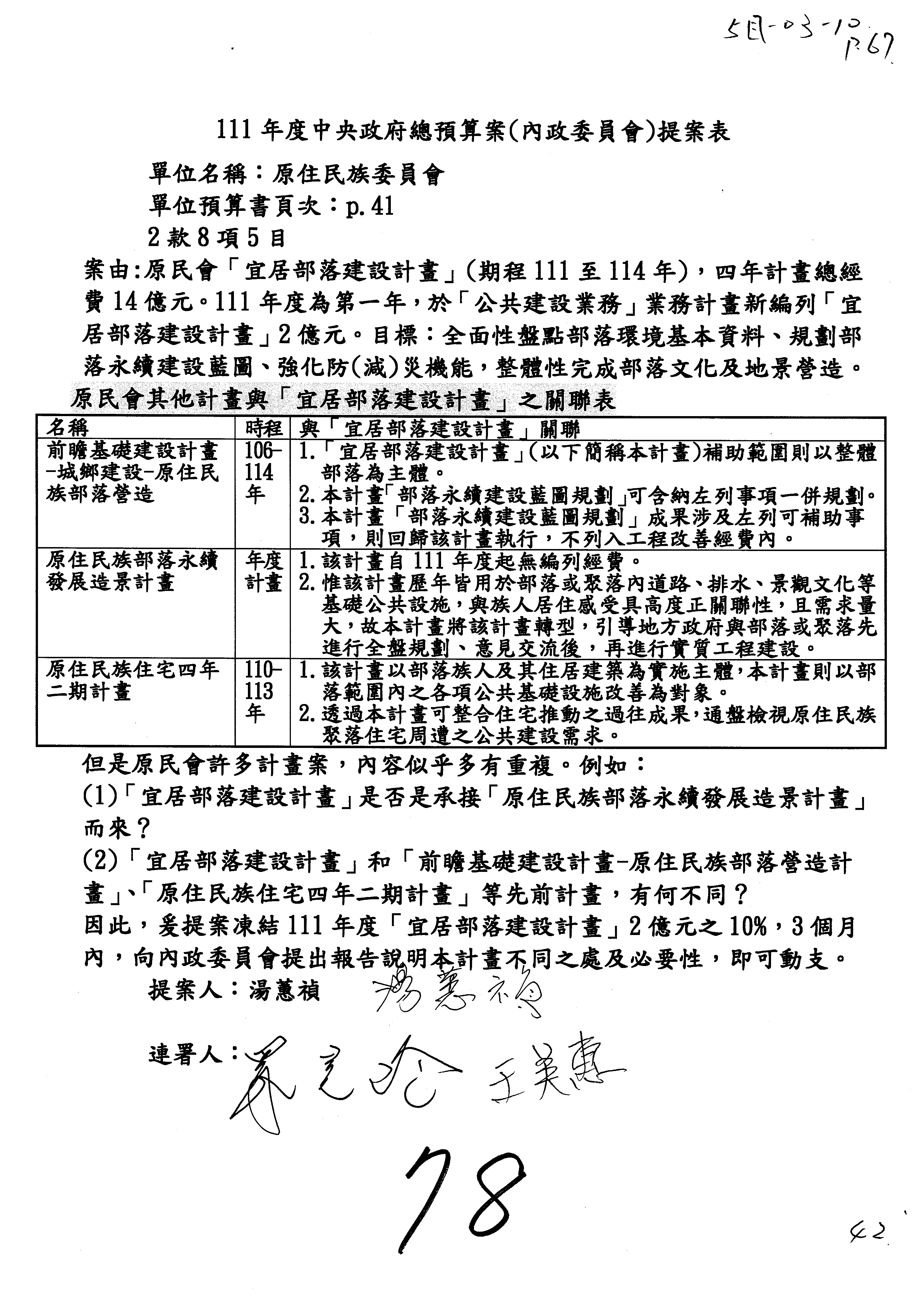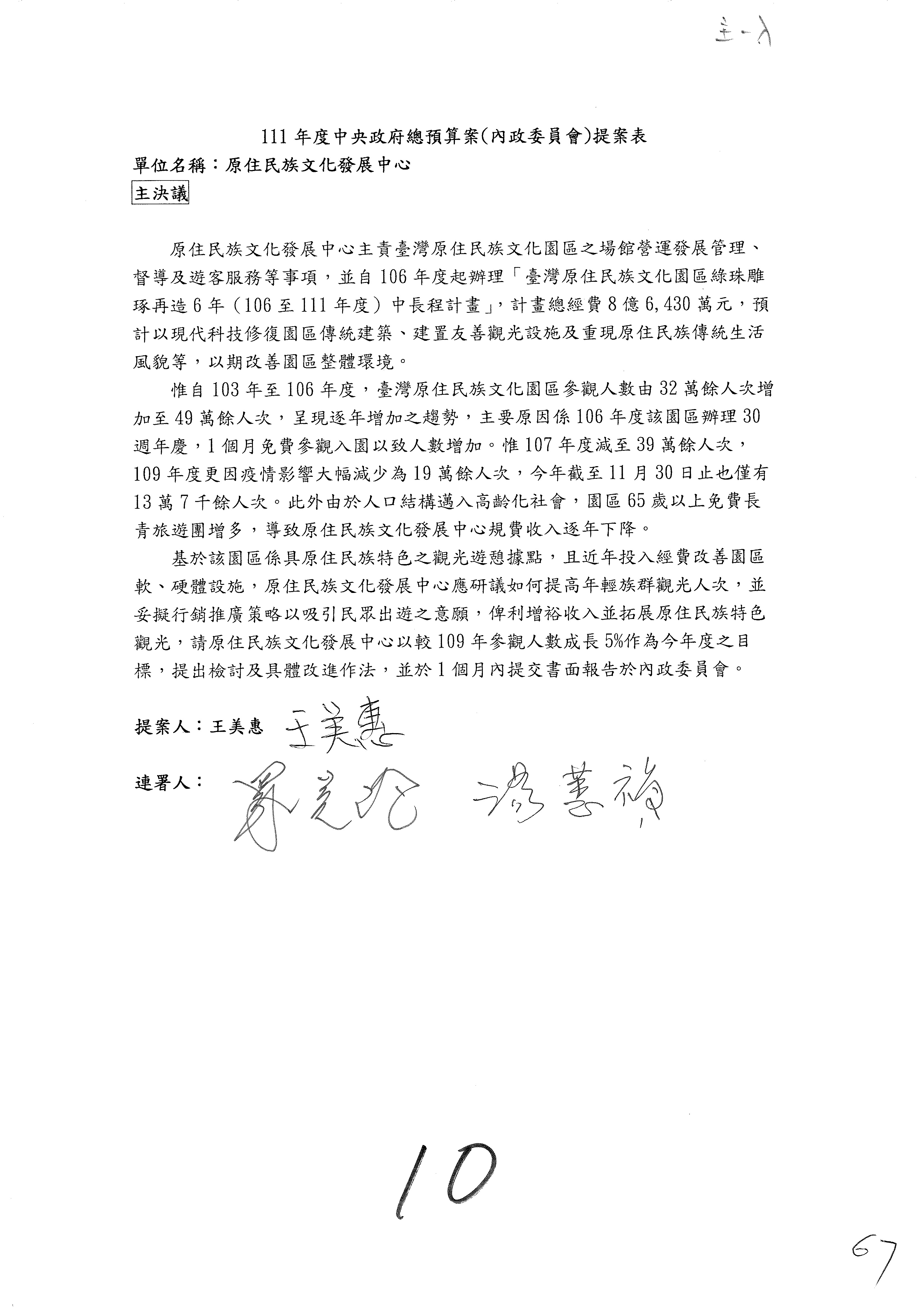 主席:好,跟大家先宣告一下,110年度中央政府總預算案關於原住民族委員會、原住民族文化發展中心預算,詢答的部分已經在110年12月1日完成,今天就直接進行預算之處理。