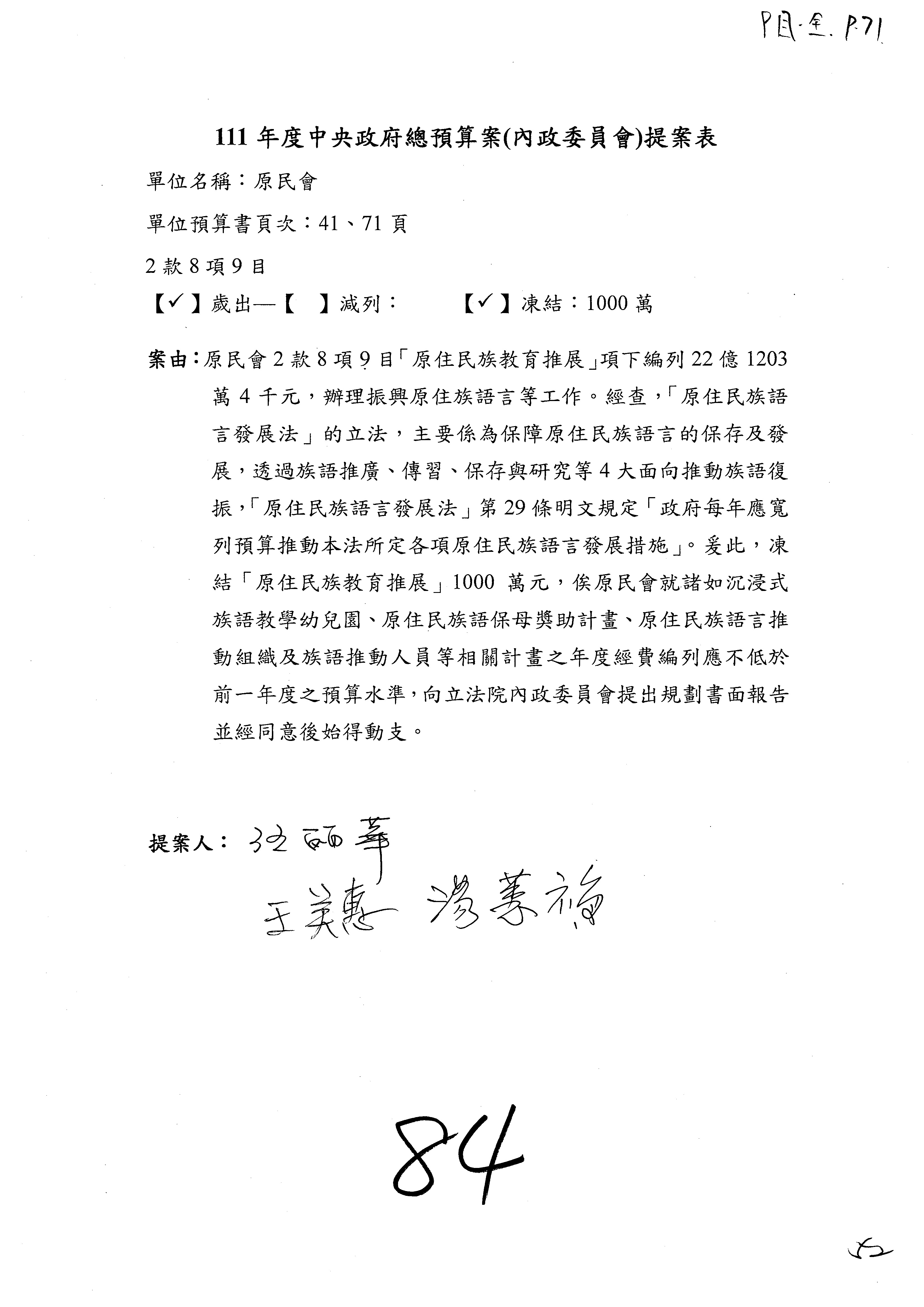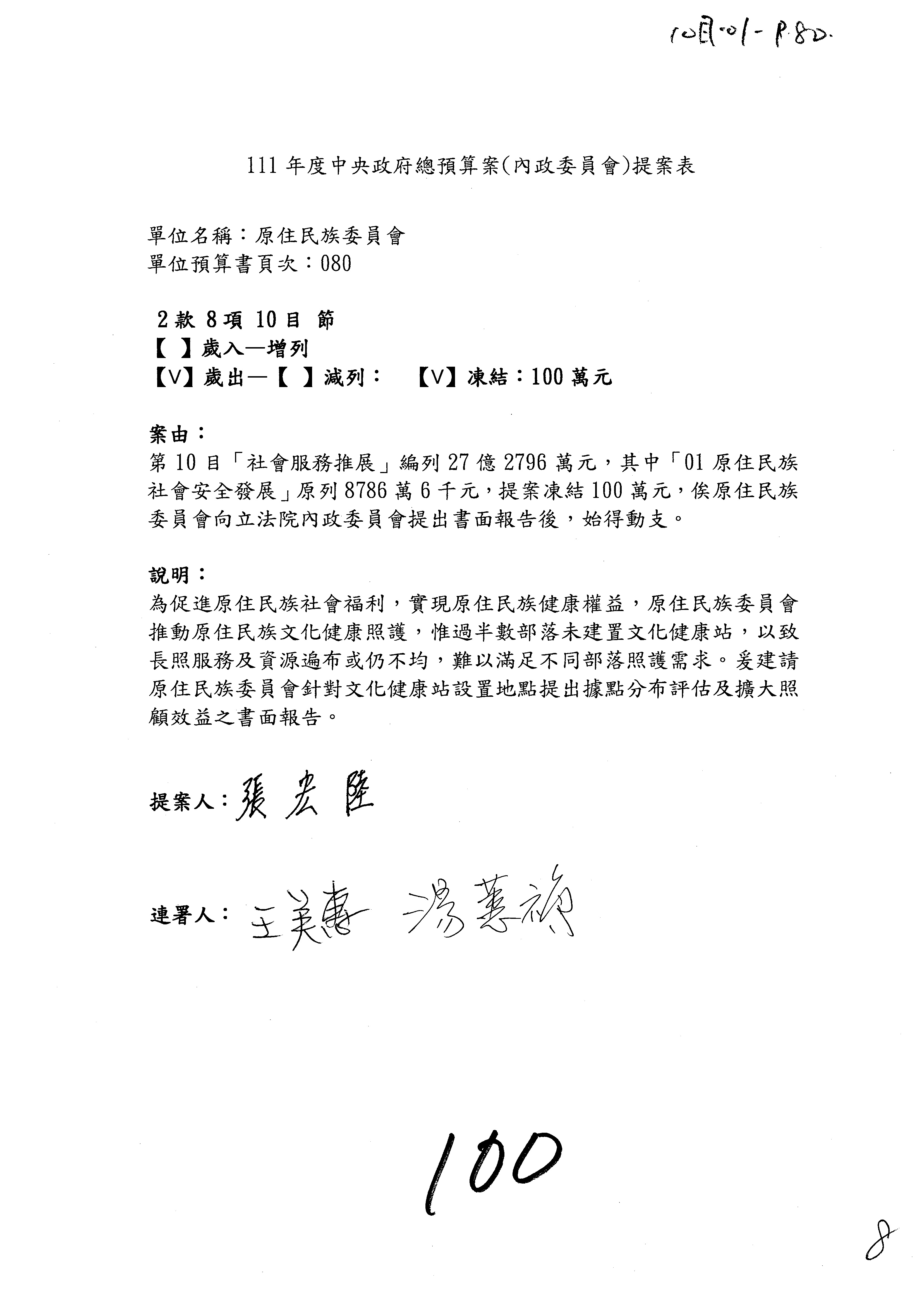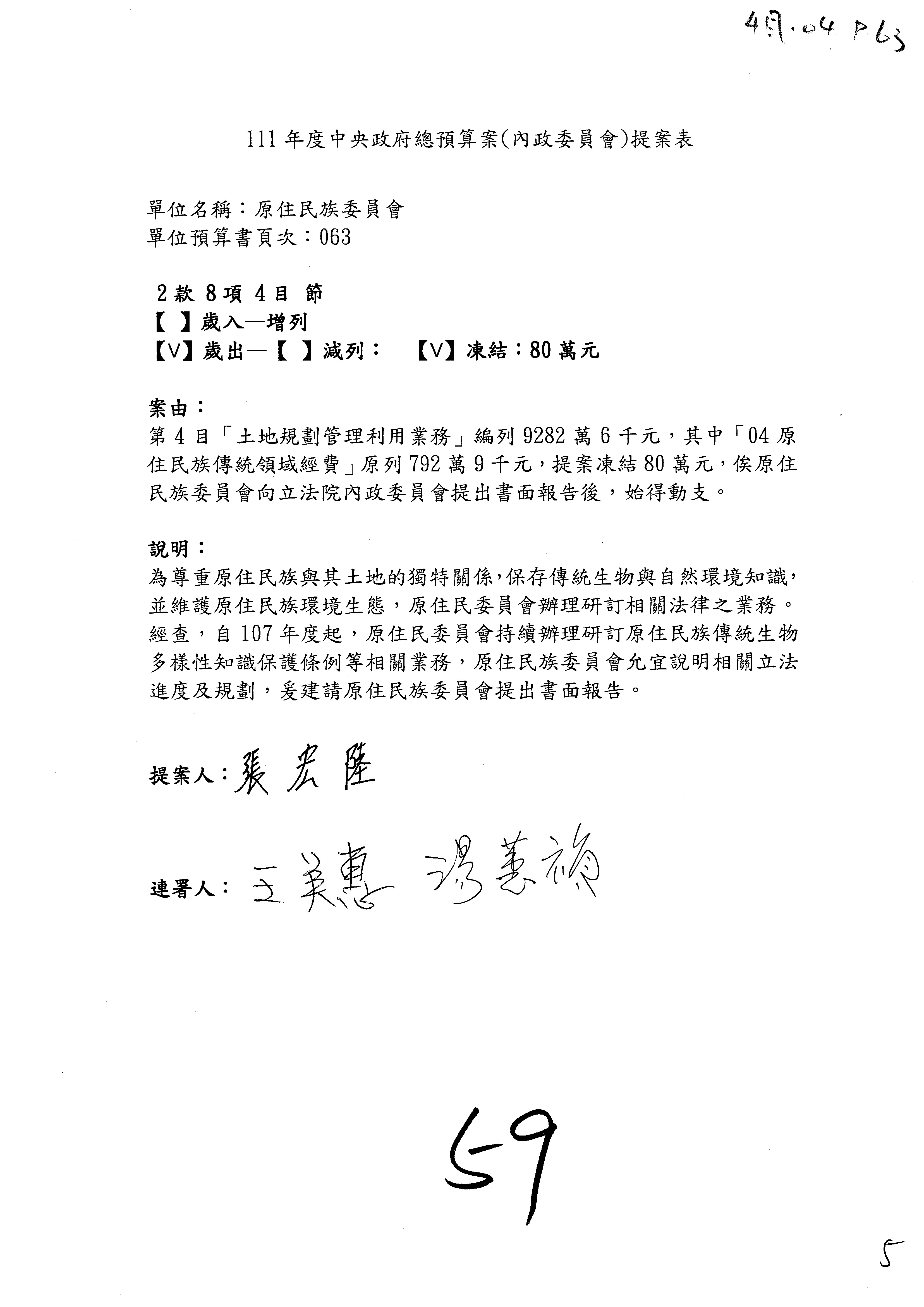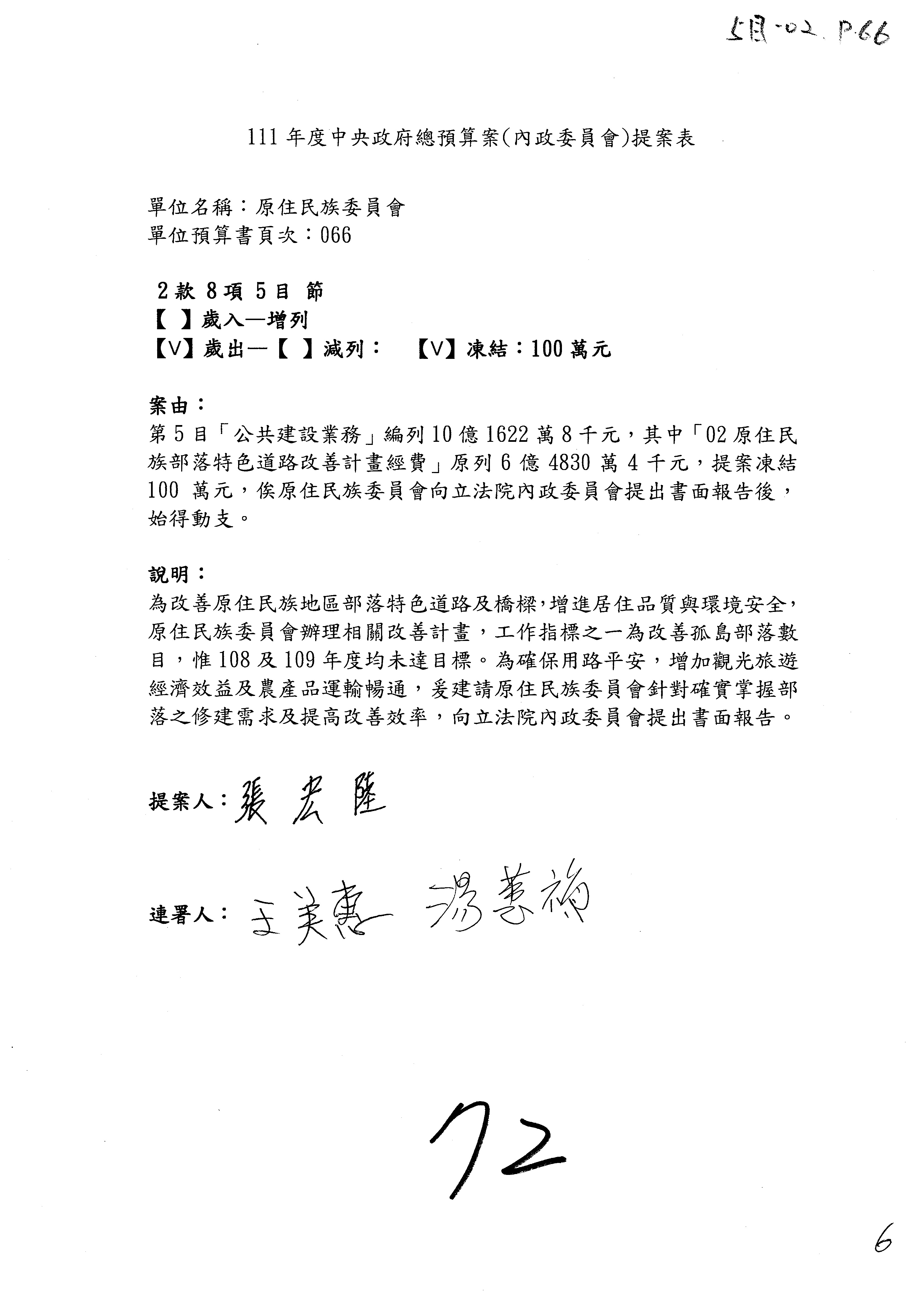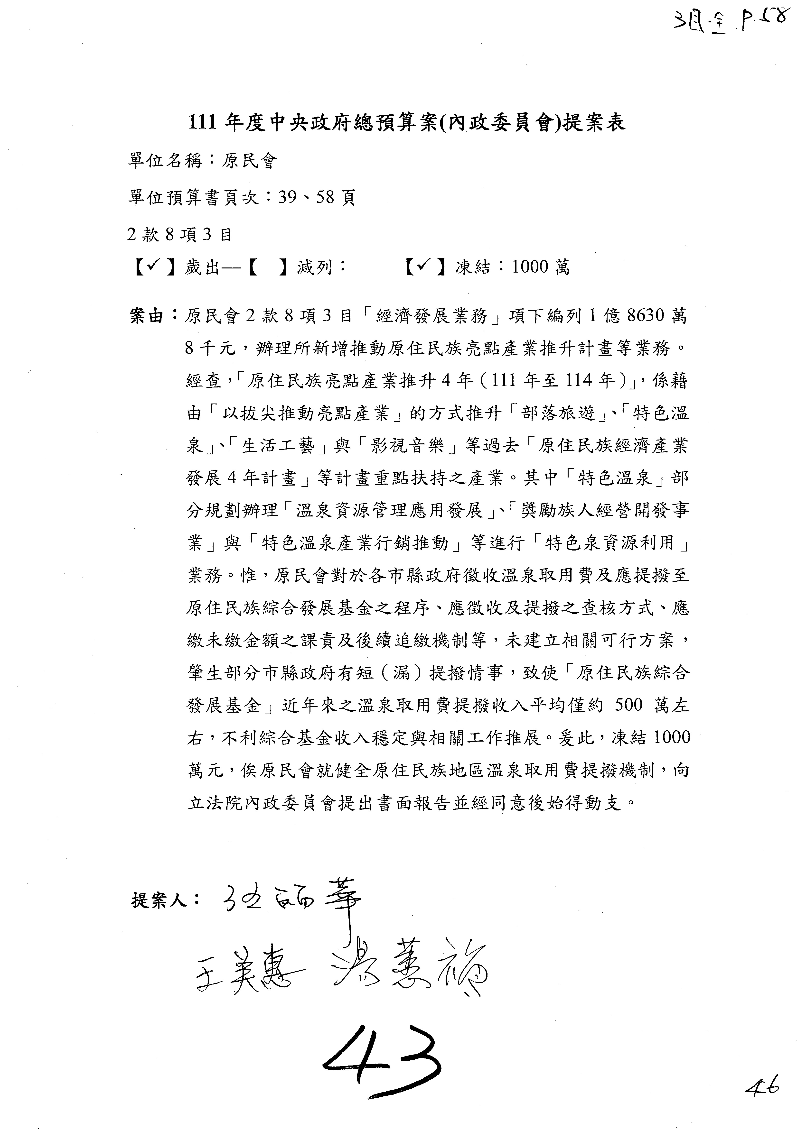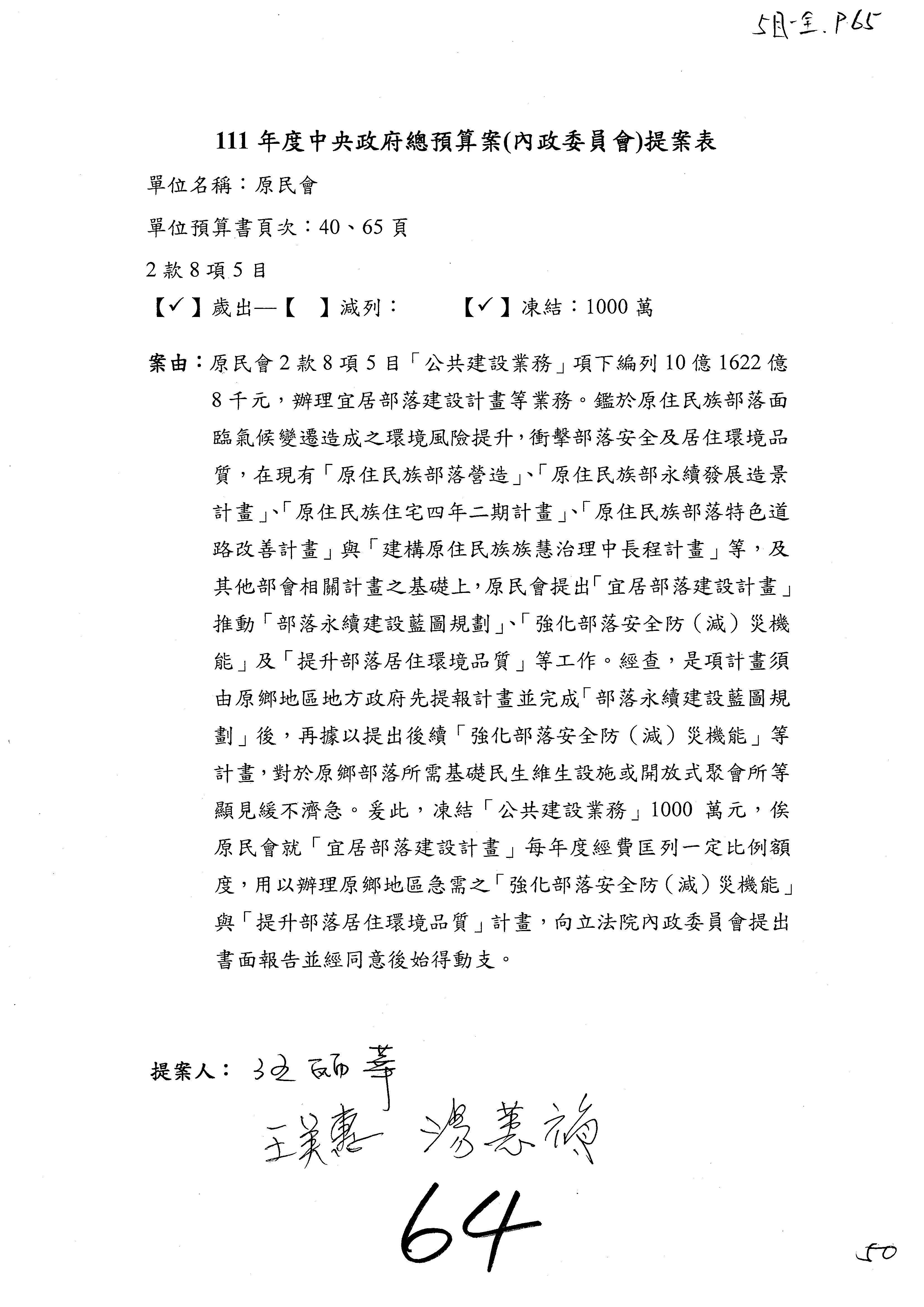 主席:好,跟大家先宣告一下,110年度中央政府總預算案關於原住民族委員會、原住民族文化發展中心預算,詢答的部分已經在110年12月1日完成,今天就直接進行預算之處理。
