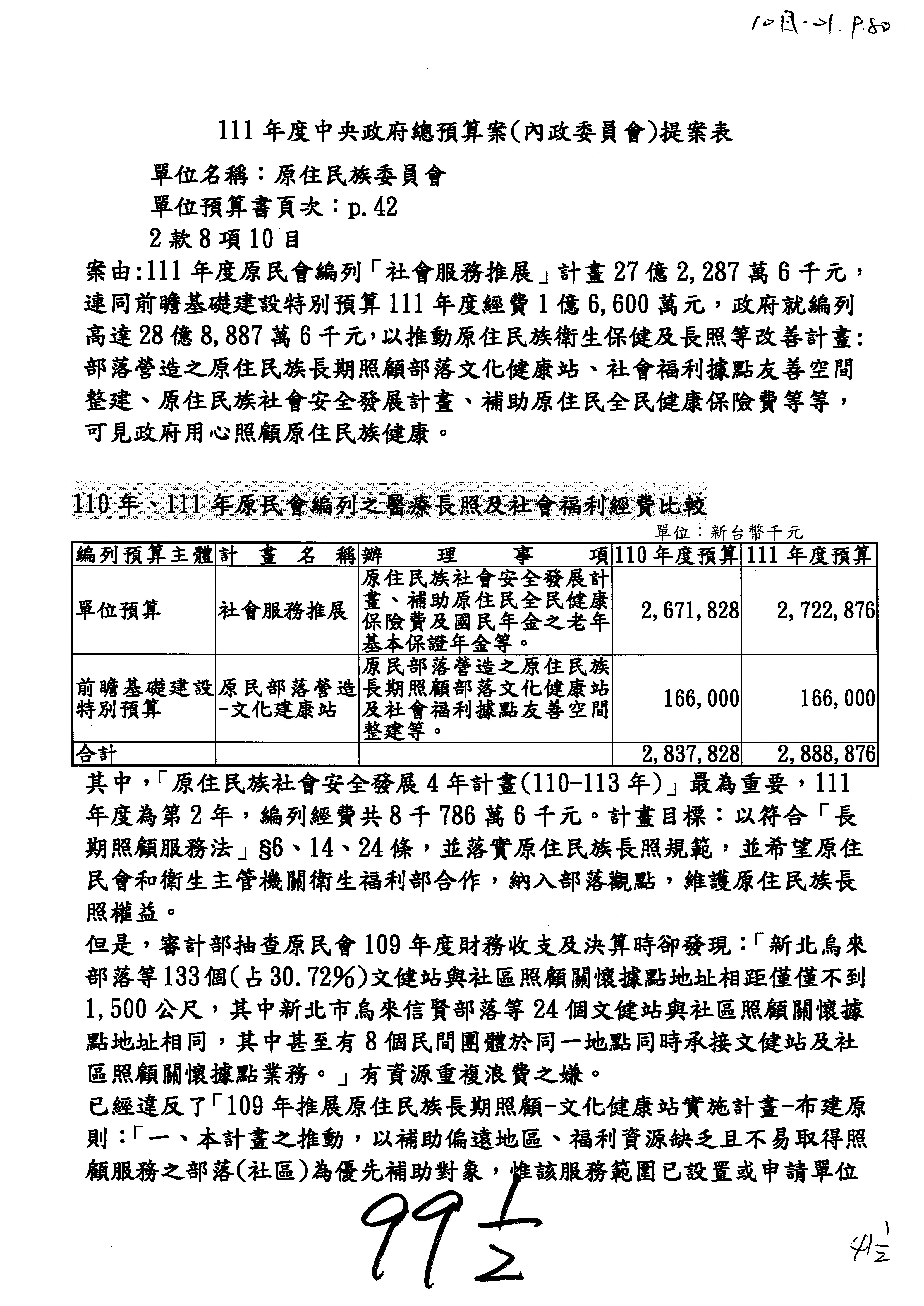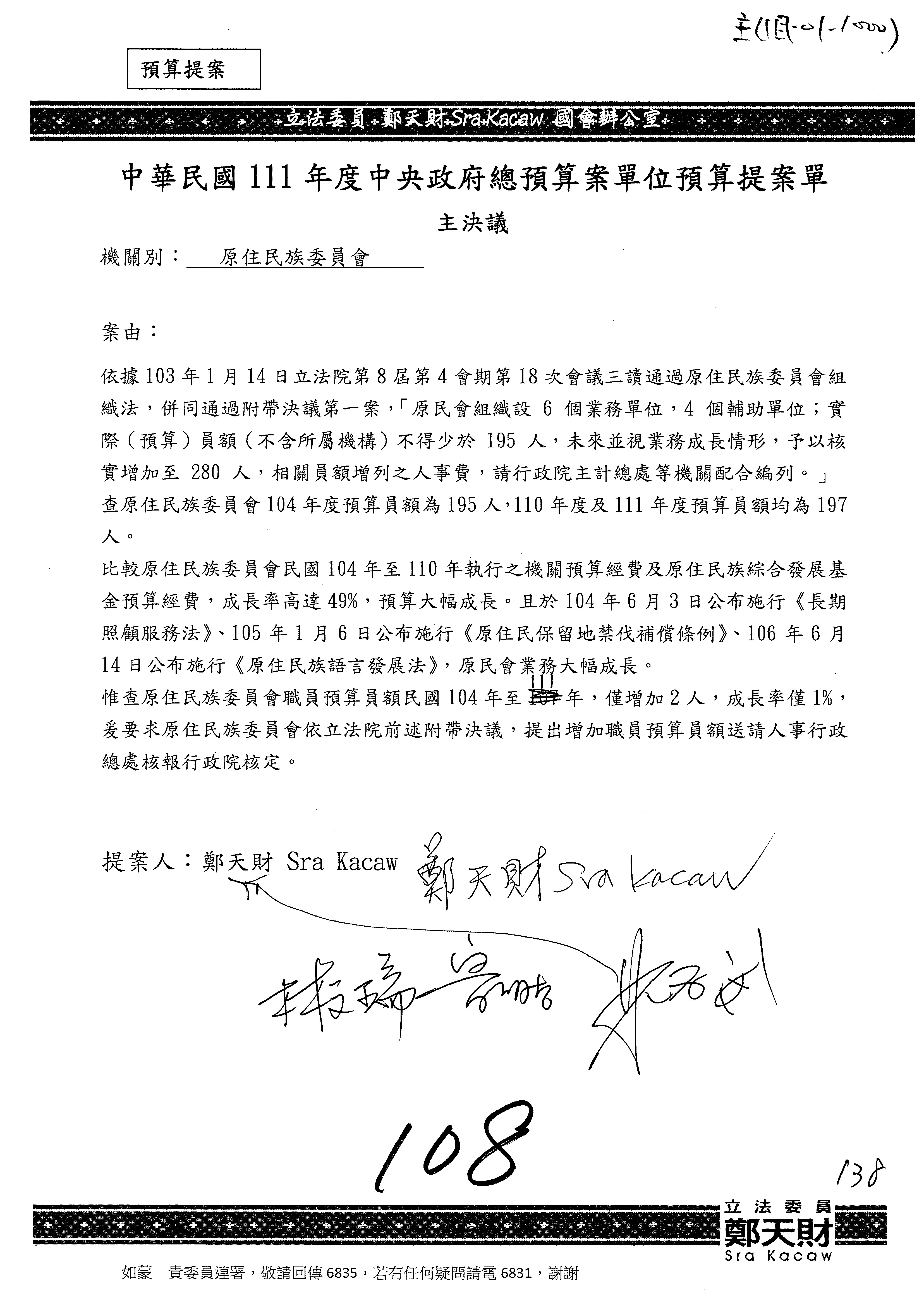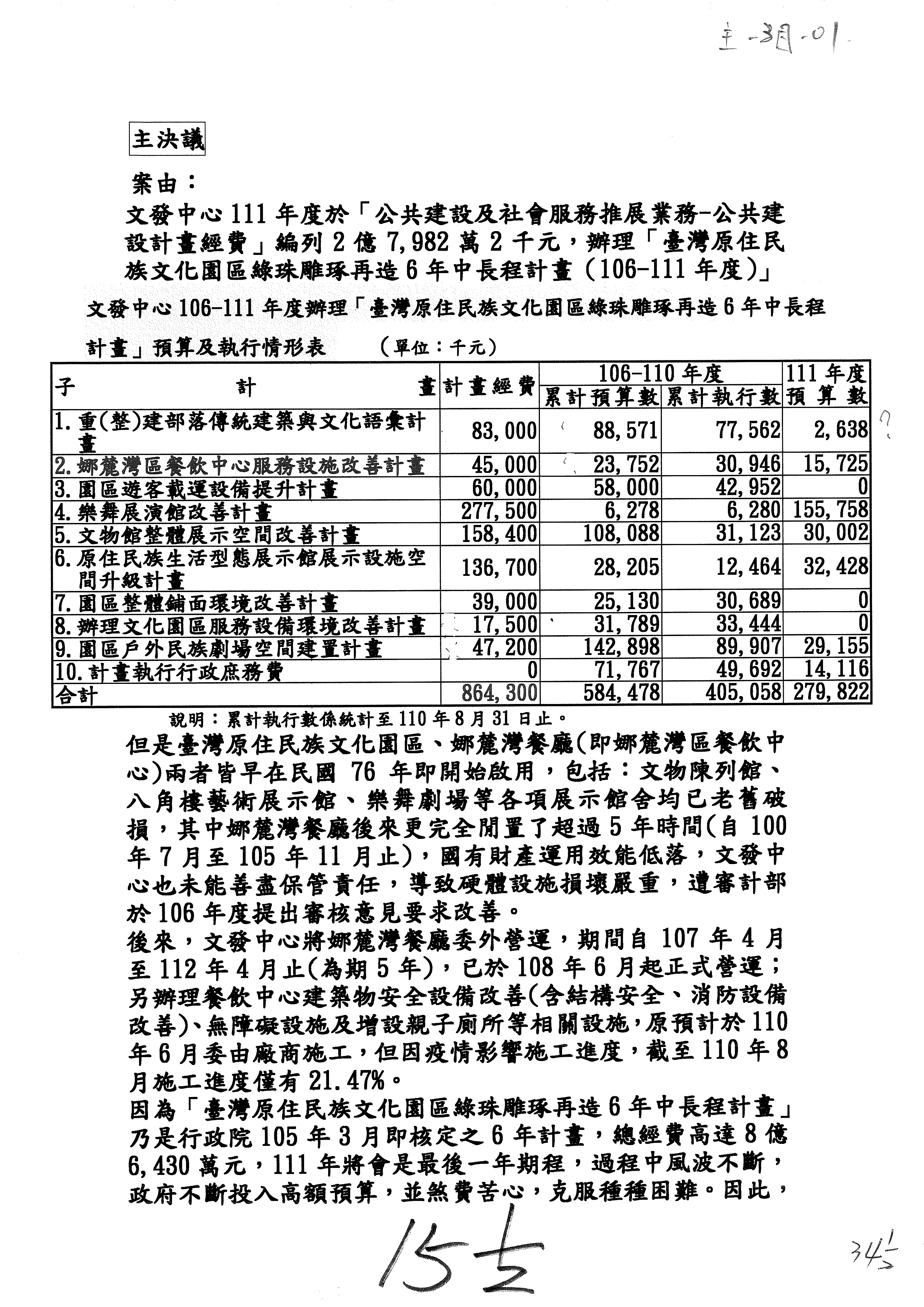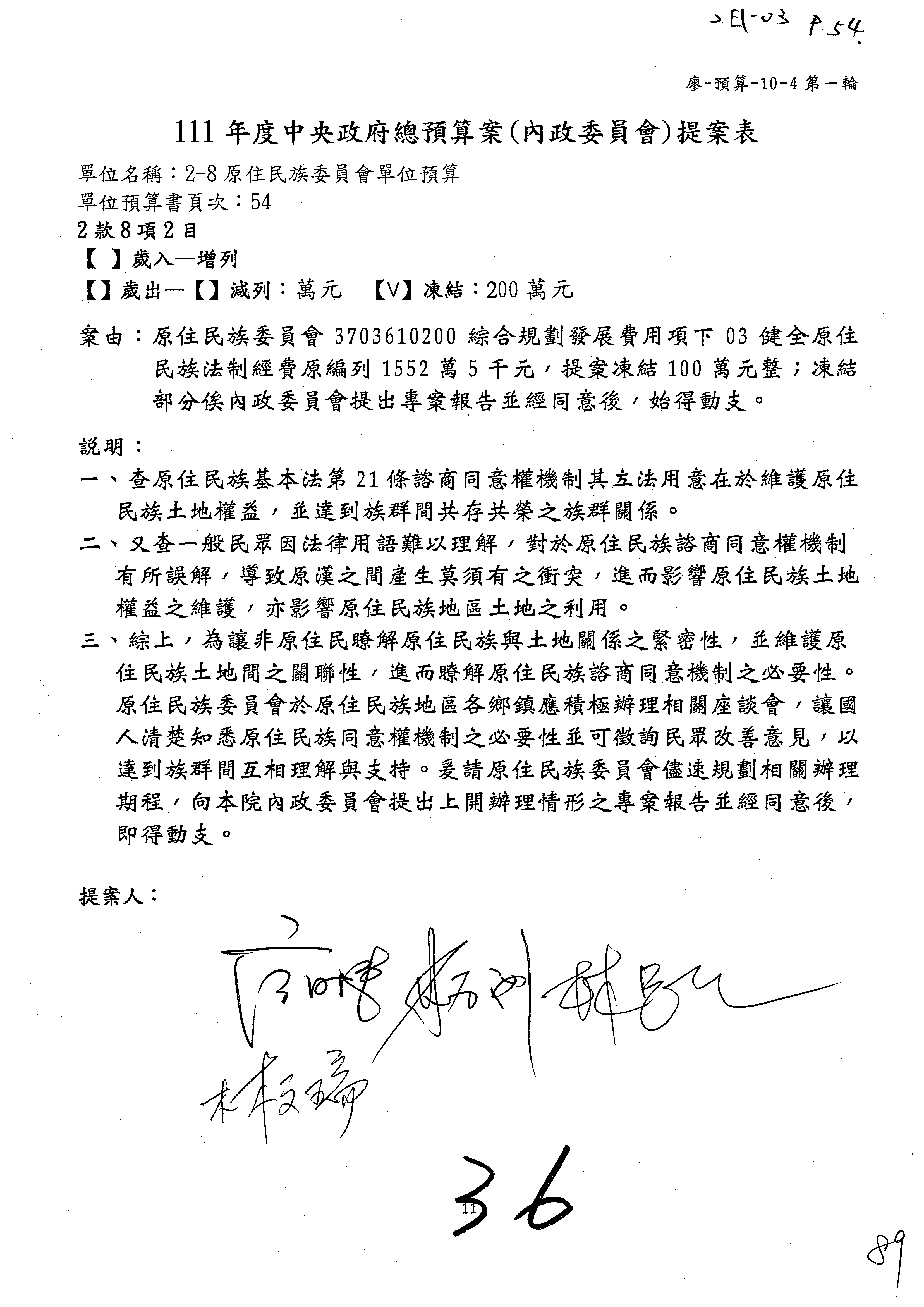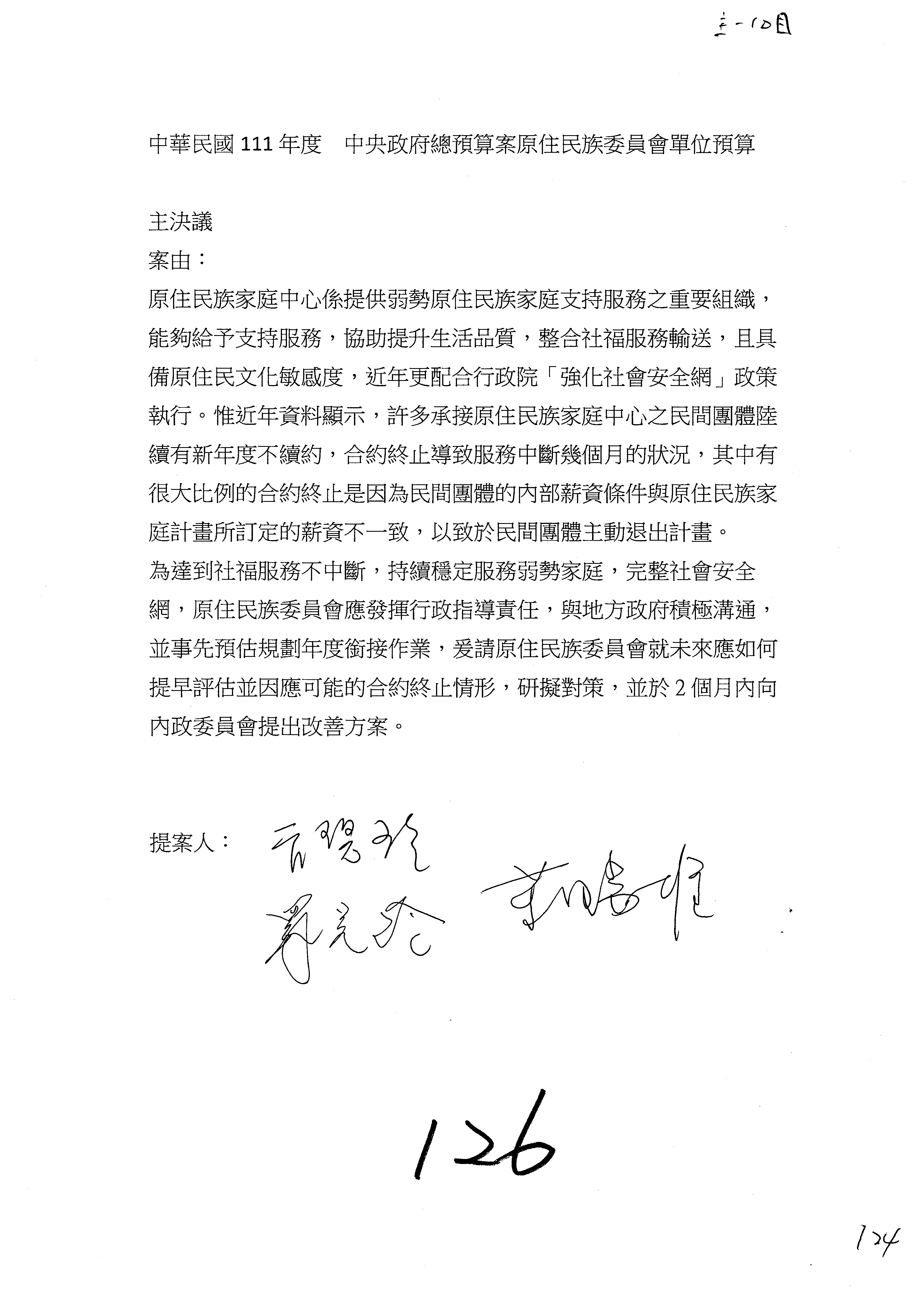 繼續審查111年度中央政府總預算案關於原住民族委員會、原住民族文化發展中心部分。