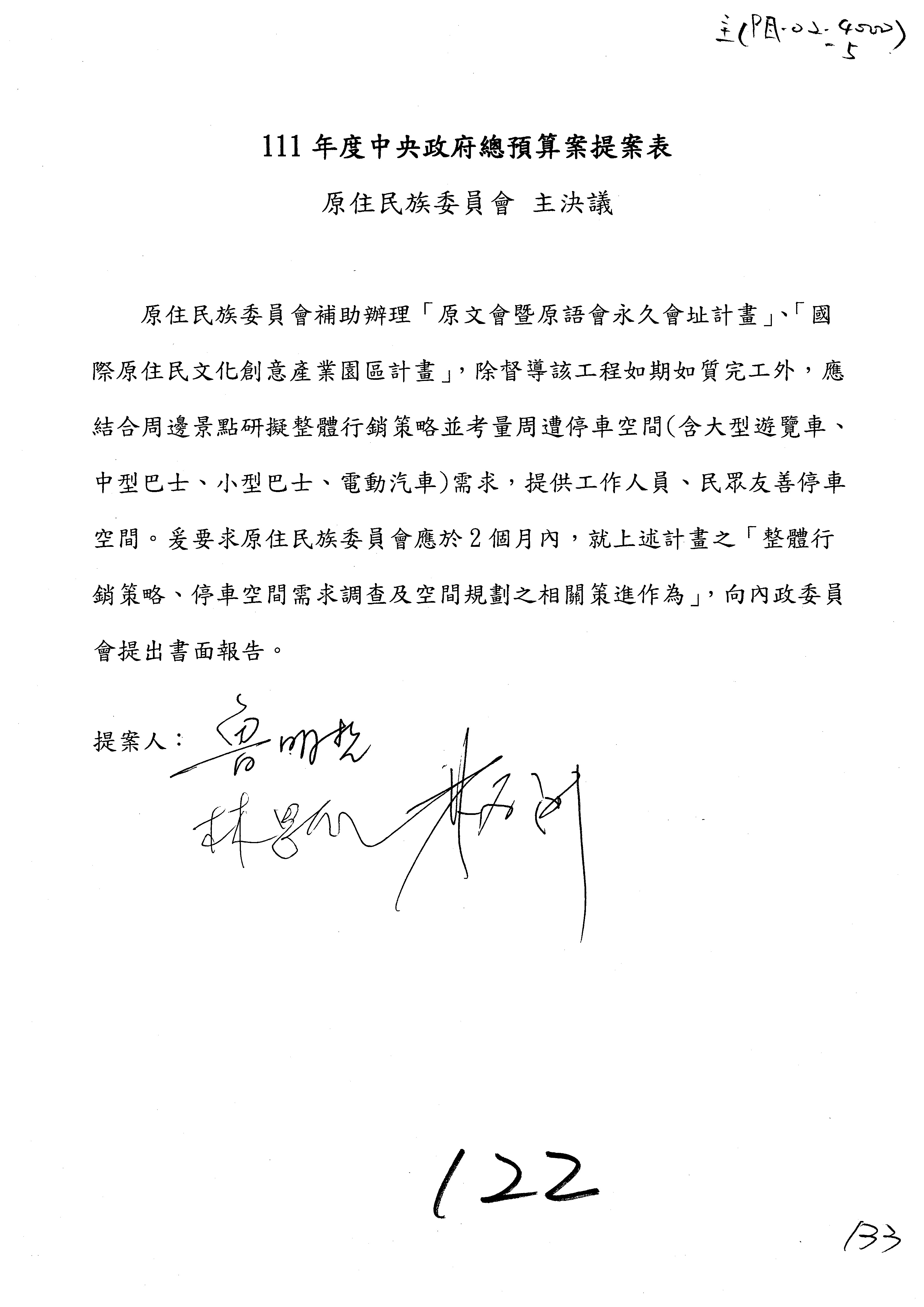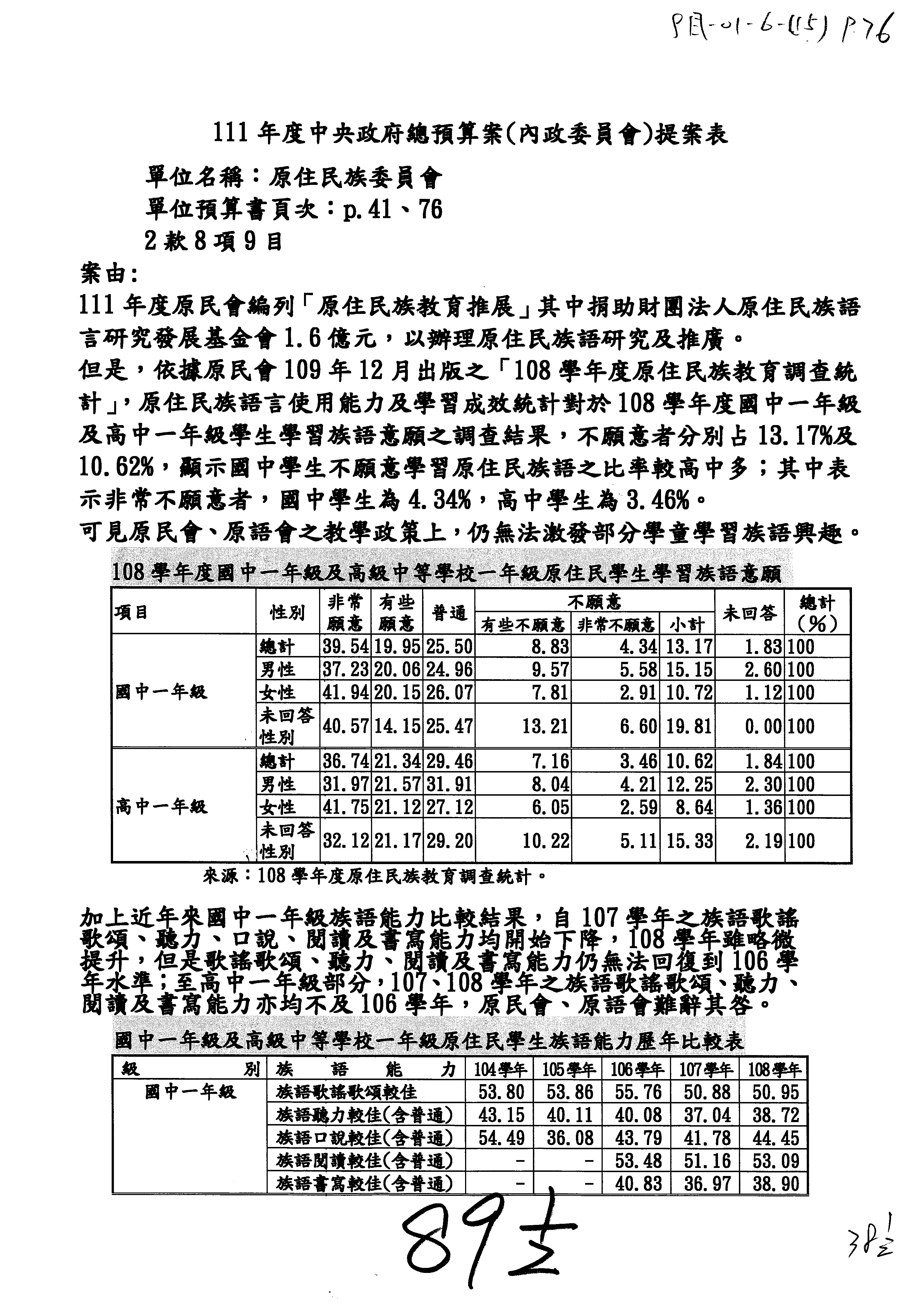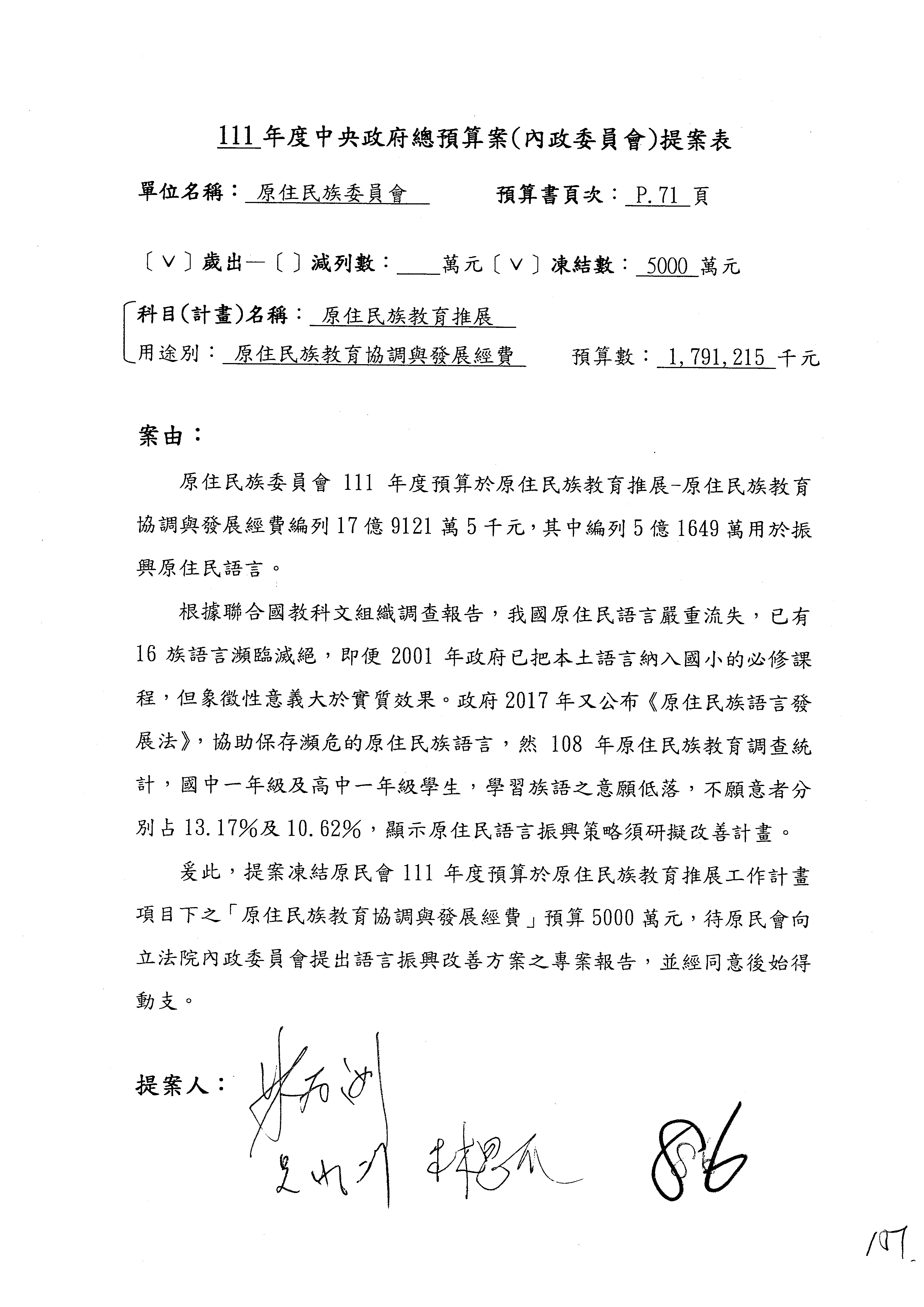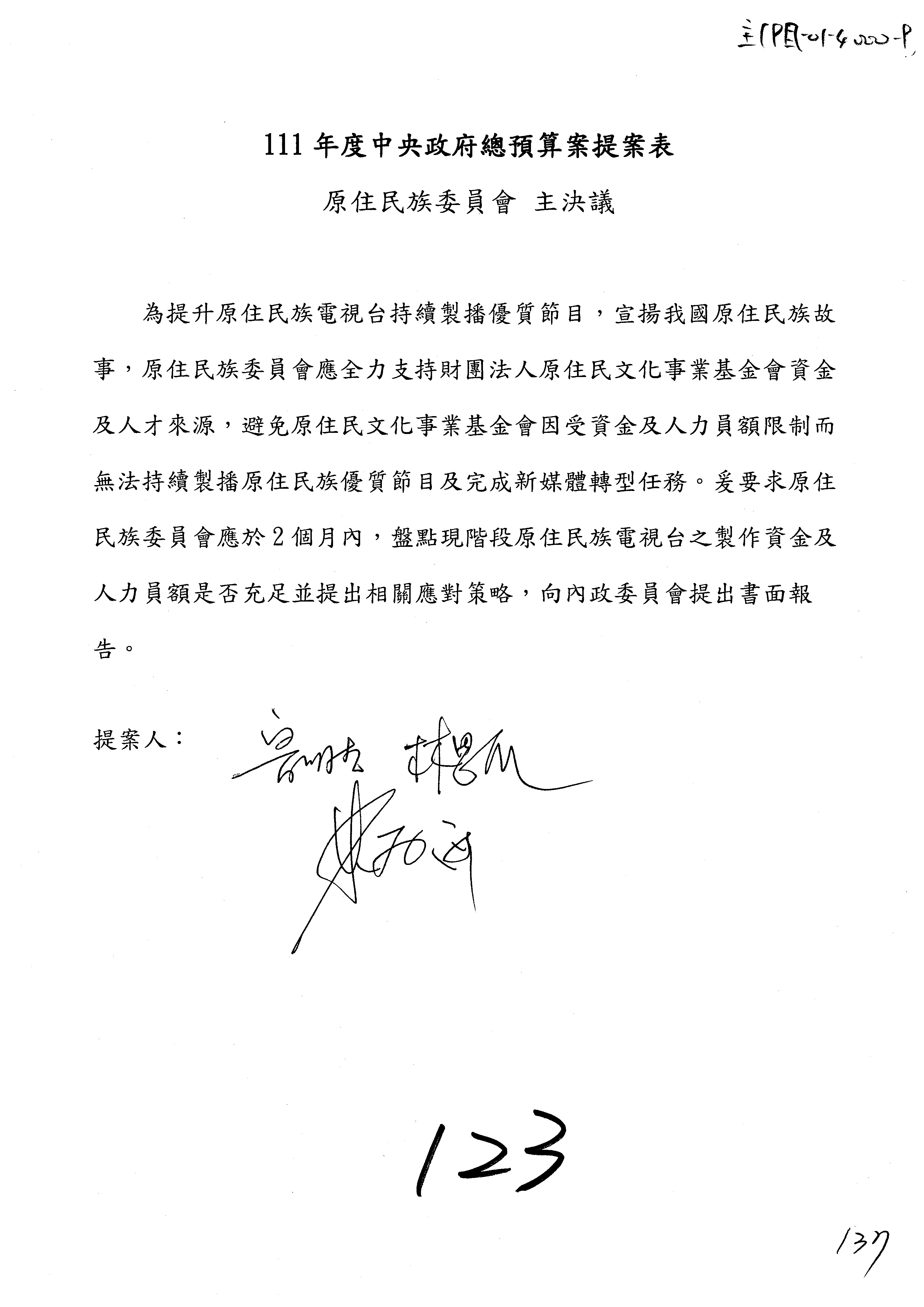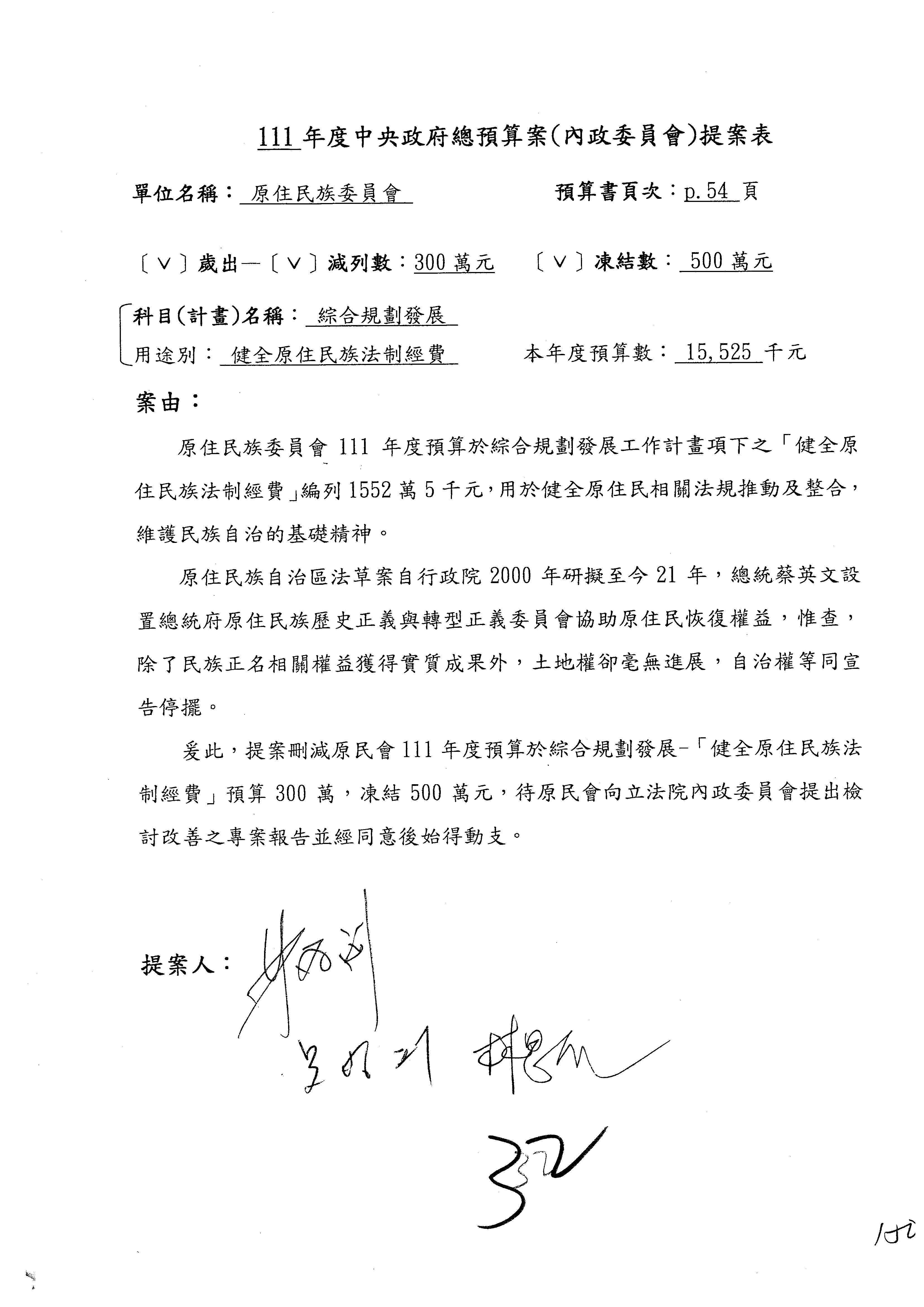 繼續審查111年度中央政府總預算案關於原住民族委員會、原住民族文化發展中心部分。
