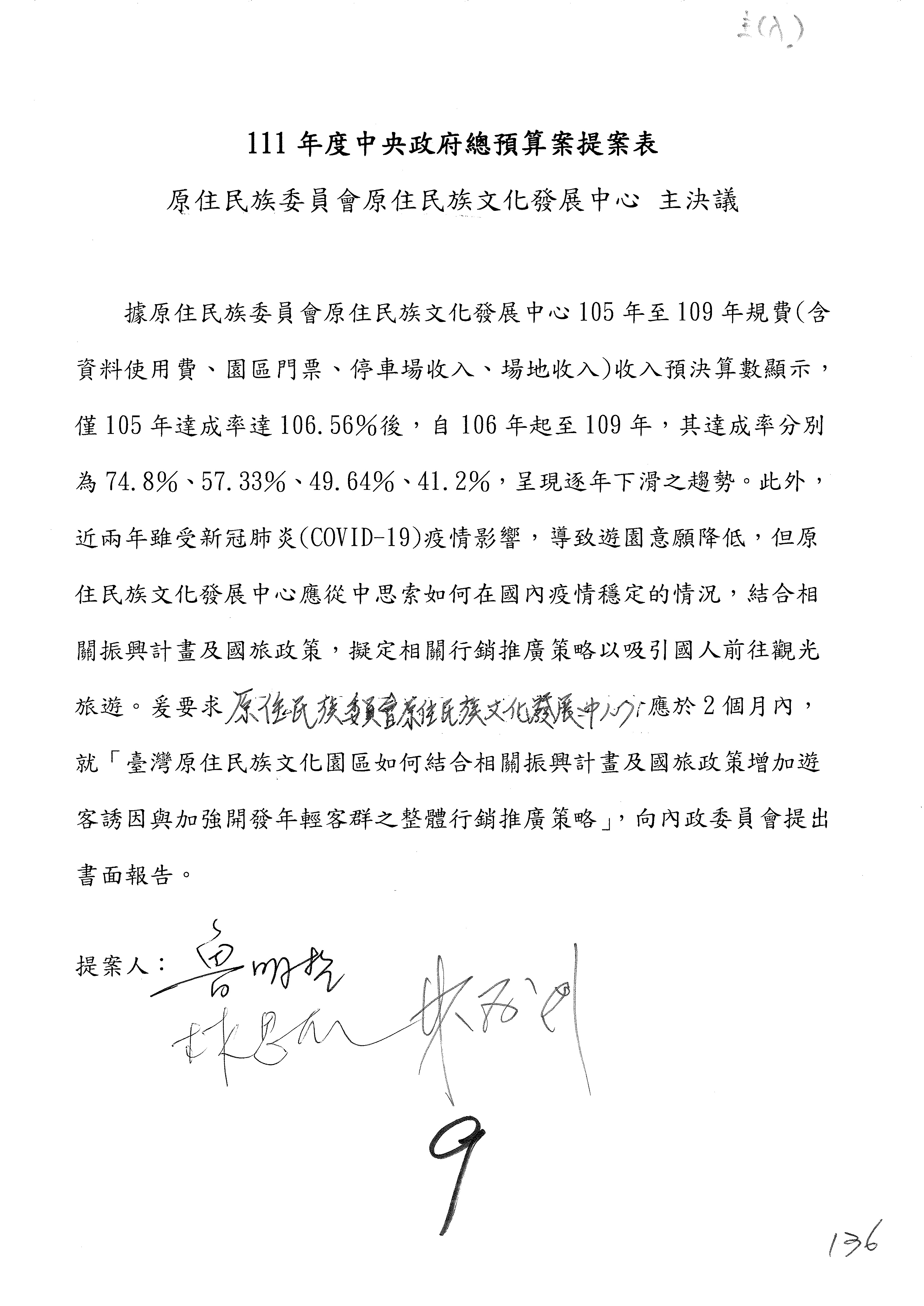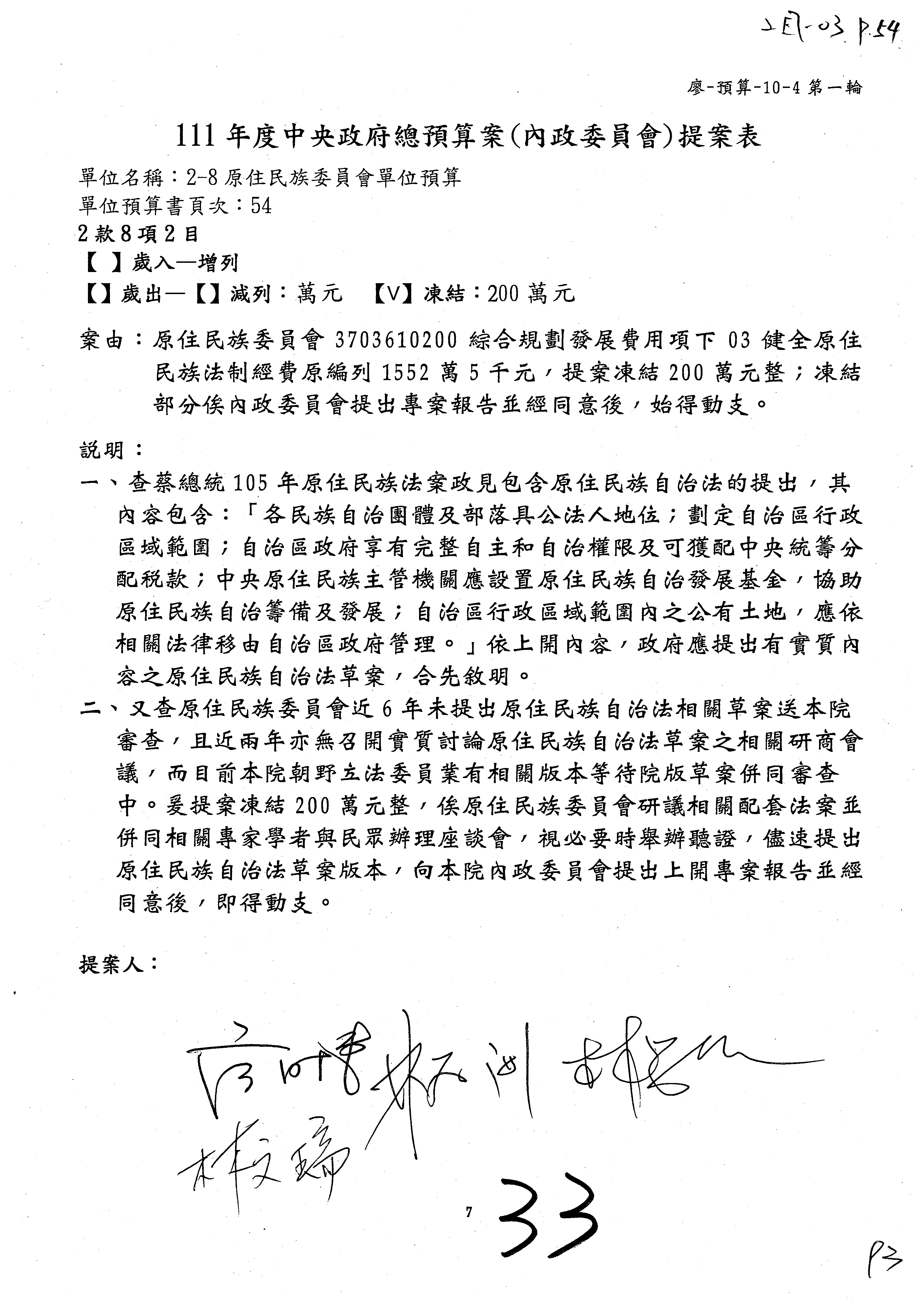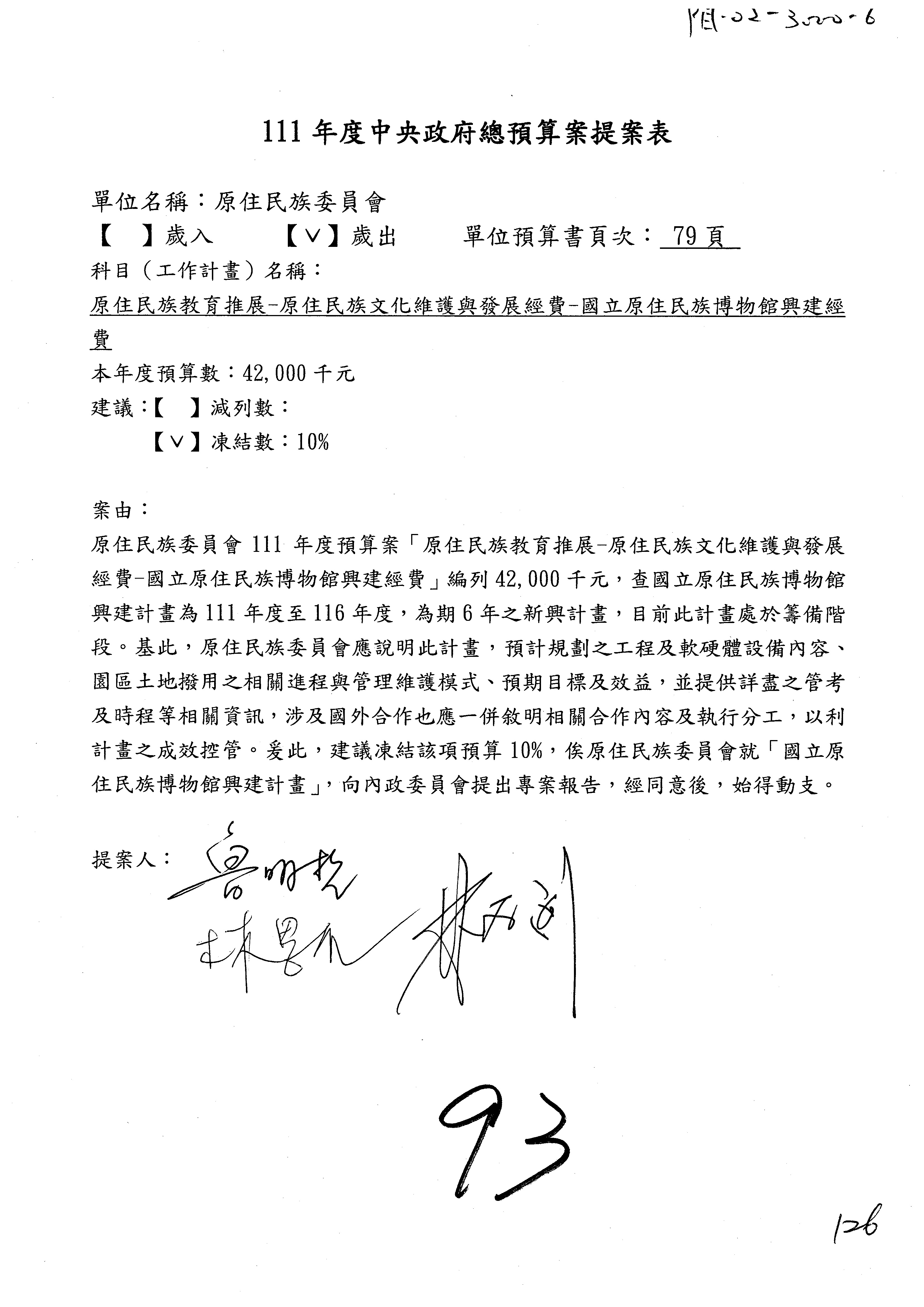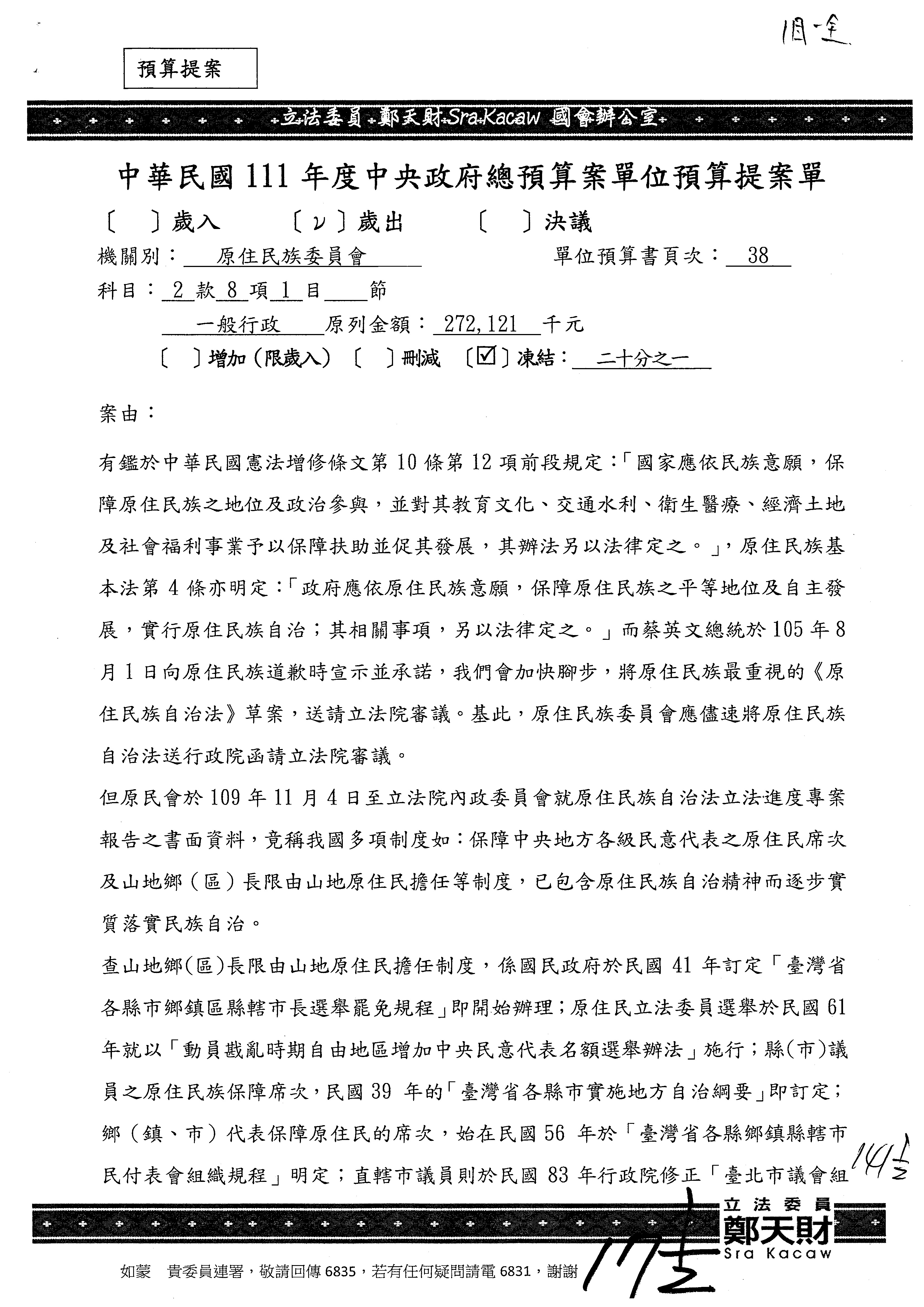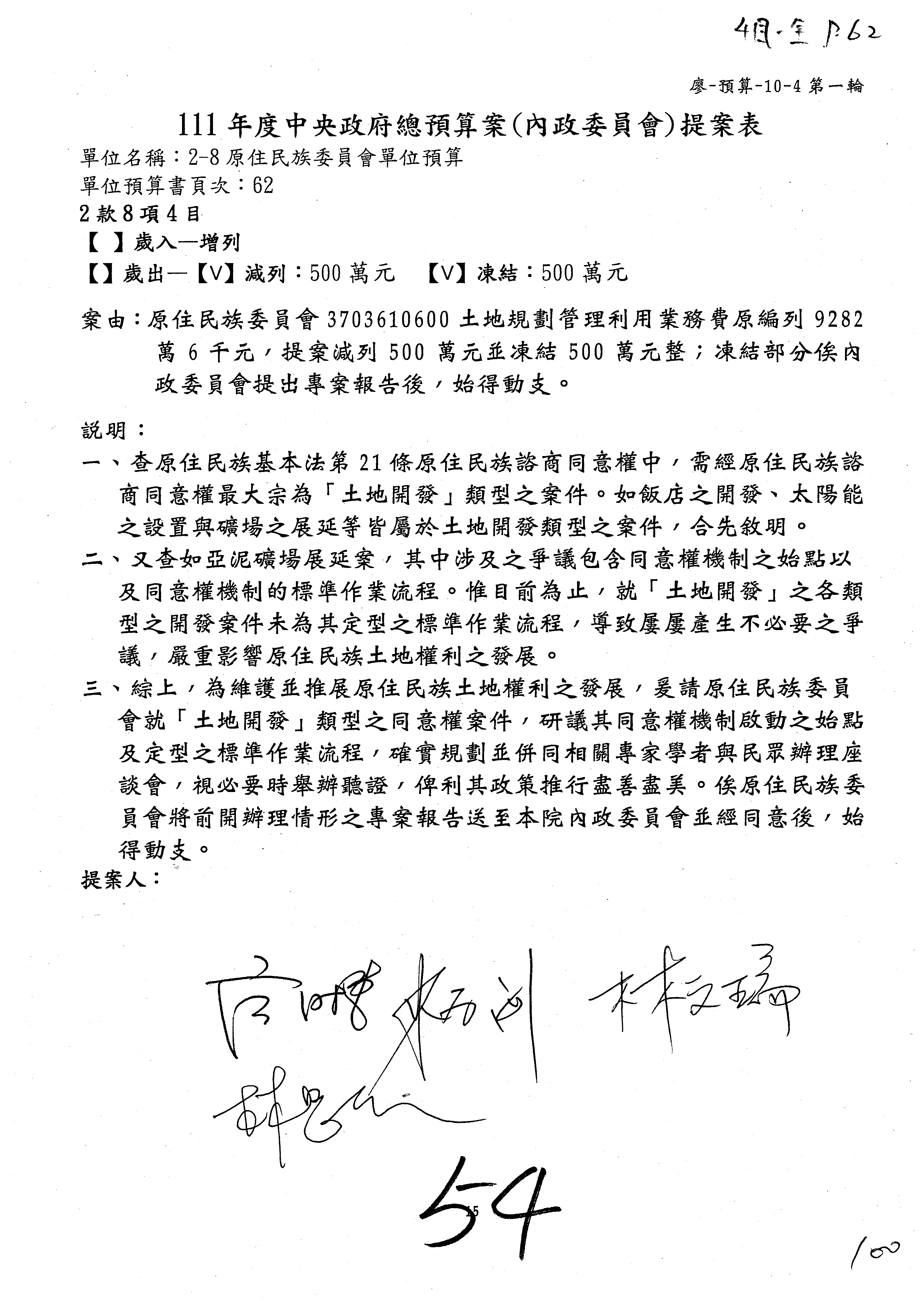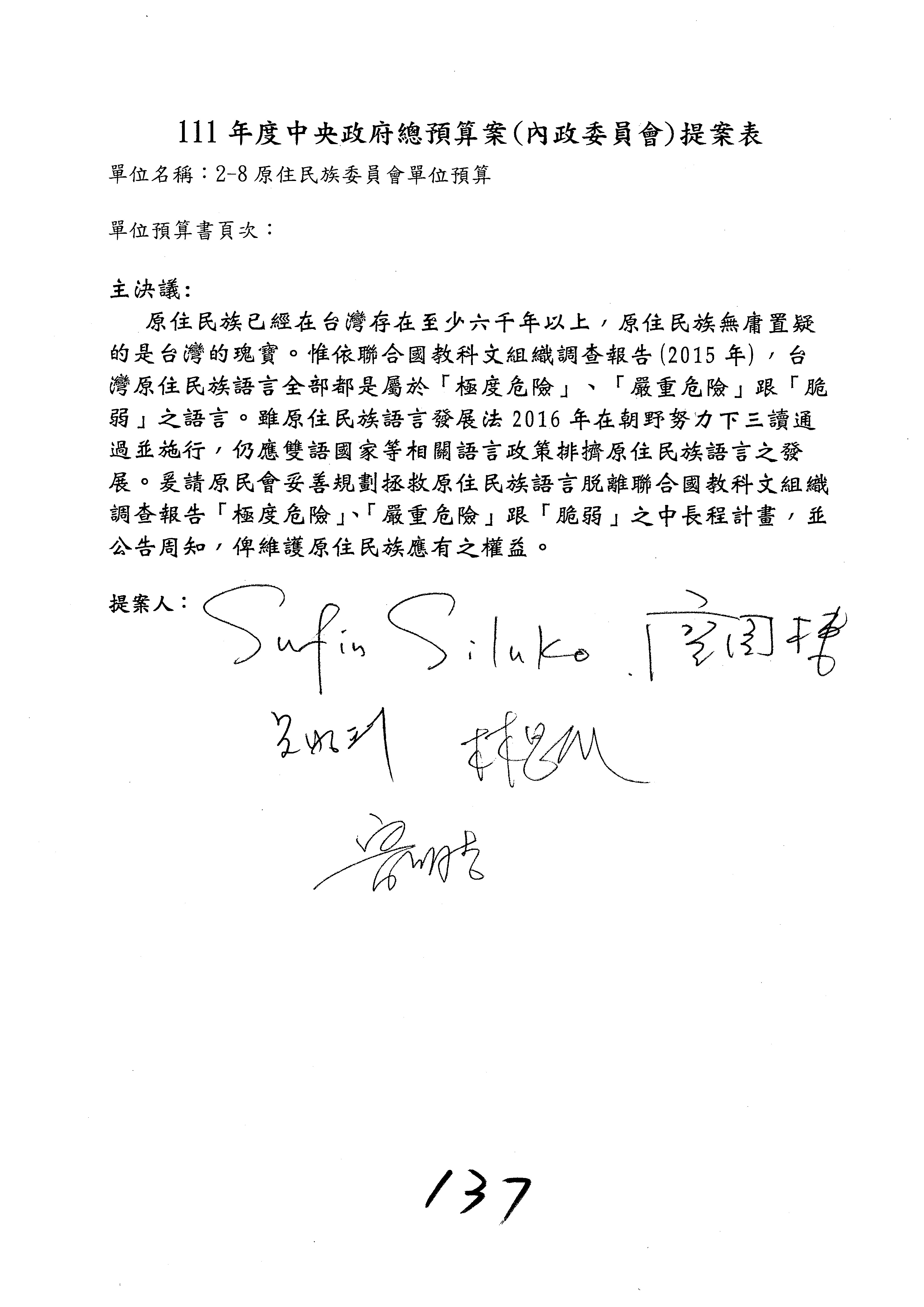 繼續審查111年度中央政府總預算案關於原住民族委員會、原住民族文化發展中心部分。