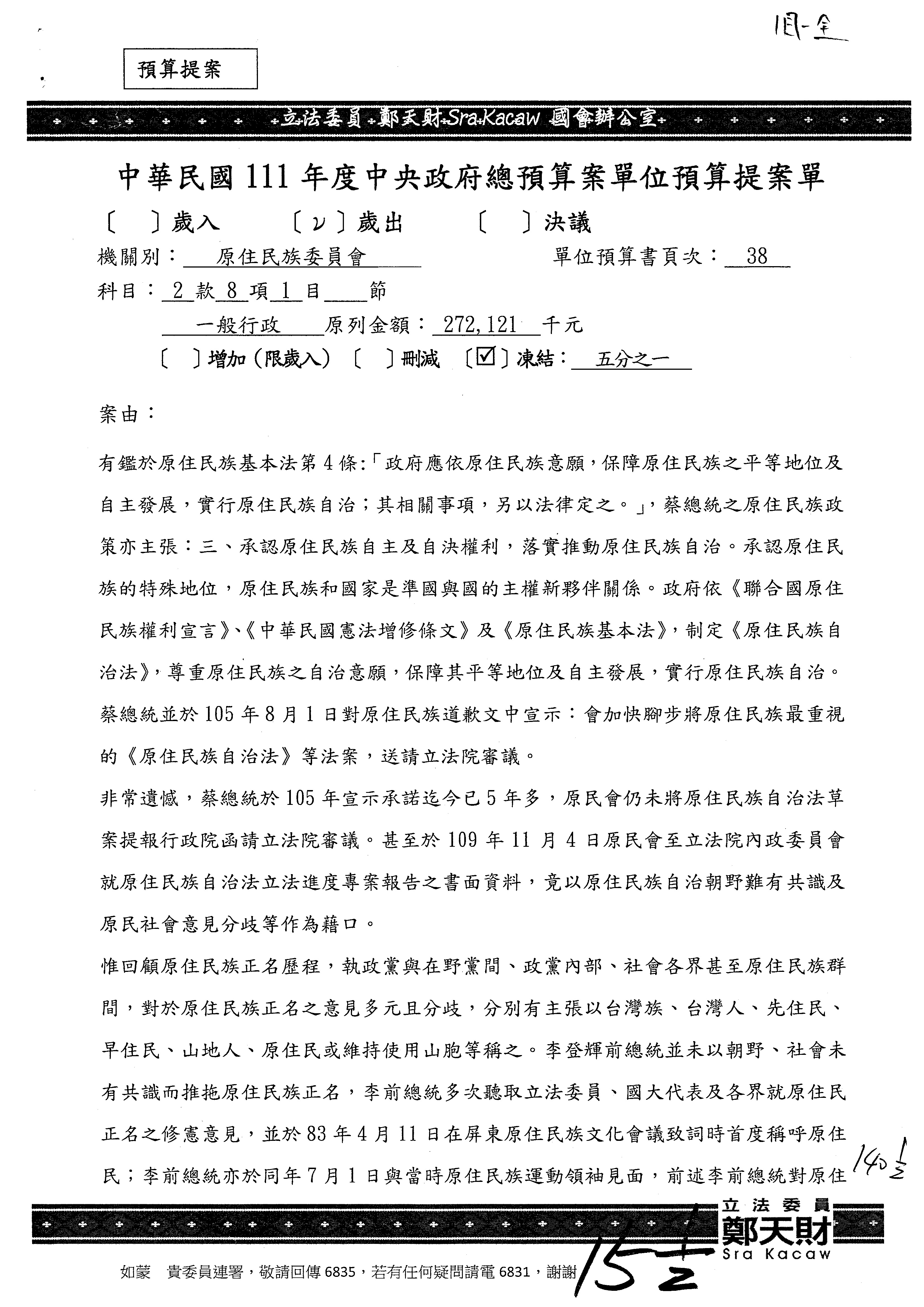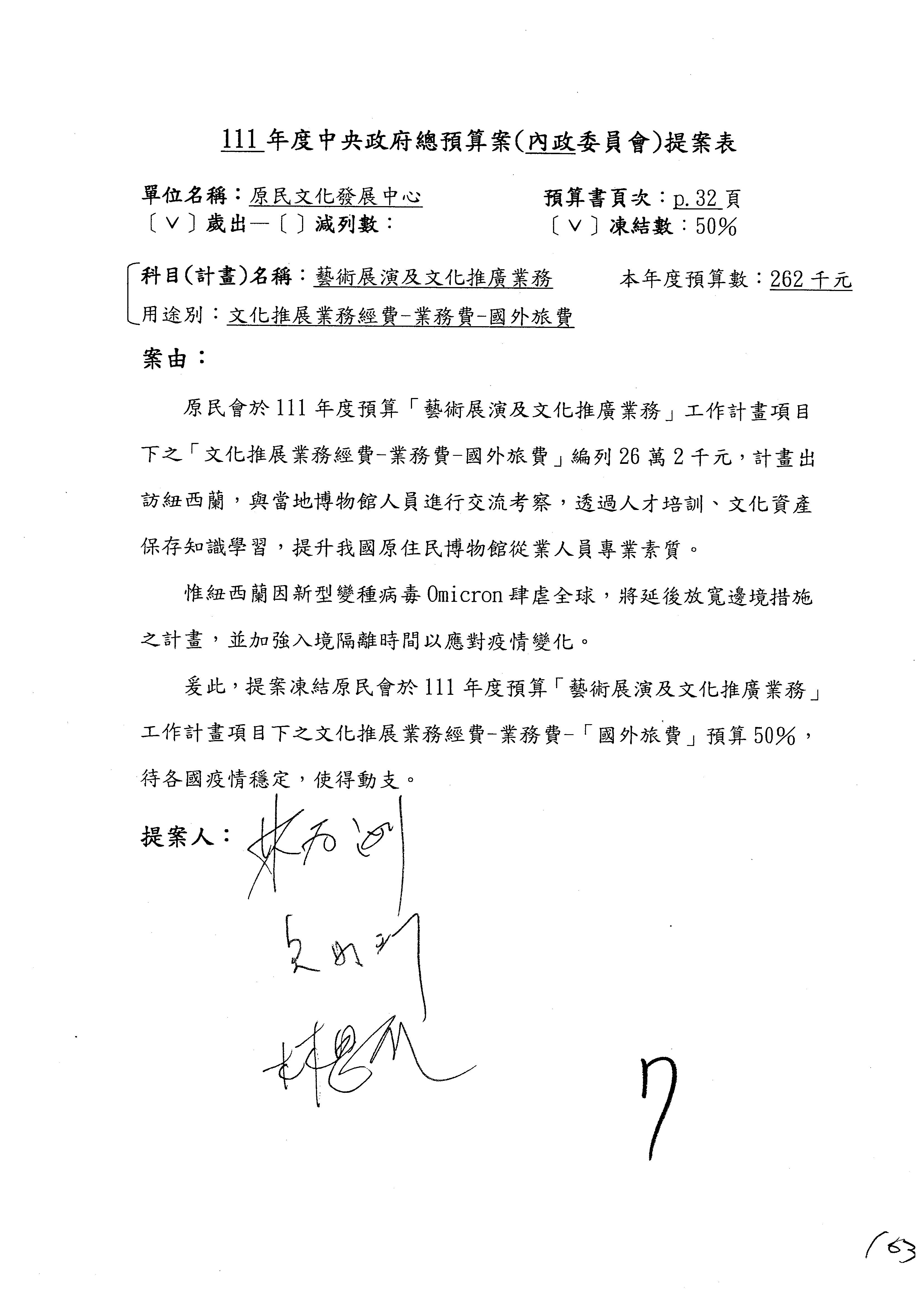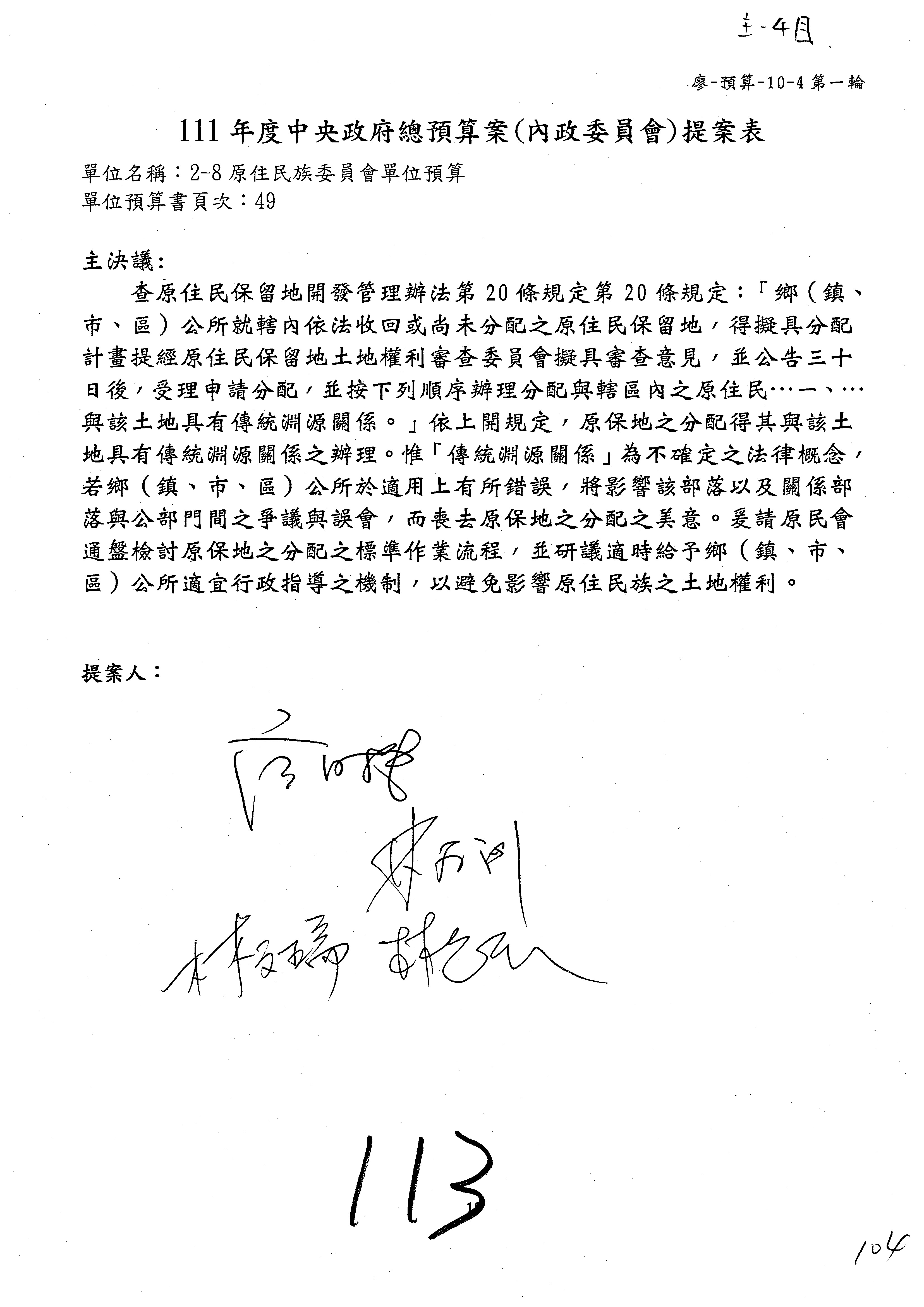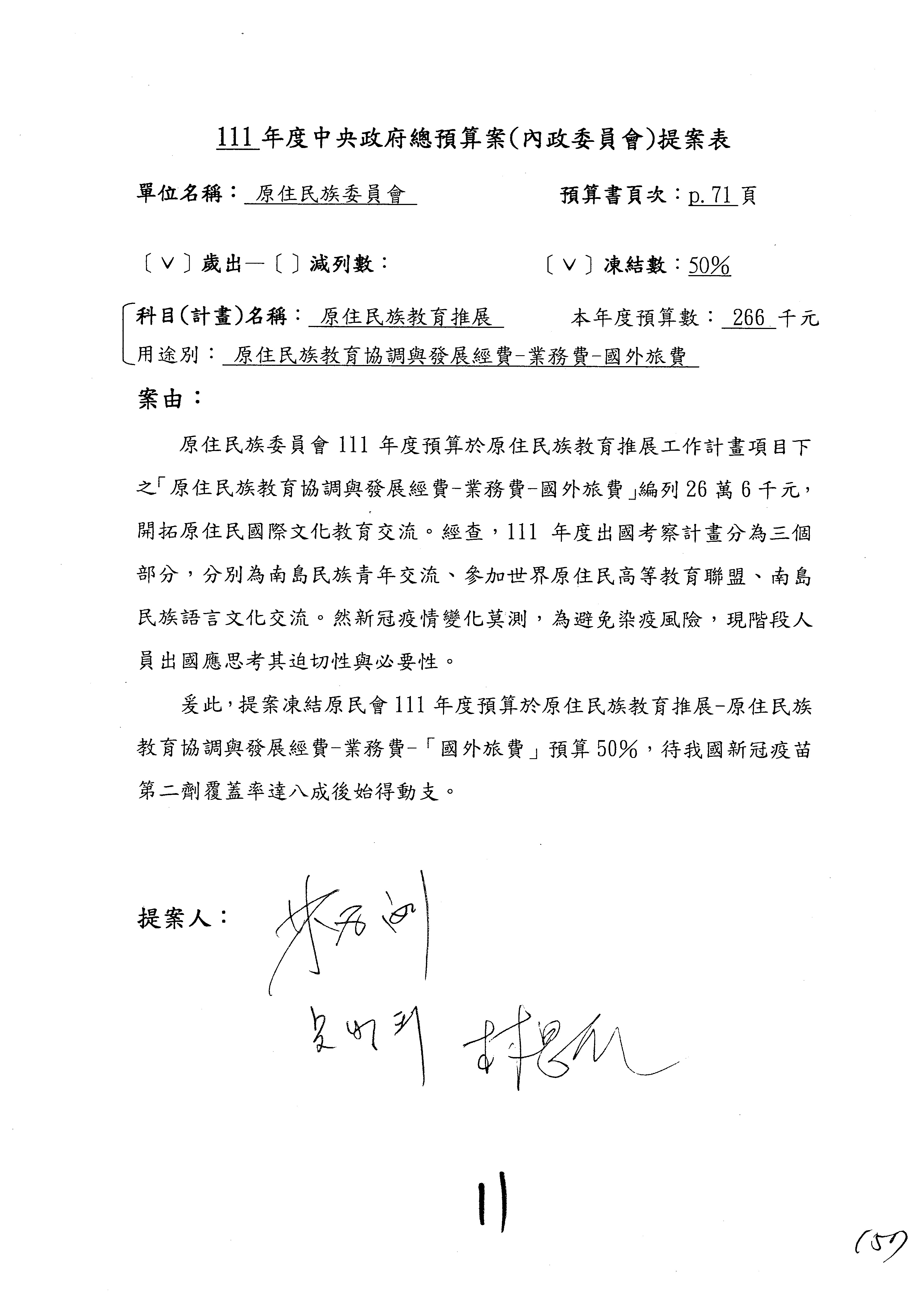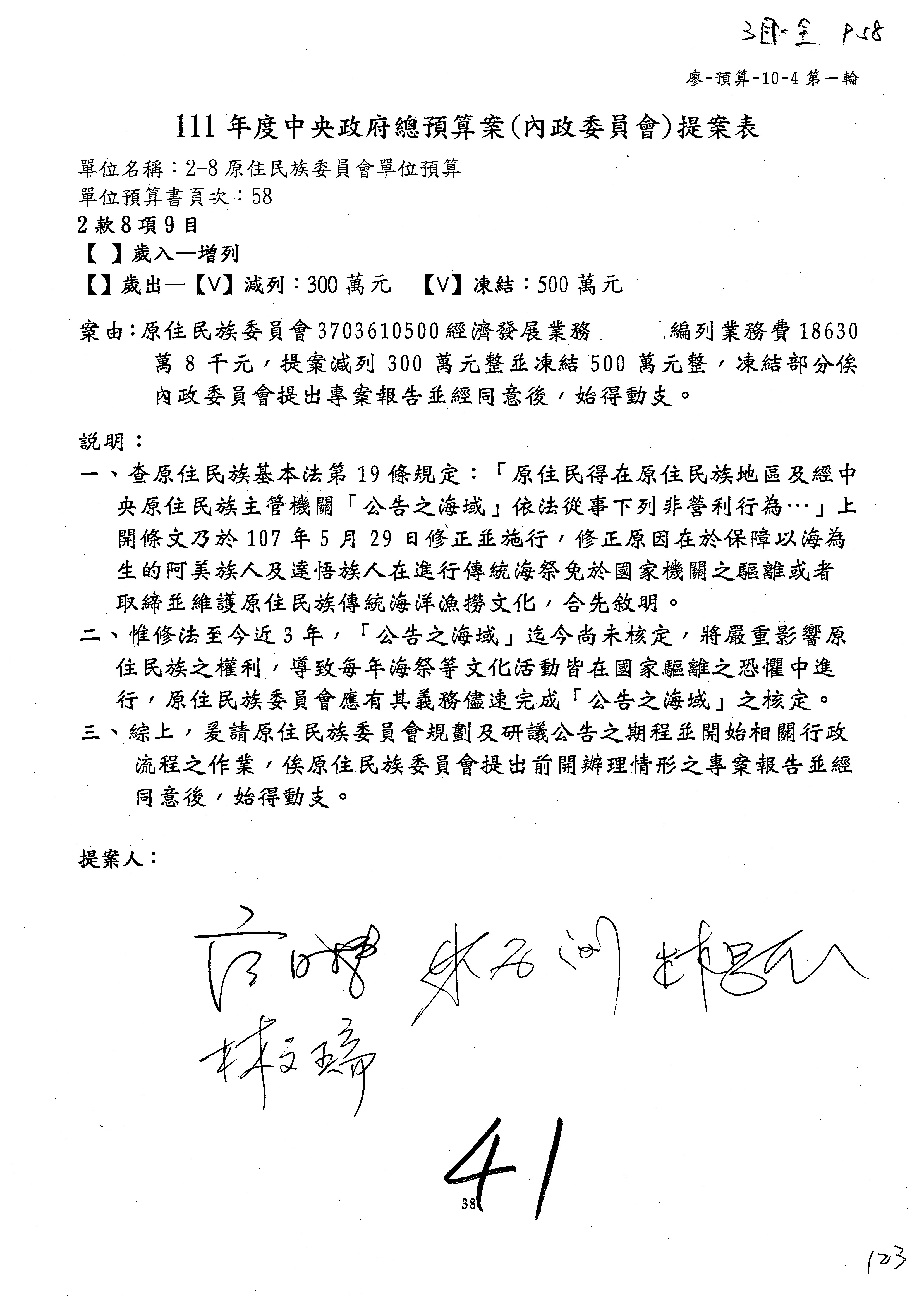 繼續審查111年度中央政府總預算案關於原住民族委員會、原住民族文化發展中心部分。