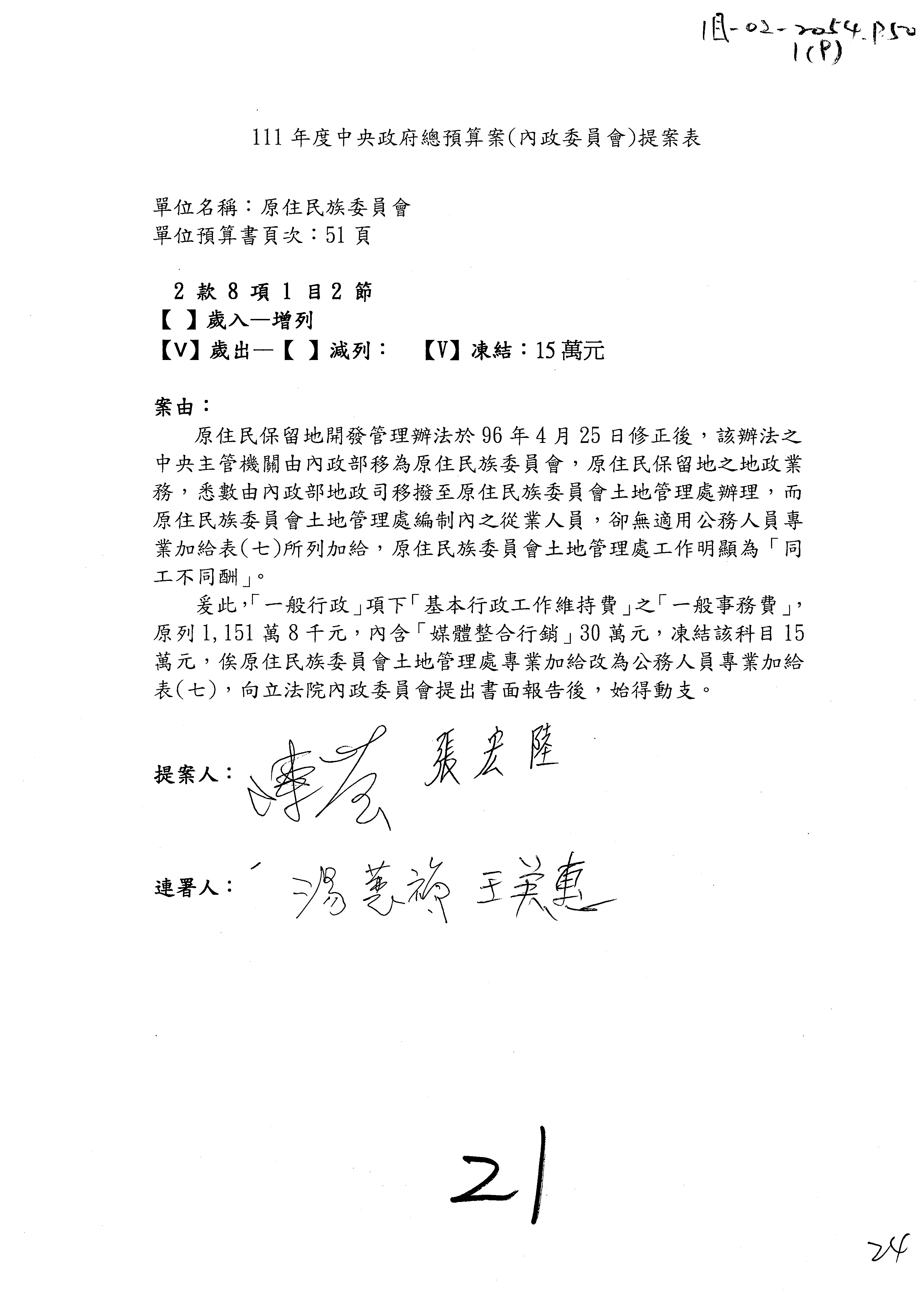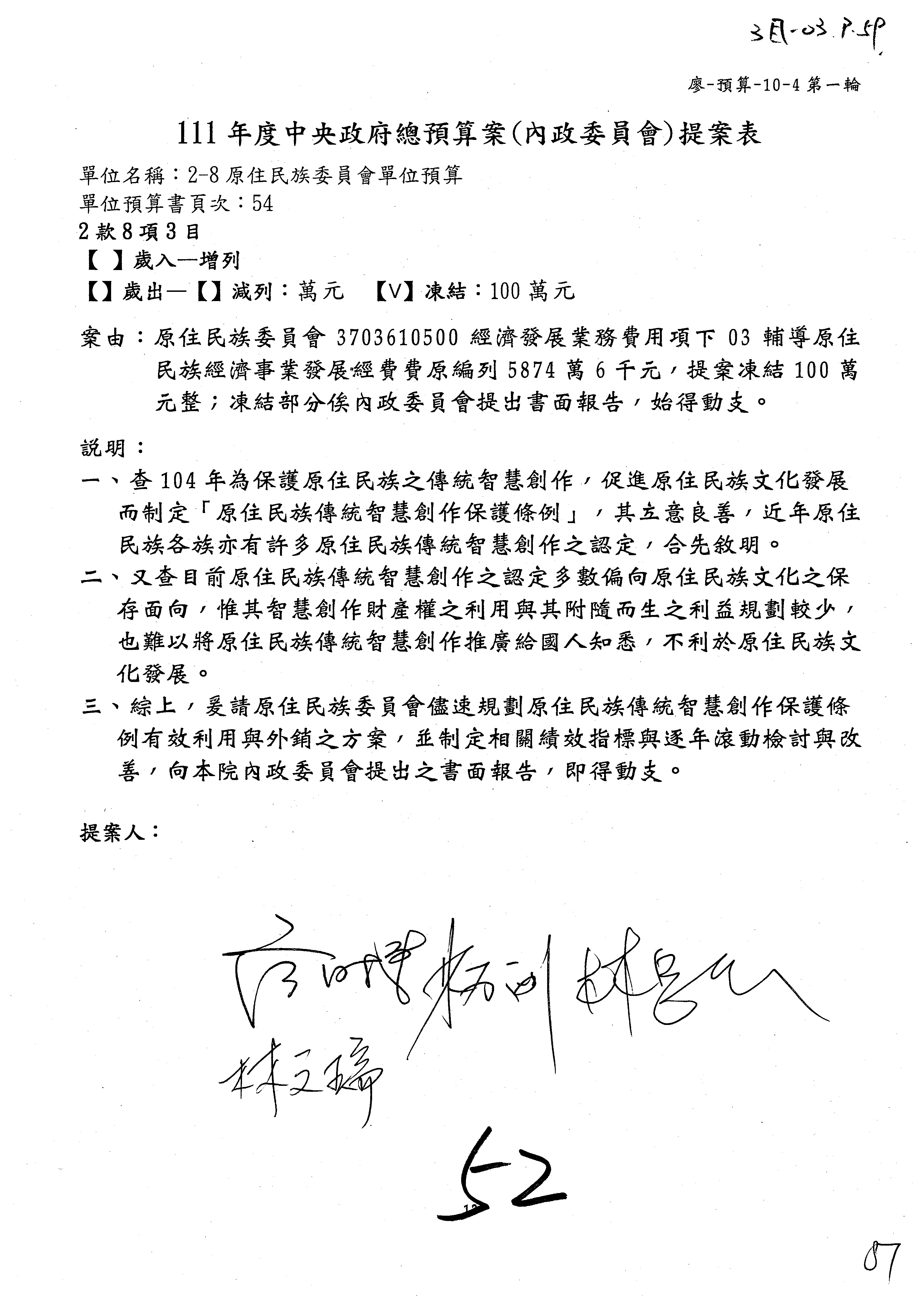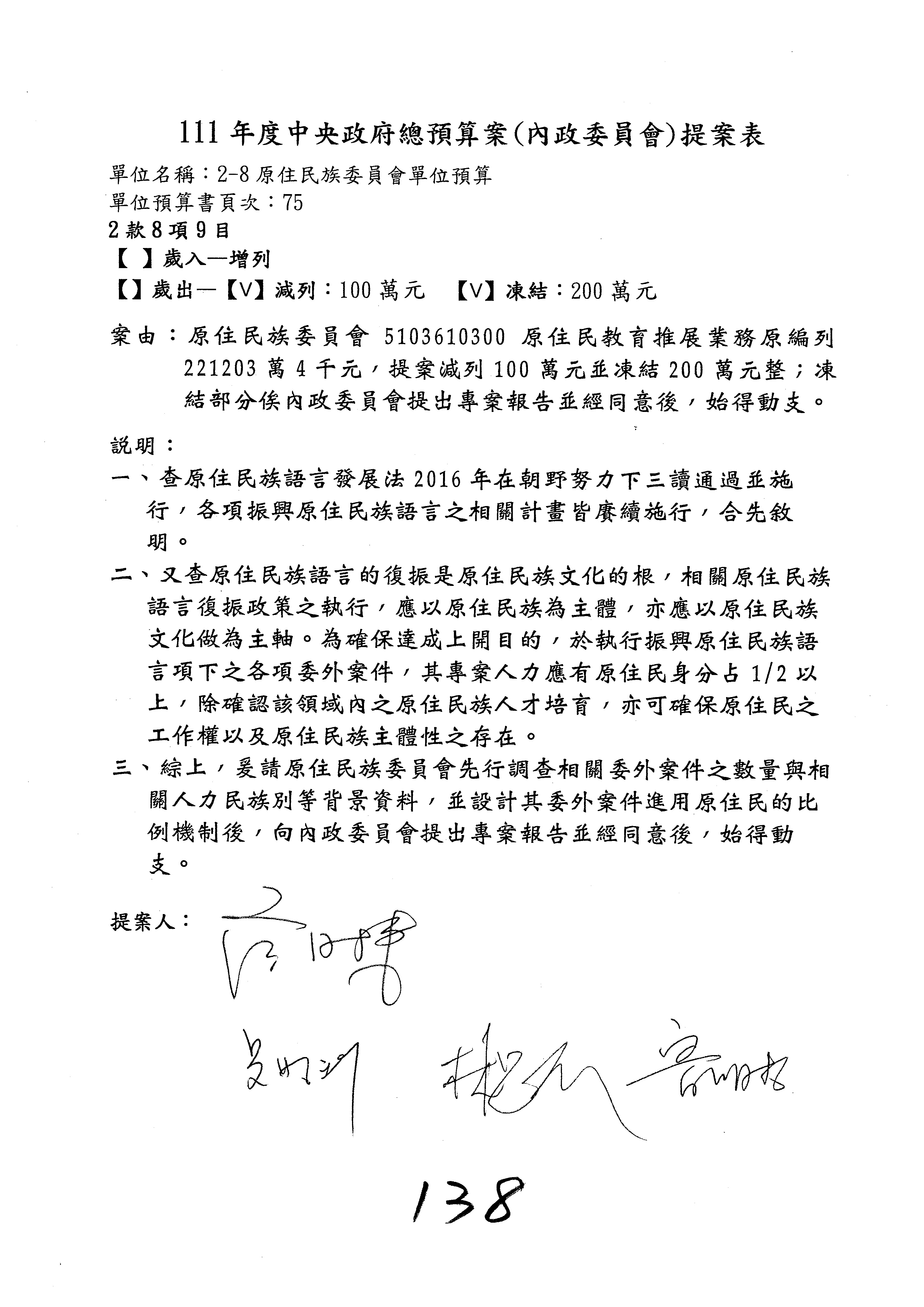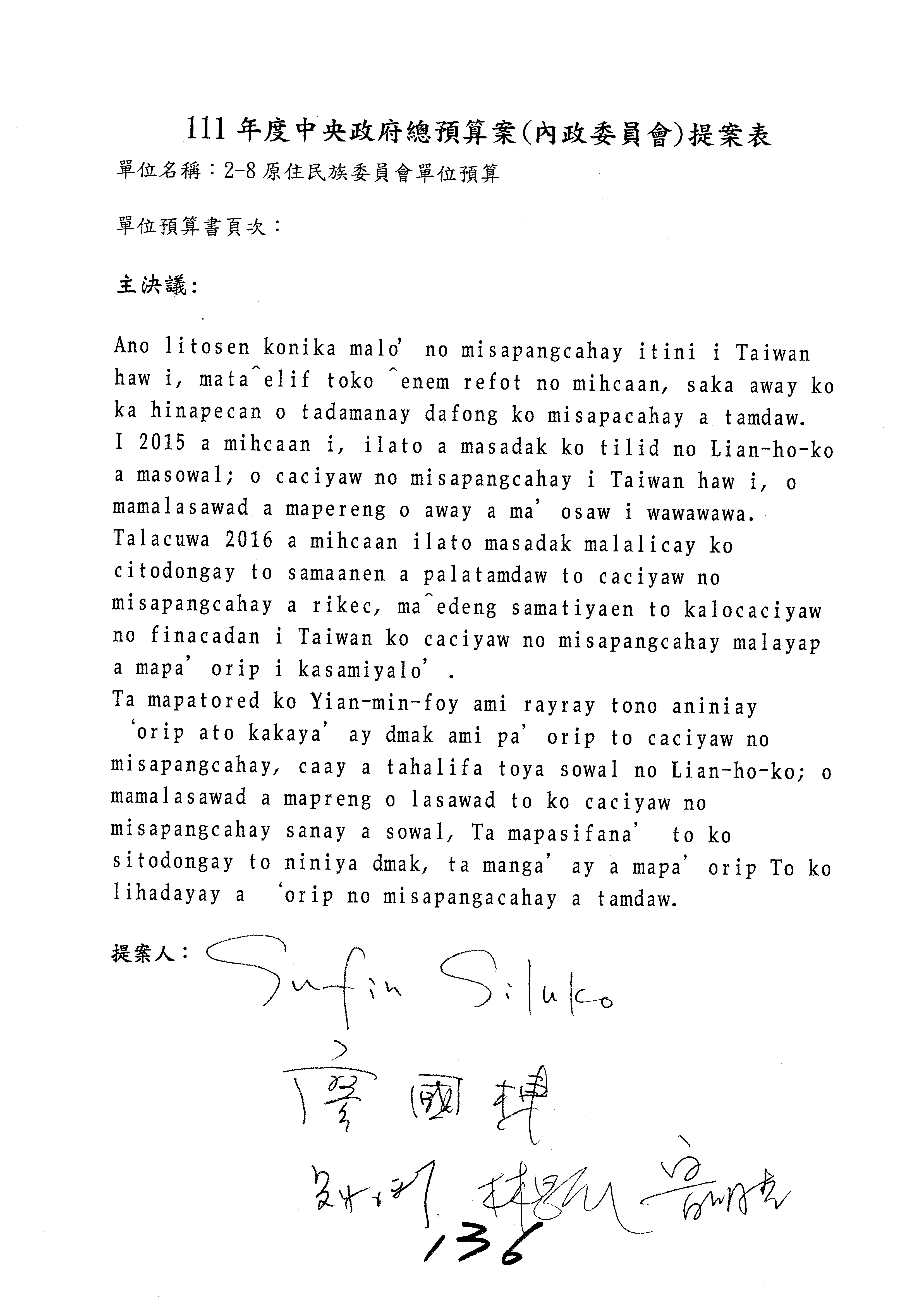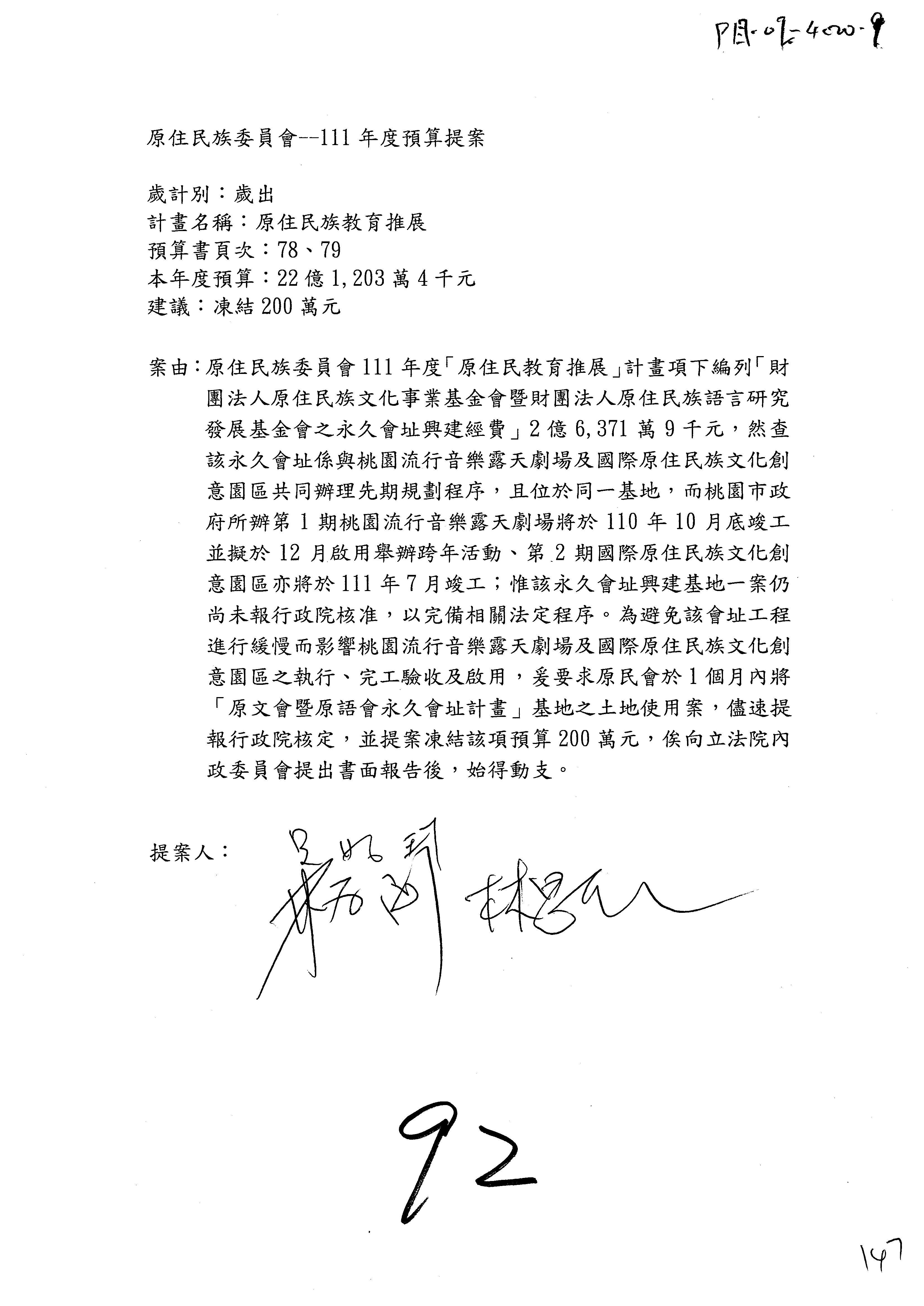 繼續審查111年度中央政府總預算案關於原住民族委員會、原住民族文化發展中心部分。