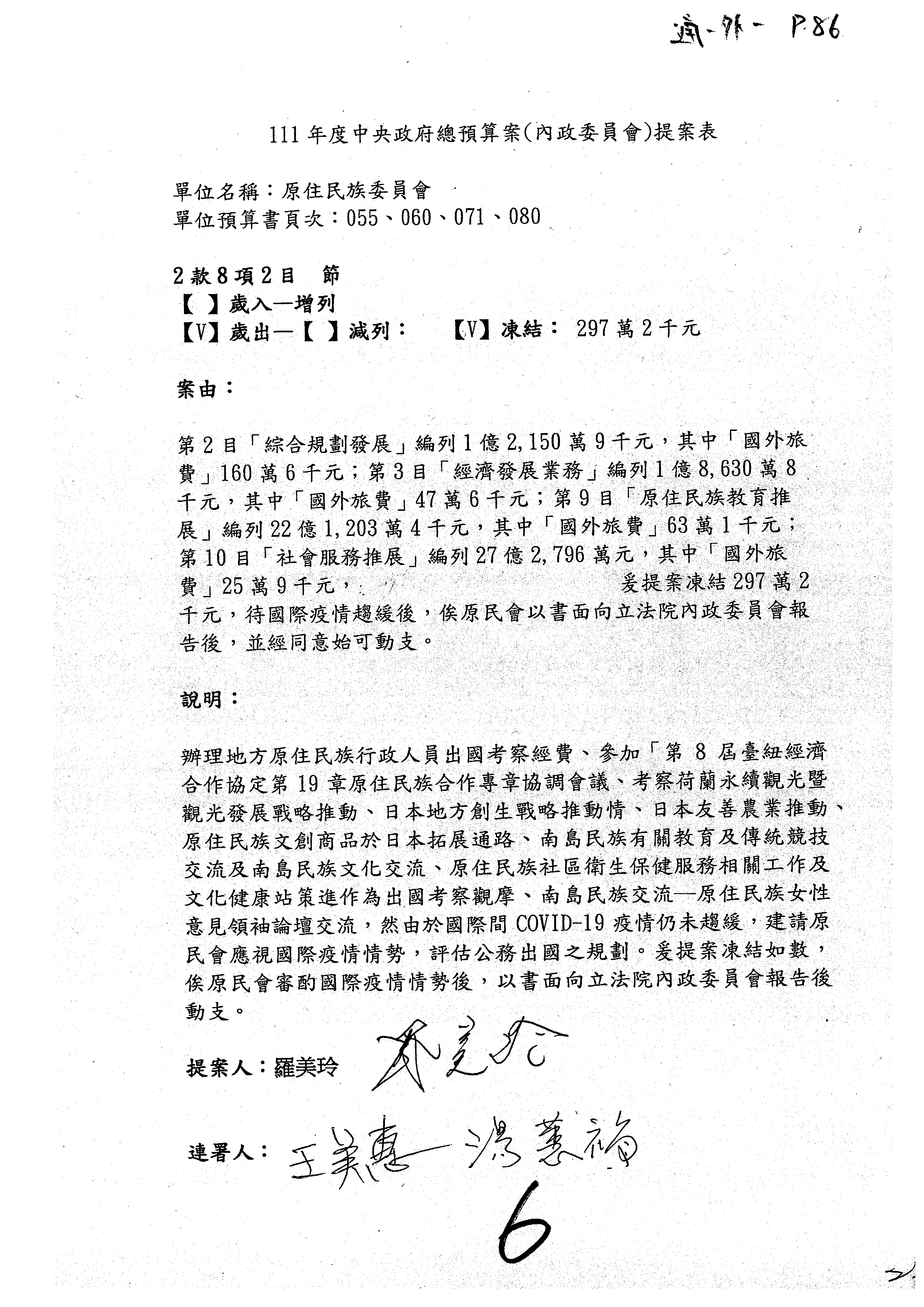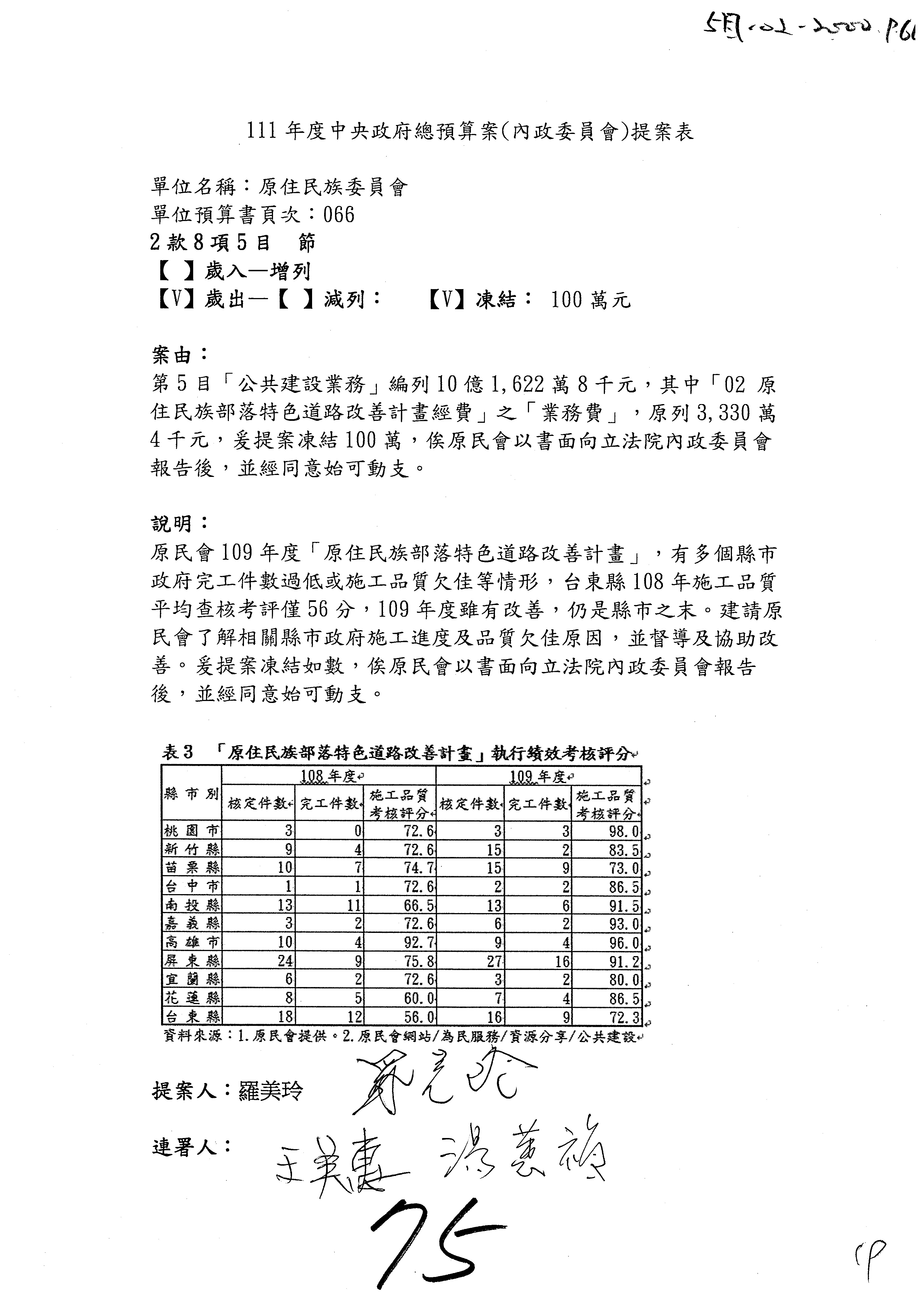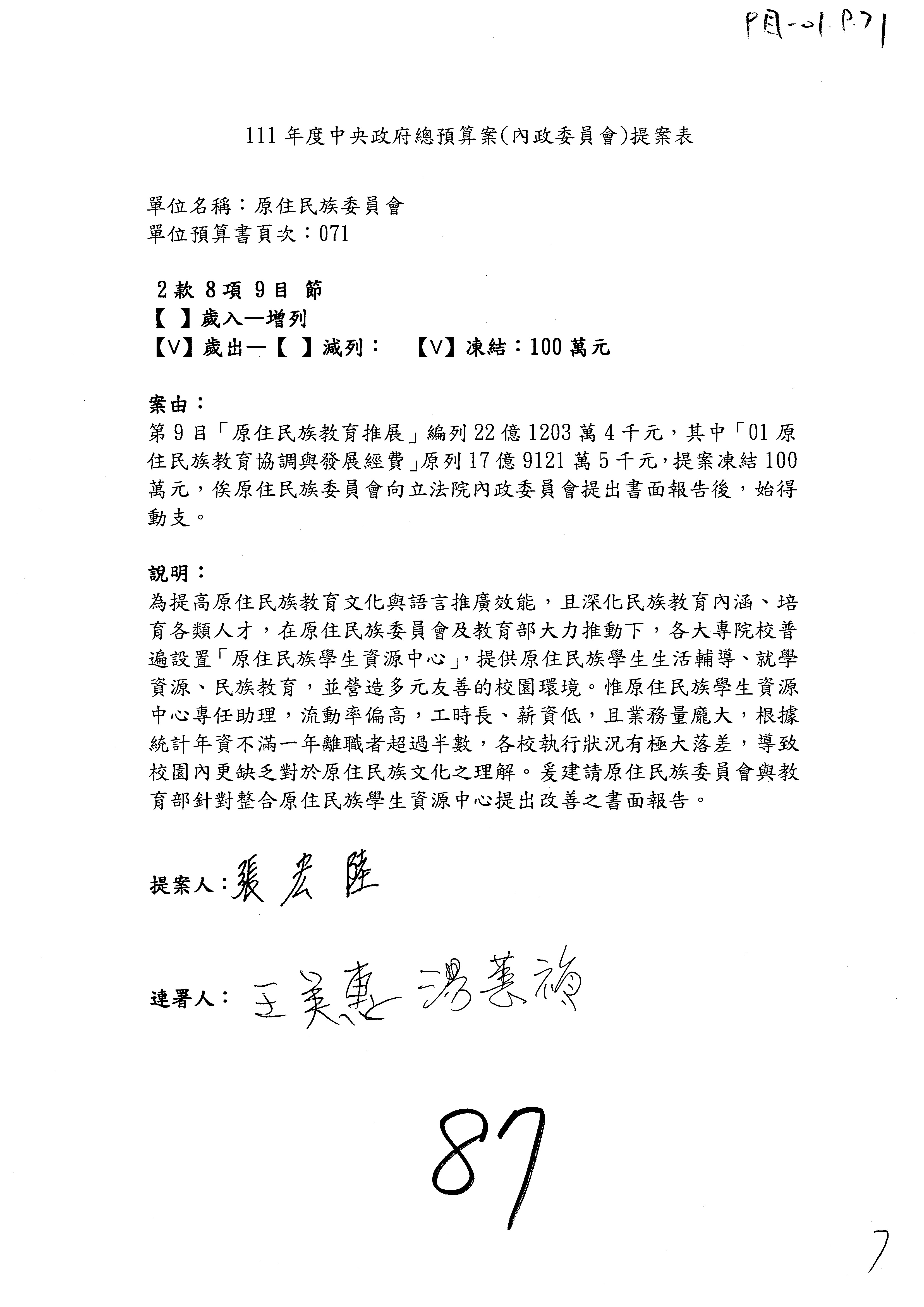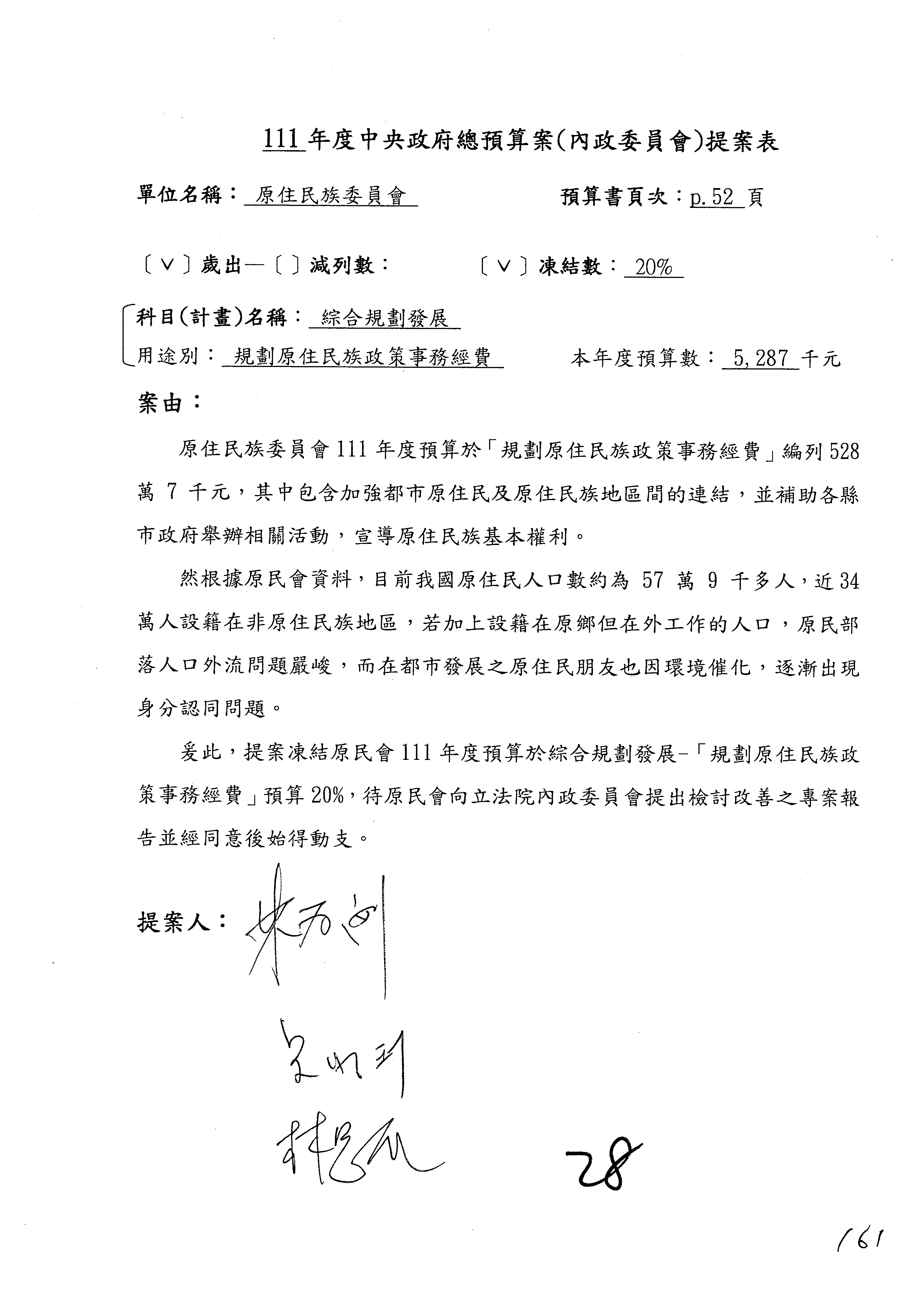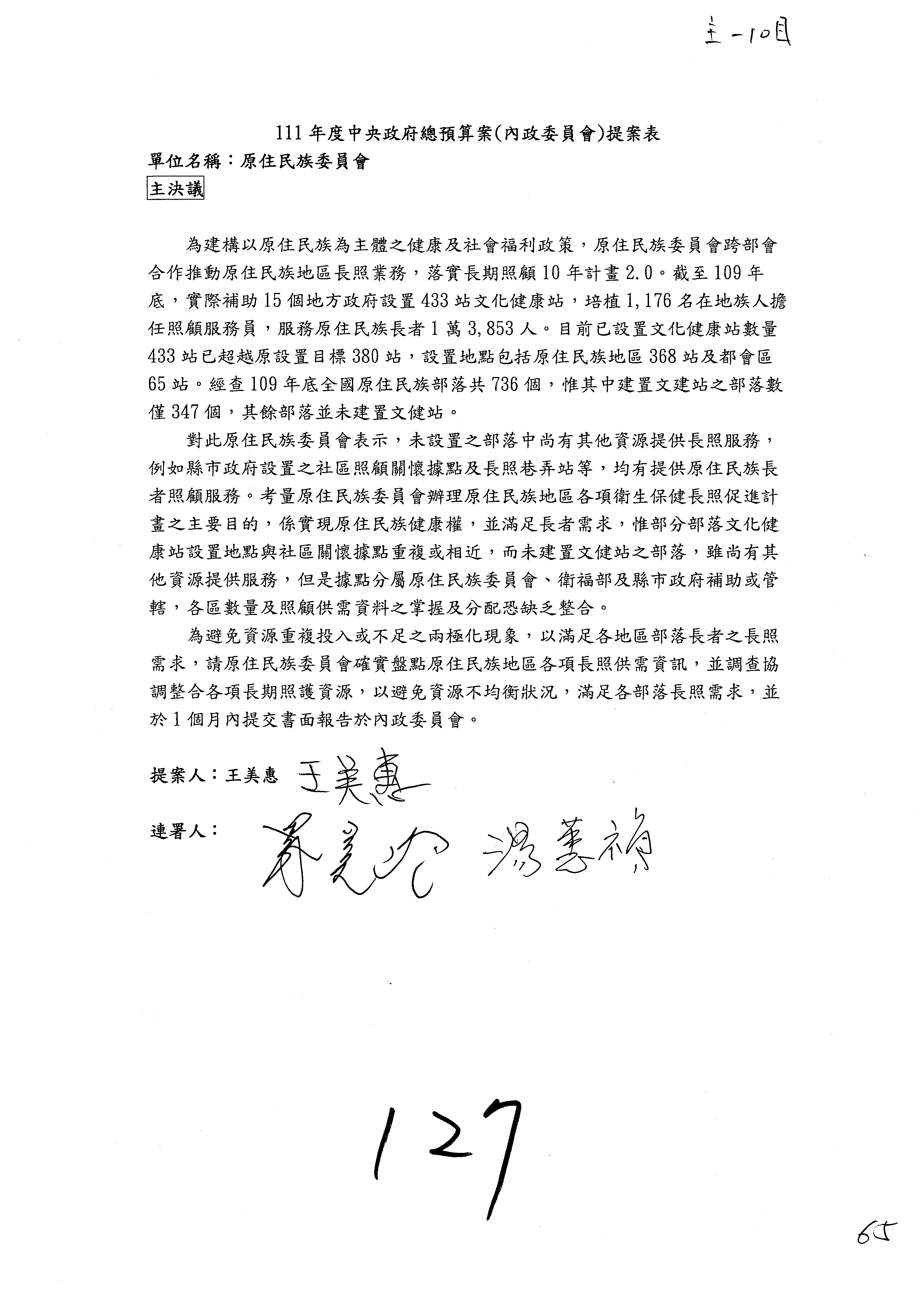繼續審查111年度中央政府總預算案關於原住民族委員會、原住民族文化發展中心部分。