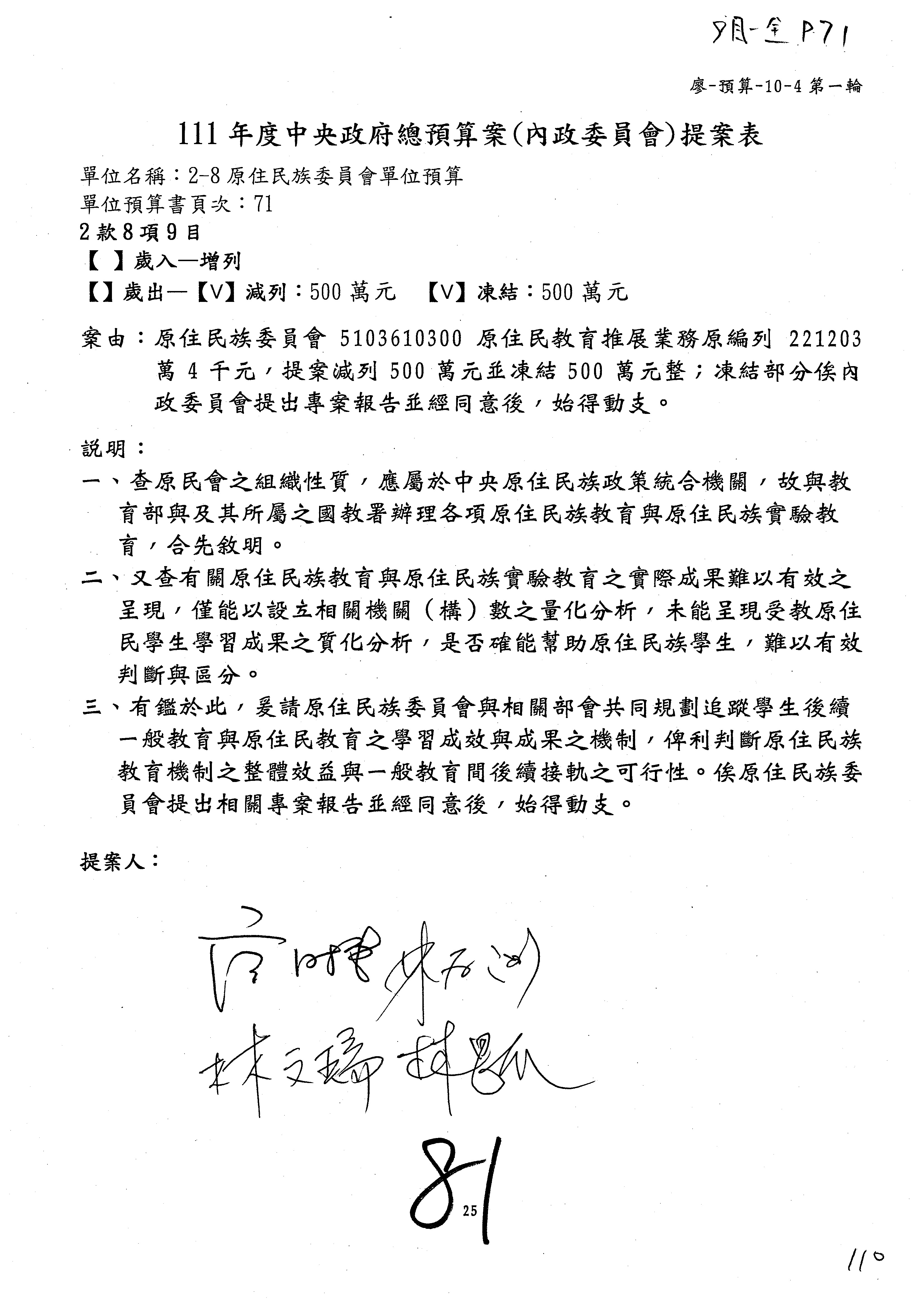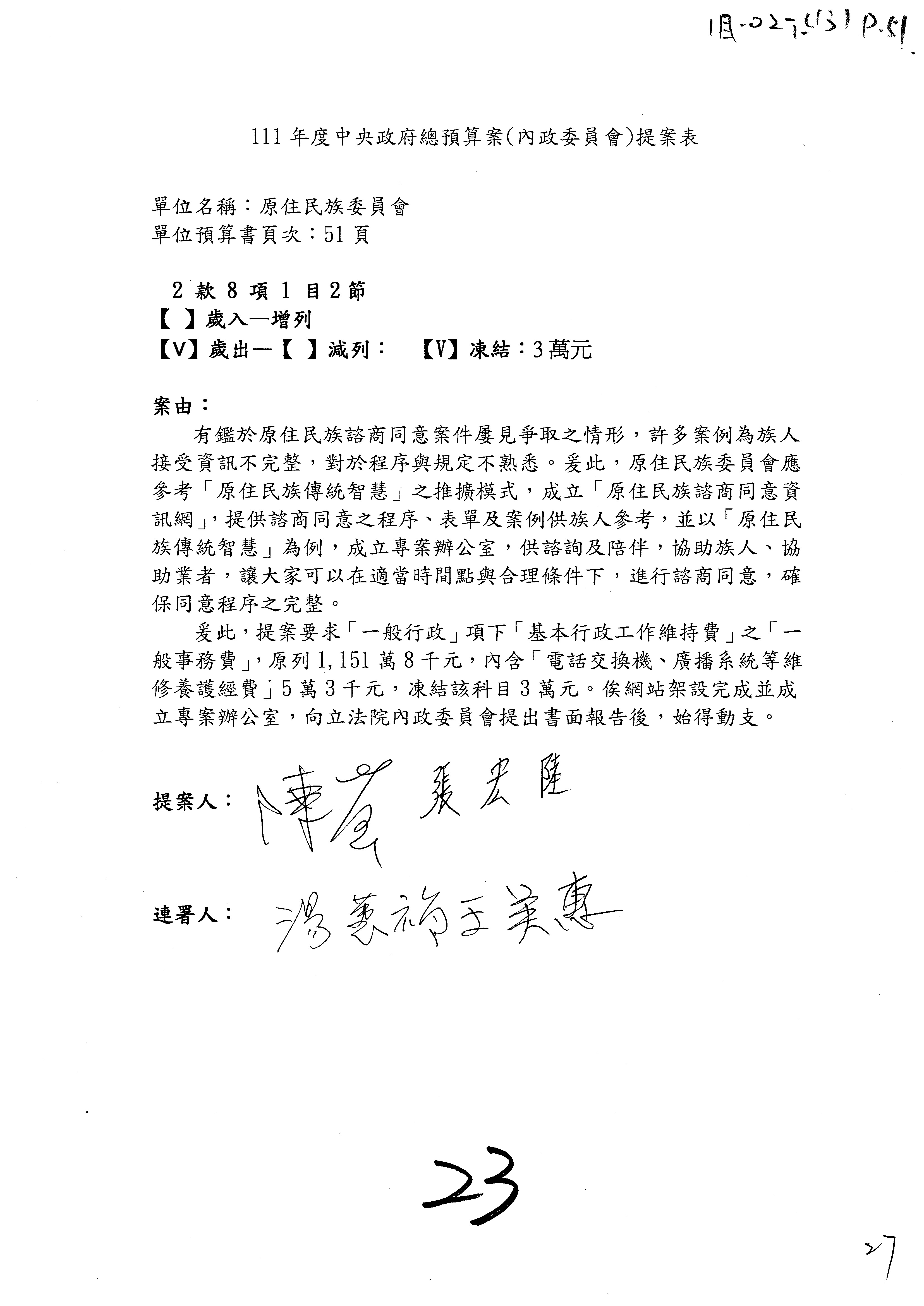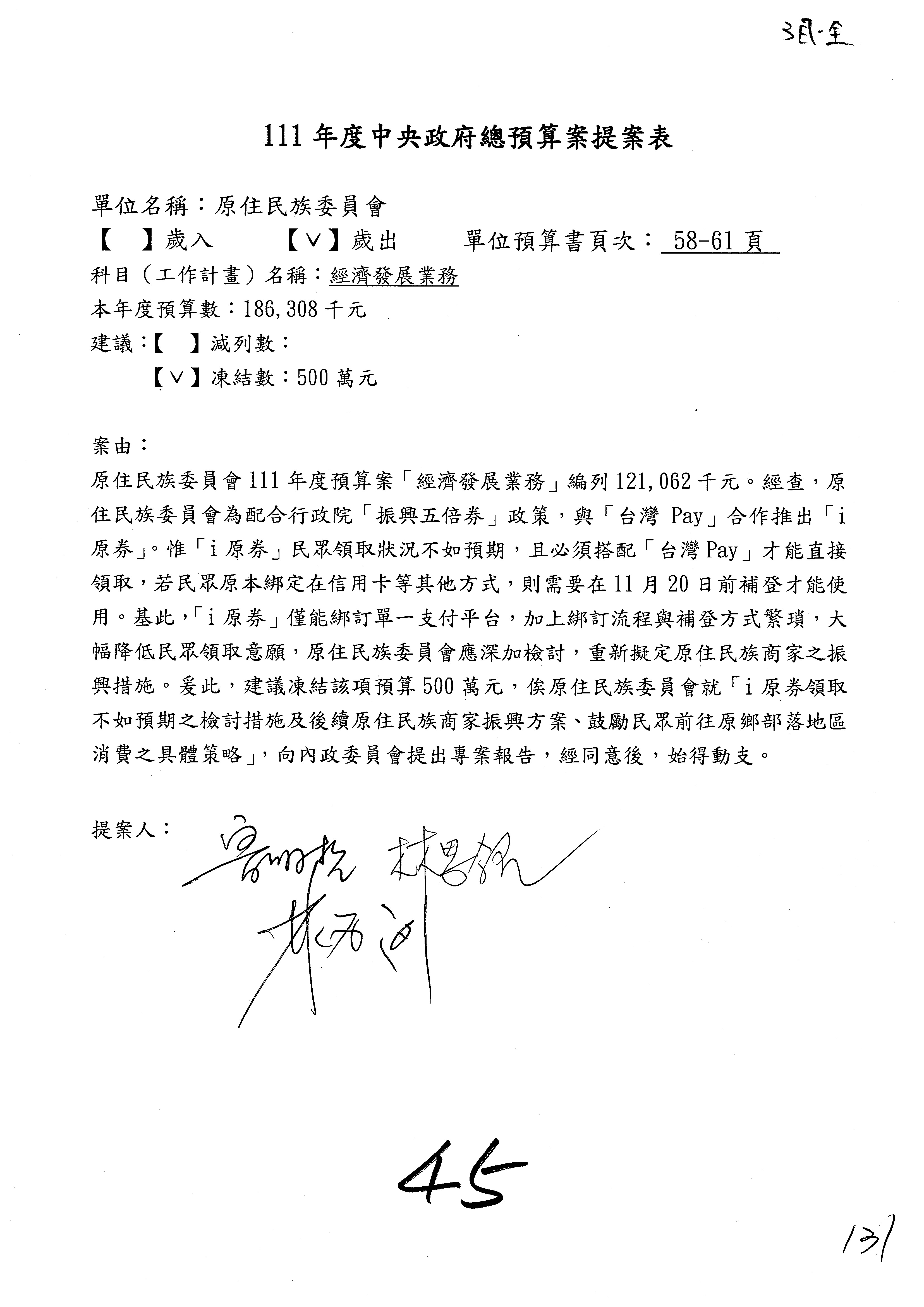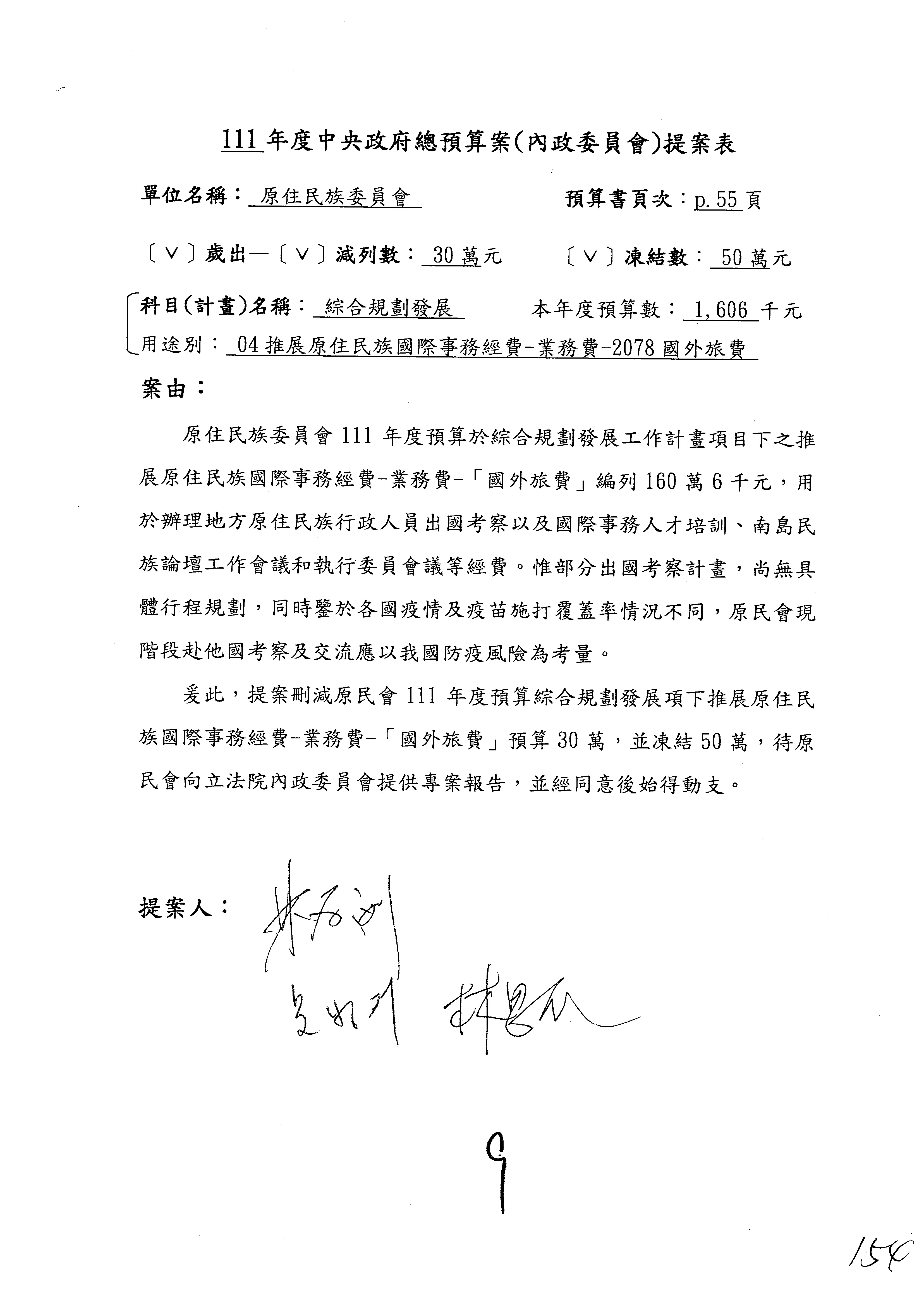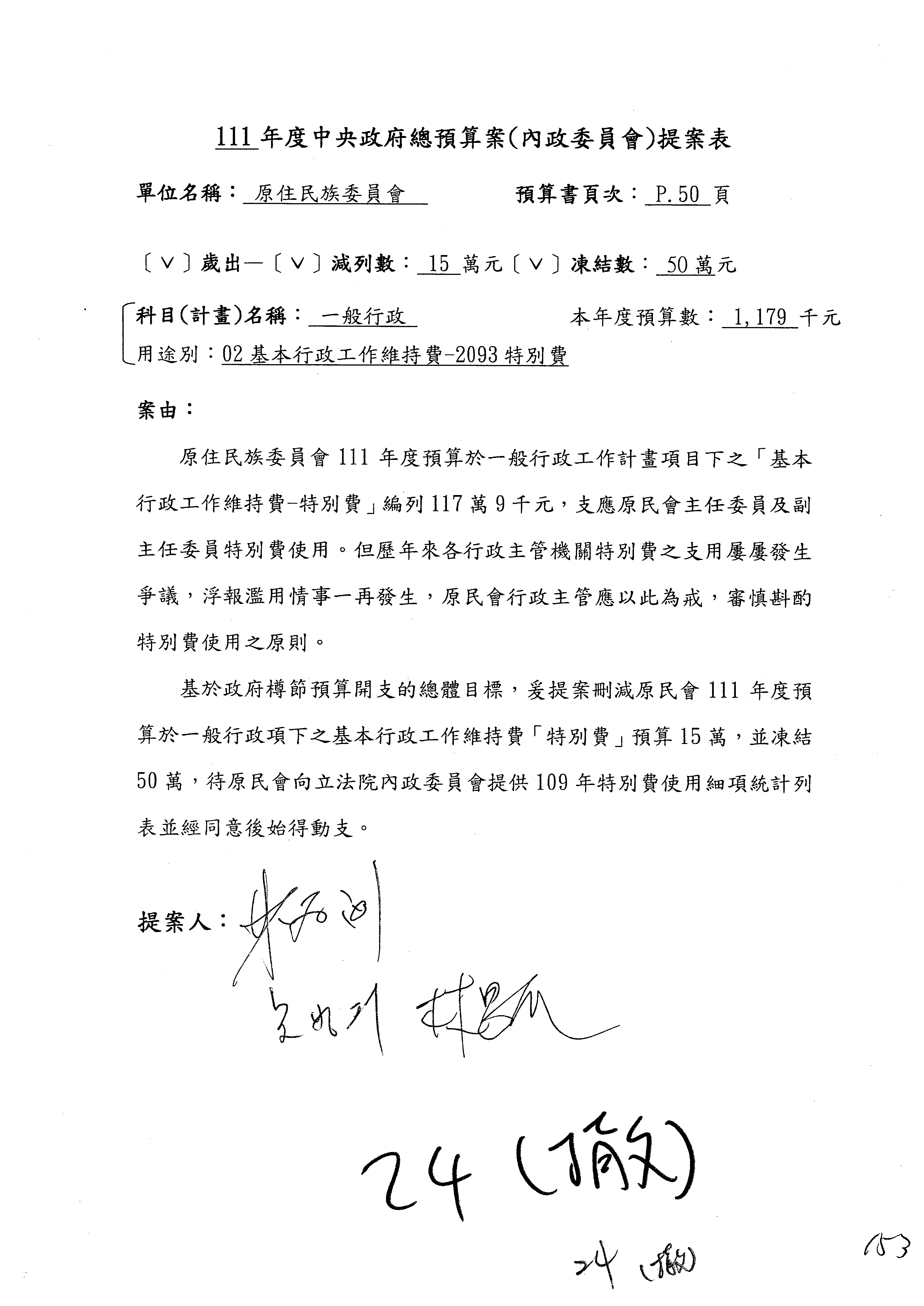 繼續審查111年度中央政府總預算案關於原住民族委員會、原住民族文化發展中心部分。