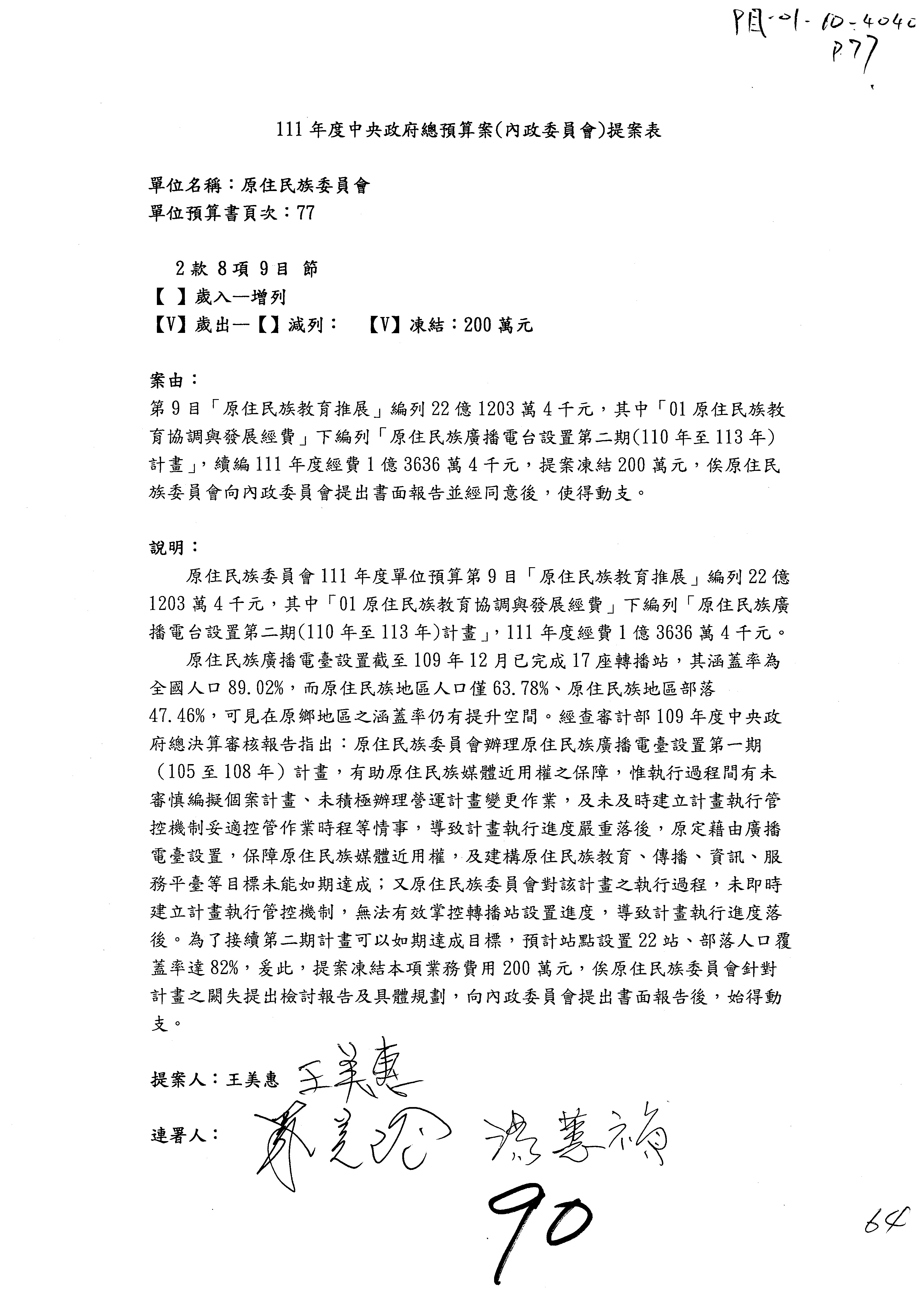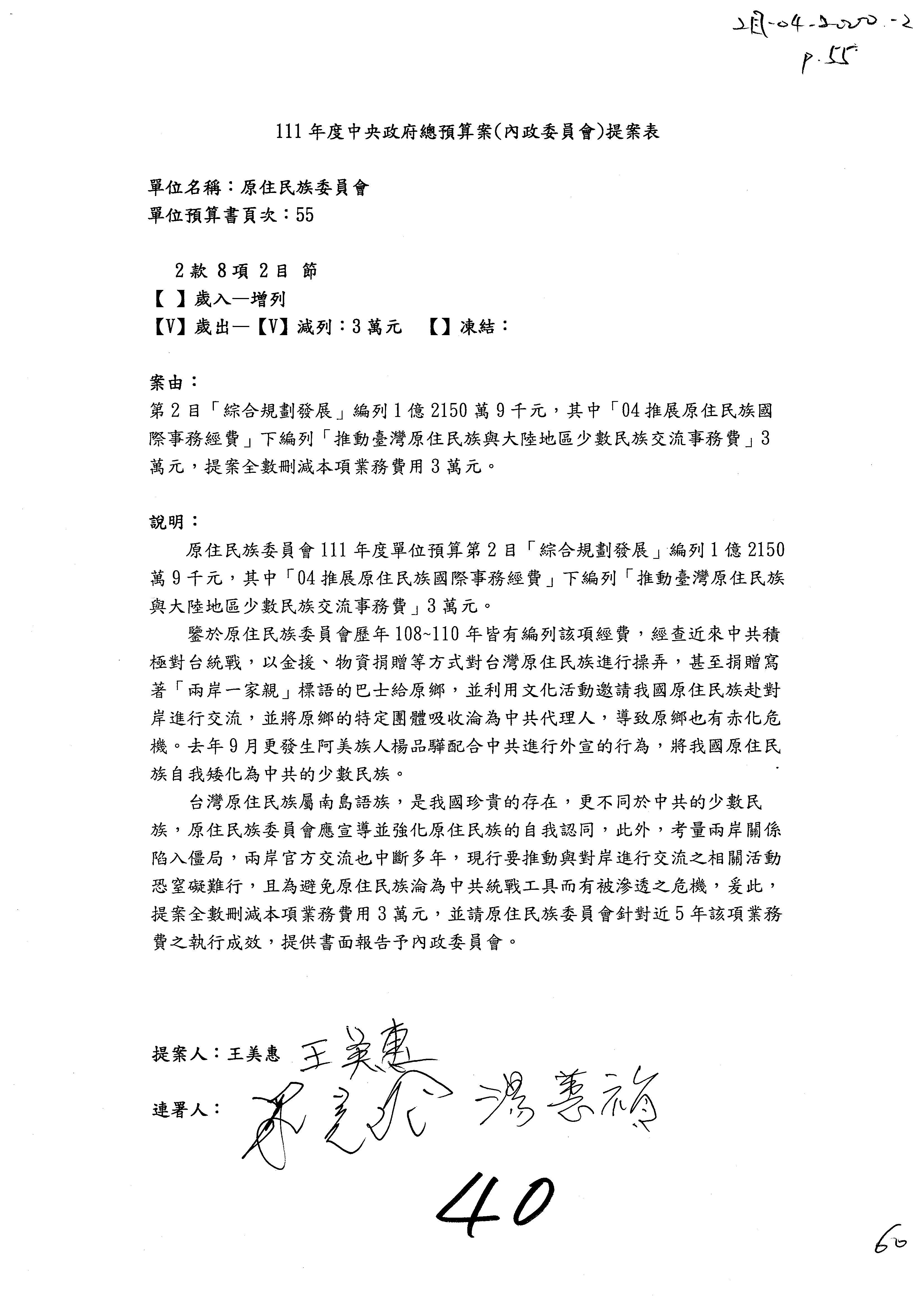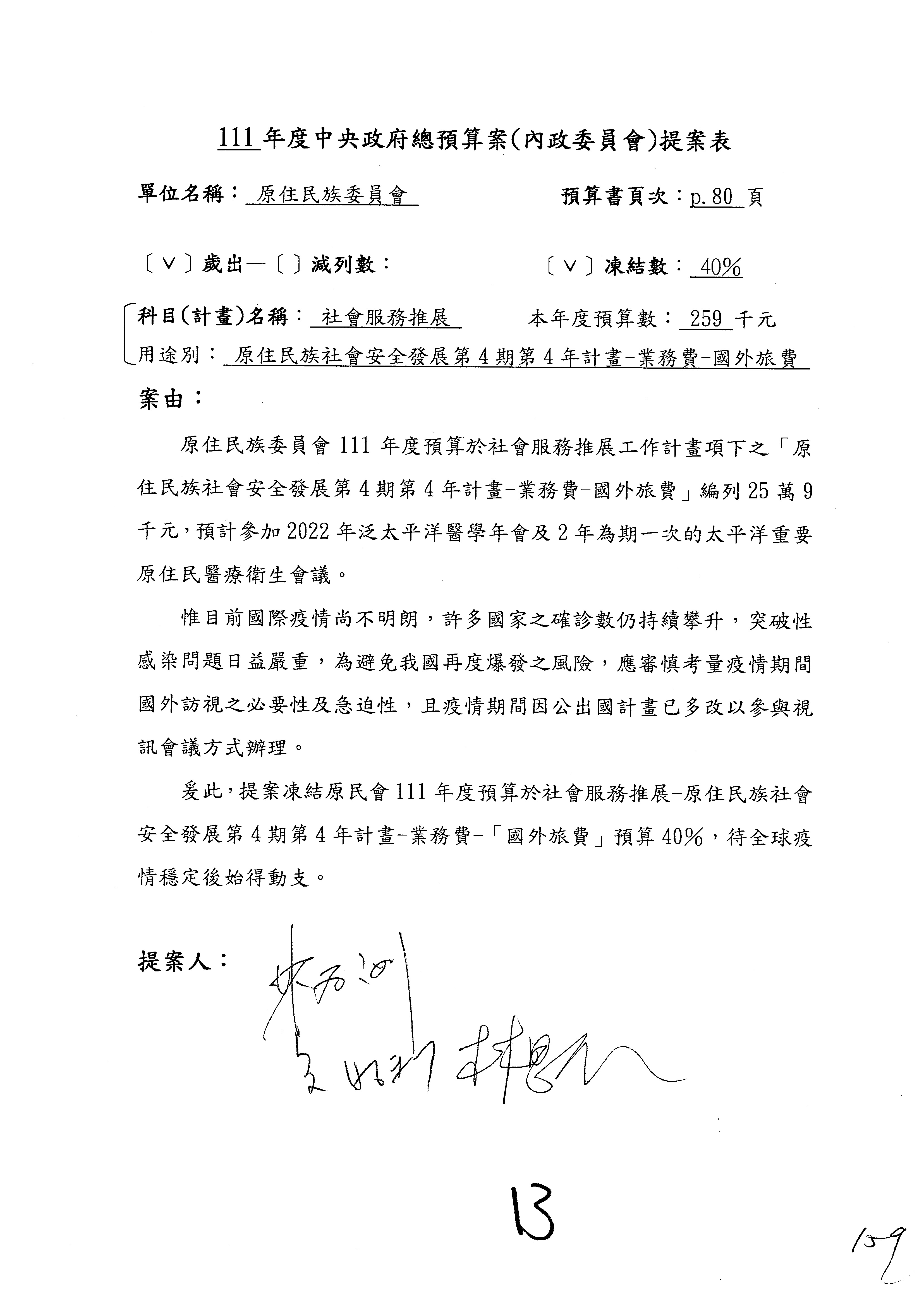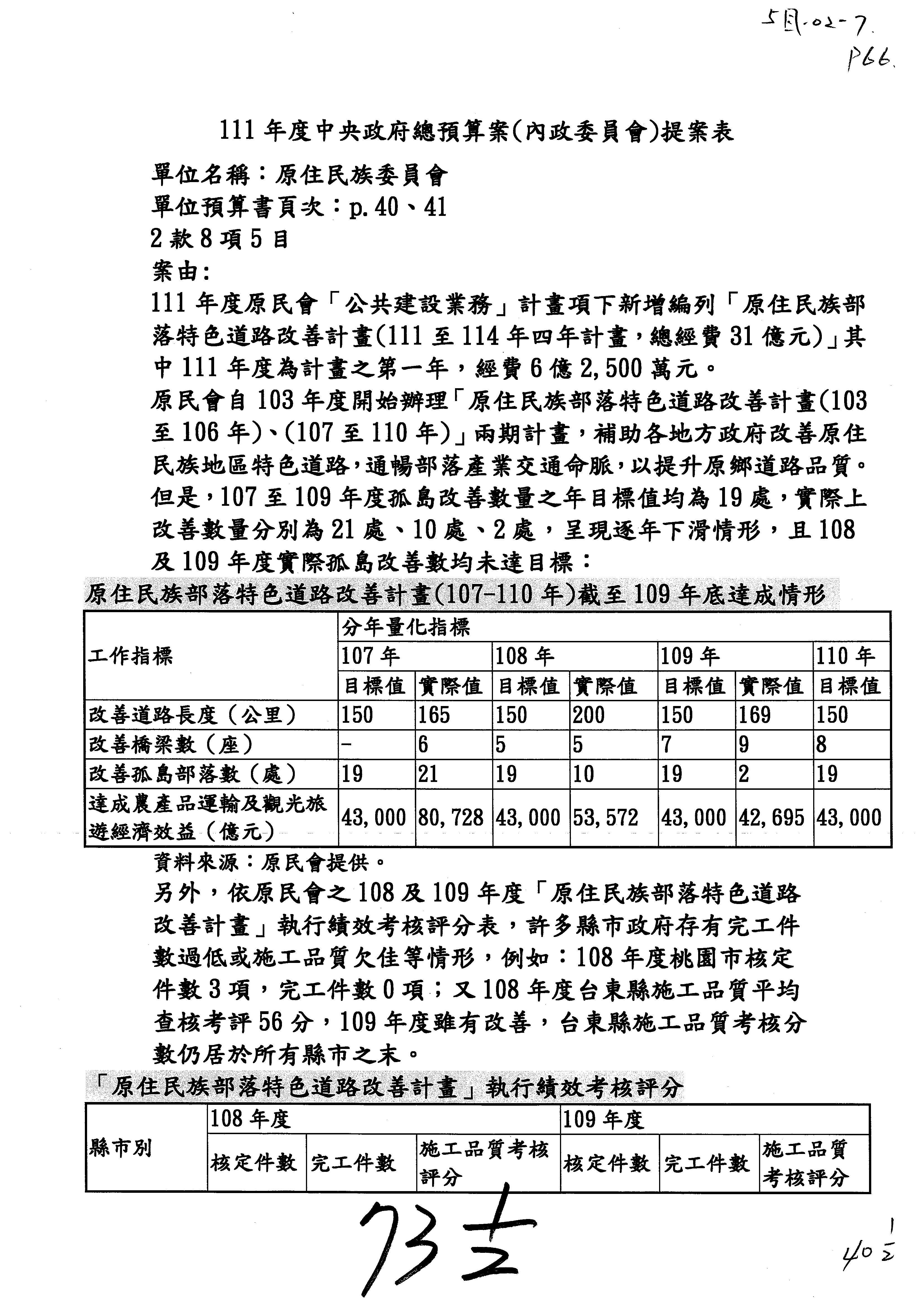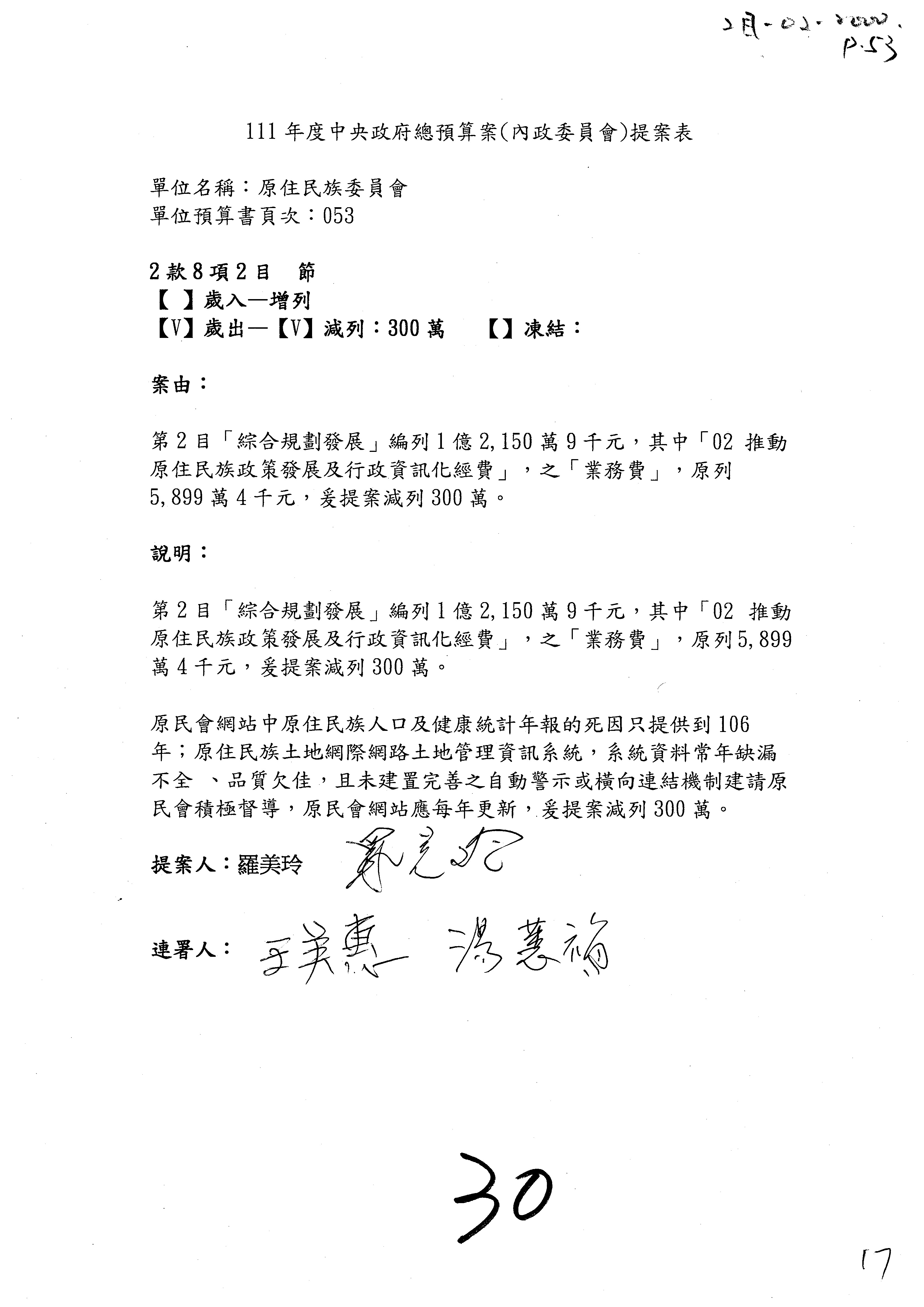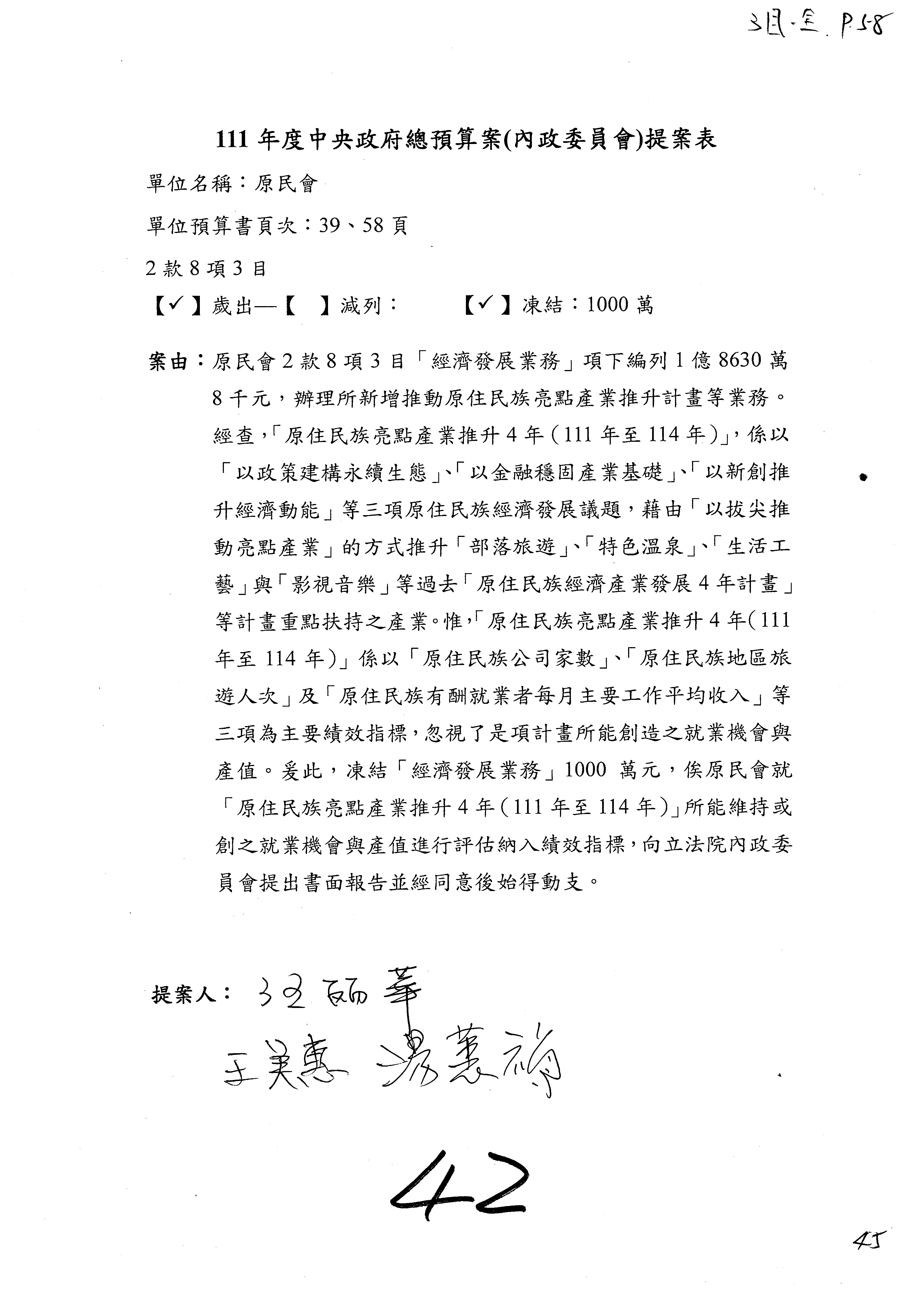 繼續審查111年度中央政府總預算案關於原住民族委員會、原住民族文化發展中心部分。