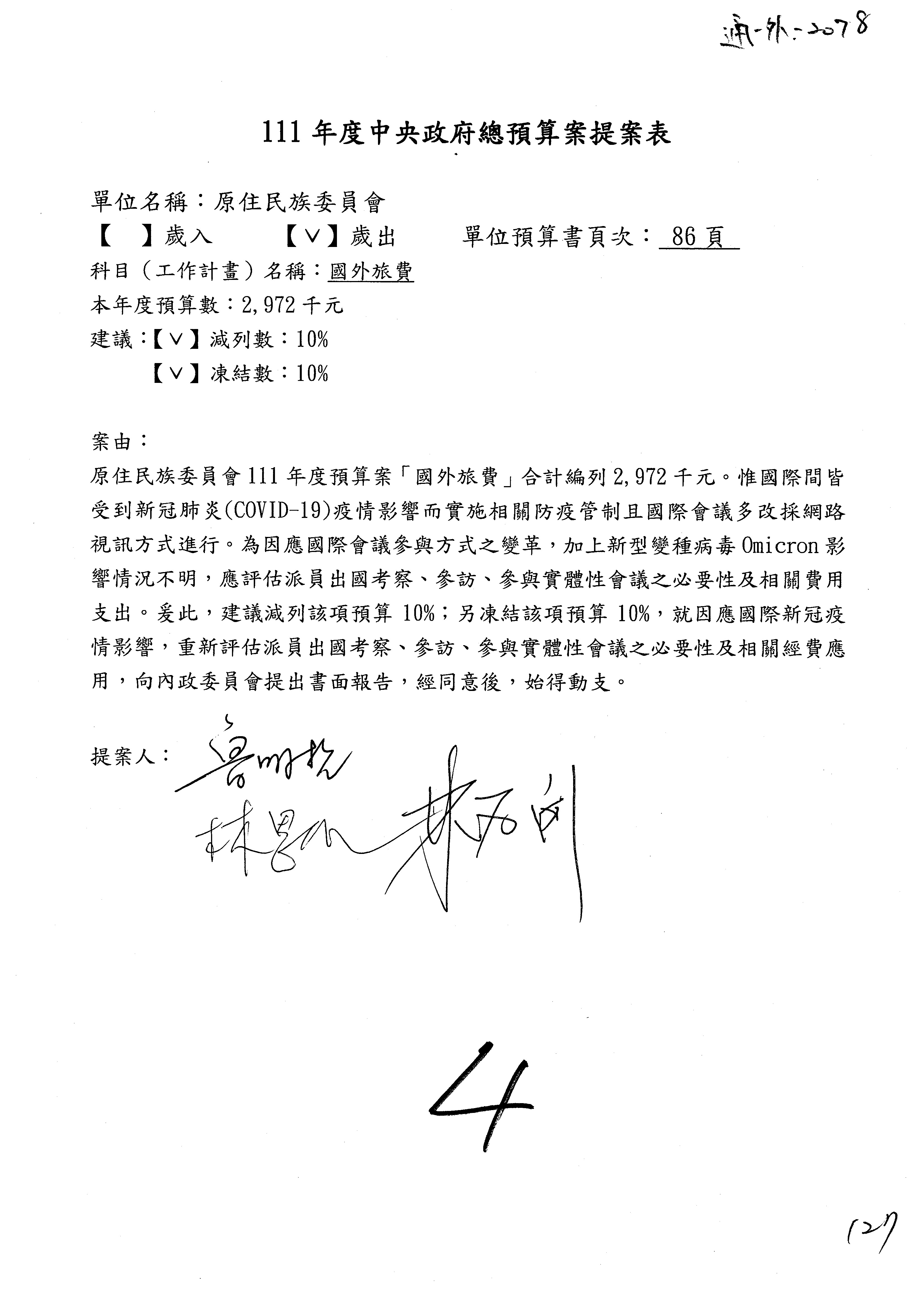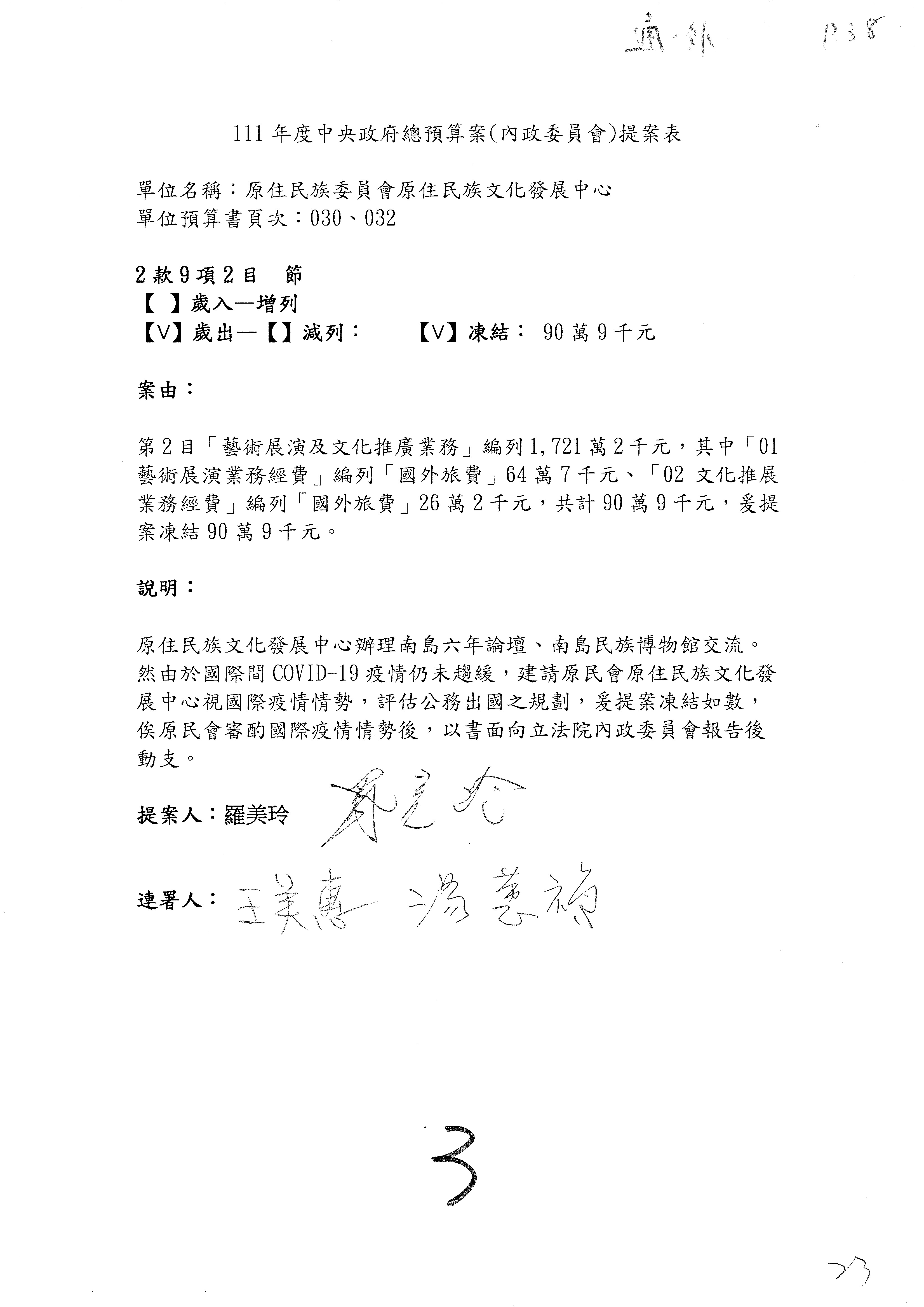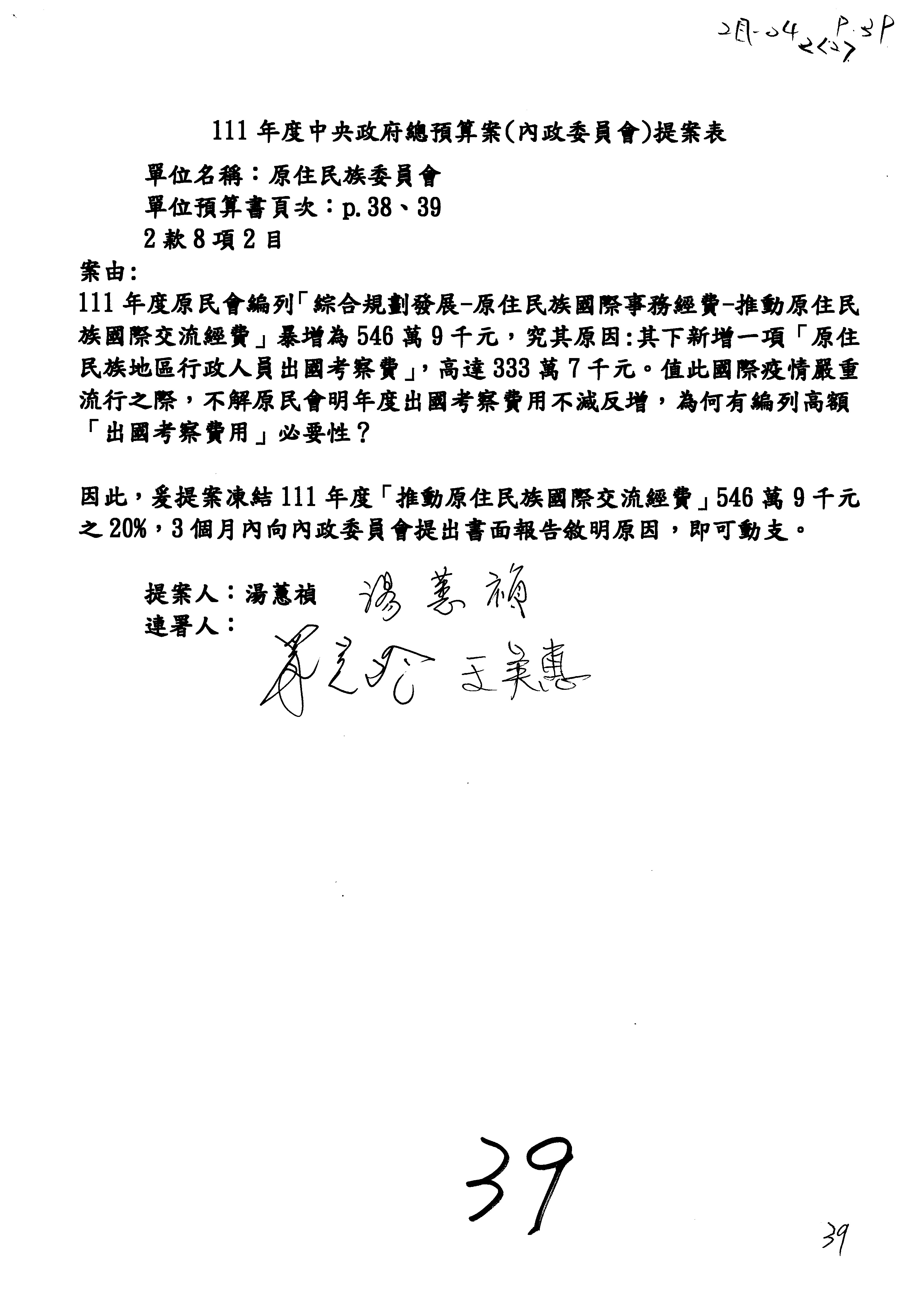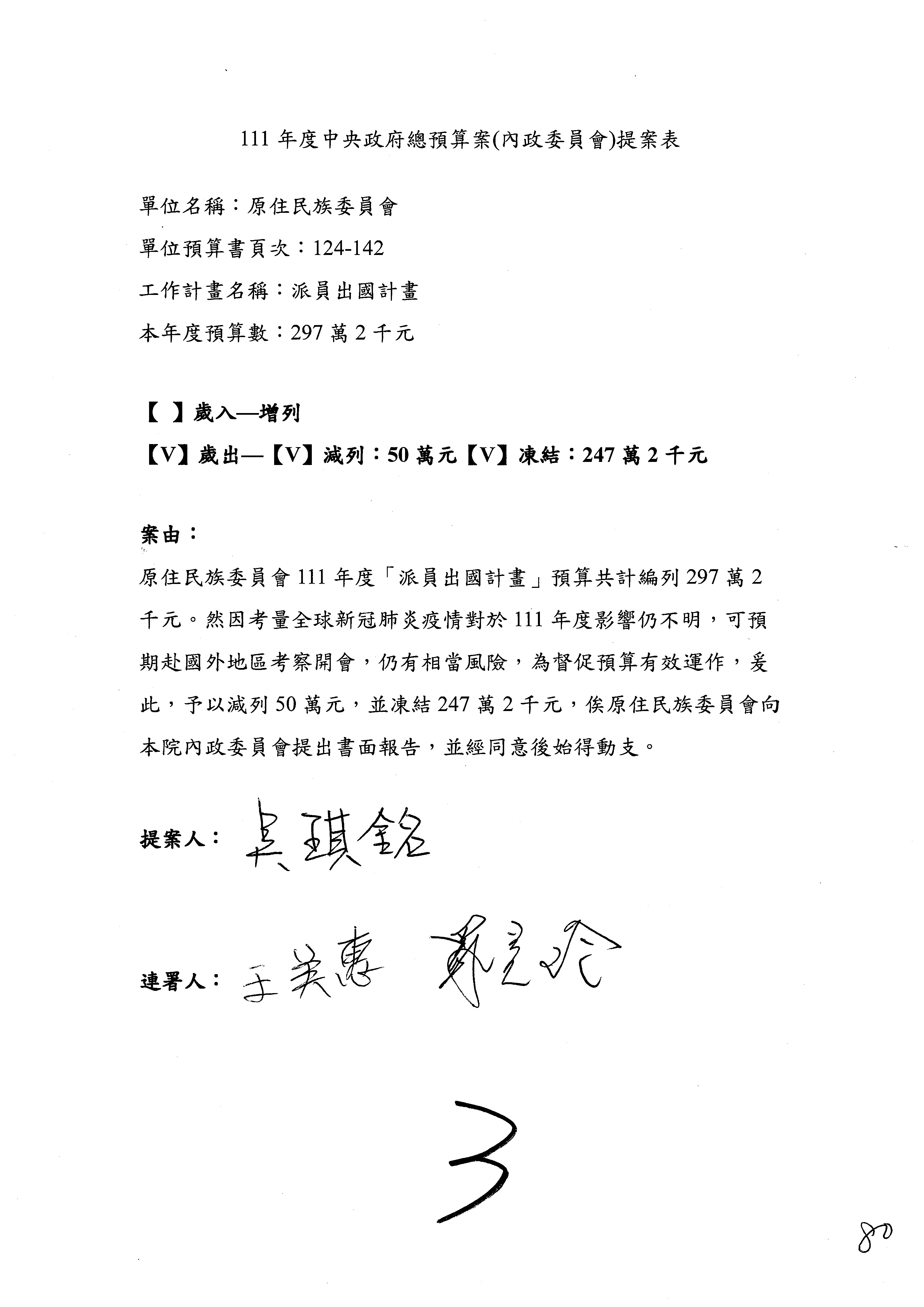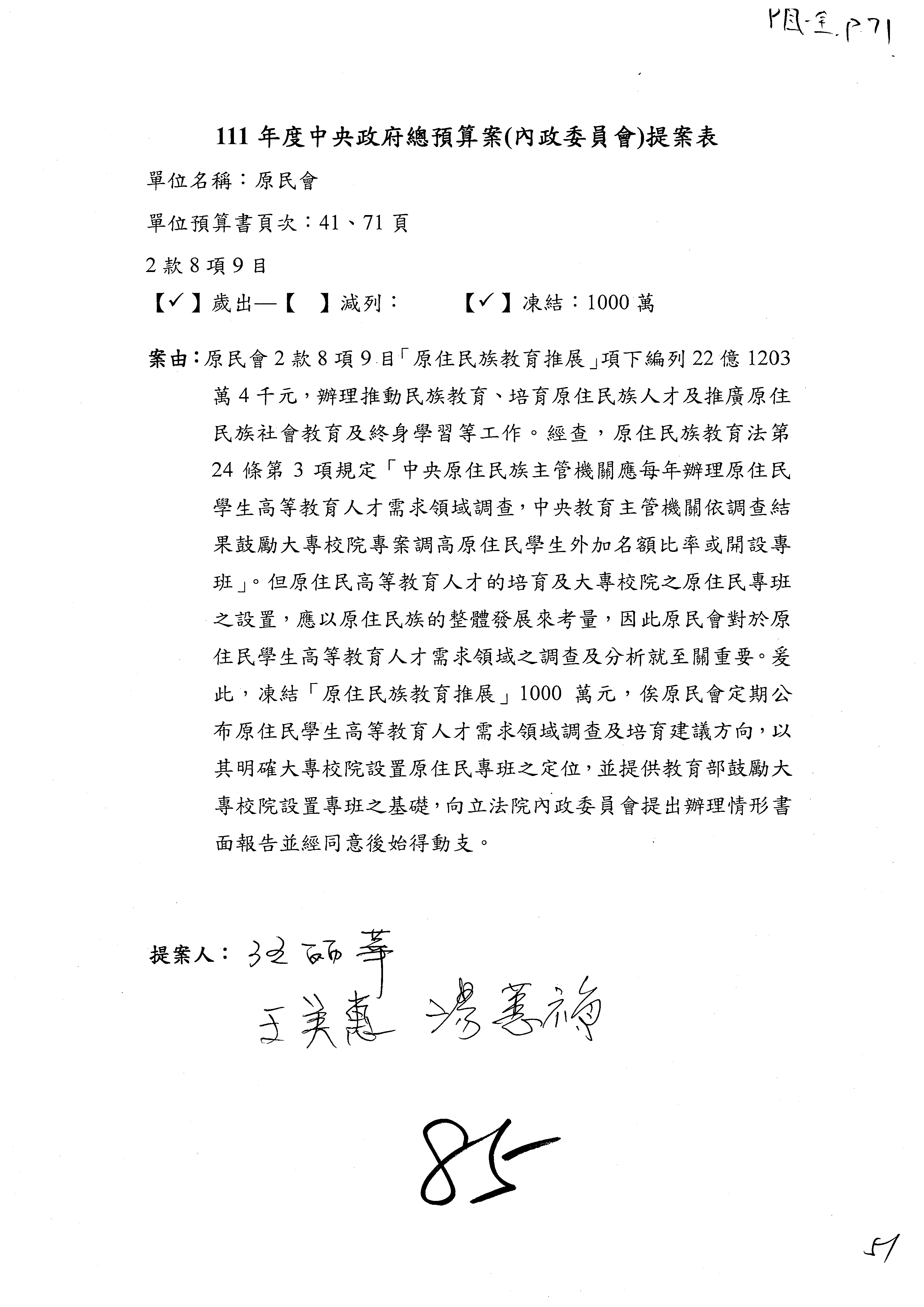 繼續審查111年度中央政府總預算案關於原住民族委員會、原住民族文化發展中心部分。