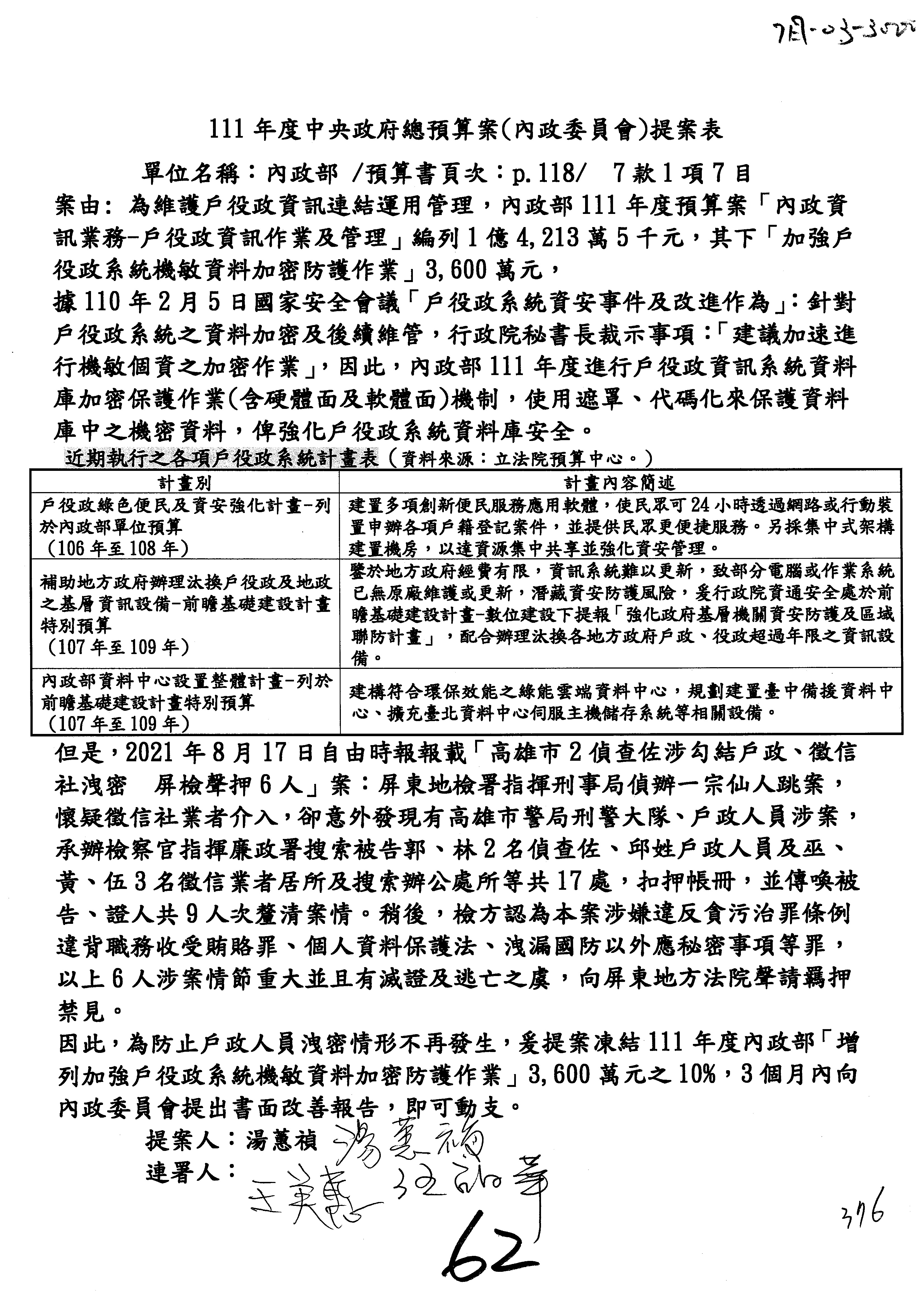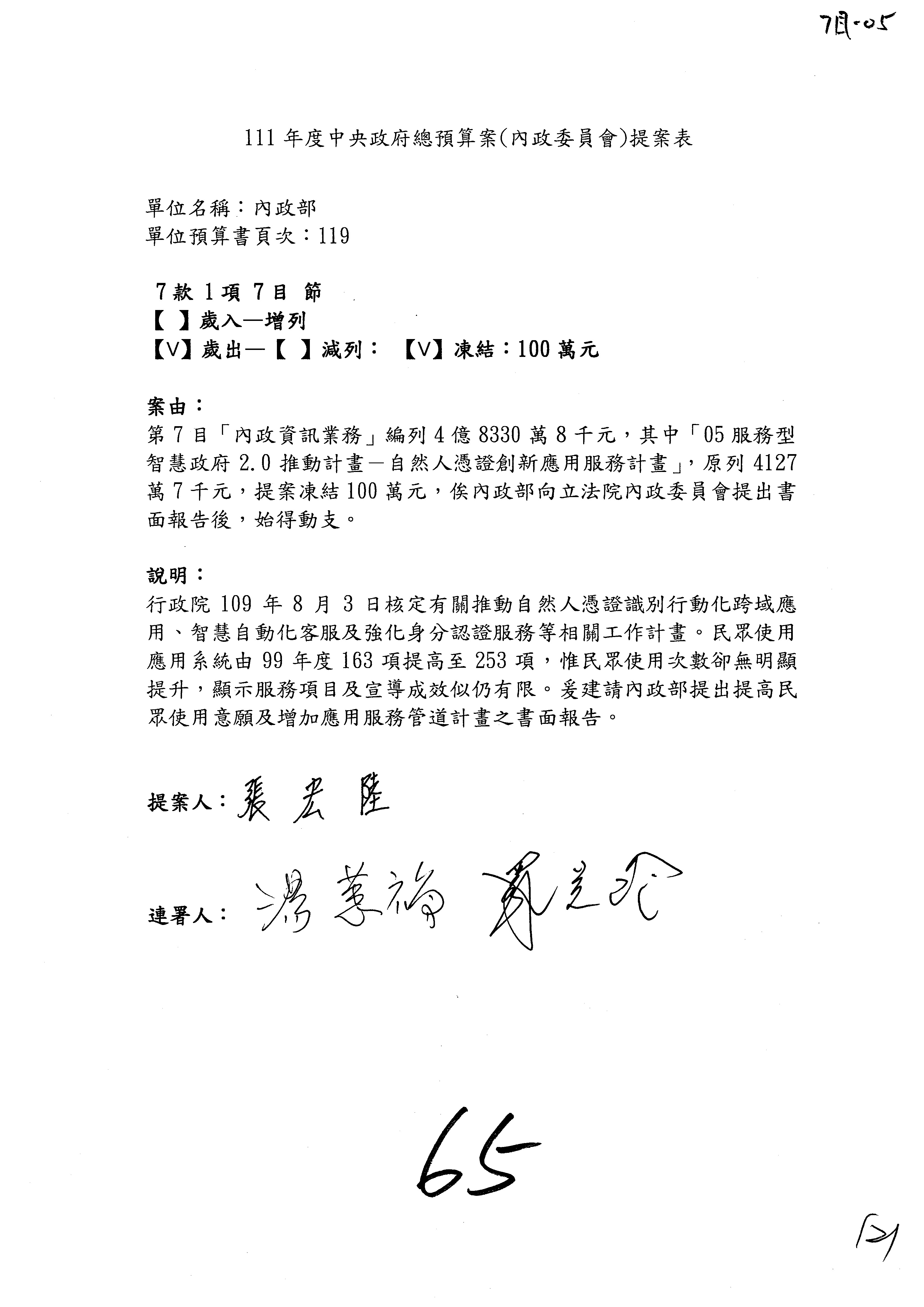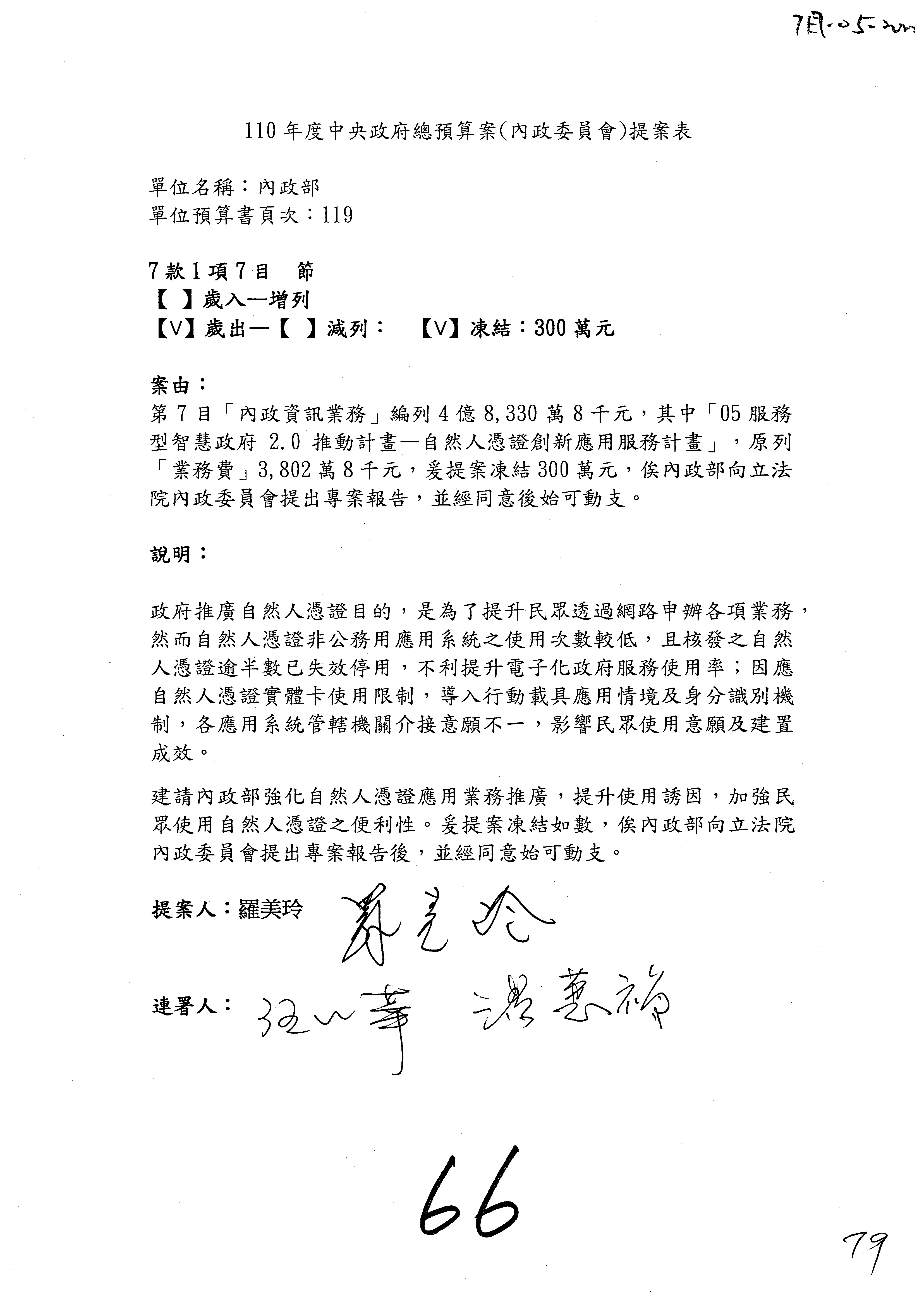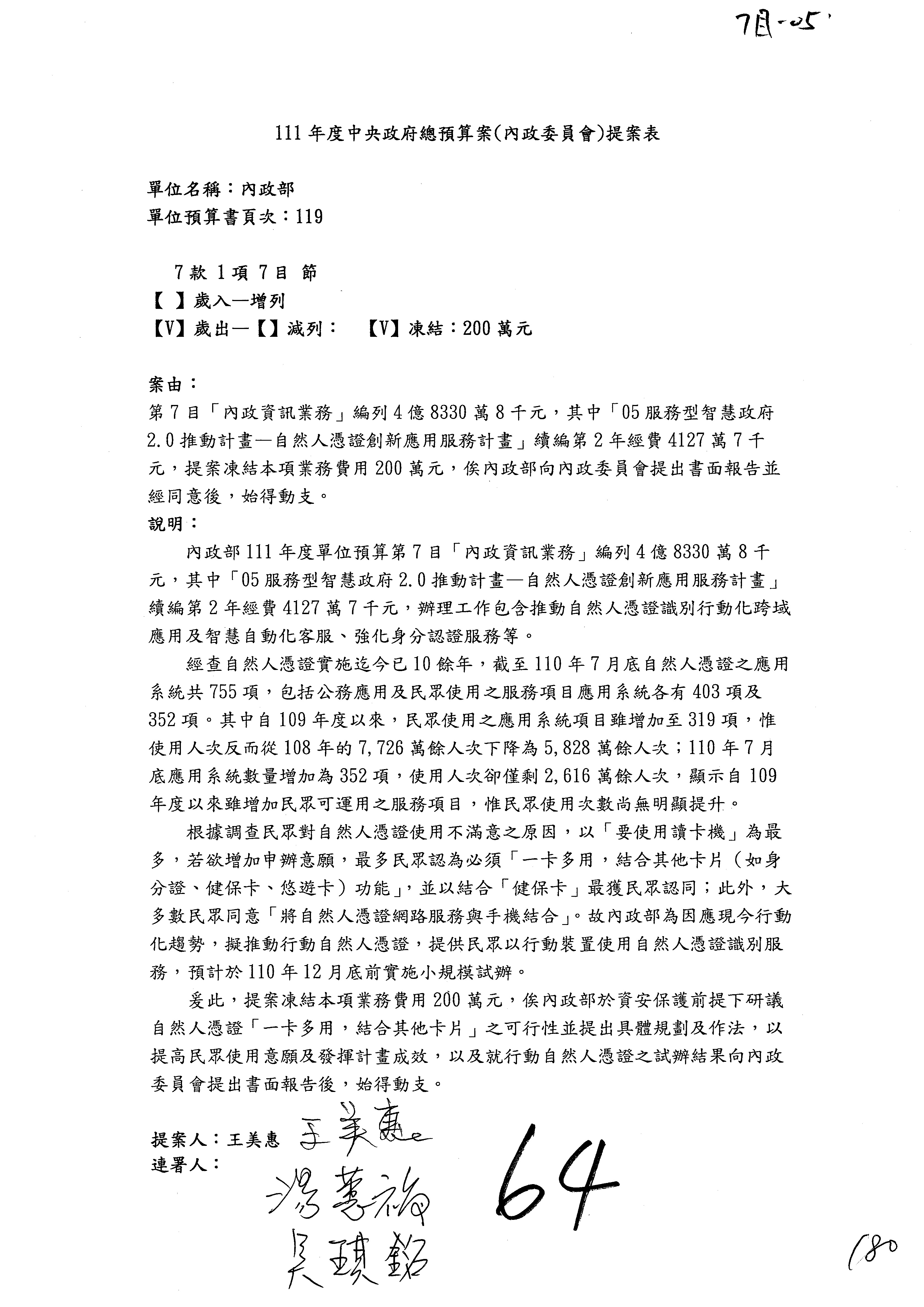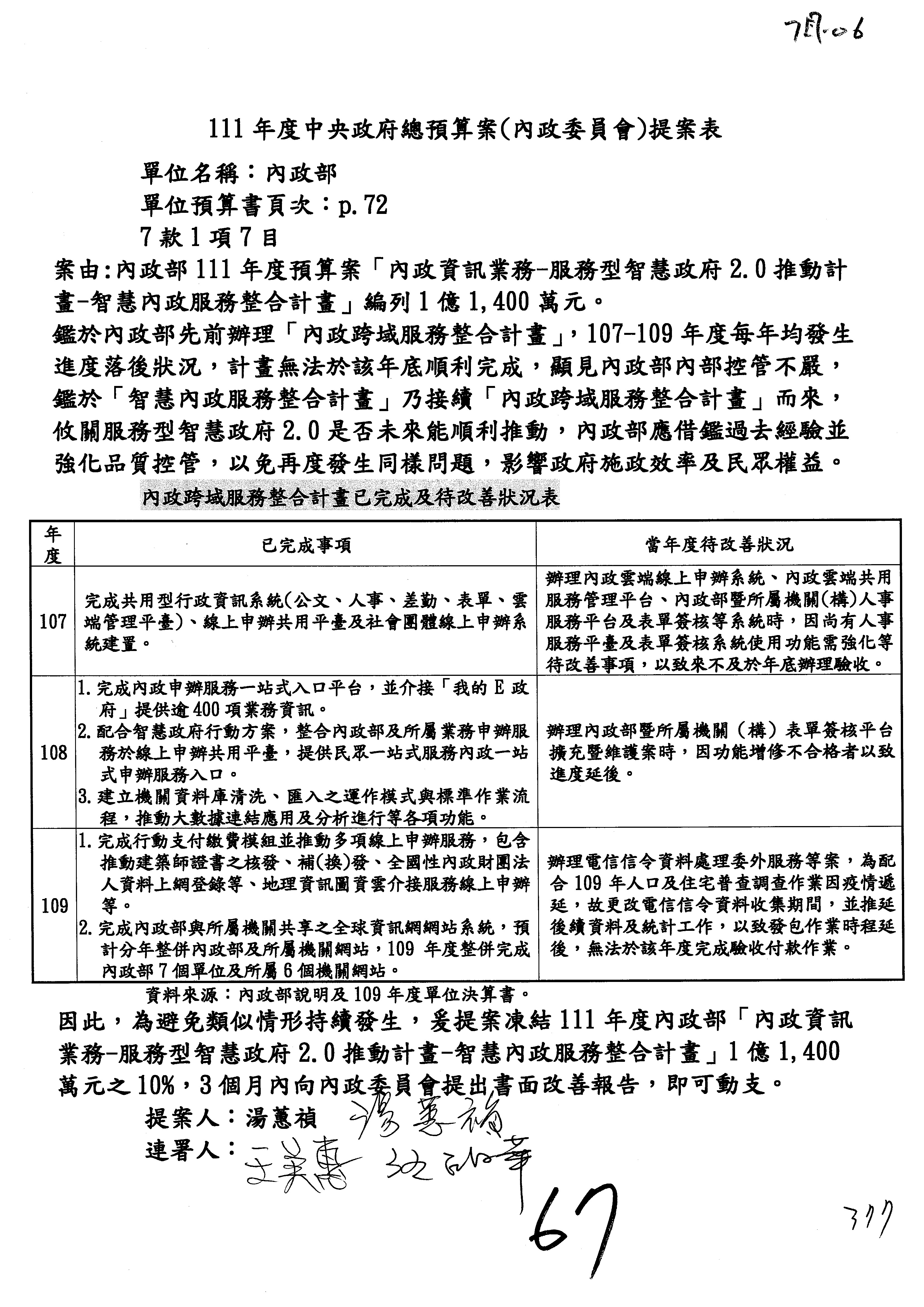 第7目「內政資訊業務」,第61案、第62案、第63案及第67案改為主決議;第64案、第65案、第66案合併處理,凍結50萬元,提出書面報告後,始得動支;第68案、第69案凍結5%,提出書面報告後,始得動支。