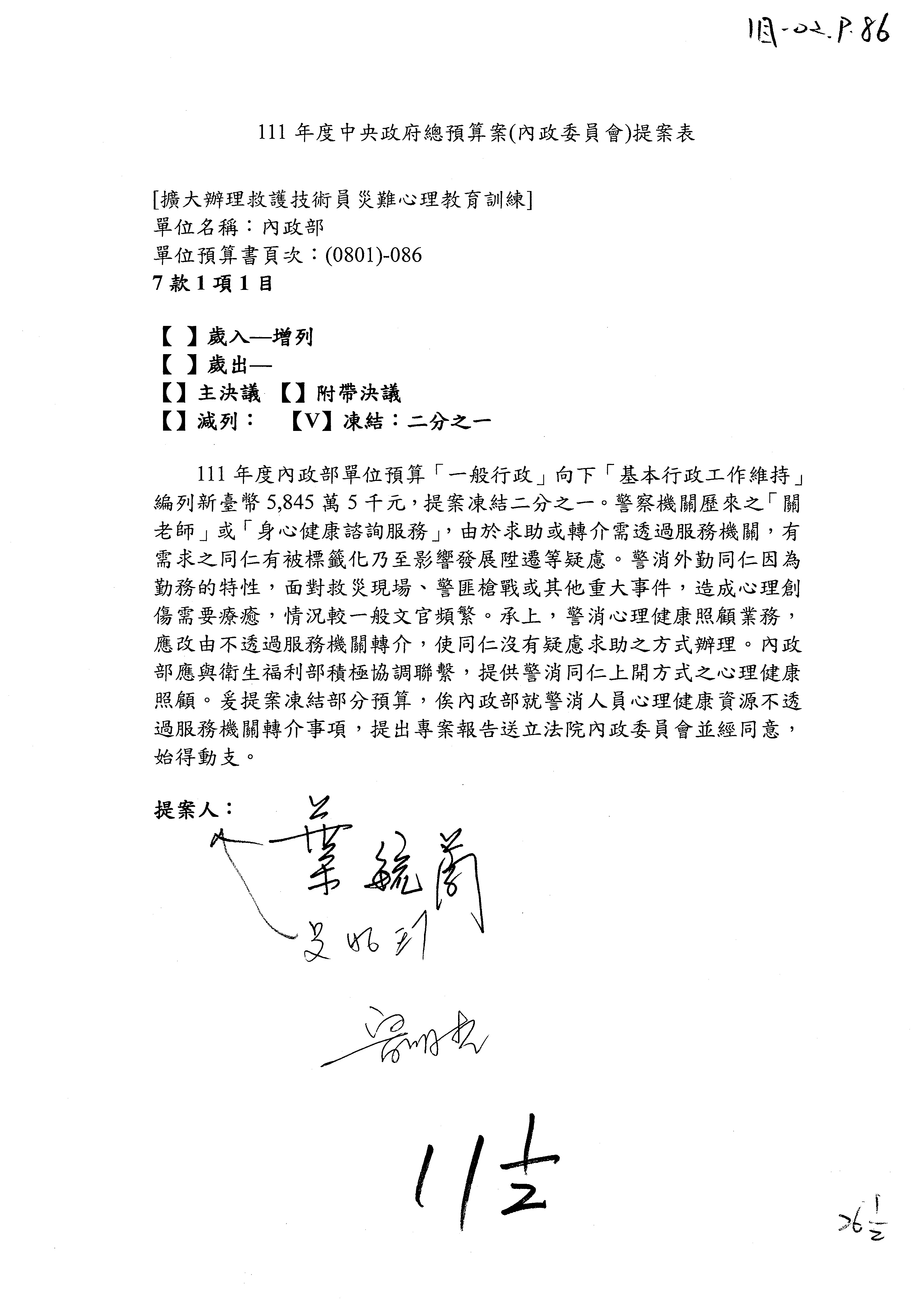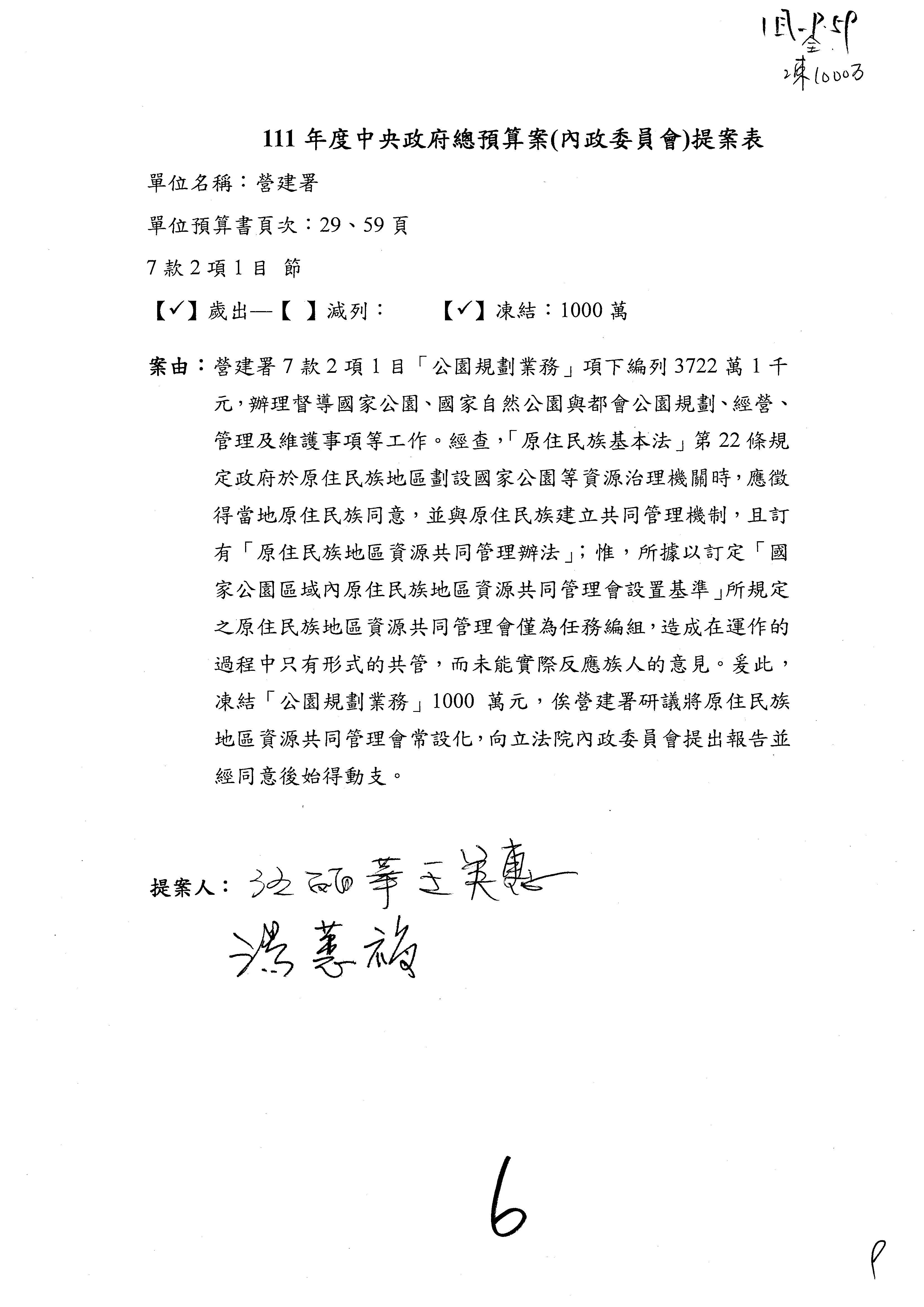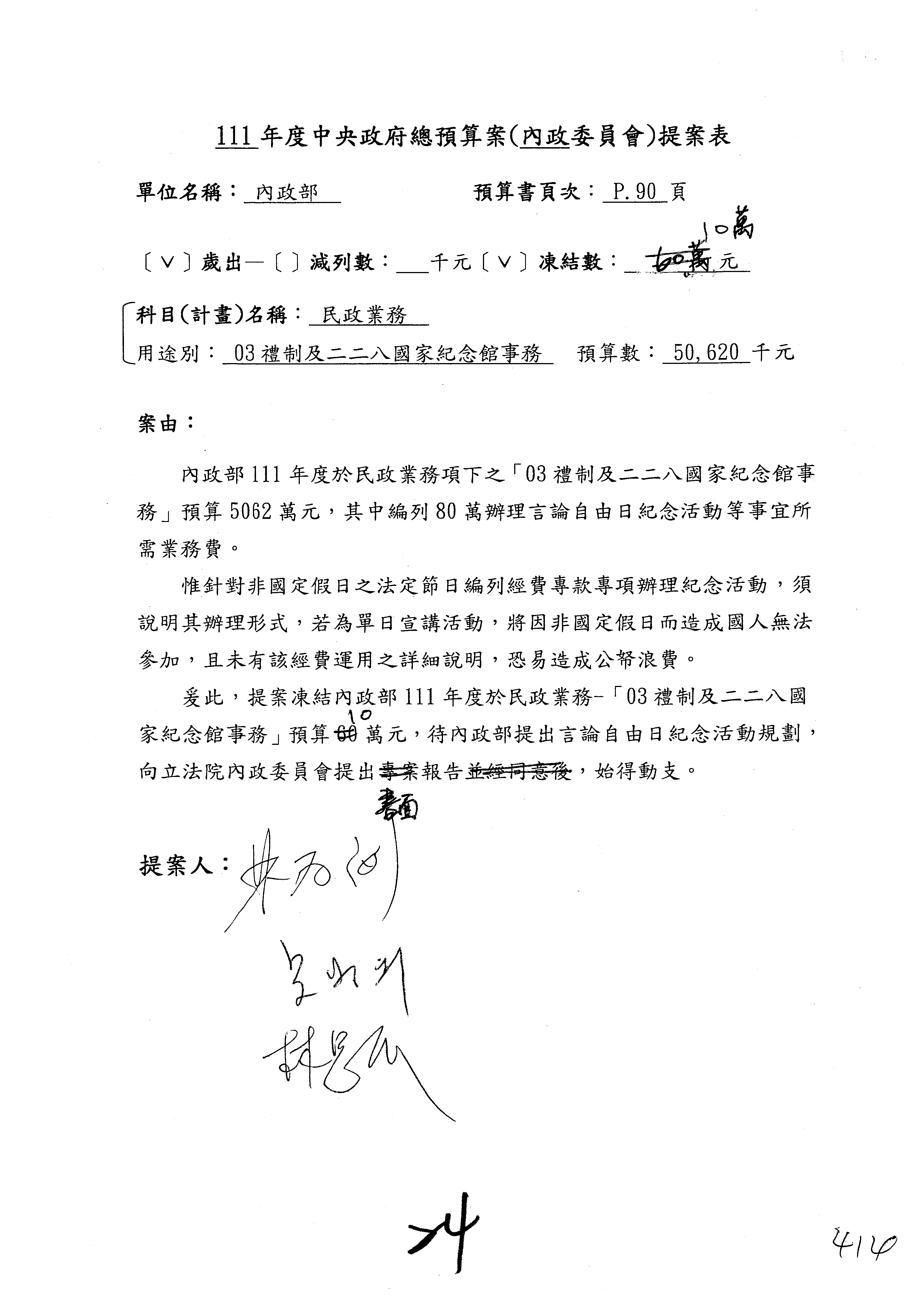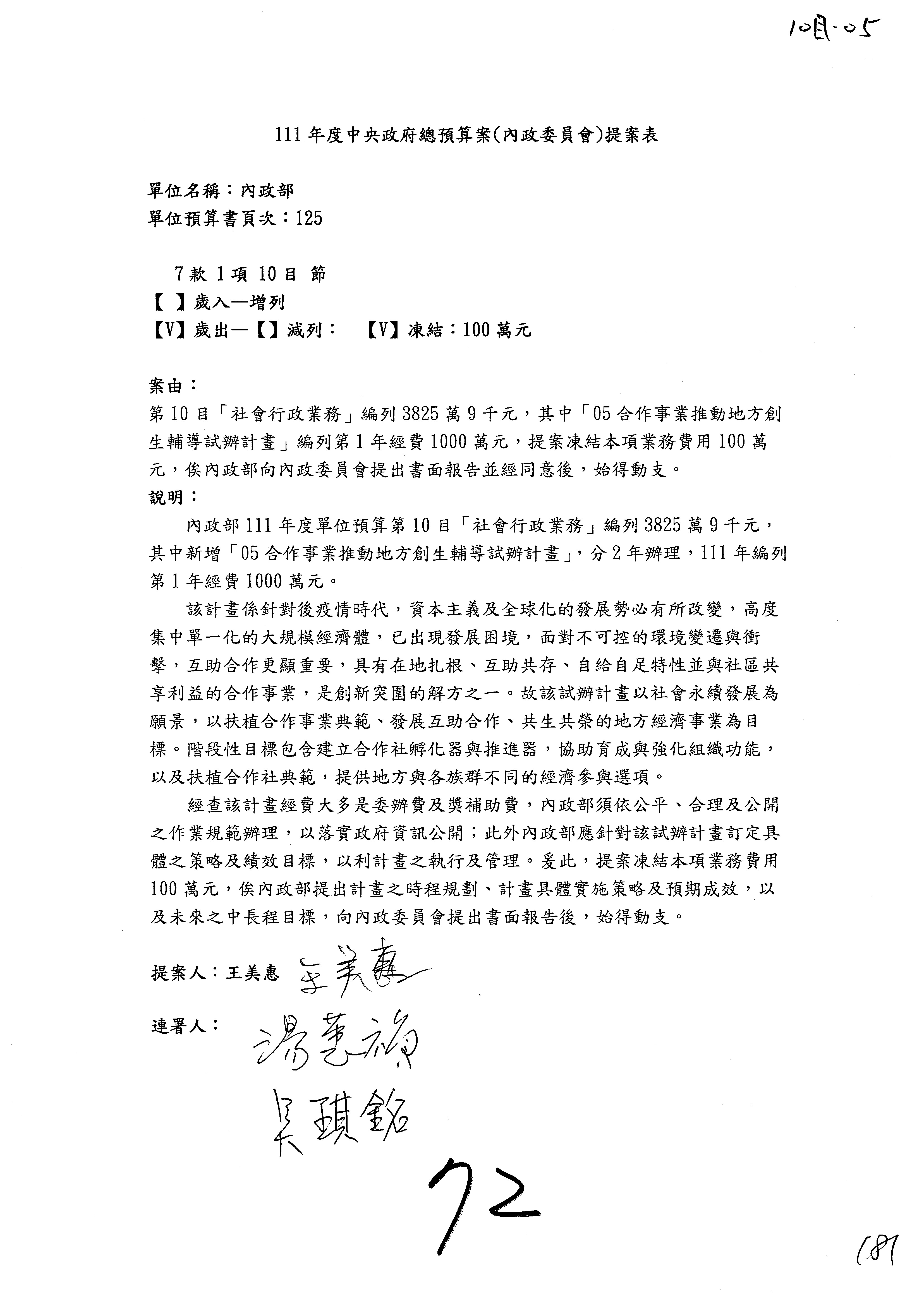 主席:寫提案也不夠成本,所以凍結10萬元。