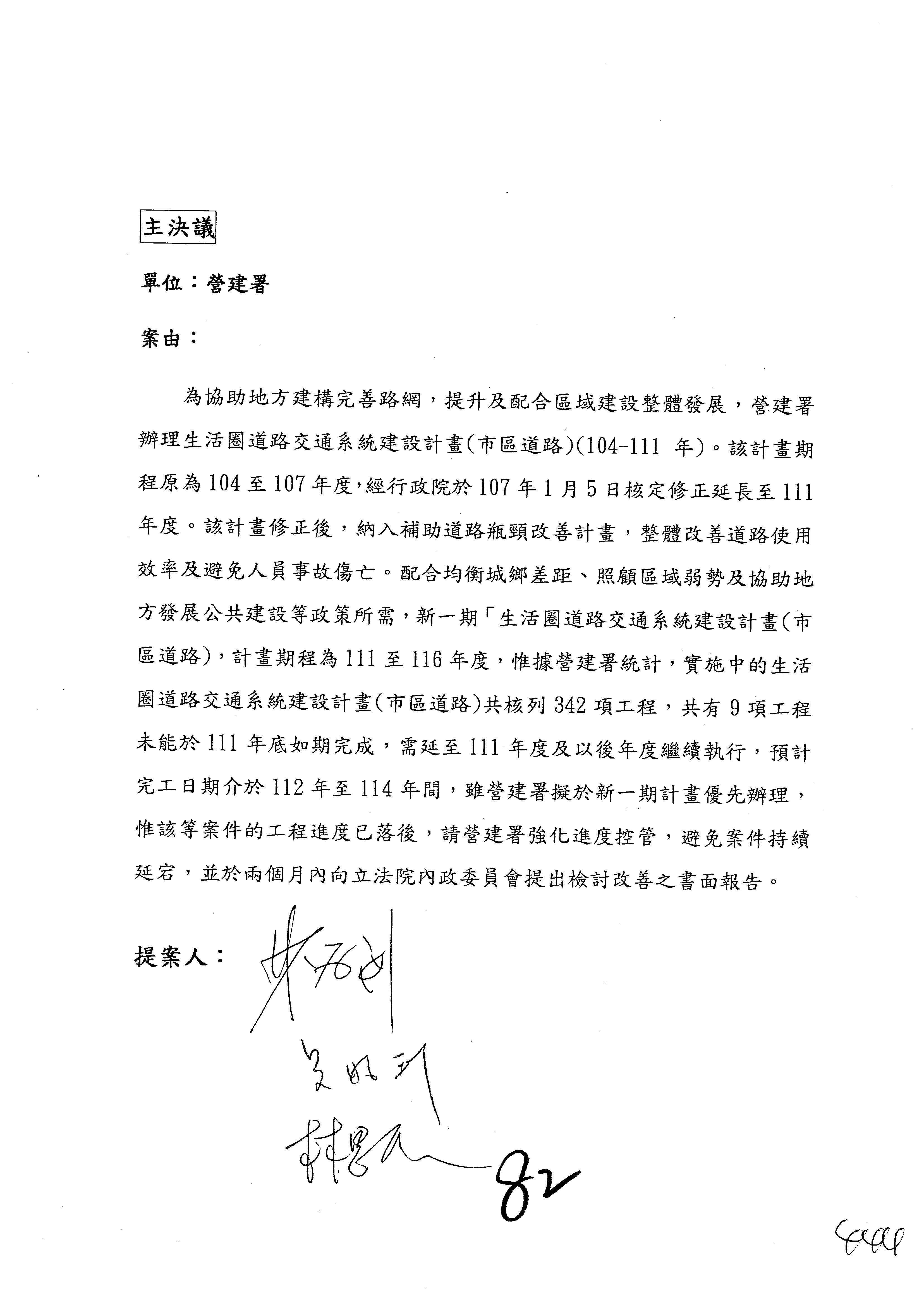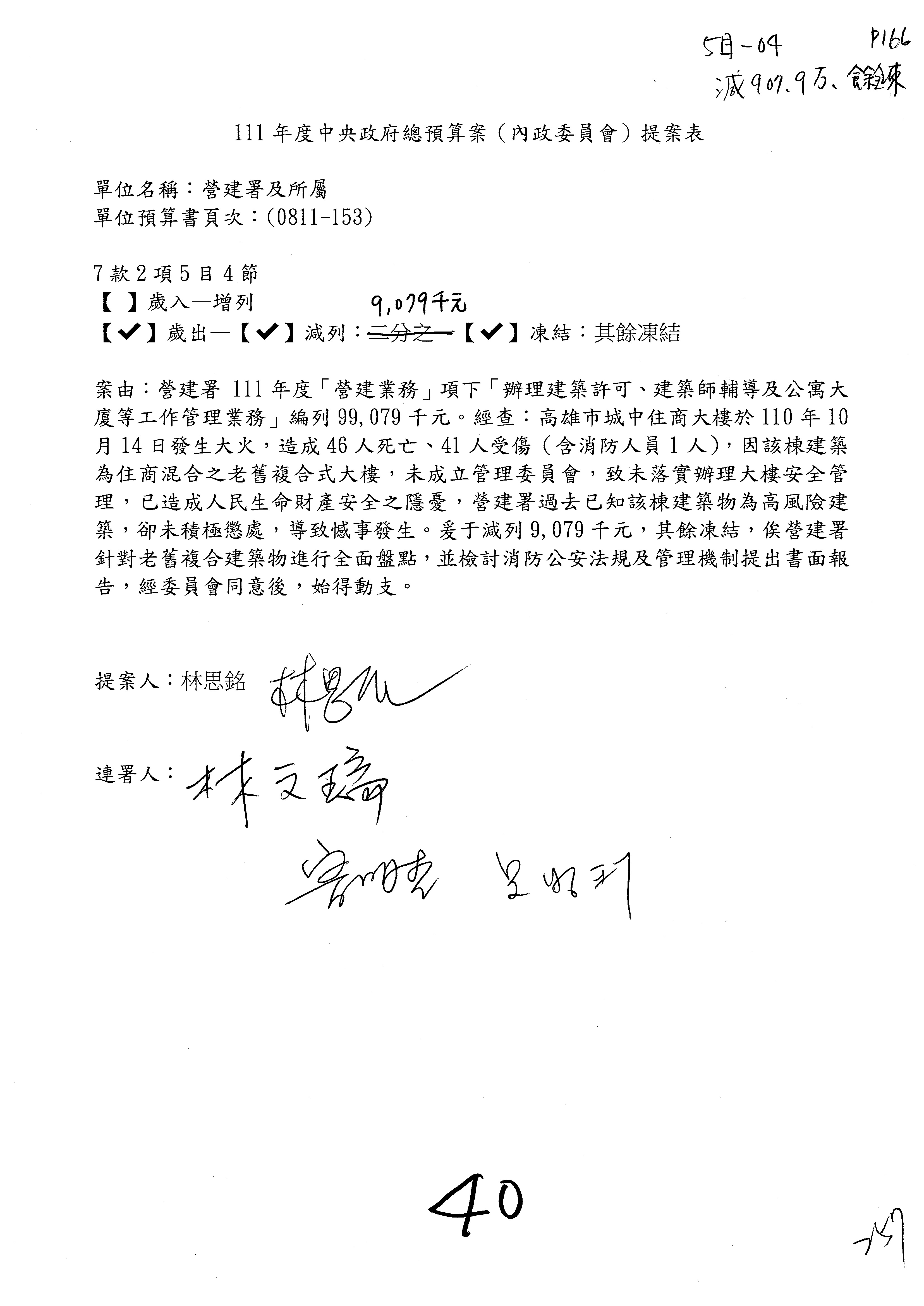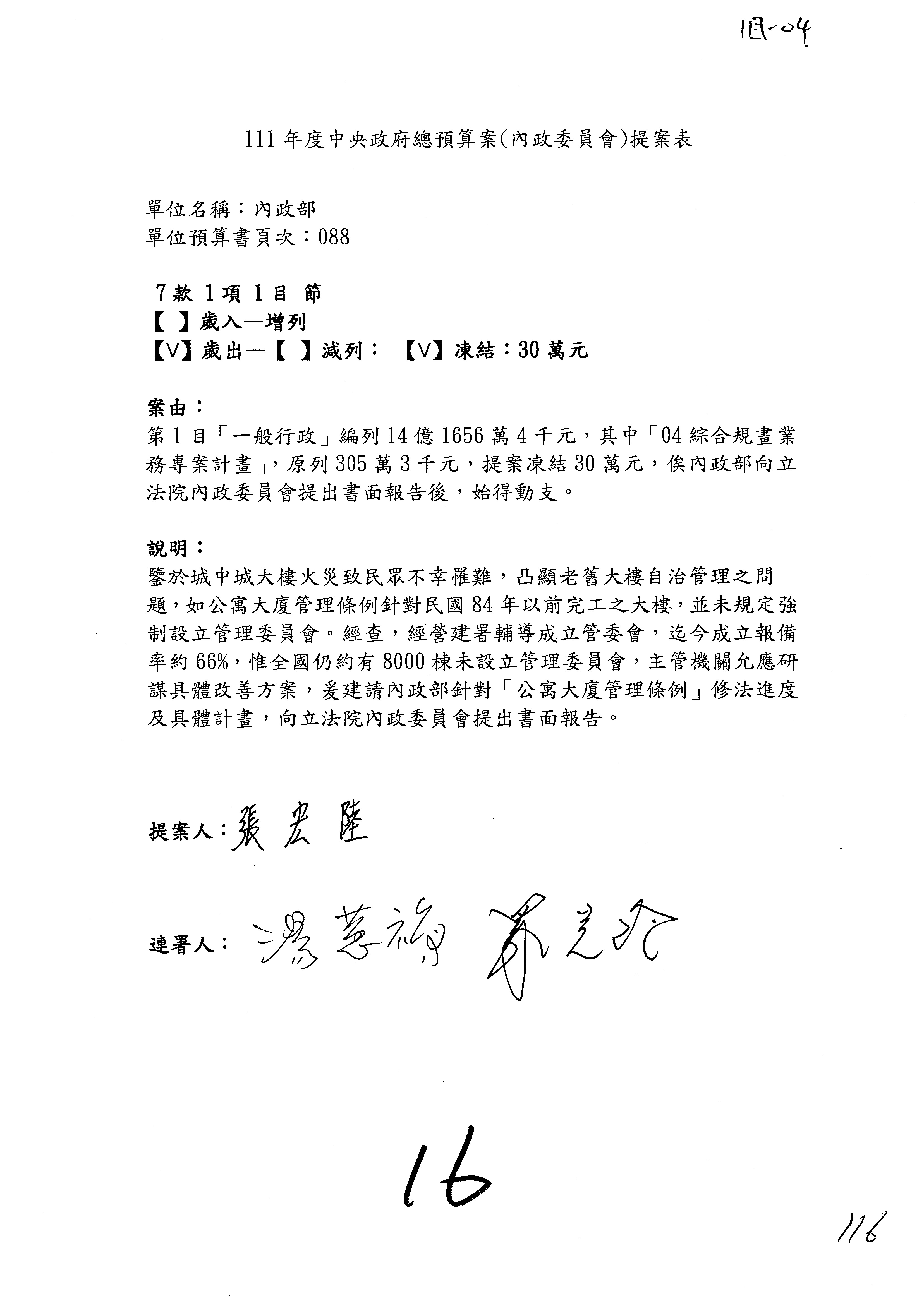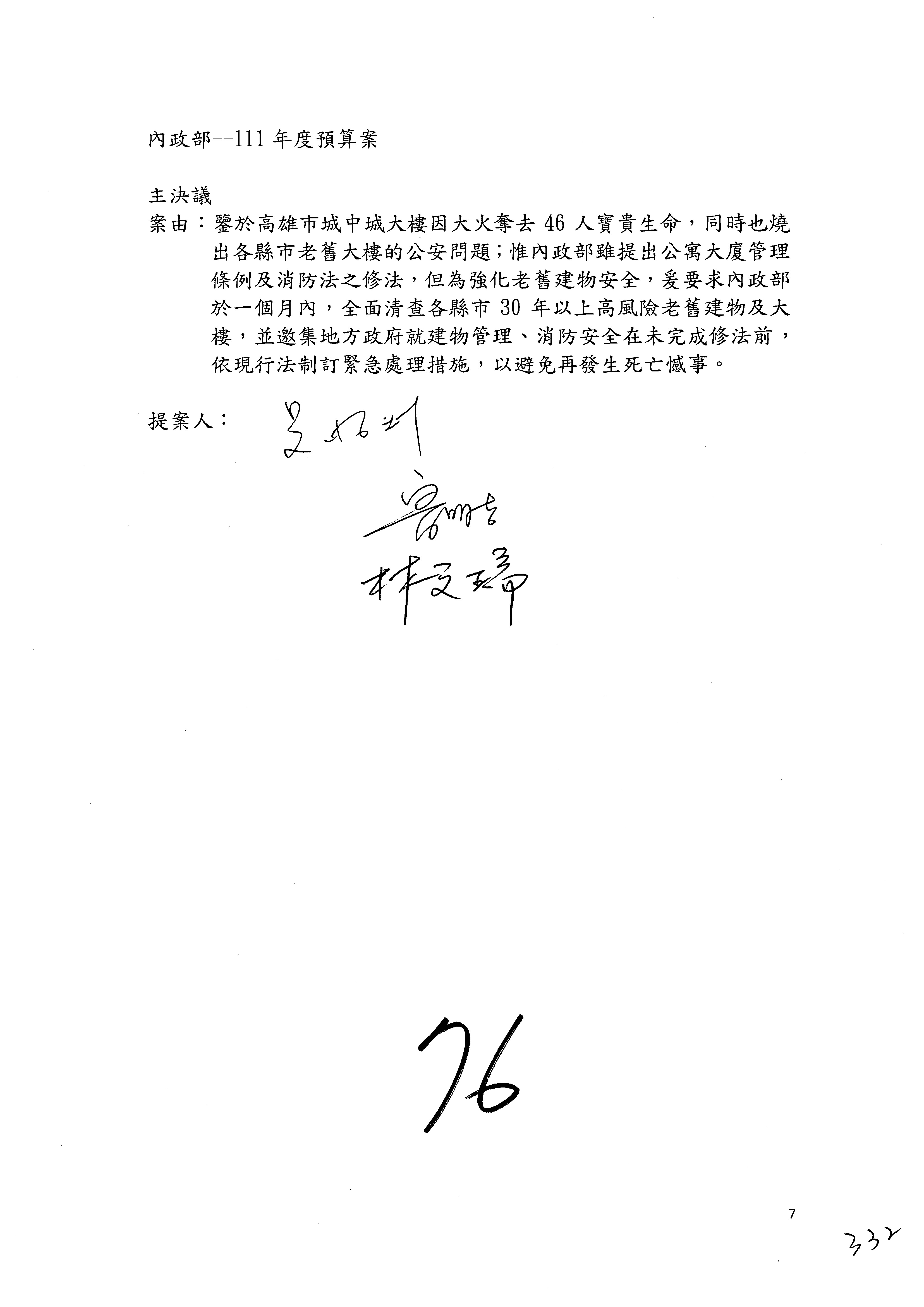 好啦!我唸一下,第7案是林思銘委員的提案,第3行修正為「經查:預算書中內容過於簡略,未有其他行政(或招標)流程,且難以看出其實際效益。建請建築研究所提供近五年補助單位名單並檢附行政作業流程相關資料書面報告」,這是主決議,就書面報告,沒有減列、沒有凍結,第7案就改成主決議,通過。
