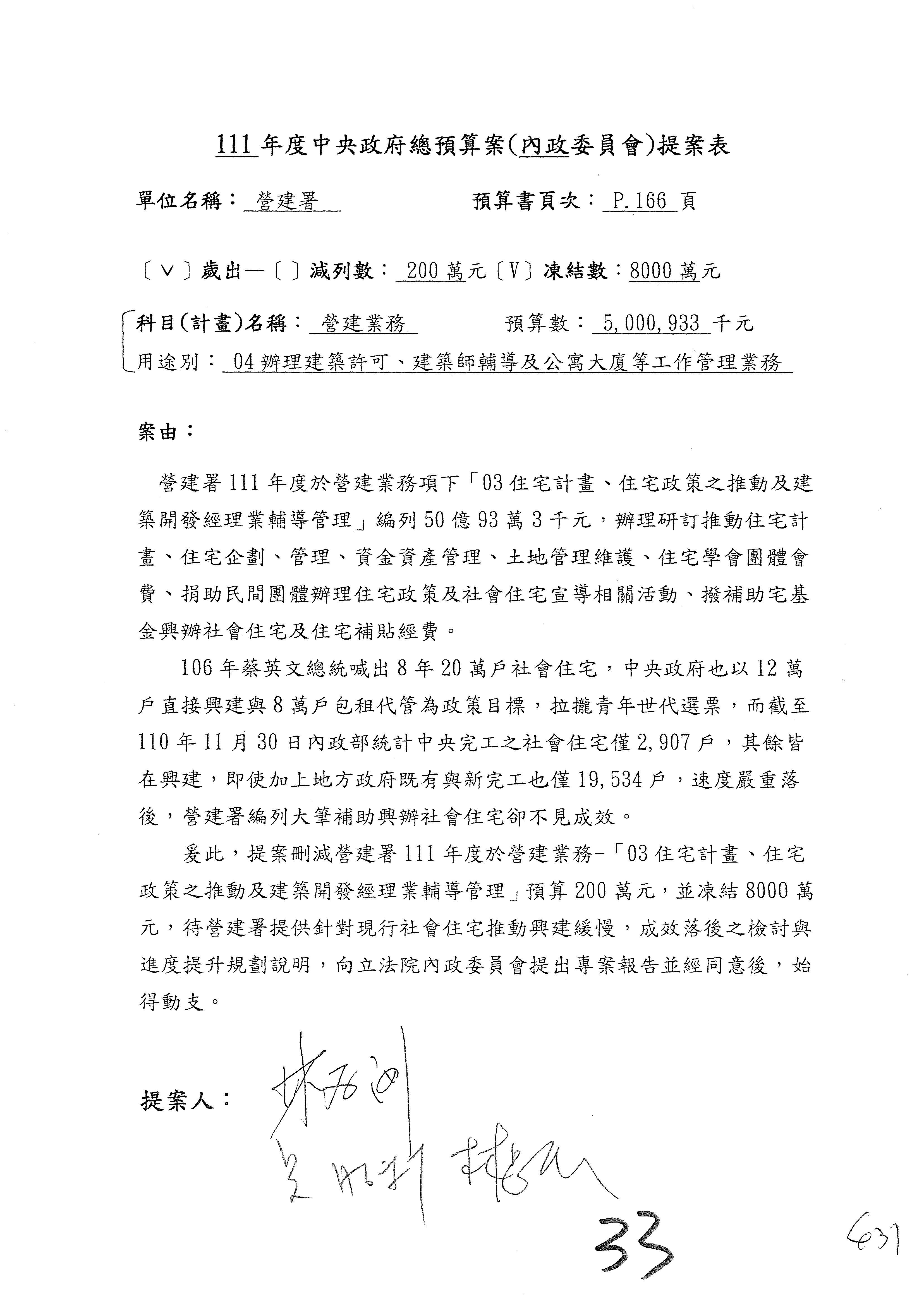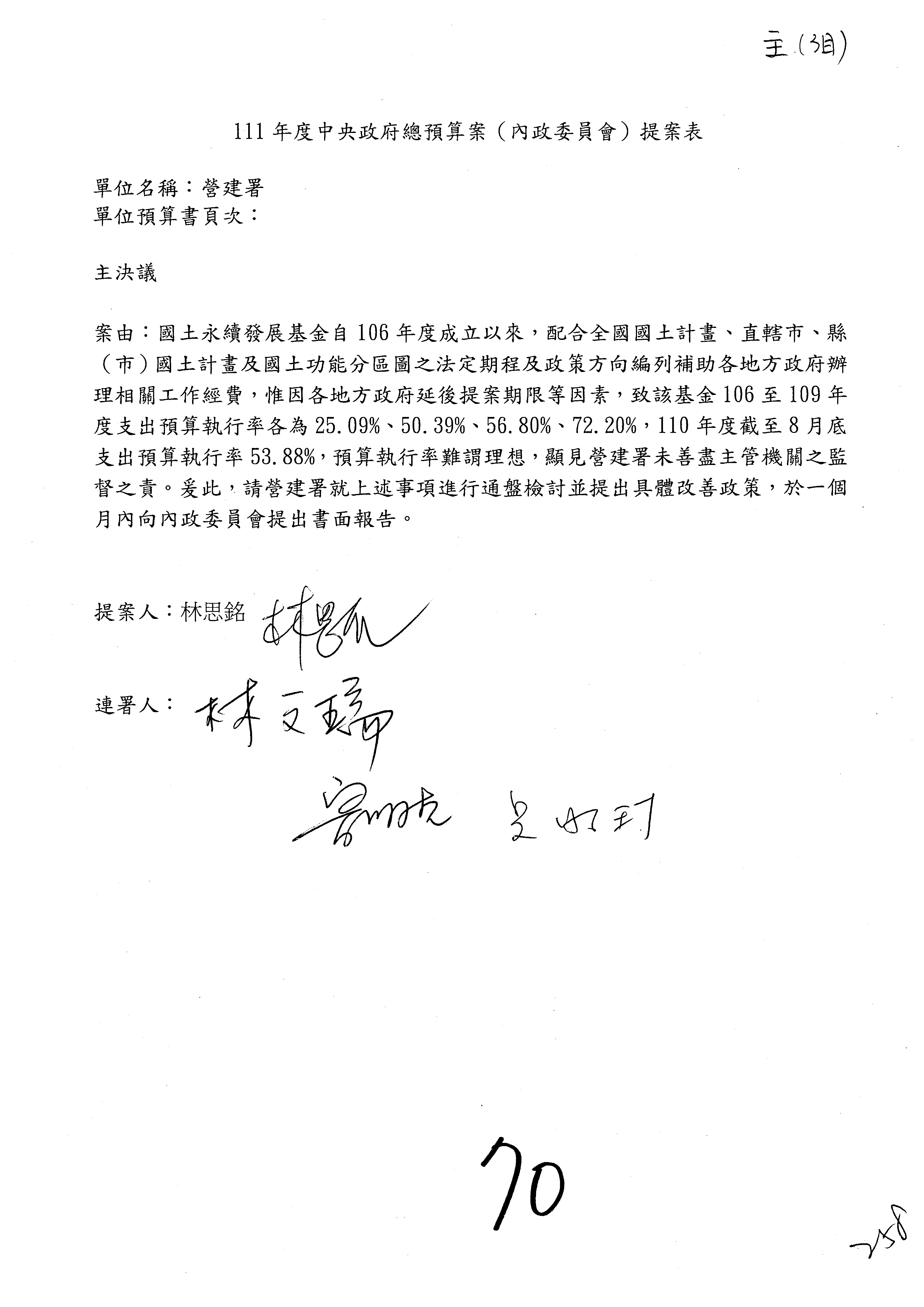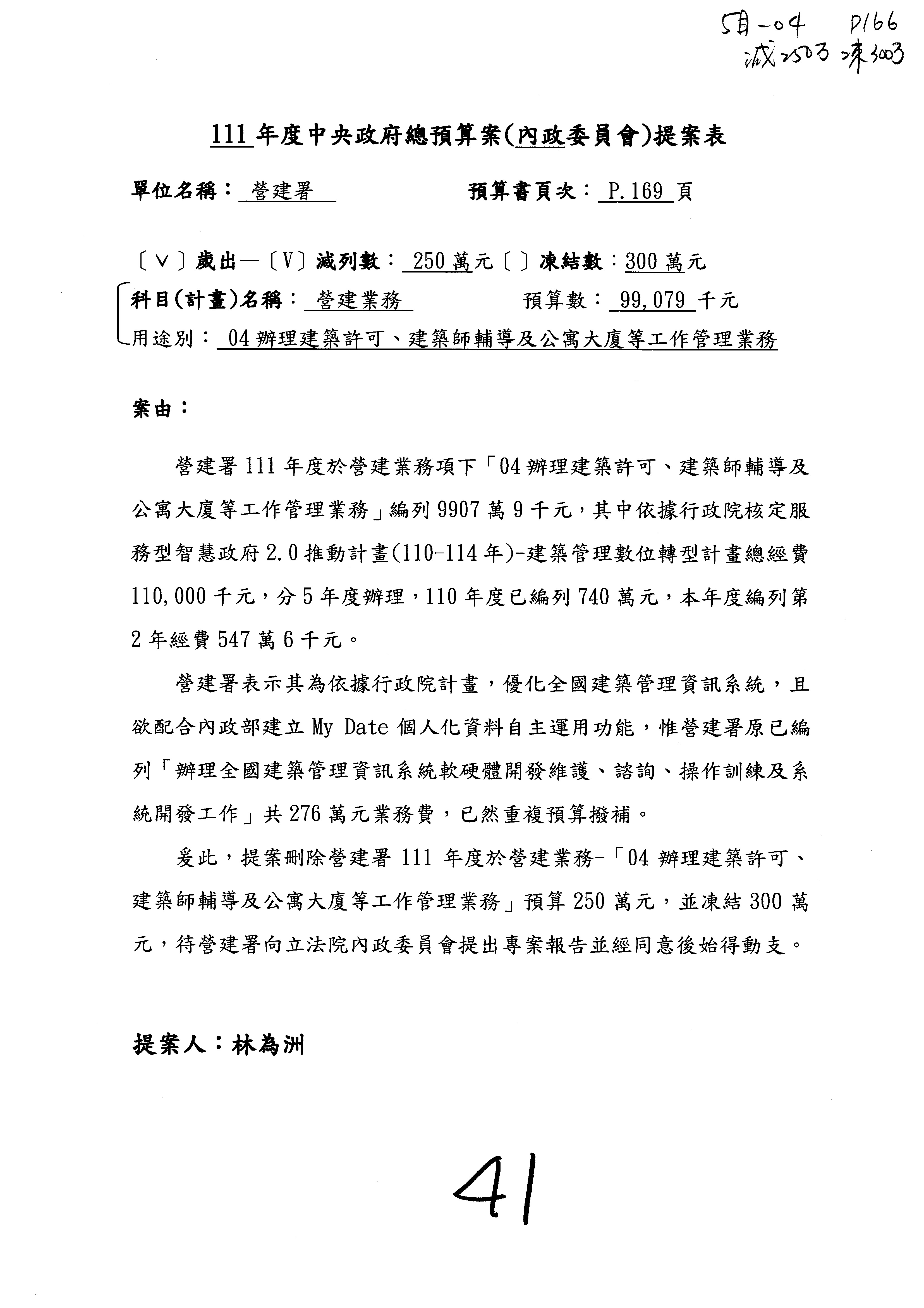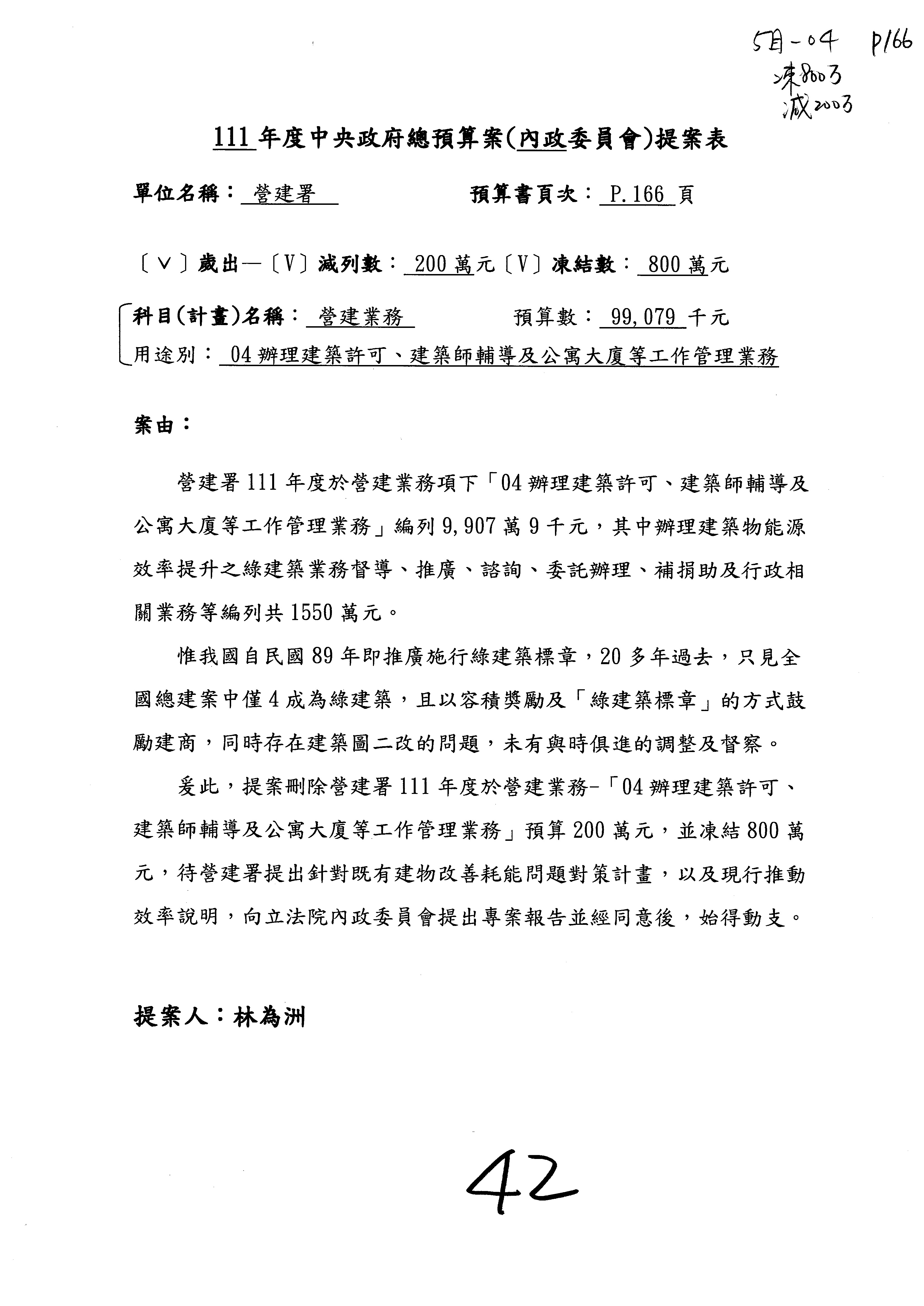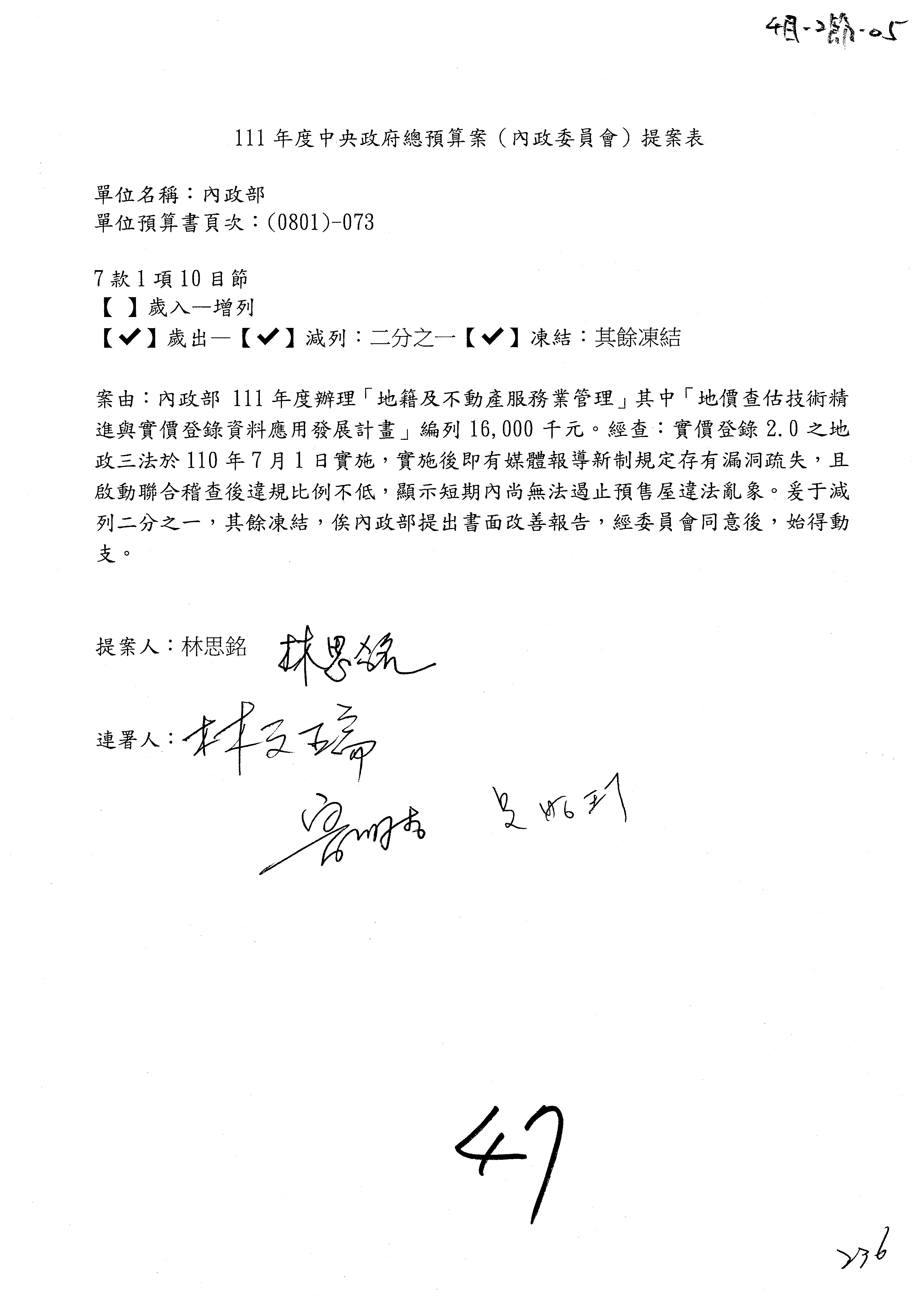 好啦!我唸一下,第7案是林思銘委員的提案,第3行修正為「經查:預算書中內容過於簡略,未有其他行政(或招標)流程,且難以看出其實際效益。建請建築研究所提供近五年補助單位名單並檢附行政作業流程相關資料書面報告」,這是主決議,就書面報告,沒有減列、沒有凍結,第7案就改成主決議,通過。