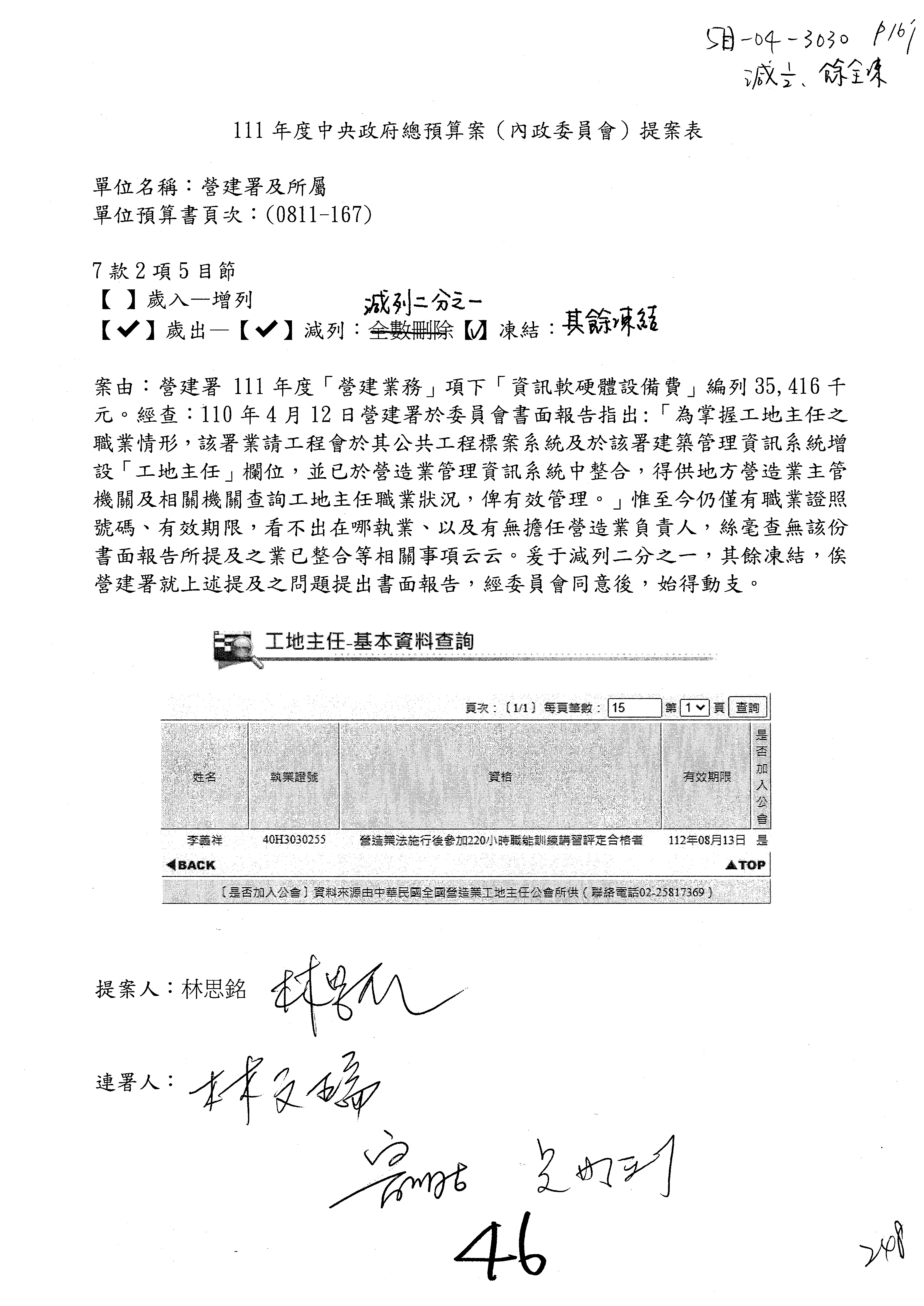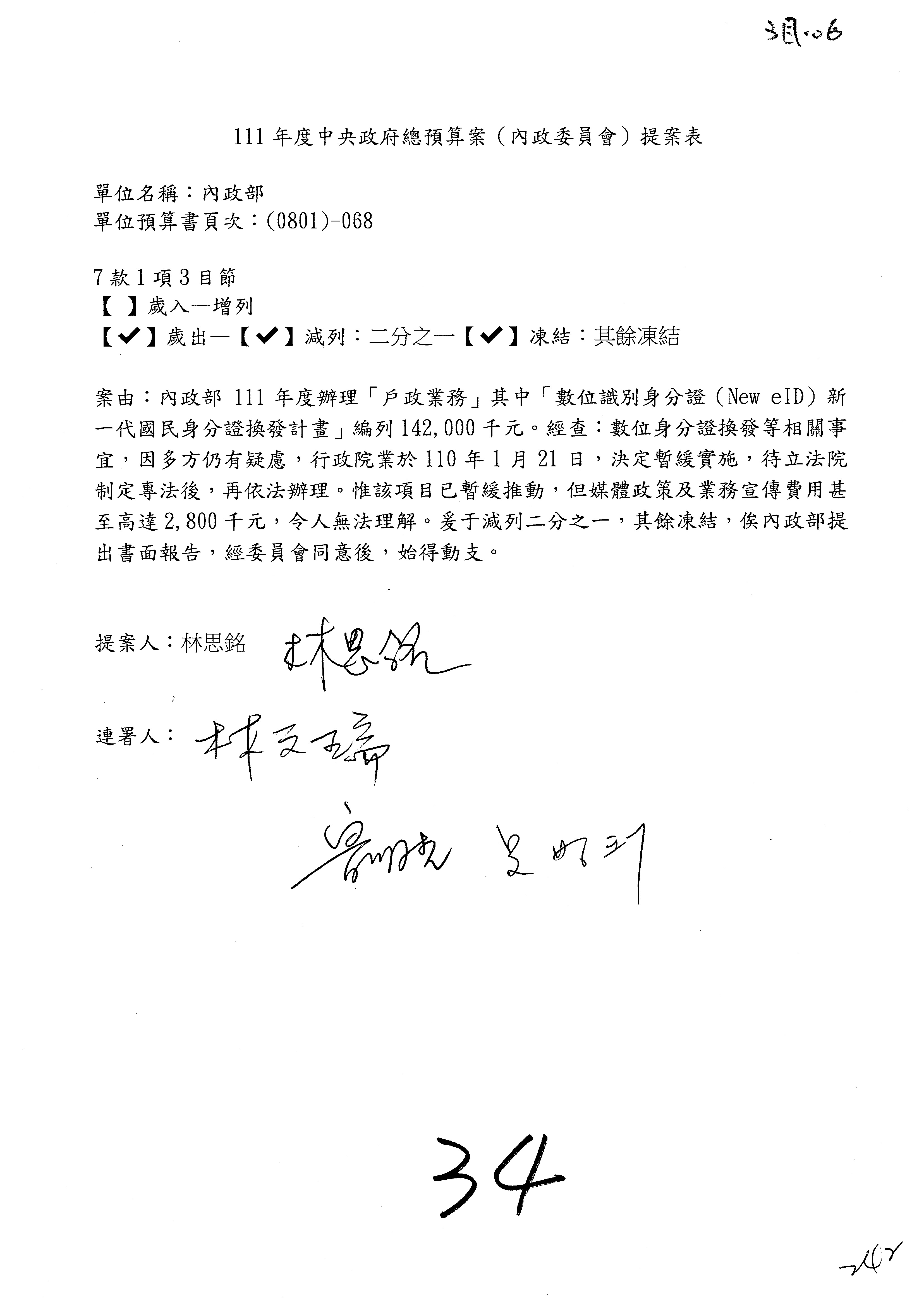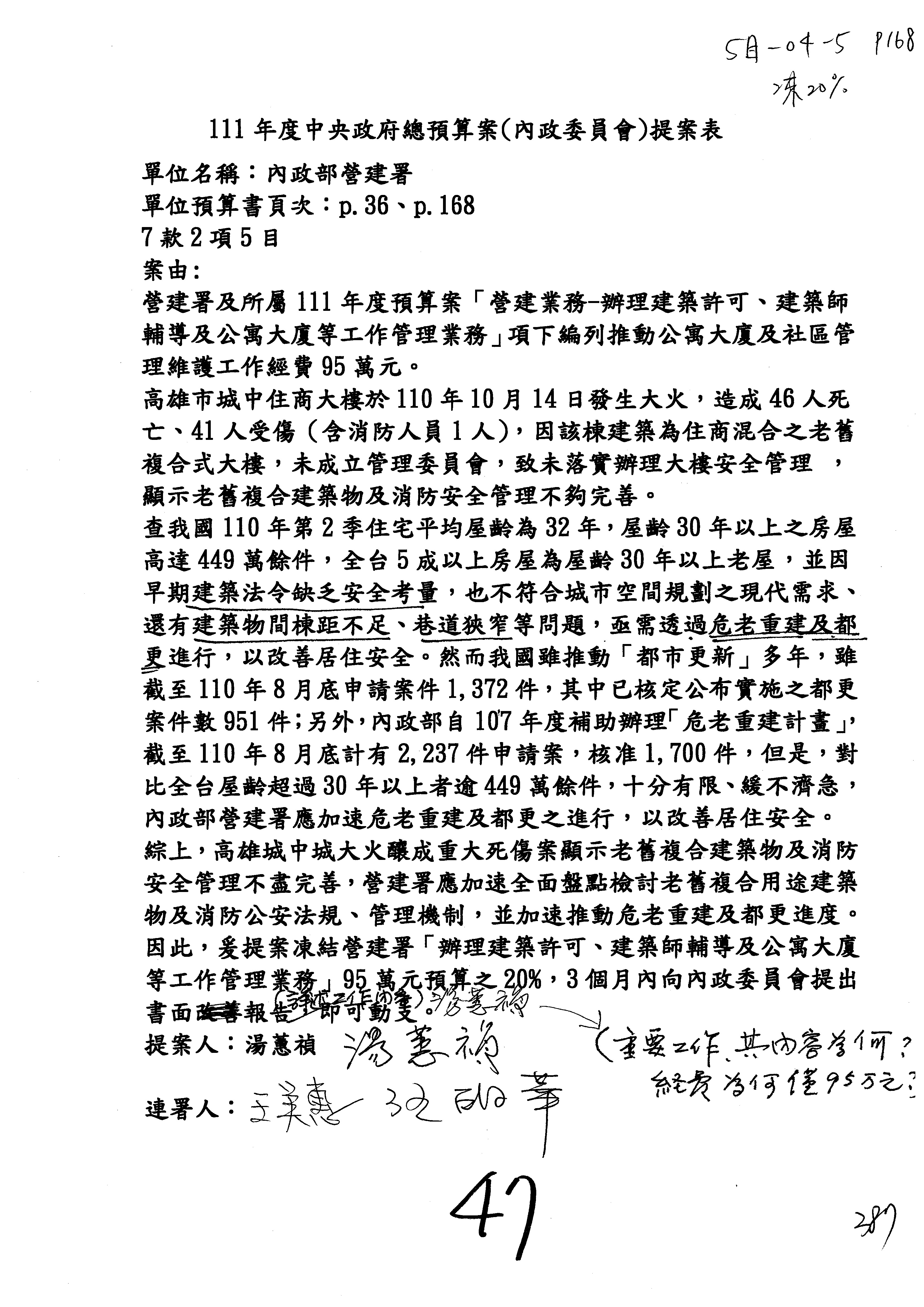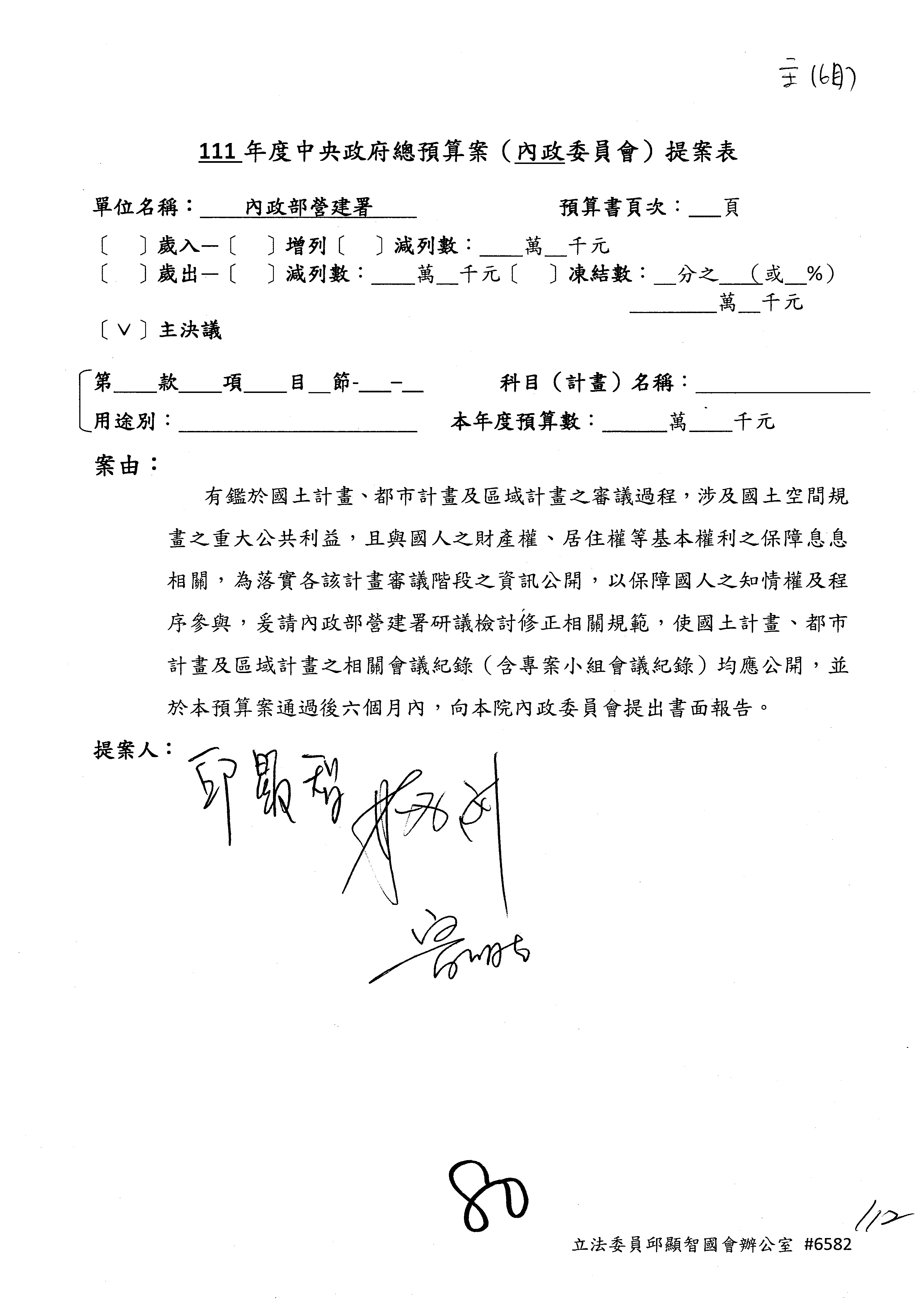 好啦!我唸一下,第7案是林思銘委員的提案,第3行修正為「經查:預算書中內容過於簡略,未有其他行政(或招標)流程,且難以看出其實際效益。建請建築研究所提供近五年補助單位名單並檢附行政作業流程相關資料書面報告」,這是主決議,就書面報告,沒有減列、沒有凍結,第7案就改成主決議,通過。