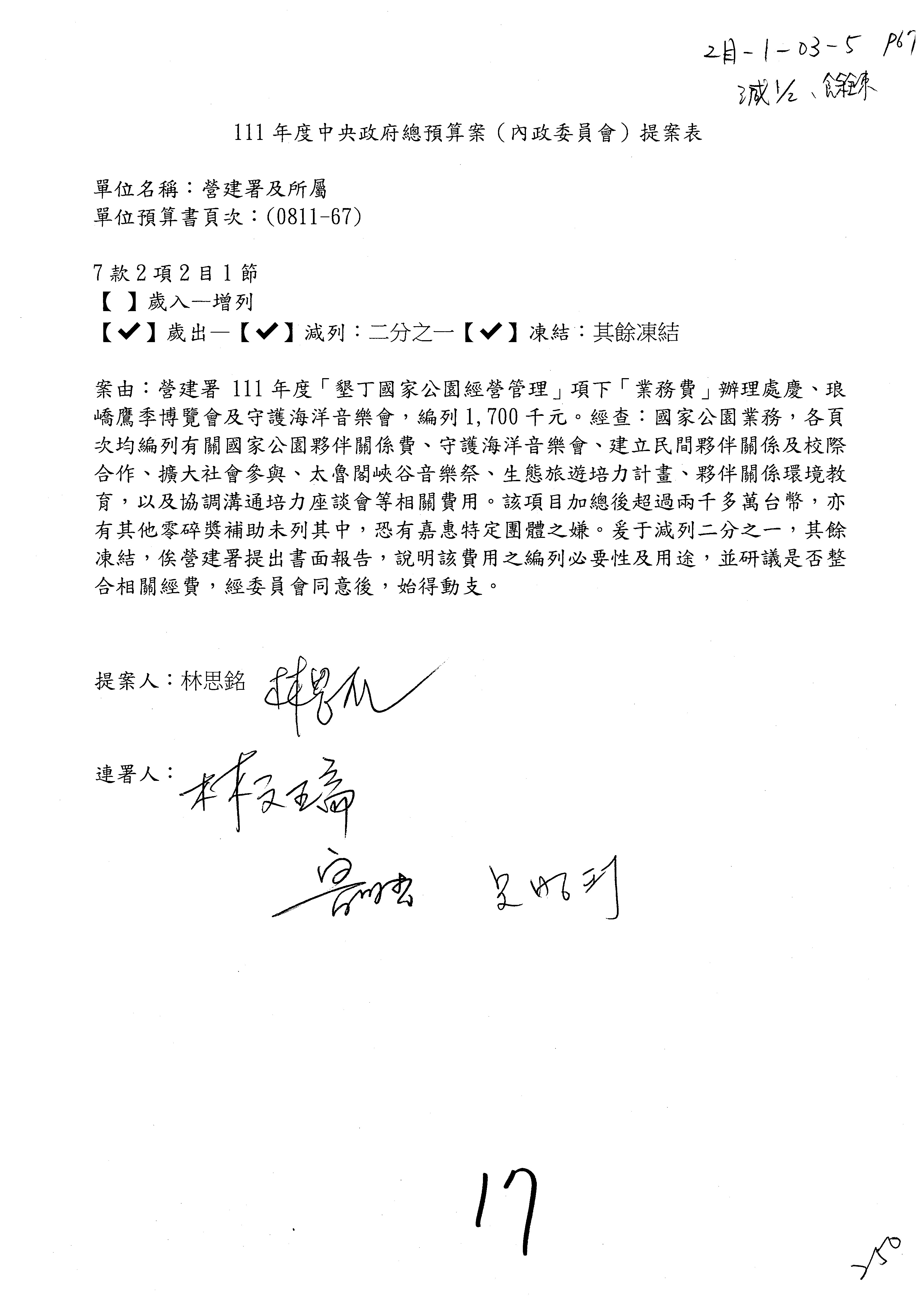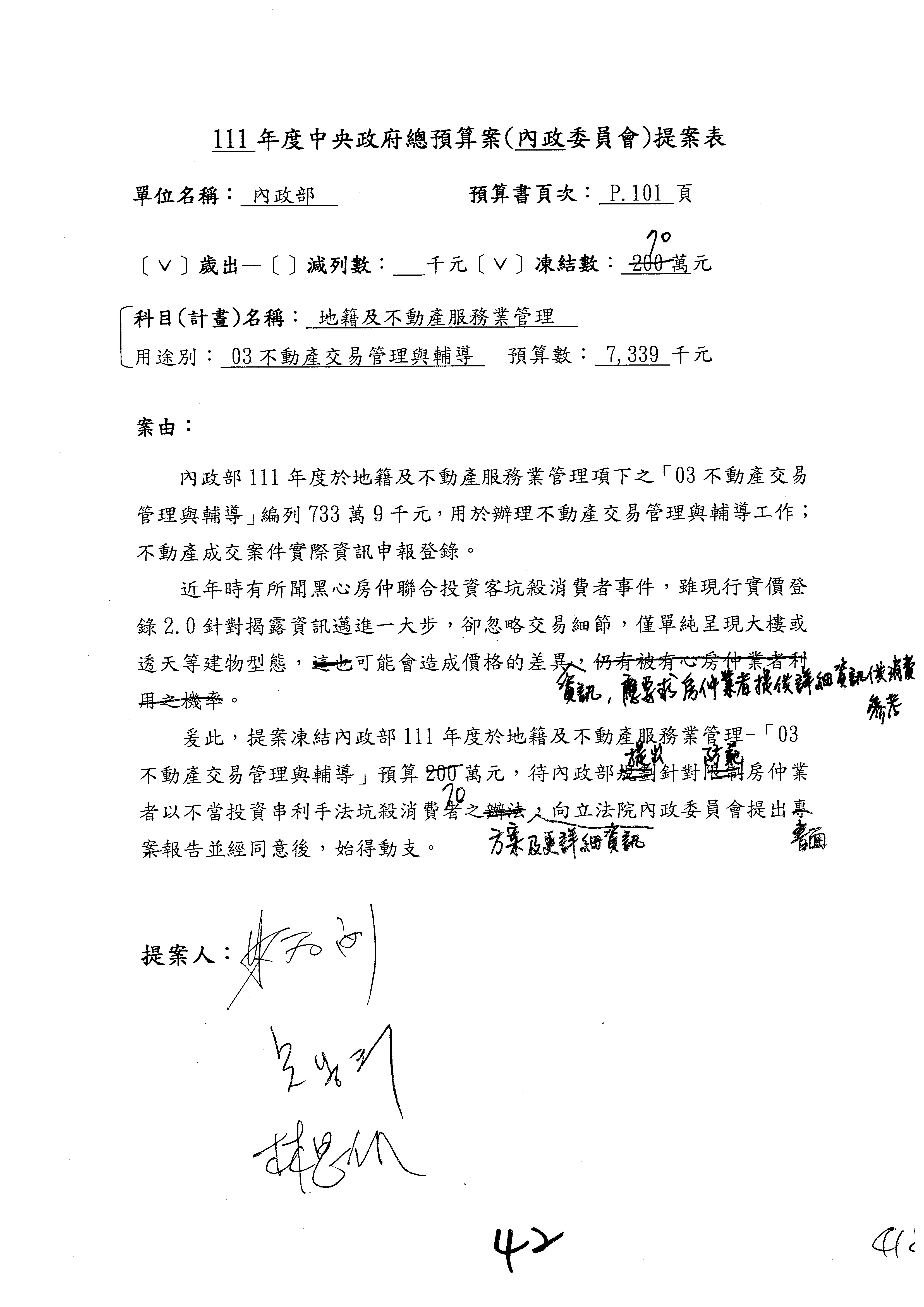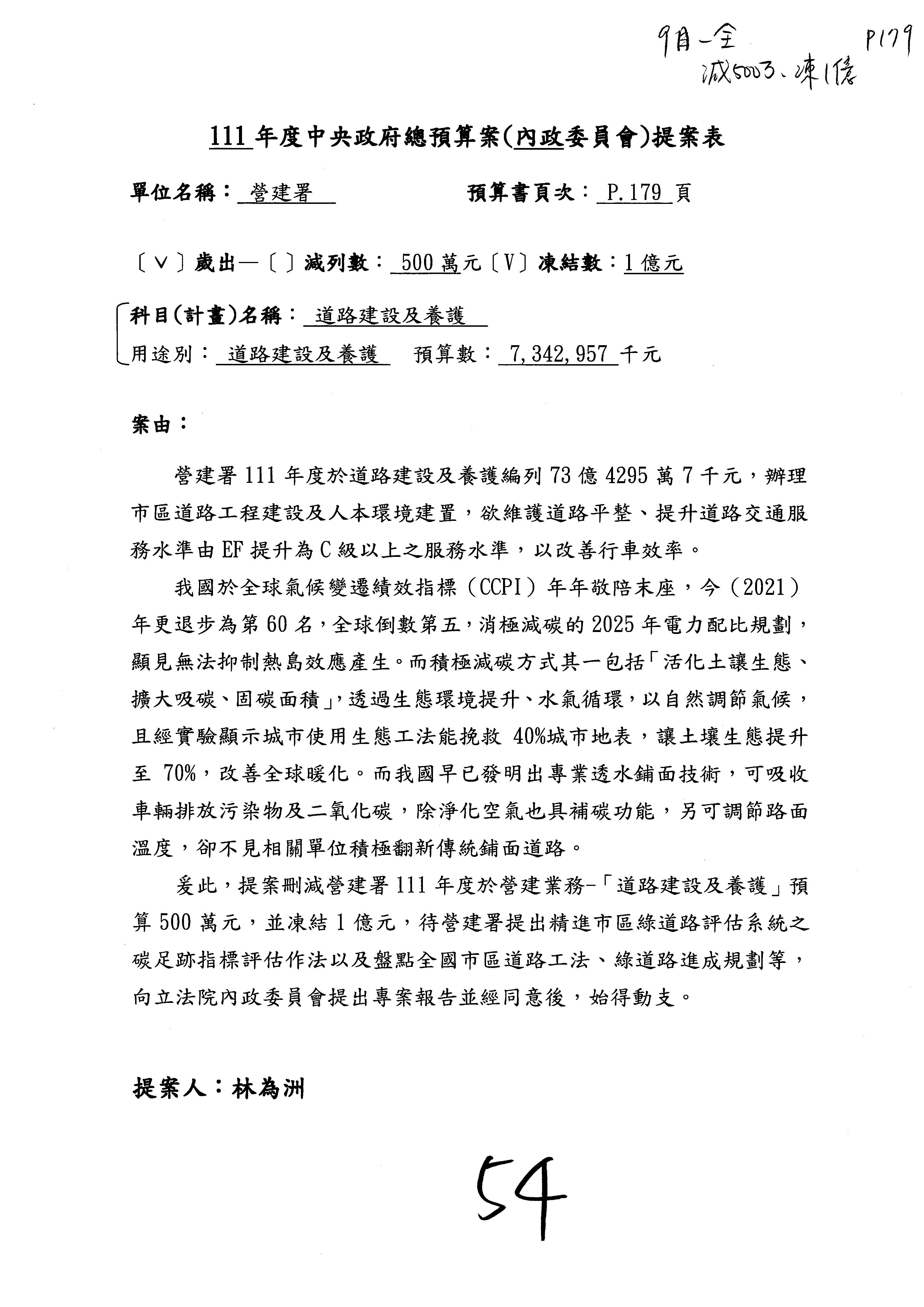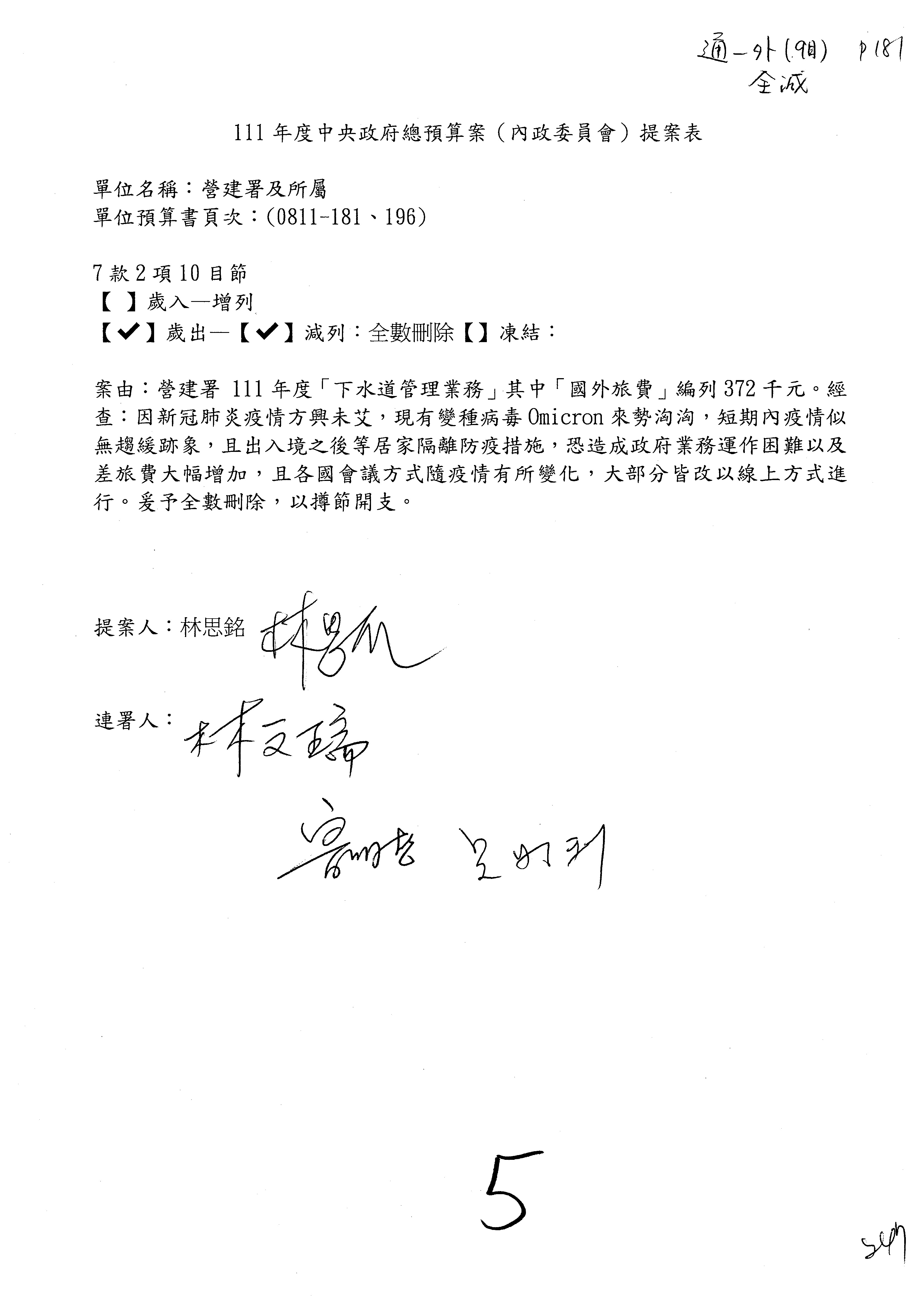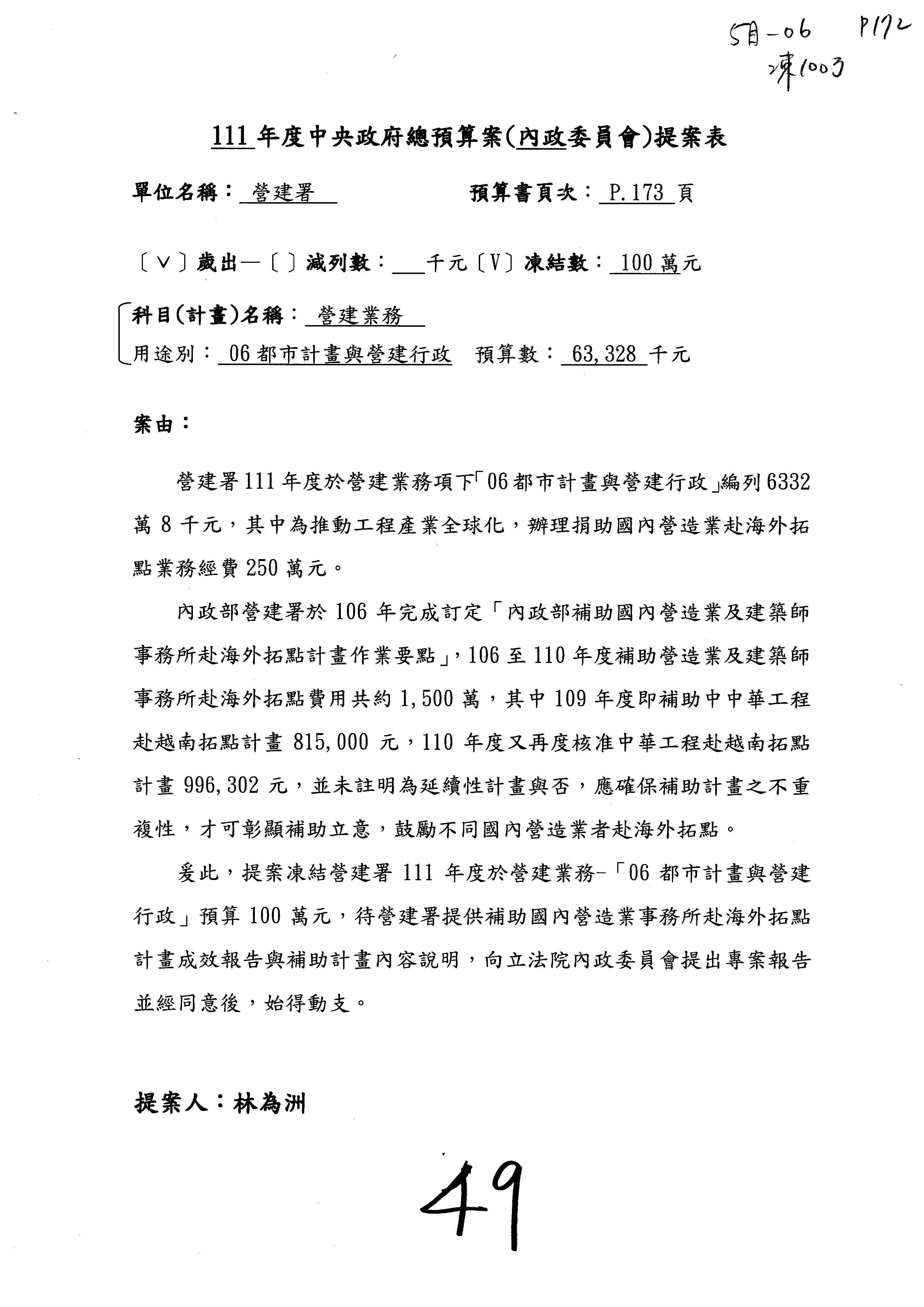 好啦!我唸一下,第7案是林思銘委員的提案,第3行修正為「經查:預算書中內容過於簡略,未有其他行政(或招標)流程,且難以看出其實際效益。建請建築研究所提供近五年補助單位名單並檢附行政作業流程相關資料書面報告」,這是主決議,就書面報告,沒有減列、沒有凍結,第7案就改成主決議,通過。