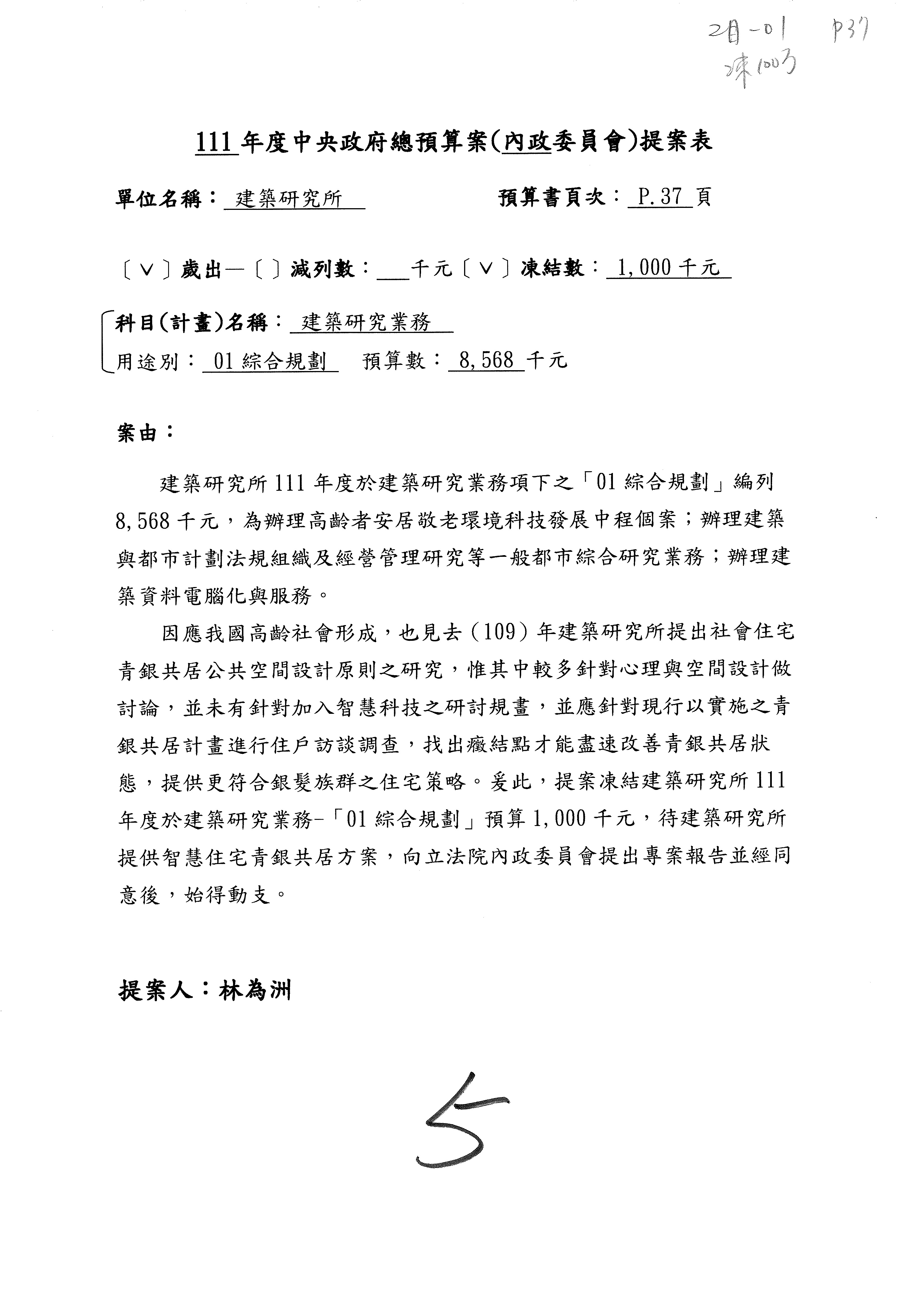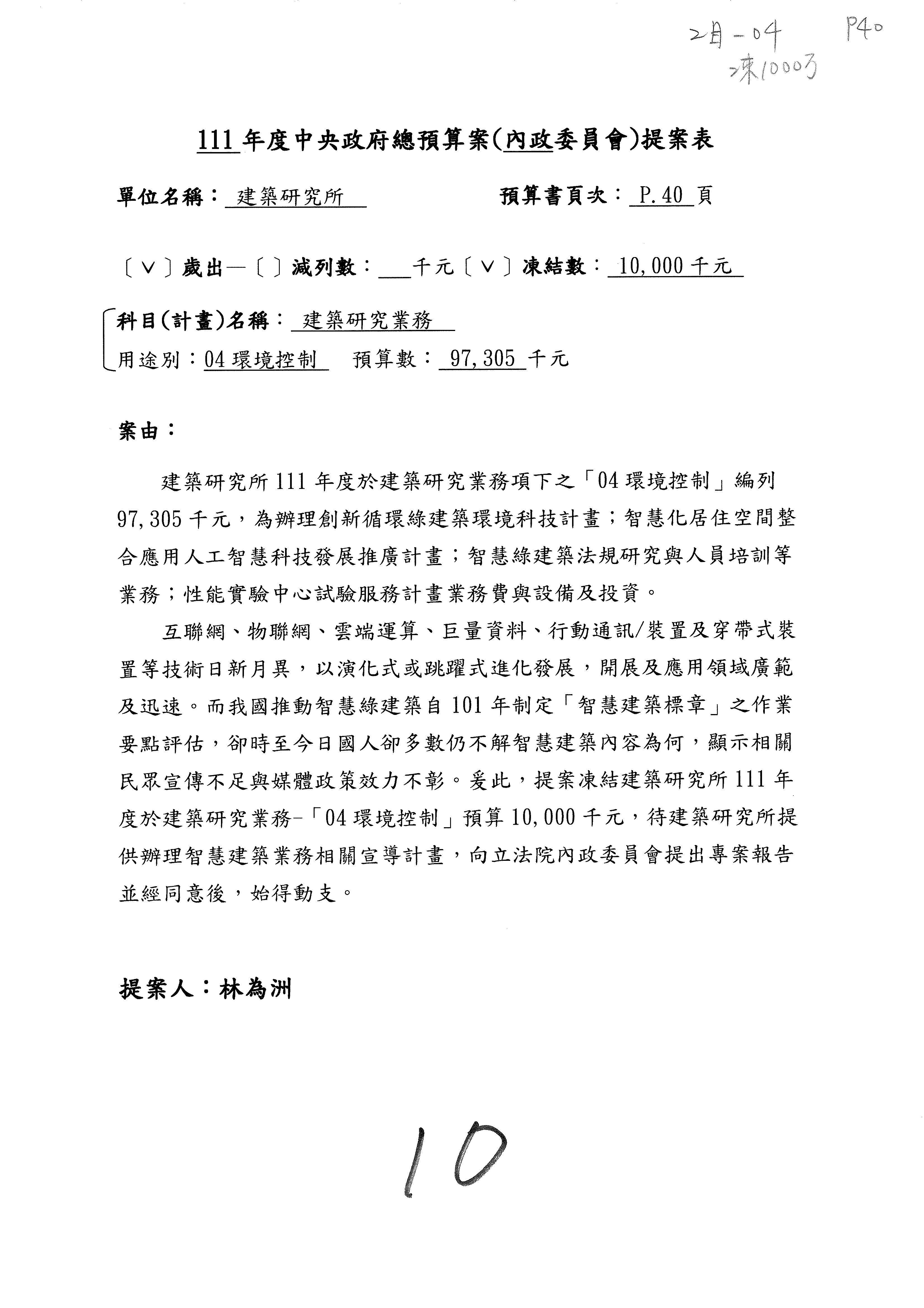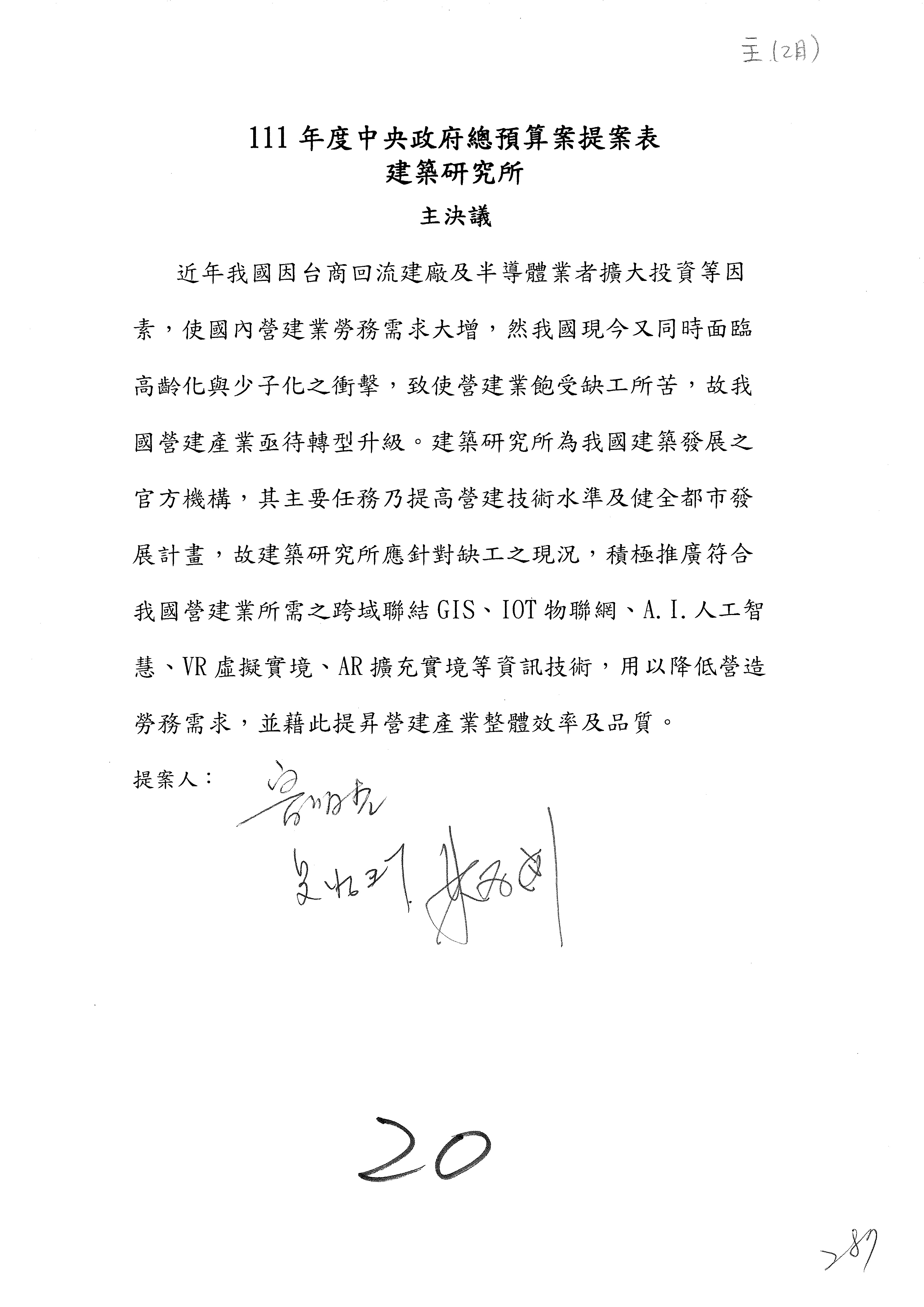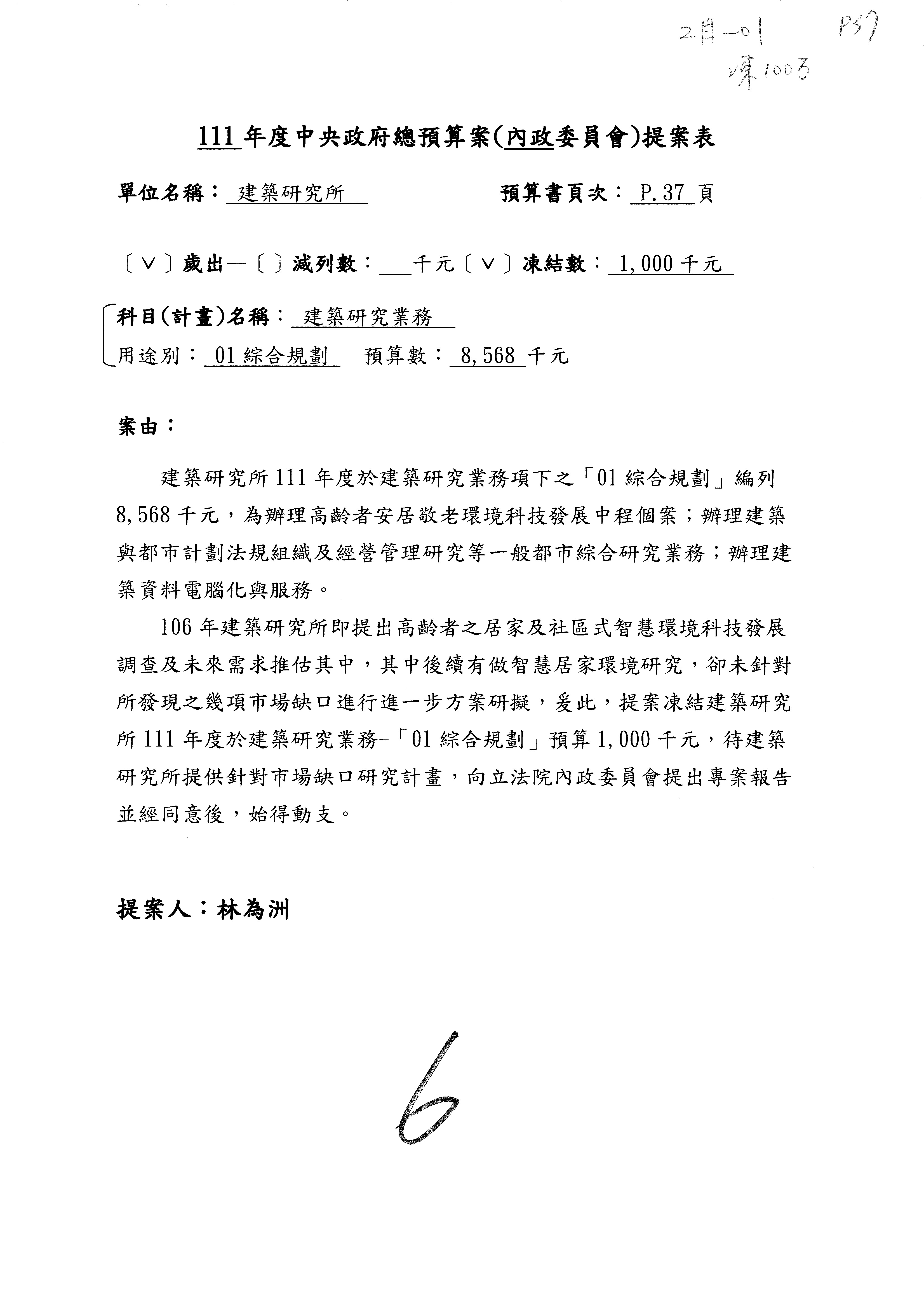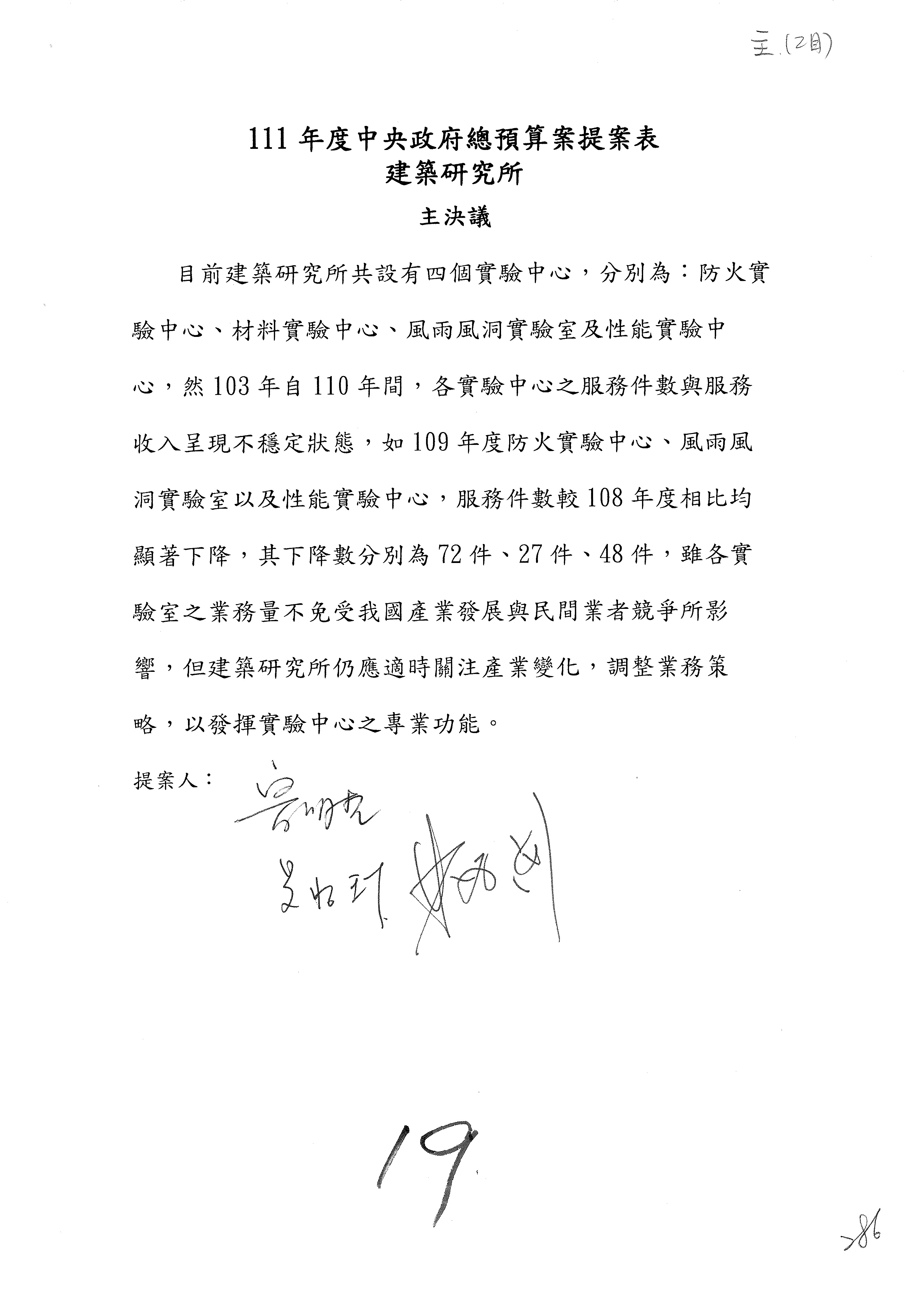 主席:因為徐部長今天有事請假到下午3點,我已經准假,所以今天預算審查的順序,先從建築研究所開始,現在進行協商。