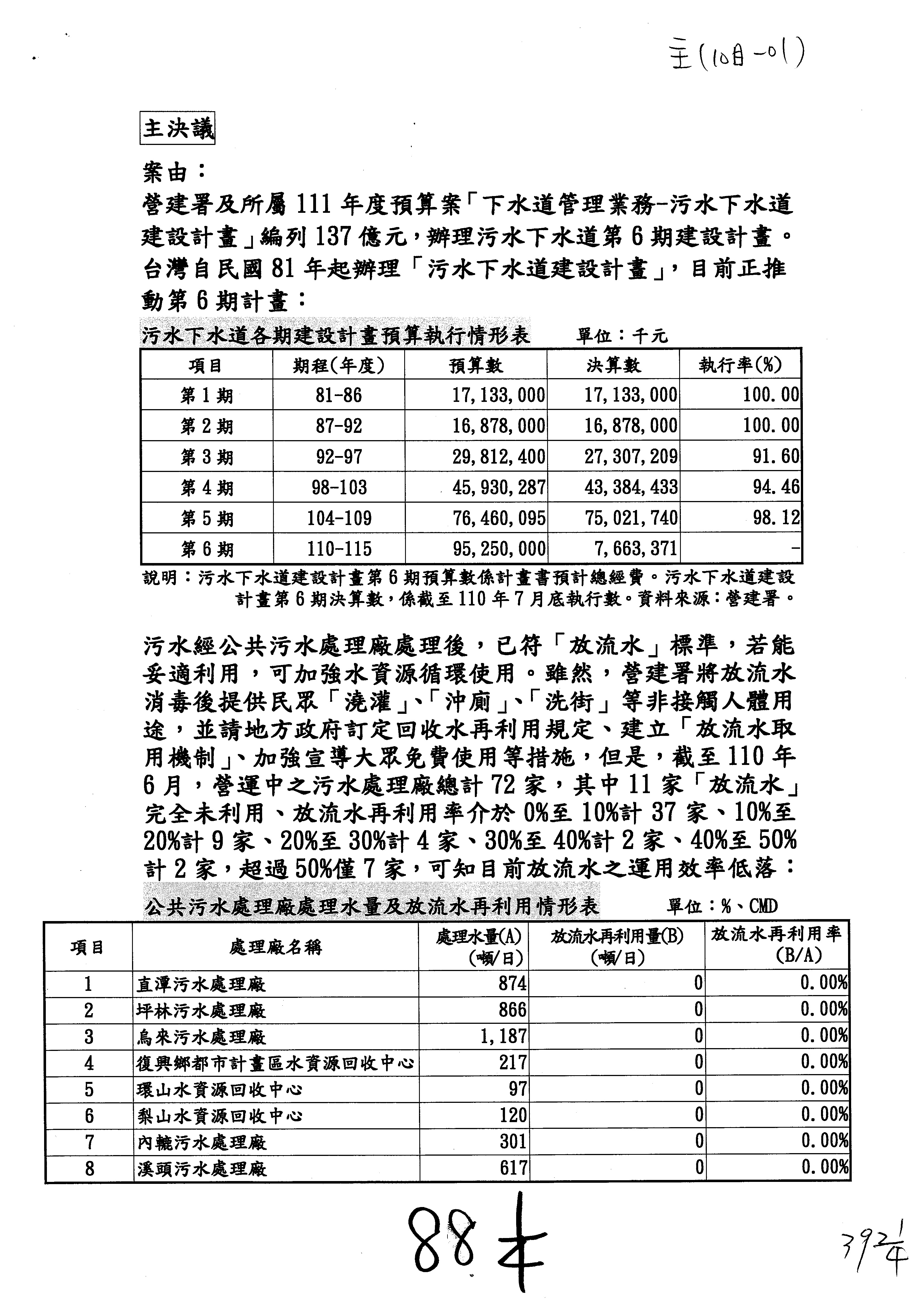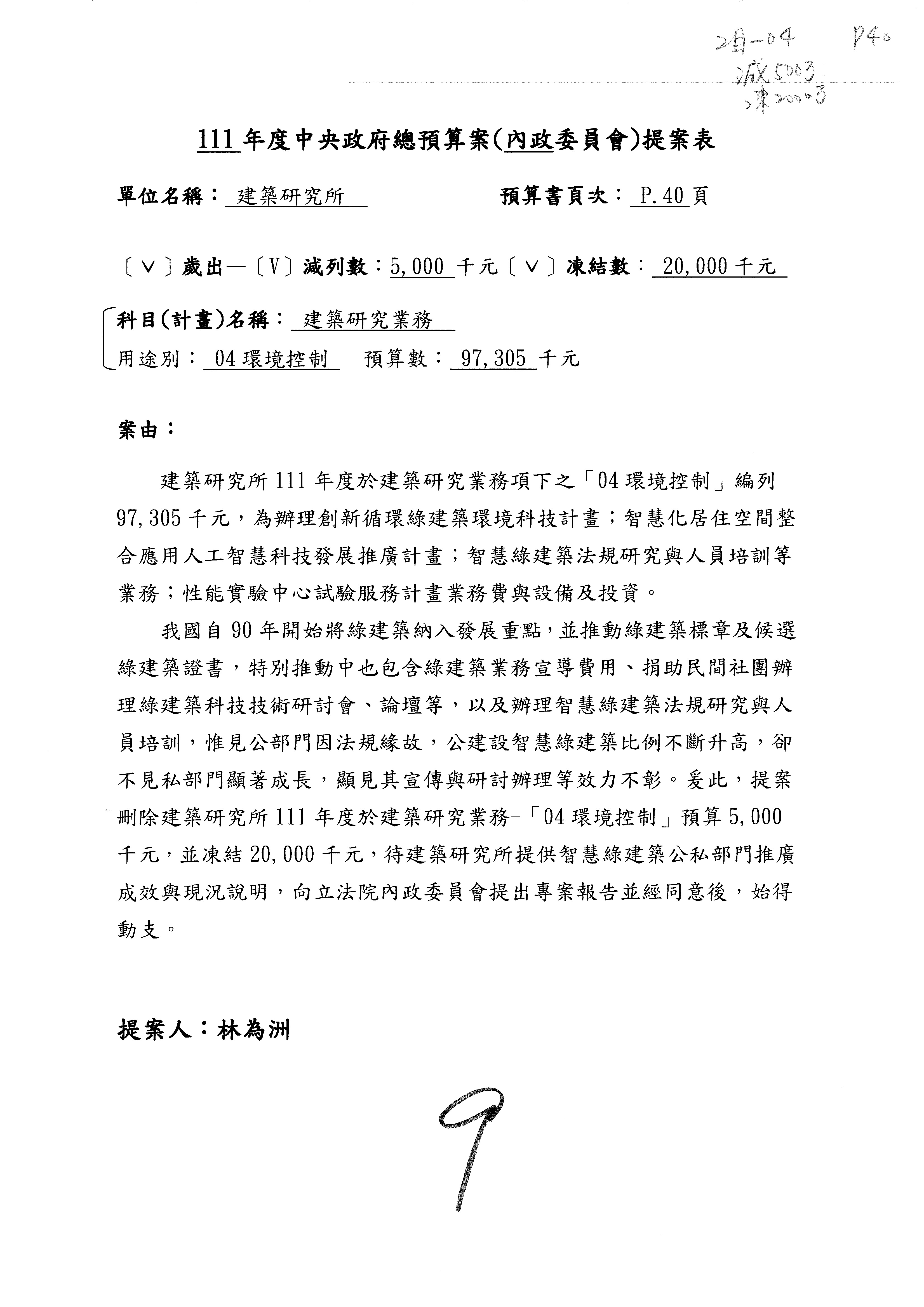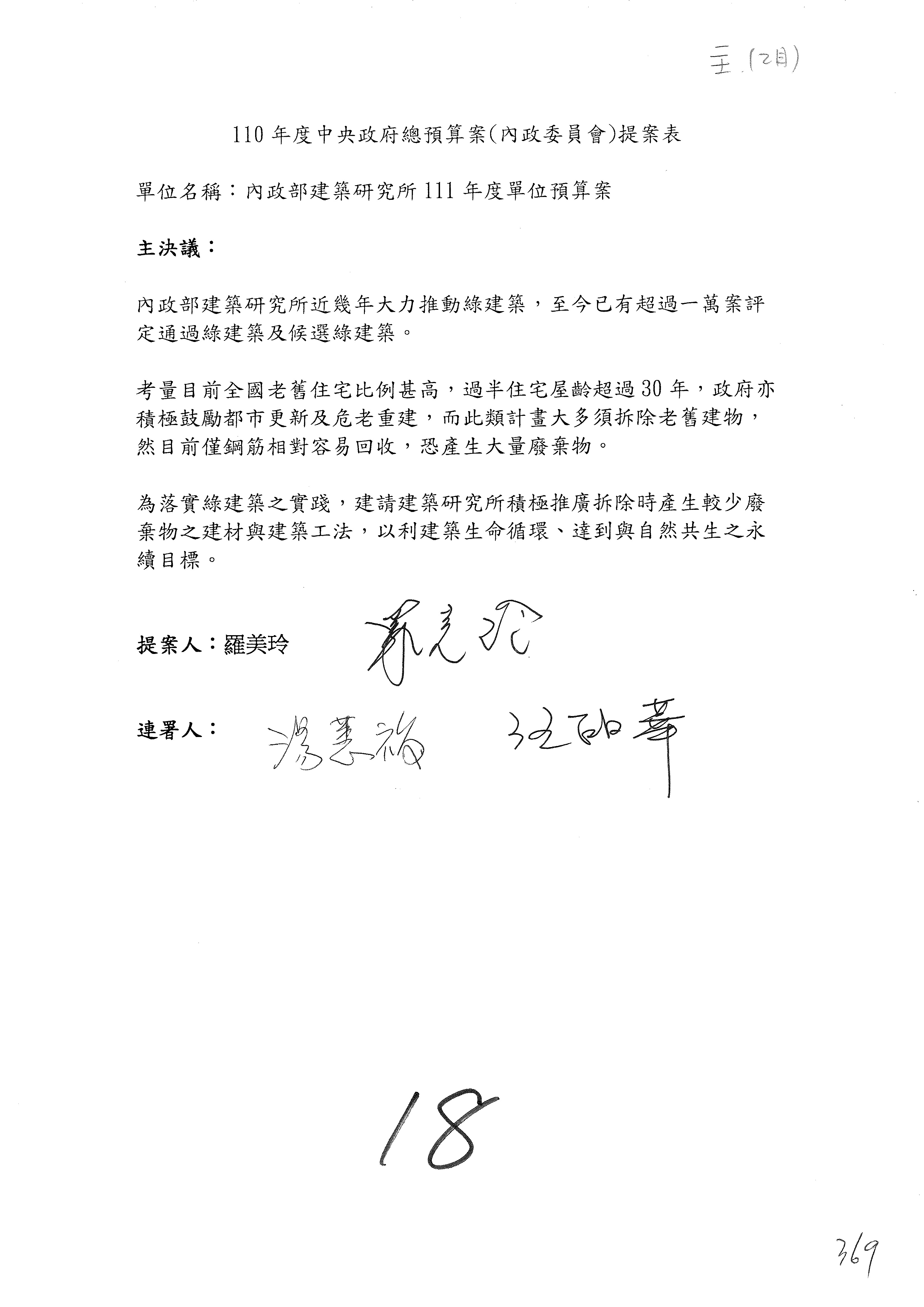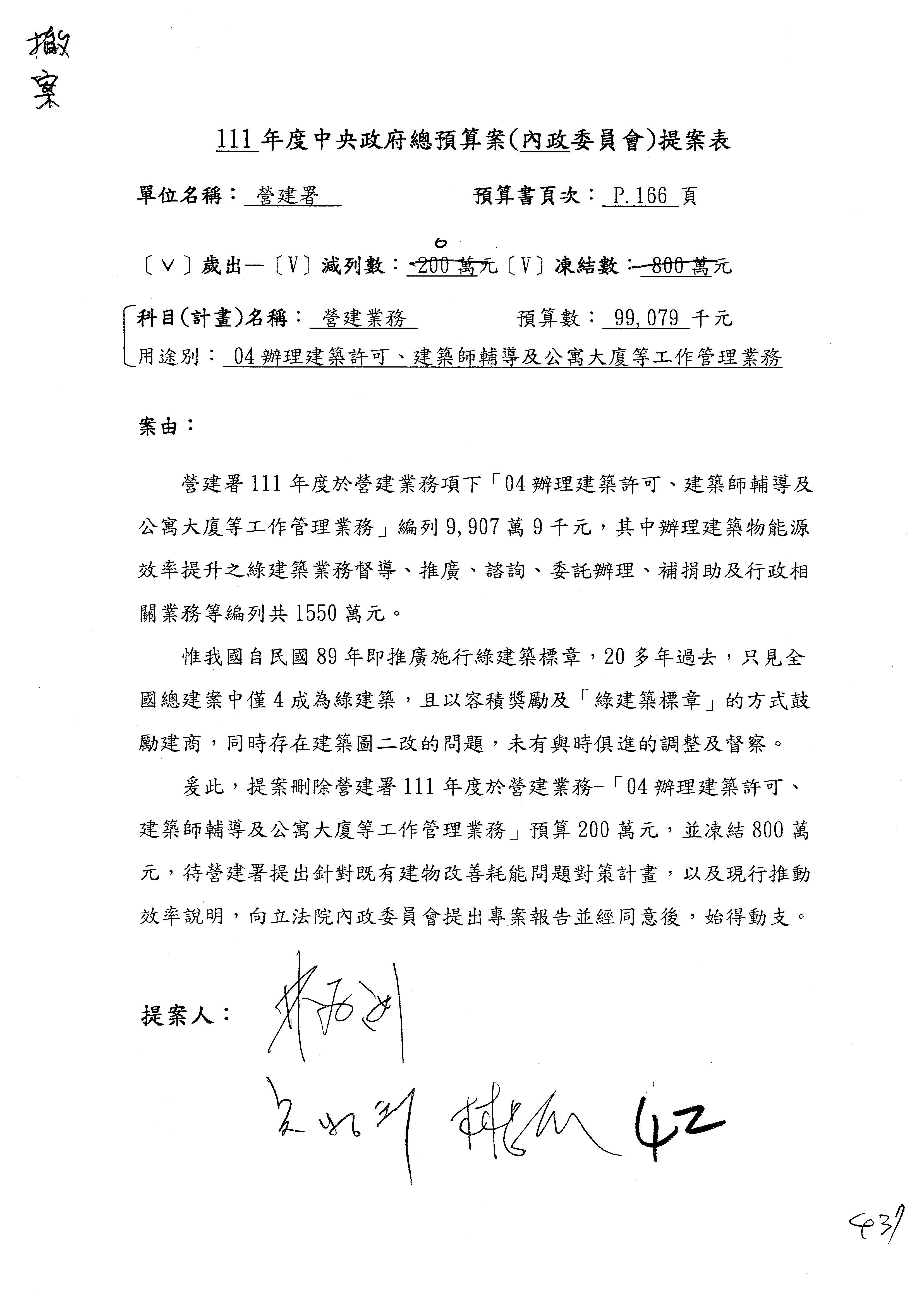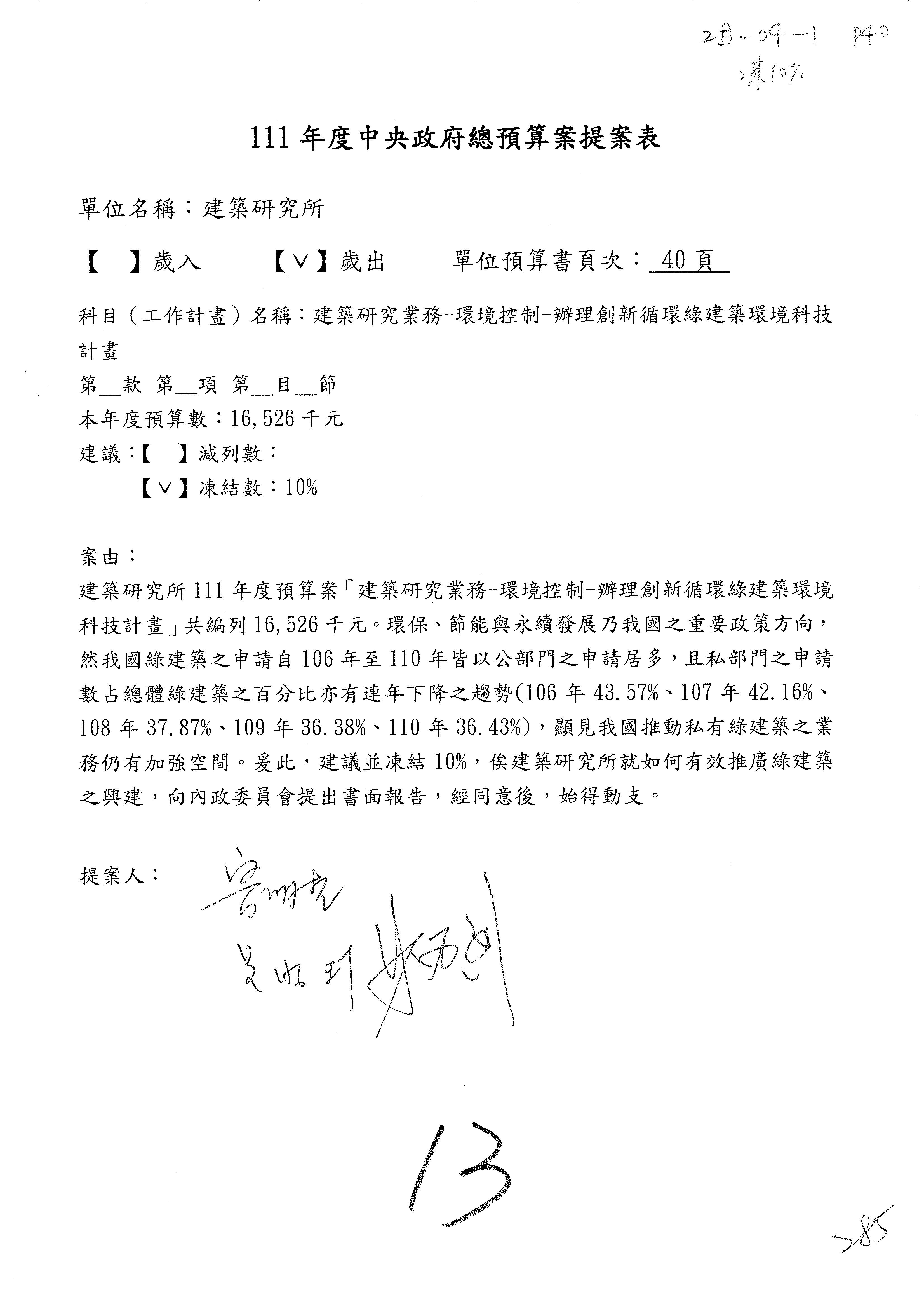 主席:因為徐部長今天有事請假到下午3點,我已經准假,所以今天預算審查的順序,先從建築研究所開始,現在進行協商。