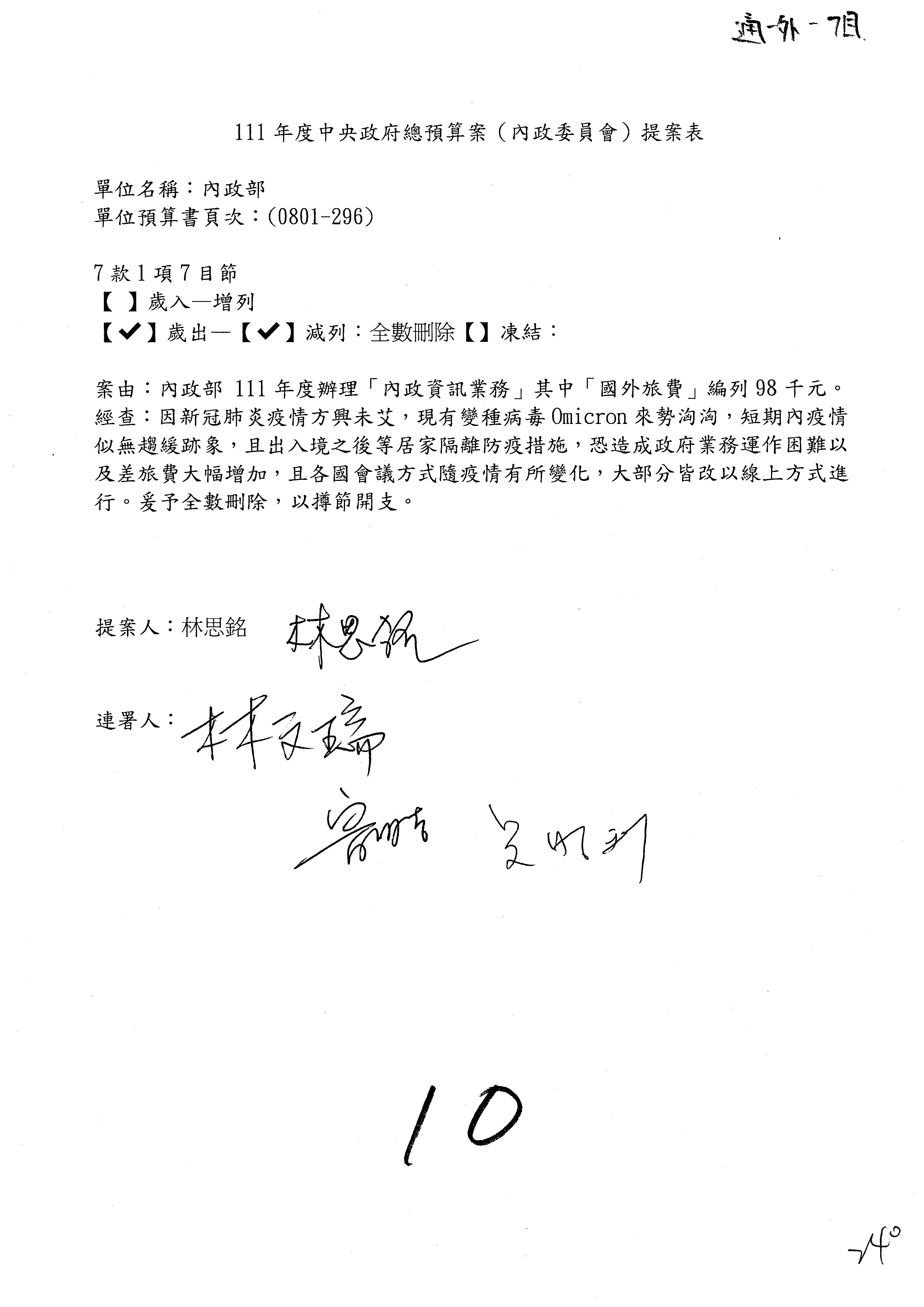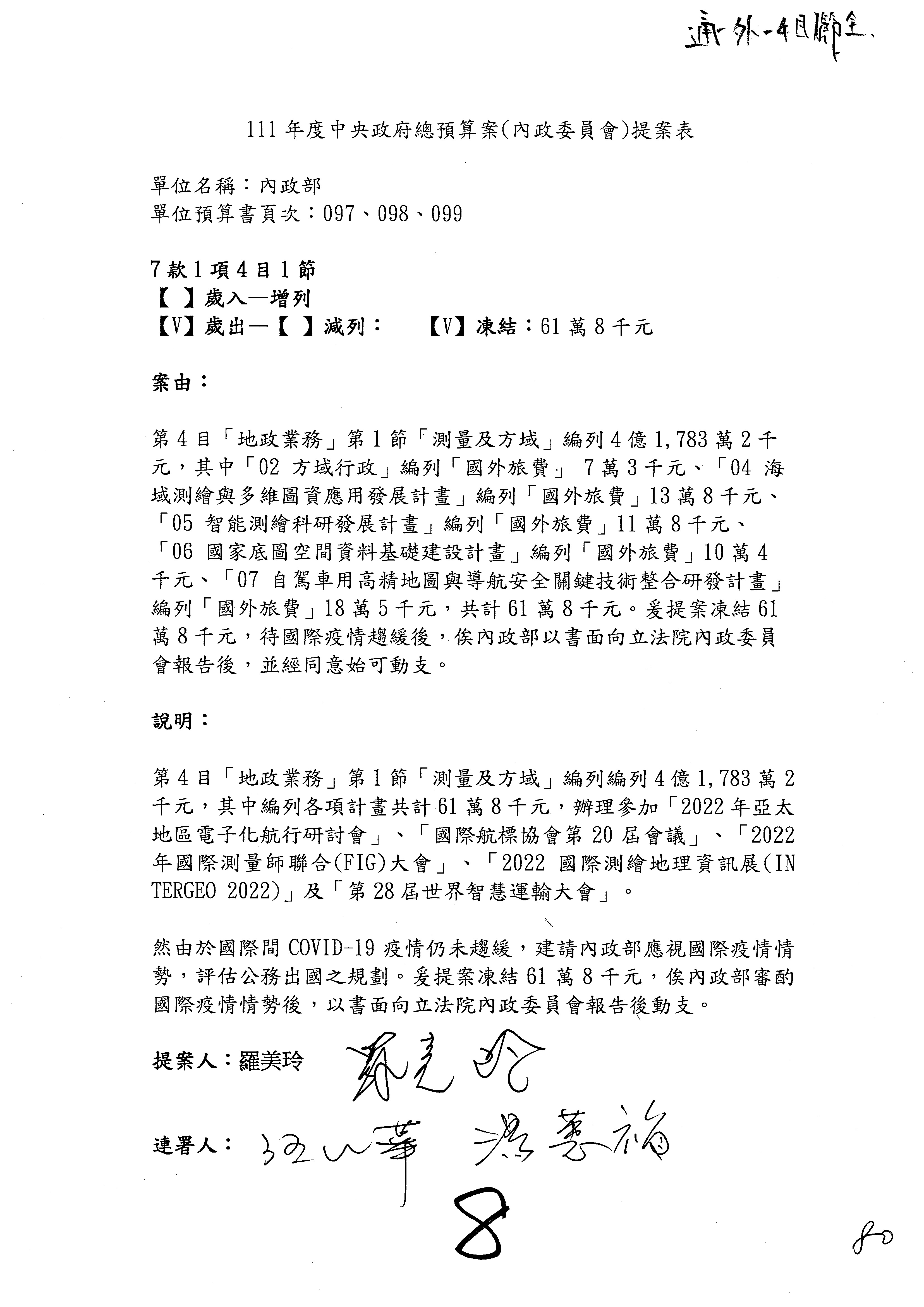 國外旅費第1案至第10案合併處理,第4案撤案,凍結20萬元,提出書面報告,其餘預算均照列。