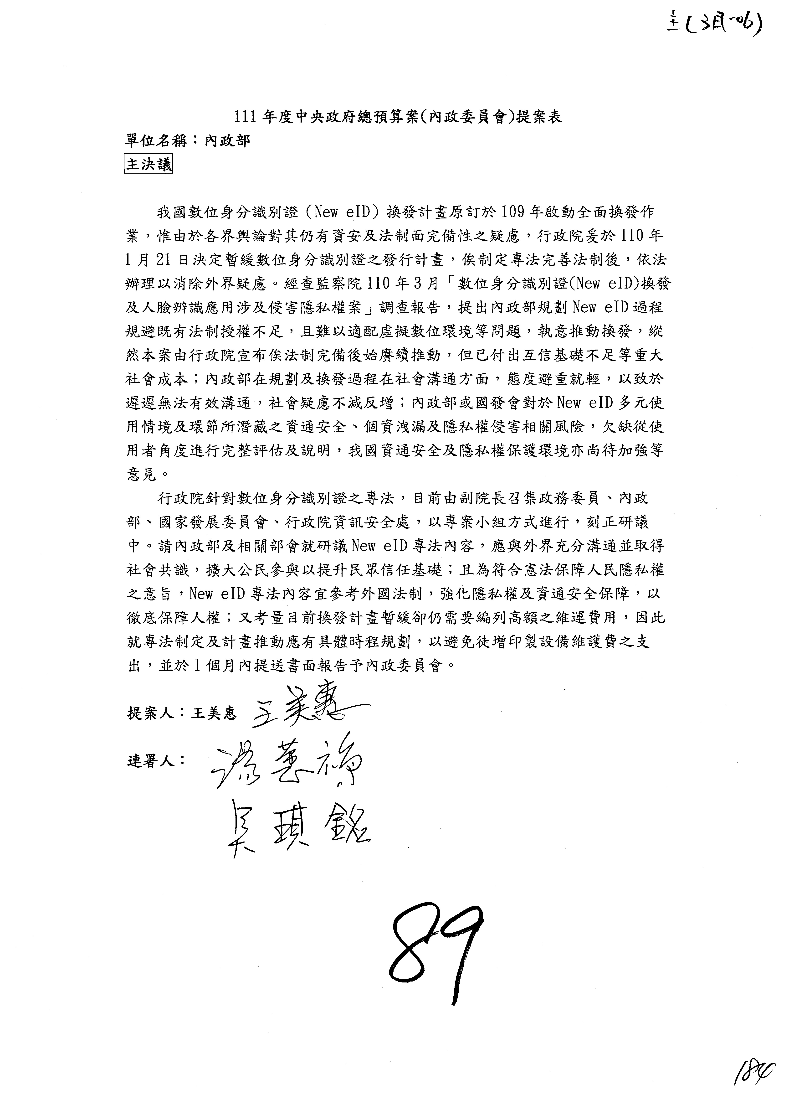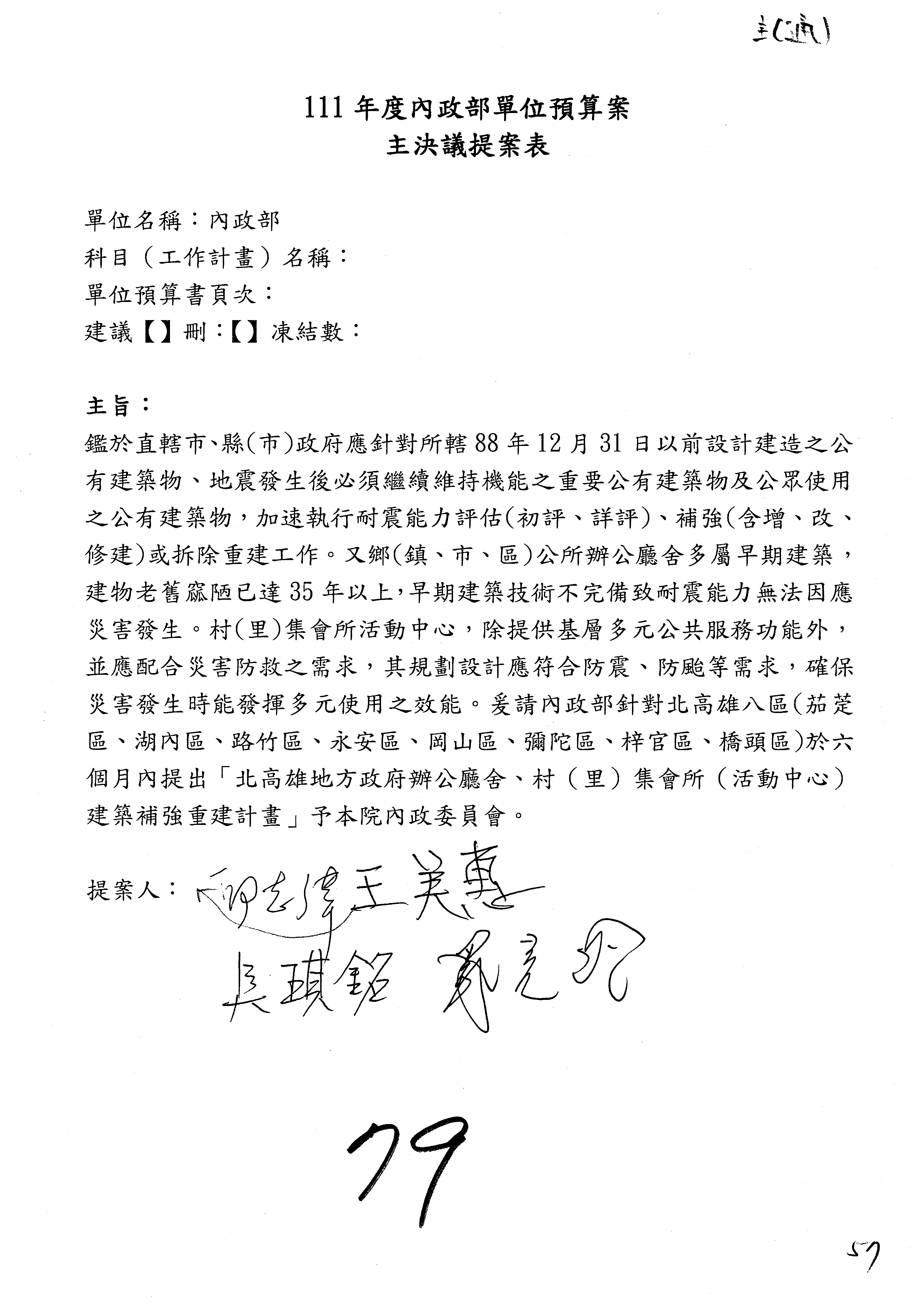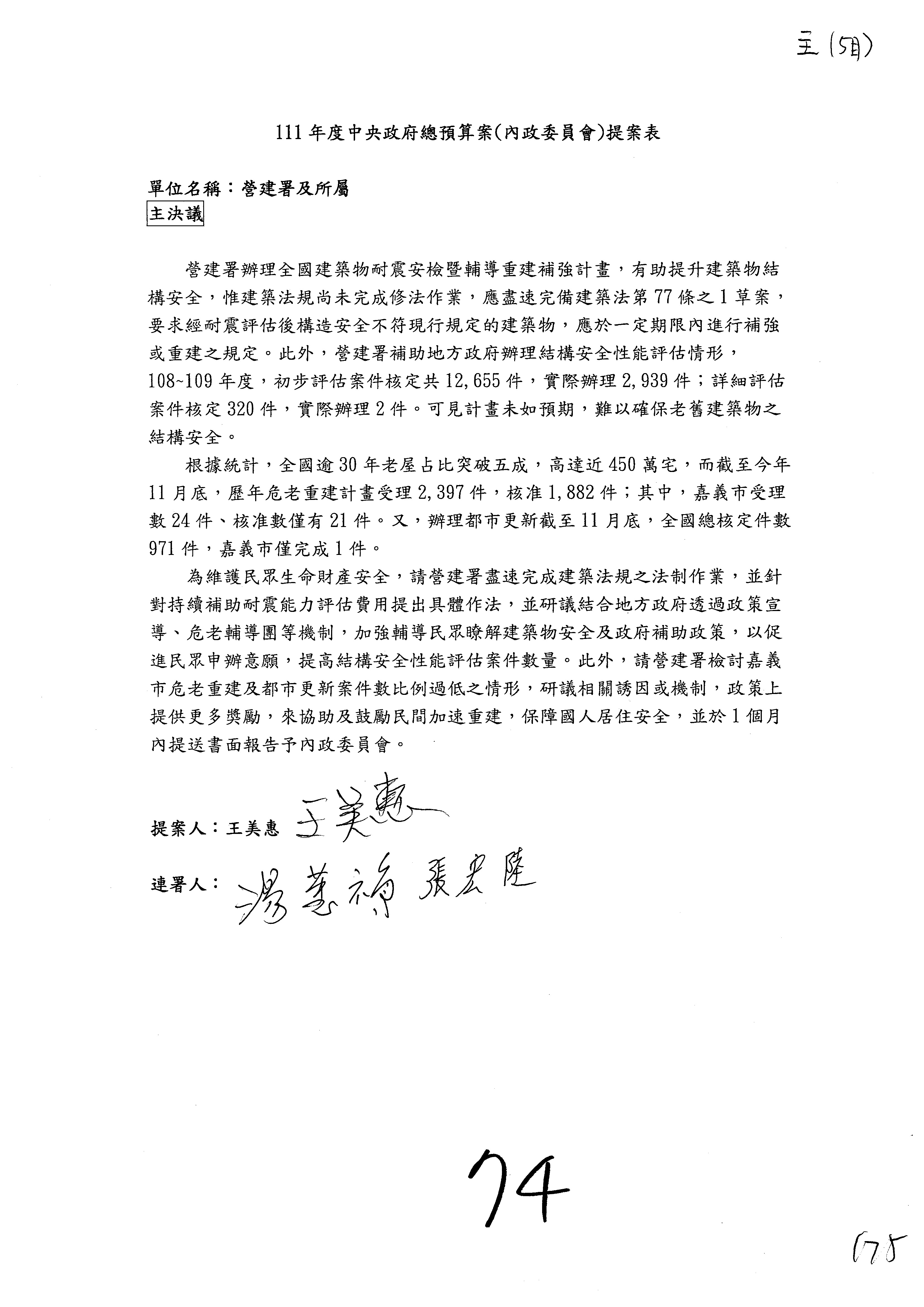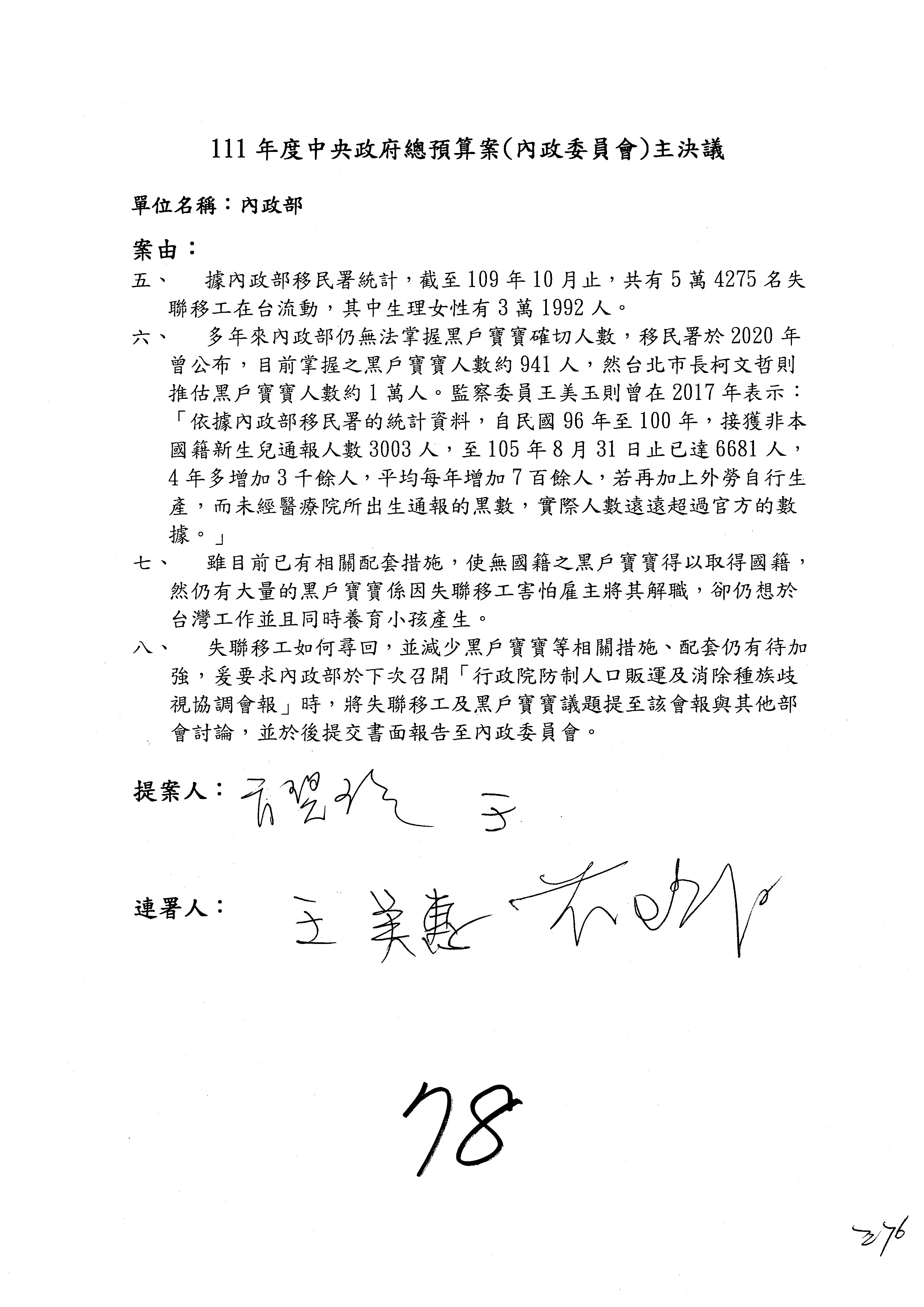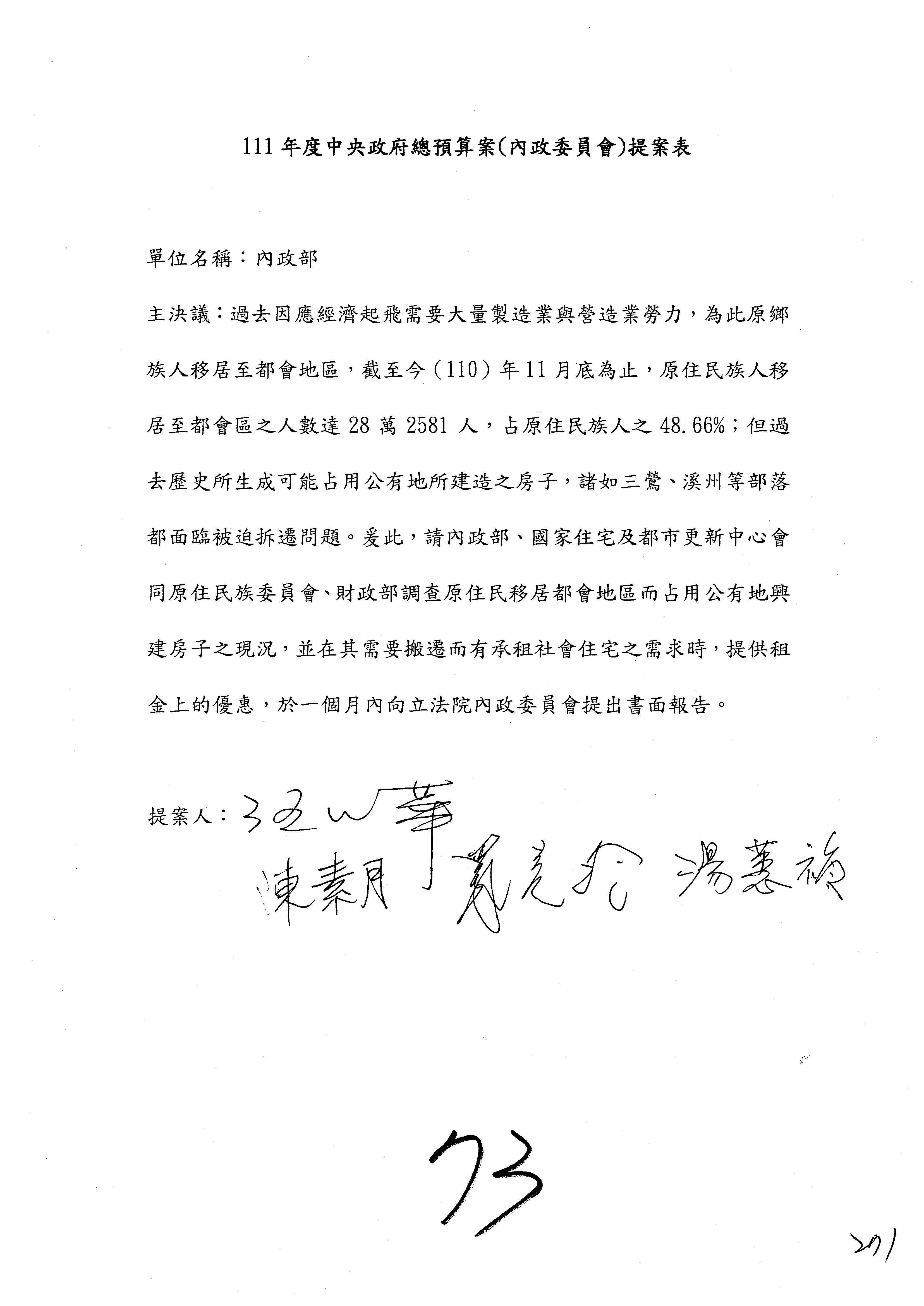 主決議修正部分:第73案倒數第二行末段修正為「請內政部就其弱勢條件提供社宅租金上的優惠,於三個月內向立法院內政委員會提出書面報告」;第74案第二段修正為「爰要求內政部營建署應協同經濟部依照再生水資源發展條例第四條,訂定臺灣用水大戶再生水使用比例辦法,及制定再生水交易、交換機制,以及妥為善用有限之水資源」;第75案倒數第四行「應參考日本、韓國……」等文字修正為「邀集地方政府同時依社會住宅『40%弱勢入住比例』保障之規定,研商落實照顧各縣市弱勢民眾居住需求」;第76案第三行修正為:「爰要求內政部全面清查各縣市老舊危險複合用途建築物及大樓,並邀集地方政府就建物管理……」,其餘文字照案通過;第77案除將第四段修正為「爰要求內政部加強給與移民署撰寫報告之相關資源,並請移民署針對撰寫首次國家報告、辦理國際審查及後續每4年提出1次報告事等之相關規劃,於3個月內提出書面報告」外,其餘文字照案通過;第78案第四段首句增列「移工權益如何保障、如何減少失聯移工及避免黑戶寶寶之產生」等文字,「失聯移工……有待加強」等文字予以刪除,其餘文字照案通過;第79案倒數第四行後段修正為「爰請內政部於一個月提供北高雄八區(茄萣區、湖內區、路竹區、永安區、岡山區、彌陀區、梓官區、橋頭區)申請公所辦公廳舍、村(里)集會所(活動中心)建築補強、補助情形之書面報告予立法院內政委員會」;第80案將「北高雄機關廳舍建築補強重建計畫」之「重建計畫」刪除,其後增加「書面報告」等文字,其餘文字照案通過;第81案末句修正為「於一個月內提出書面報告予立法院內政委員會」;第83案將倒數第三行後段「補助嘉義市」修正為「優先協助嘉義市」,並將「1個月」修正為「2個月」,其餘文字照案通過;第84案倒數第三行末句修正為「爰要求內政部參考健保恢復之方案,於1個月研議就疫情期間國人若出境逾2年戶籍遷出者,回國後仍享有投票權之可行性」,其餘文字照案通過;第88案倒數第三行末句修正為「請內政部就該部因應人口問題相關作為三個月內提出書面報告」,其餘文字照案通過;第90案第三行之後修正為「內政部111年度預算『內政資訊業務─數位身分識別證(New eID)─新一代國民身分證換發計畫』4,840萬元,有鑑於數位身分證將串連政府所有服務,為避免外界對於數位身分證在應用上存有資安及隱私保護疑慮,爰請內政部提出說明及改進之方案,並於三個月向立法院內政委員會提出書面報告」,其餘文字照案通過;第91案第三段末句修正為「於三個月內說明不動產市場指標之分析方向及所參考之數據來源,並說明未公開之原因」,其餘文字照案通過;第95案倒數第二行修正為「請內政部研議抵價地原則性50%之規定合宜性及土地徵收條例第三十九條第二項所稱特殊情況,保障民眾權益,內政部應於三個月內,針對上述事項,向內政委員會提出書面報告」;第89案將「1個月」修正為「3個月」。