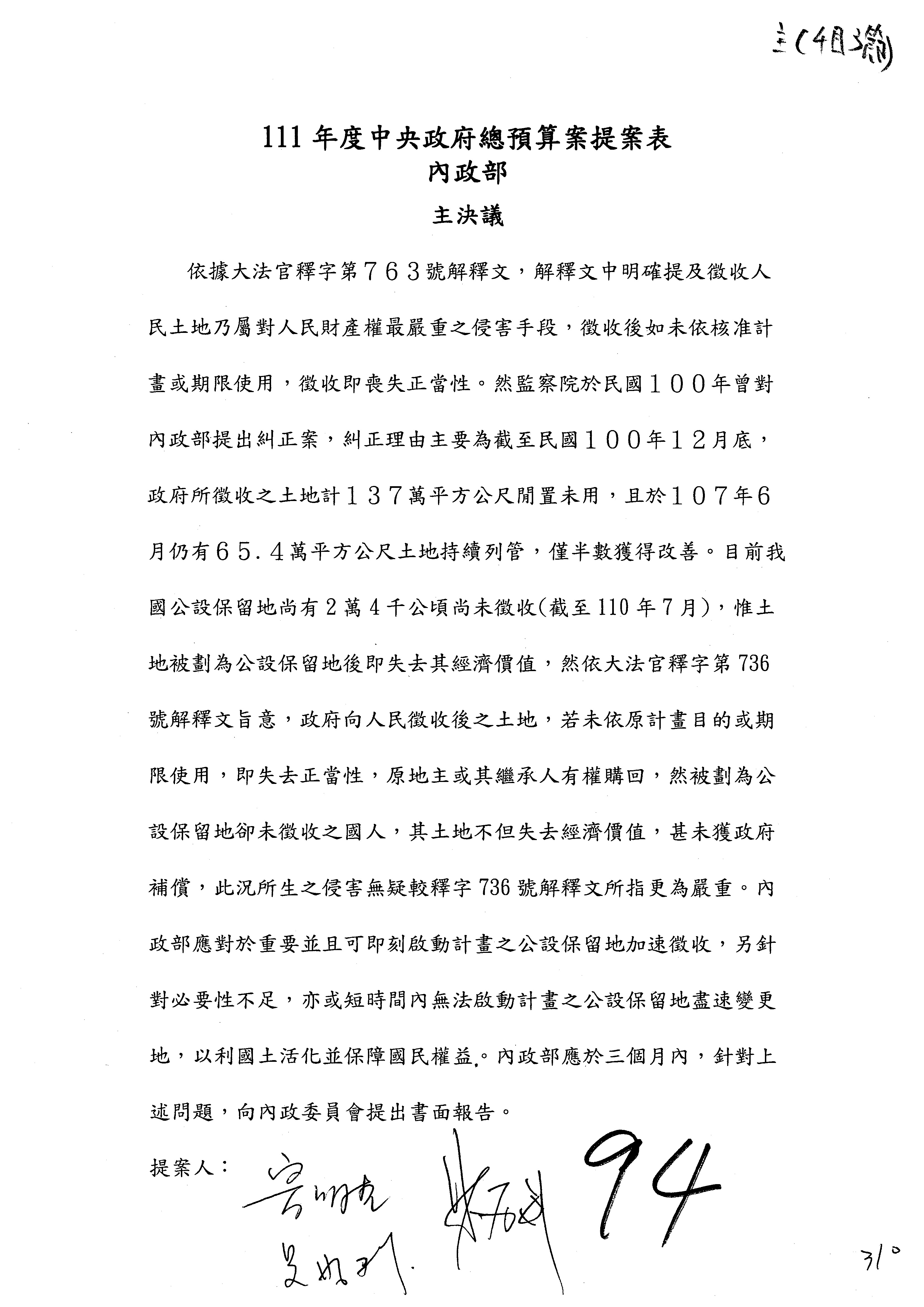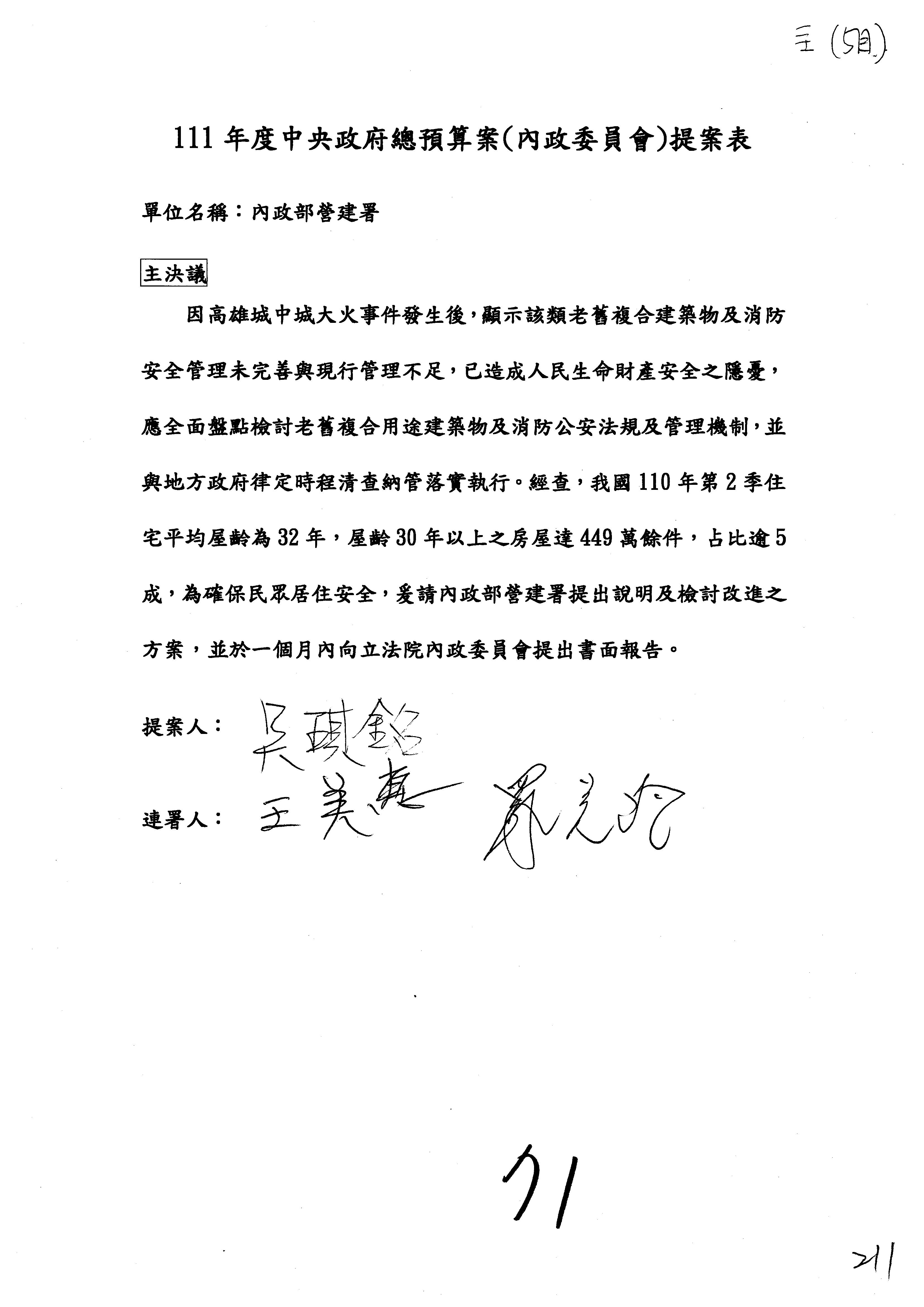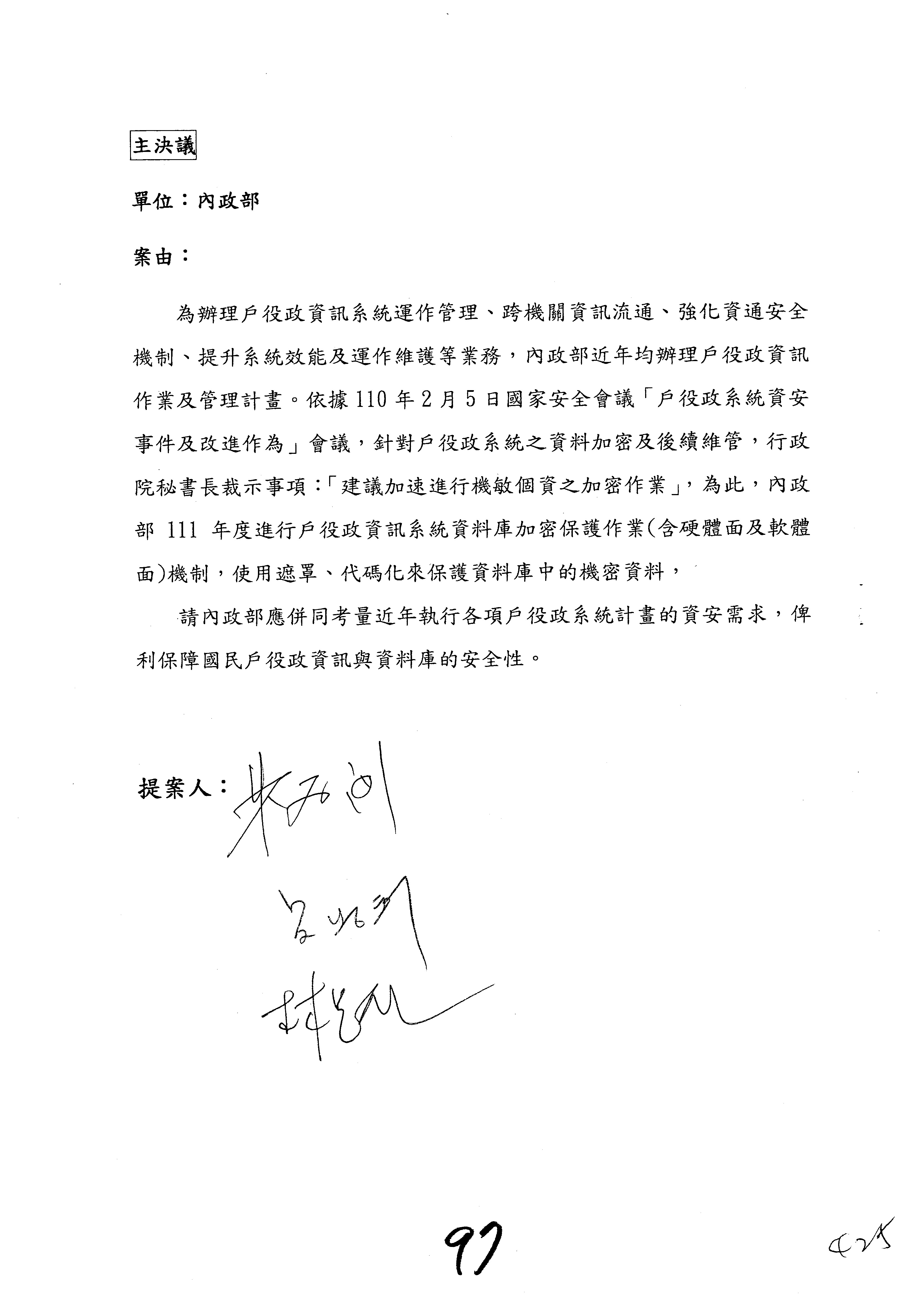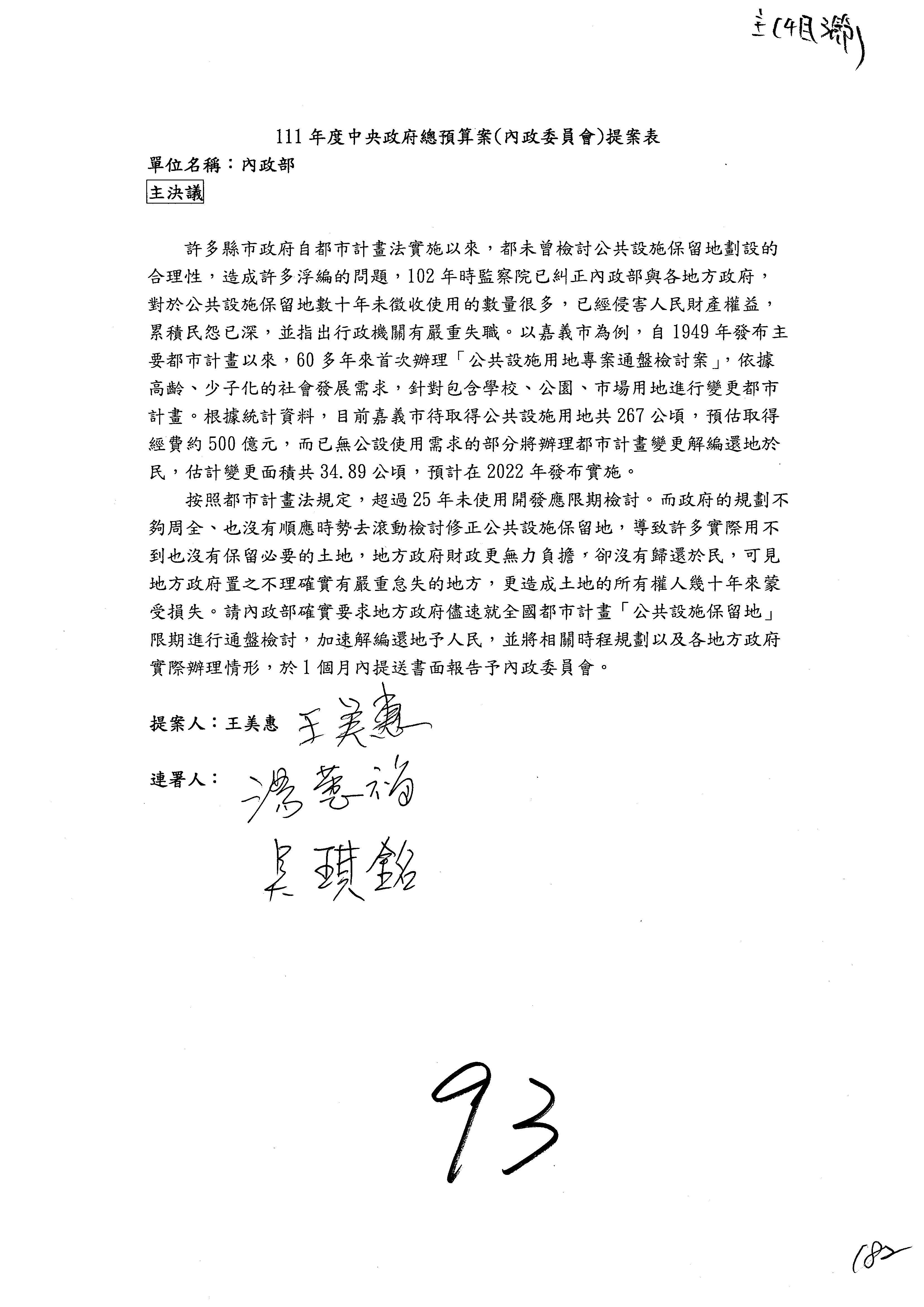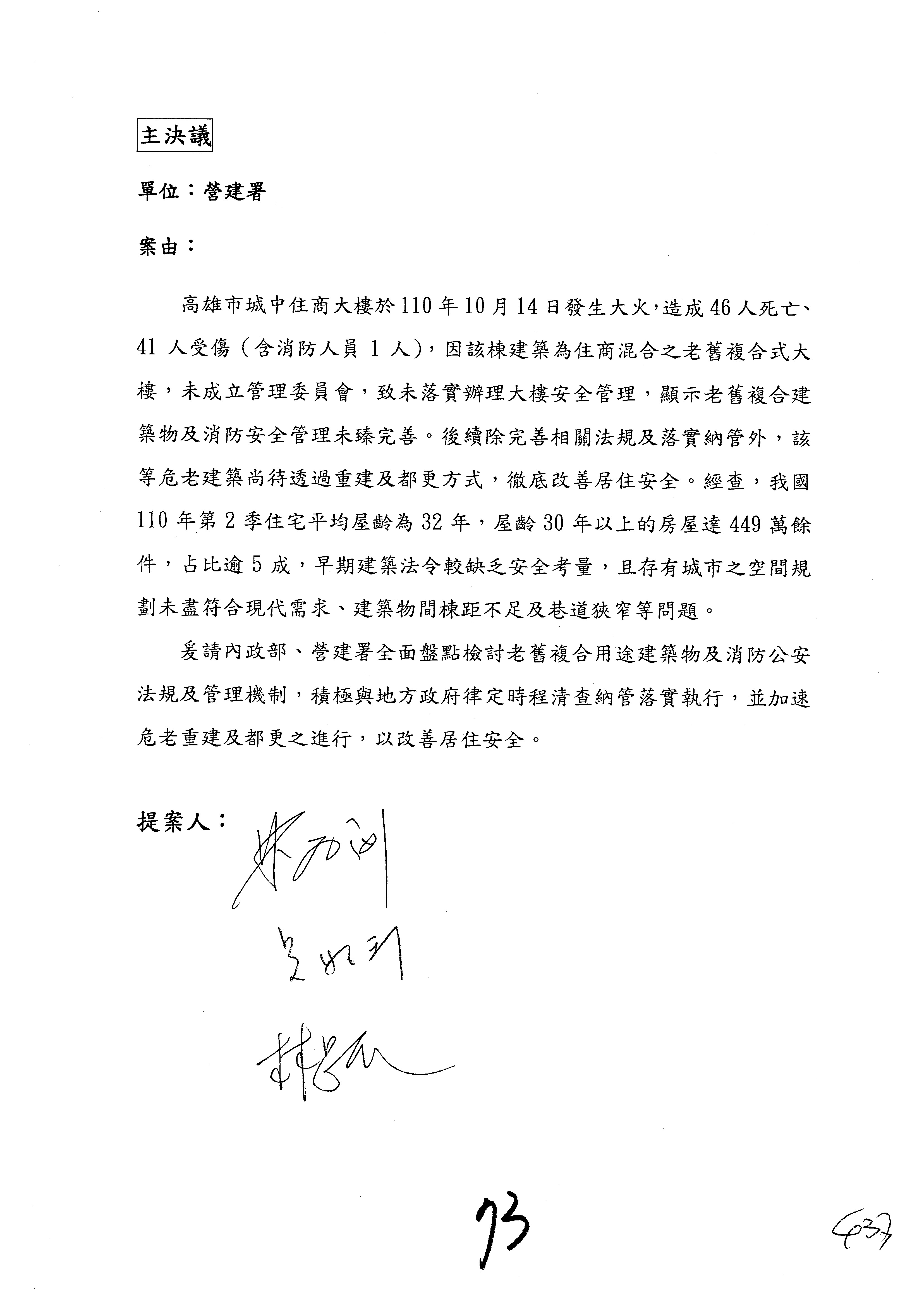 主決議修正部分:第73案倒數第二行末段修正為「請內政部就其弱勢條件提供社宅租金上的優惠,於三個月內向立法院內政委員會提出書面報告」;第74案第二段修正為「爰要求內政部營建署應協同經濟部依照再生水資源發展條例第四條,訂定臺灣用水大戶再生水使用比例辦法,及制定再生水交易、交換機制,以及妥為善用有限之水資源」;第75案倒數第四行「應參考日本、韓國……」等文字修正為「邀集地方政府同時依社會住宅『40%弱勢入住比例』保障之規定,研商落實照顧各縣市弱勢民眾居住需求」;第76案第三行修正為:「爰要求內政部全面清查各縣市老舊危險複合用途建築物及大樓,並邀集地方政府就建物管理……」,其餘文字照案通過;第77案除將第四段修正為「爰要求內政部加強給與移民署撰寫報告之相關資源,並請移民署針對撰寫首次國家報告、辦理國際審查及後續每4年提出1次報告事等之相關規劃,於3個月內提出書面報告」外,其餘文字照案通過;第78案第四段首句增列「移工權益如何保障、如何減少失聯移工及避免黑戶寶寶之產生」等文字,「失聯移工……有待加強」等文字予以刪除,其餘文字照案通過;第79案倒數第四行後段修正為「爰請內政部於一個月提供北高雄八區(茄萣區、湖內區、路竹區、永安區、岡山區、彌陀區、梓官區、橋頭區)申請公所辦公廳舍、村(里)集會所(活動中心)建築補強、補助情形之書面報告予立法院內政委員會」;第80案將「北高雄機關廳舍建築補強重建計畫」之「重建計畫」刪除,其後增加「書面報告」等文字,其餘文字照案通過;第81案末句修正為「於一個月內提出書面報告予立法院內政委員會」;第83案將倒數第三行後段「補助嘉義市」修正為「優先協助嘉義市」,並將「1個月」修正為「2個月」,其餘文字照案通過;第84案倒數第三行末句修正為「爰要求內政部參考健保恢復之方案,於1個月研議就疫情期間國人若出境逾2年戶籍遷出者,回國後仍享有投票權之可行性」,其餘文字照案通過;第88案倒數第三行末句修正為「請內政部就該部因應人口問題相關作為三個月內提出書面報告」,其餘文字照案通過;第90案第三行之後修正為「內政部111年度預算『內政資訊業務─數位身分識別證(New eID)─新一代國民身分證換發計畫』4,840萬元,有鑑於數位身分證將串連政府所有服務,為避免外界對於數位身分證在應用上存有資安及隱私保護疑慮,爰請內政部提出說明及改進之方案,並於三個月向立法院內政委員會提出書面報告」,其餘文字照案通過;第91案第三段末句修正為「於三個月內說明不動產市場指標之分析方向及所參考之數據來源,並說明未公開之原因」,其餘文字照案通過;第95案倒數第二行修正為「請內政部研議抵價地原則性50%之規定合宜性及土地徵收條例第三十九條第二項所稱特殊情況,保障民眾權益,內政部應於三個月內,針對上述事項,向內政委員會提出書面報告」;第89案將「1個月」修正為「3個月」。