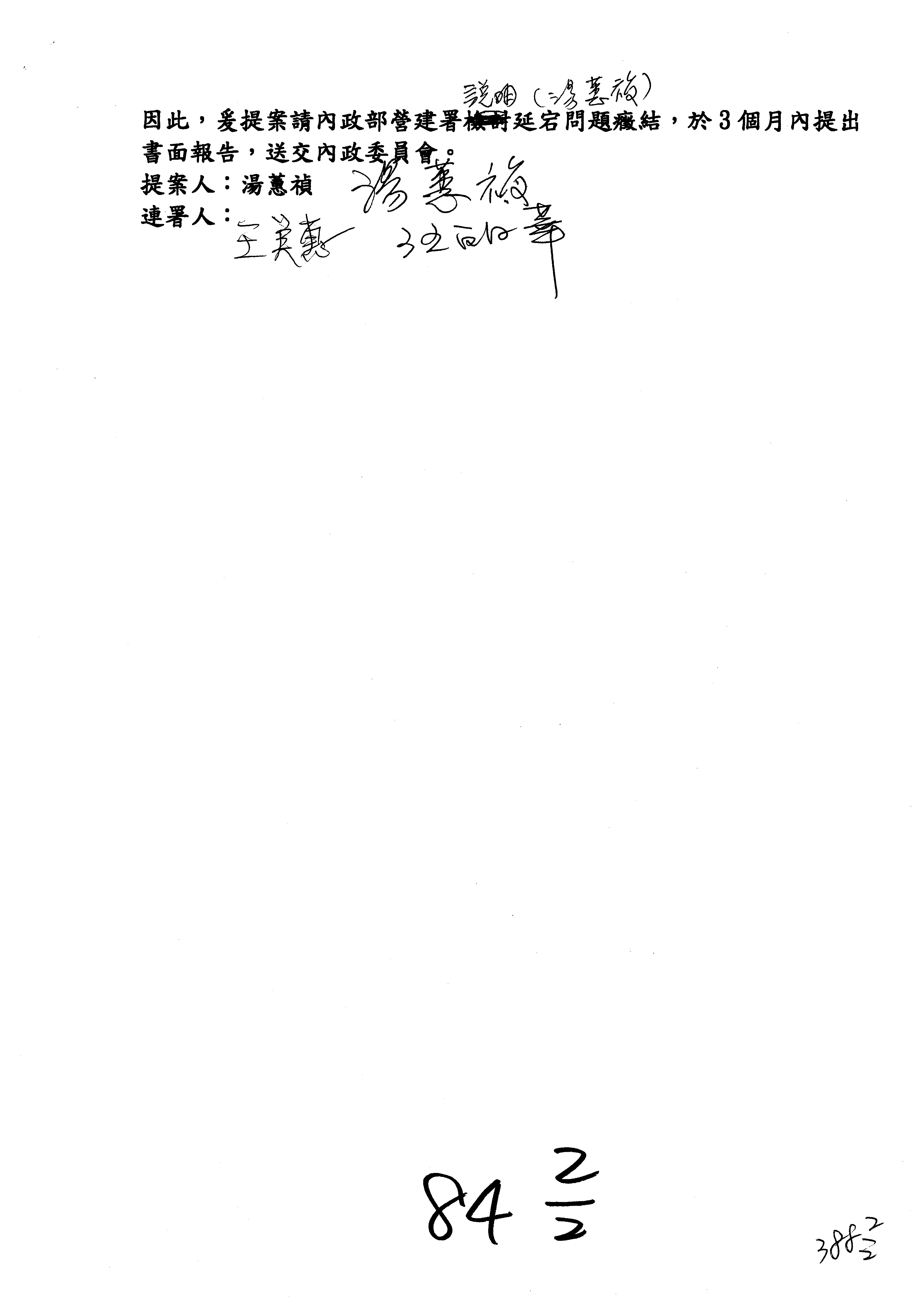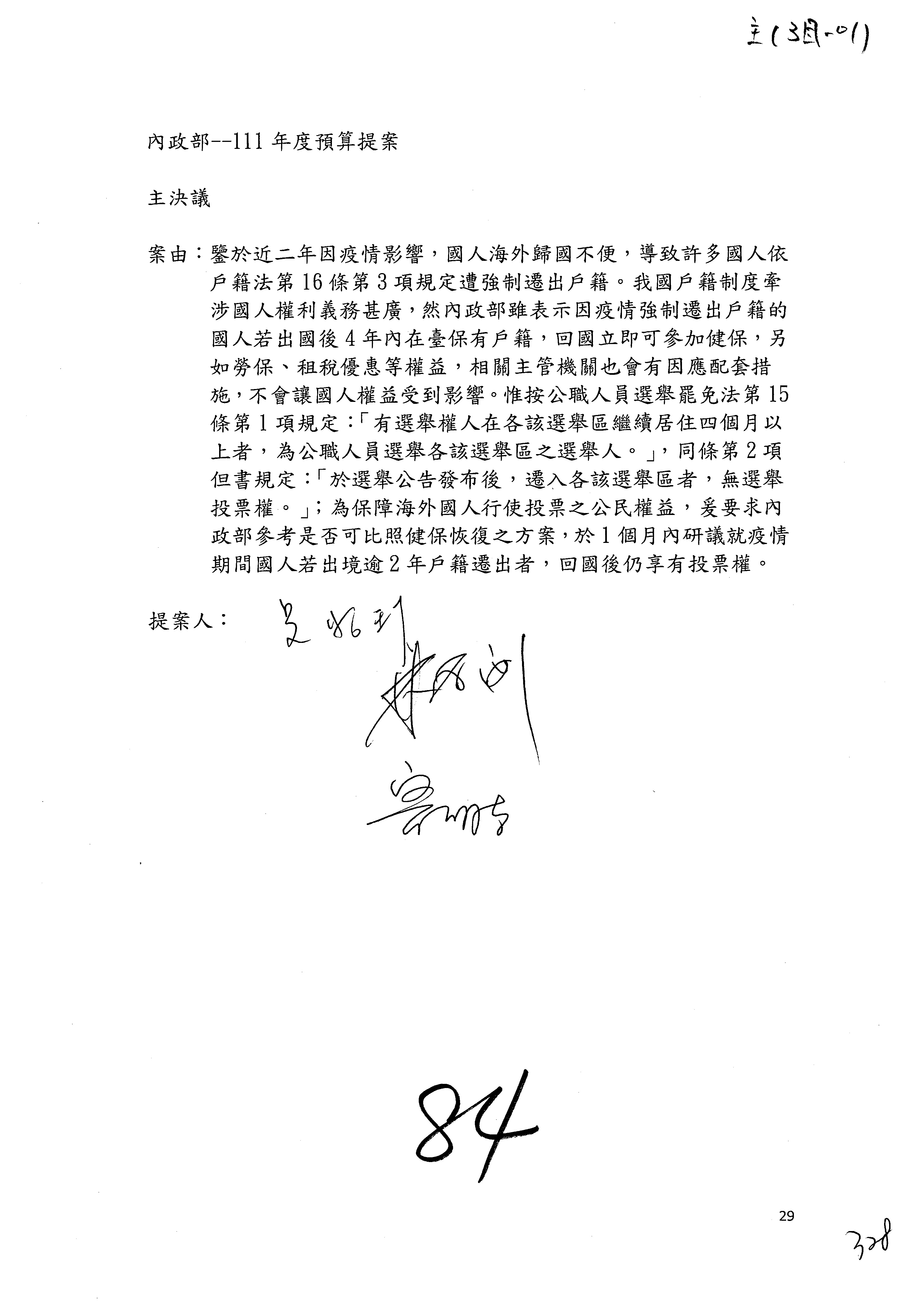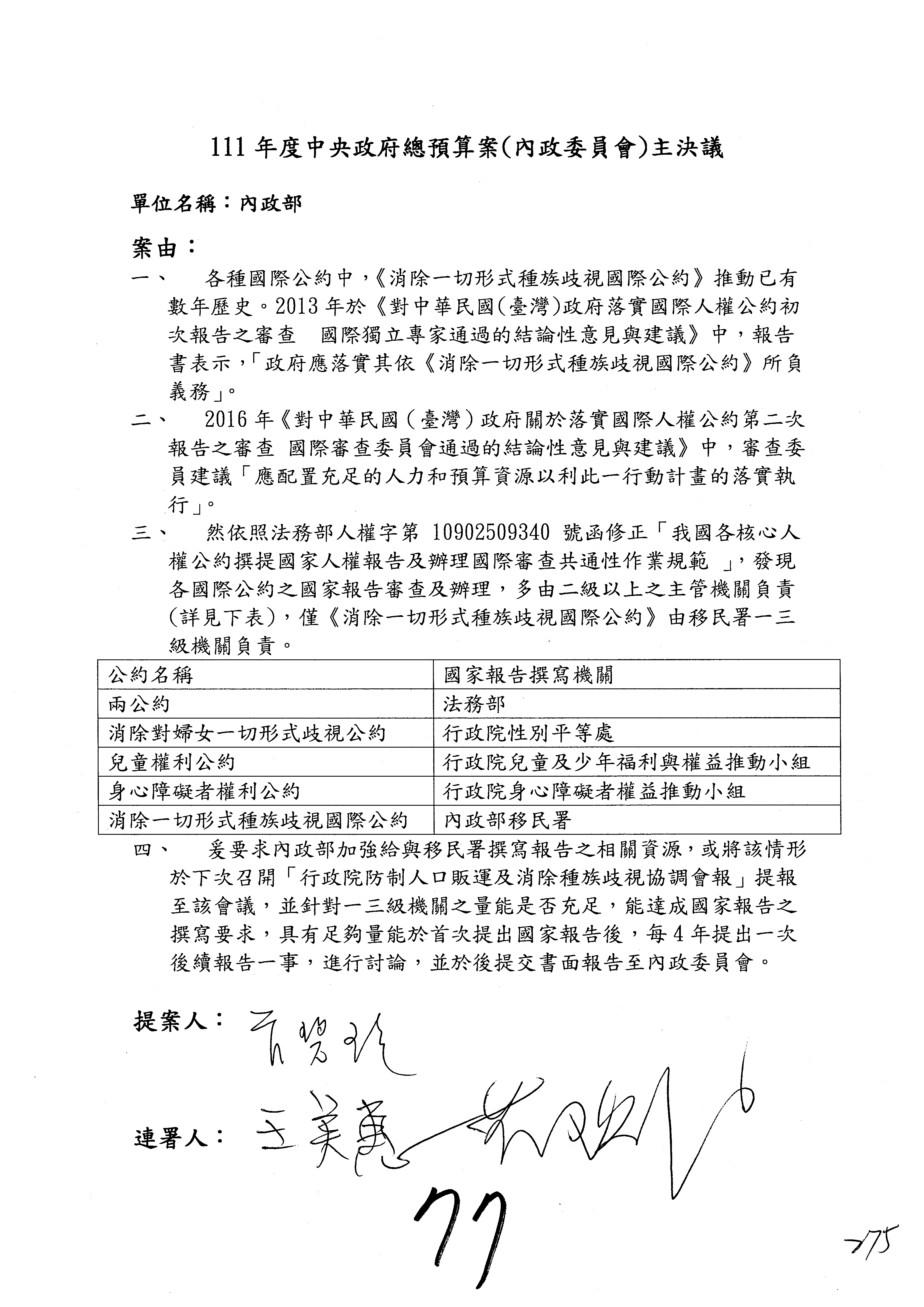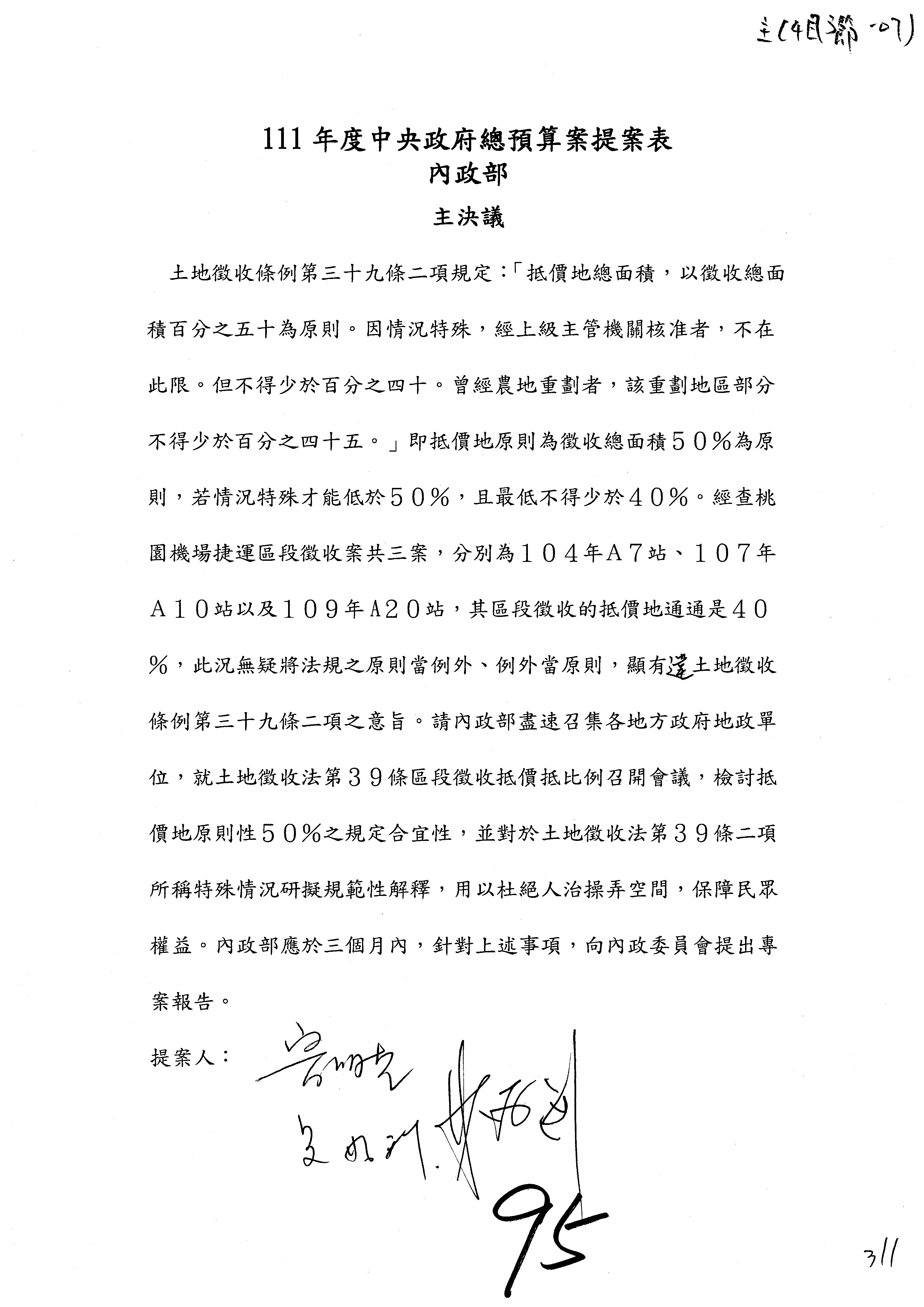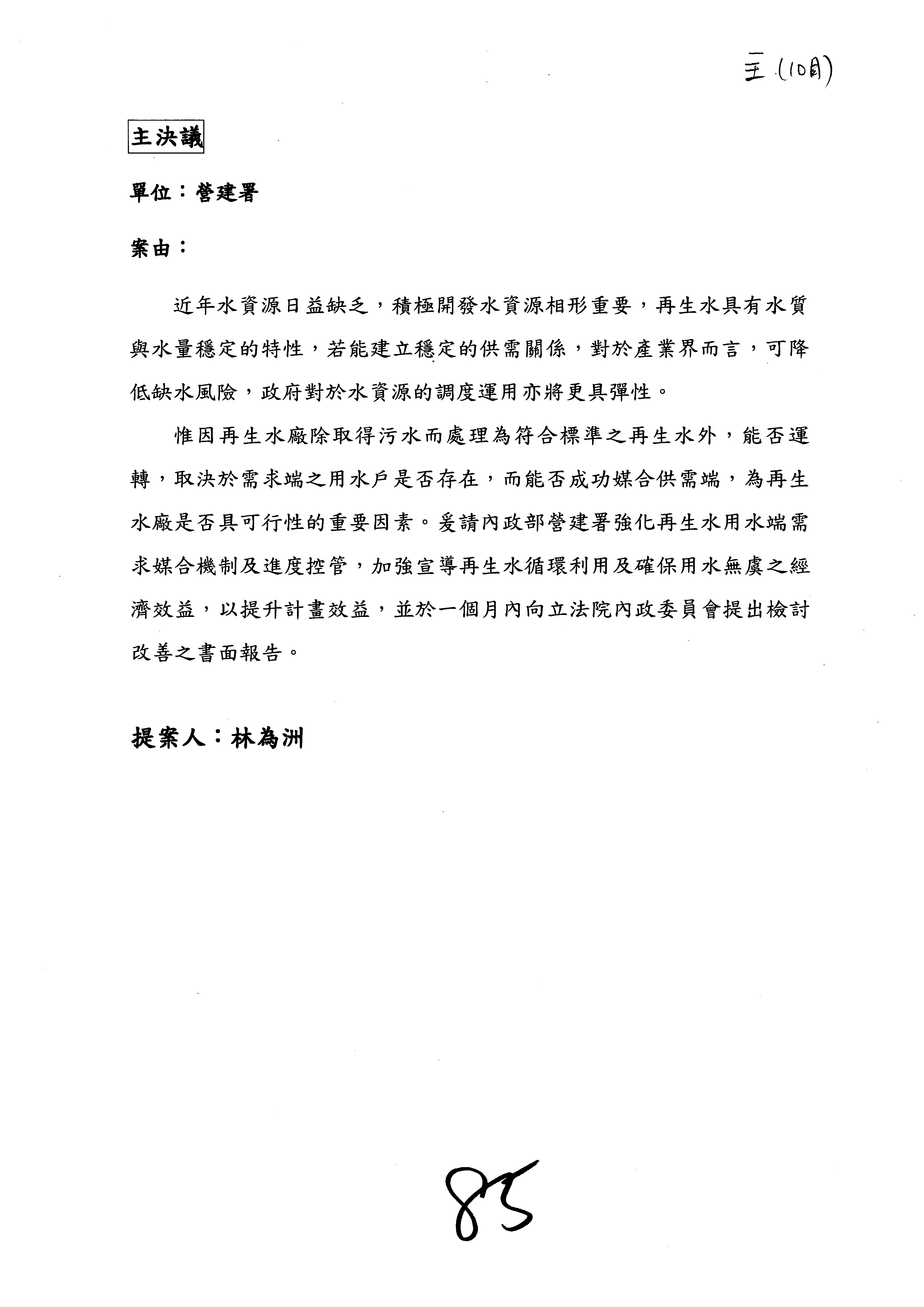 主決議修正部分:第73案倒數第二行末段修正為「請內政部就其弱勢條件提供社宅租金上的優惠,於三個月內向立法院內政委員會提出書面報告」;第74案第二段修正為「爰要求內政部營建署應協同經濟部依照再生水資源發展條例第四條,訂定臺灣用水大戶再生水使用比例辦法,及制定再生水交易、交換機制,以及妥為善用有限之水資源」;第75案倒數第四行「應參考日本、韓國……」等文字修正為「邀集地方政府同時依社會住宅『40%弱勢入住比例』保障之規定,研商落實照顧各縣市弱勢民眾居住需求」;第76案第三行修正為:「爰要求內政部全面清查各縣市老舊危險複合用途建築物及大樓,並邀集地方政府就建物管理……」,其餘文字照案通過;第77案除將第四段修正為「爰要求內政部加強給與移民署撰寫報告之相關資源,並請移民署針對撰寫首次國家報告、辦理國際審查及後續每4年提出1次報告事等之相關規劃,於3個月內提出書面報告」外,其餘文字照案通過;第78案第四段首句增列「移工權益如何保障、如何減少失聯移工及避免黑戶寶寶之產生」等文字,「失聯移工……有待加強」等文字予以刪除,其餘文字照案通過;第79案倒數第四行後段修正為「爰請內政部於一個月提供北高雄八區(茄萣區、湖內區、路竹區、永安區、岡山區、彌陀區、梓官區、橋頭區)申請公所辦公廳舍、村(里)集會所(活動中心)建築補強、補助情形之書面報告予立法院內政委員會」;第80案將「北高雄機關廳舍建築補強重建計畫」之「重建計畫」刪除,其後增加「書面報告」等文字,其餘文字照案通過;第81案末句修正為「於一個月內提出書面報告予立法院內政委員會」;第83案將倒數第三行後段「補助嘉義市」修正為「優先協助嘉義市」,並將「1個月」修正為「2個月」,其餘文字照案通過;第84案倒數第三行末句修正為「爰要求內政部參考健保恢復之方案,於1個月研議就疫情期間國人若出境逾2年戶籍遷出者,回國後仍享有投票權之可行性」,其餘文字照案通過;第88案倒數第三行末句修正為「請內政部就該部因應人口問題相關作為三個月內提出書面報告」,其餘文字照案通過;第90案第三行之後修正為「內政部111年度預算『內政資訊業務─數位身分識別證(New eID)─新一代國民身分證換發計畫』4,840萬元,有鑑於數位身分證將串連政府所有服務,為避免外界對於數位身分證在應用上存有資安及隱私保護疑慮,爰請內政部提出說明及改進之方案,並於三個月向立法院內政委員會提出書面報告」,其餘文字照案通過;第91案第三段末句修正為「於三個月內說明不動產市場指標之分析方向及所參考之數據來源,並說明未公開之原因」,其餘文字照案通過;第95案倒數第二行修正為「請內政部研議抵價地原則性50%之規定合宜性及土地徵收條例第三十九條第二項所稱特殊情況,保障民眾權益,內政部應於三個月內,針對上述事項,向內政委員會提出書面報告」;第89案將「1個月」修正為「3個月」。