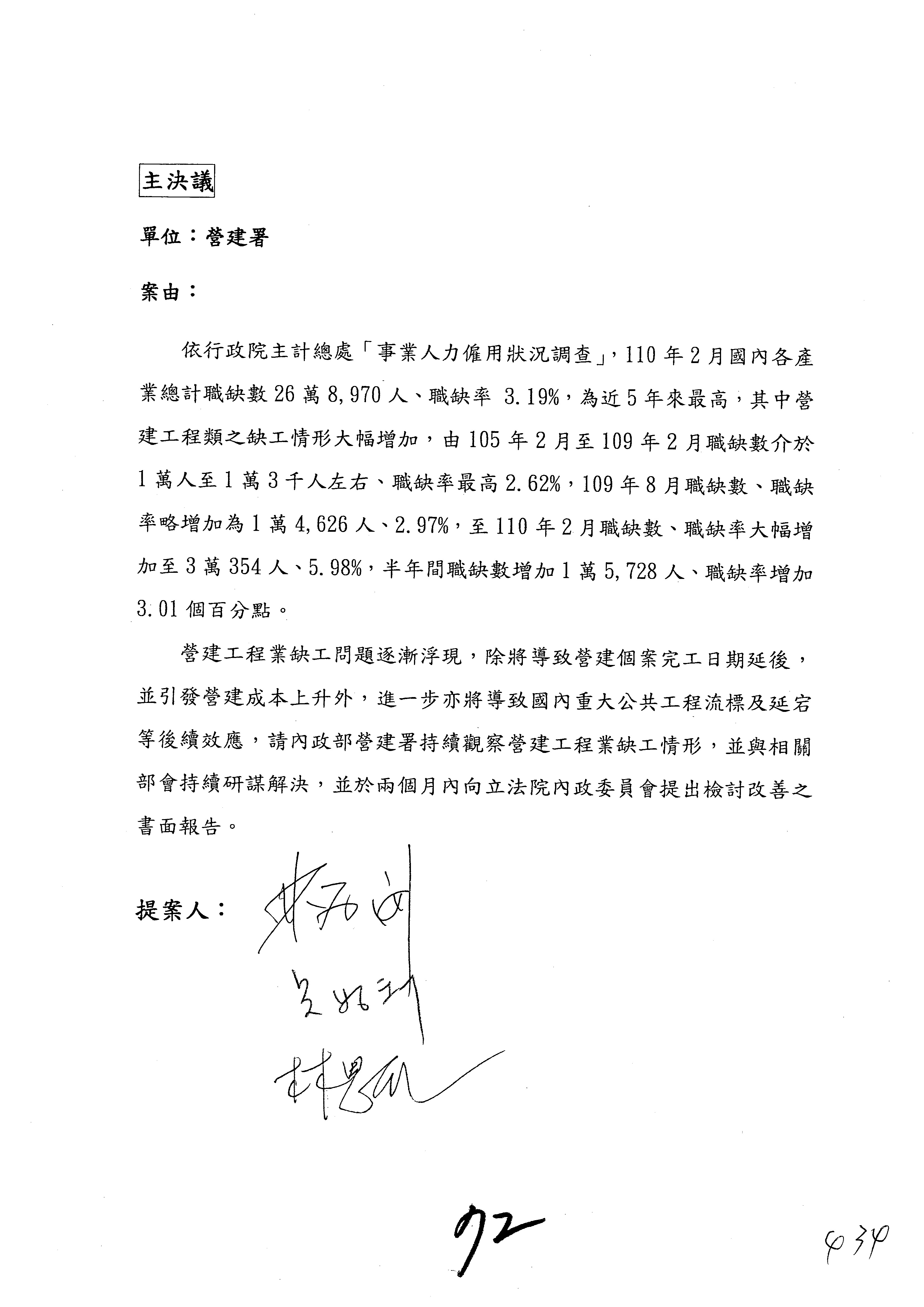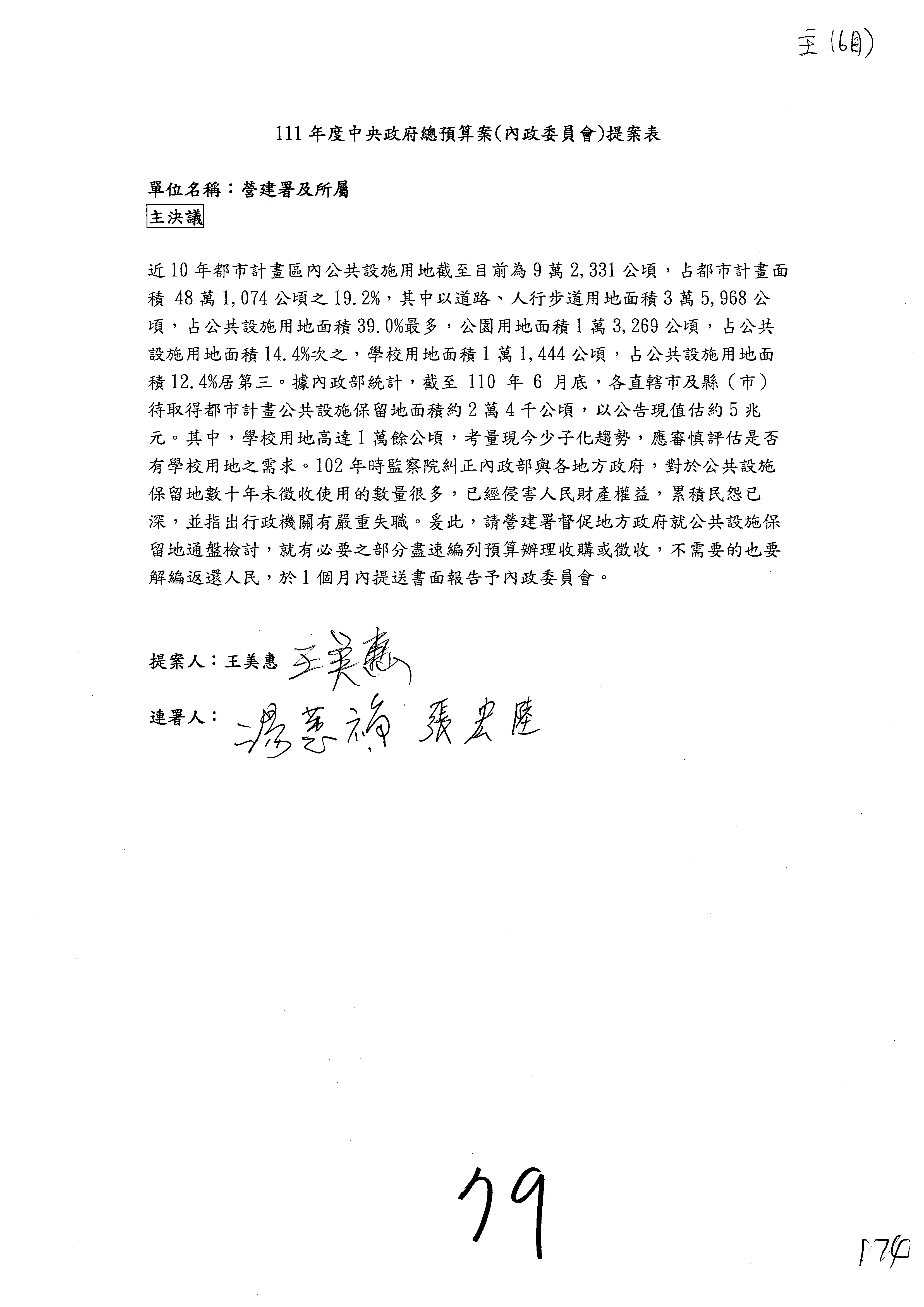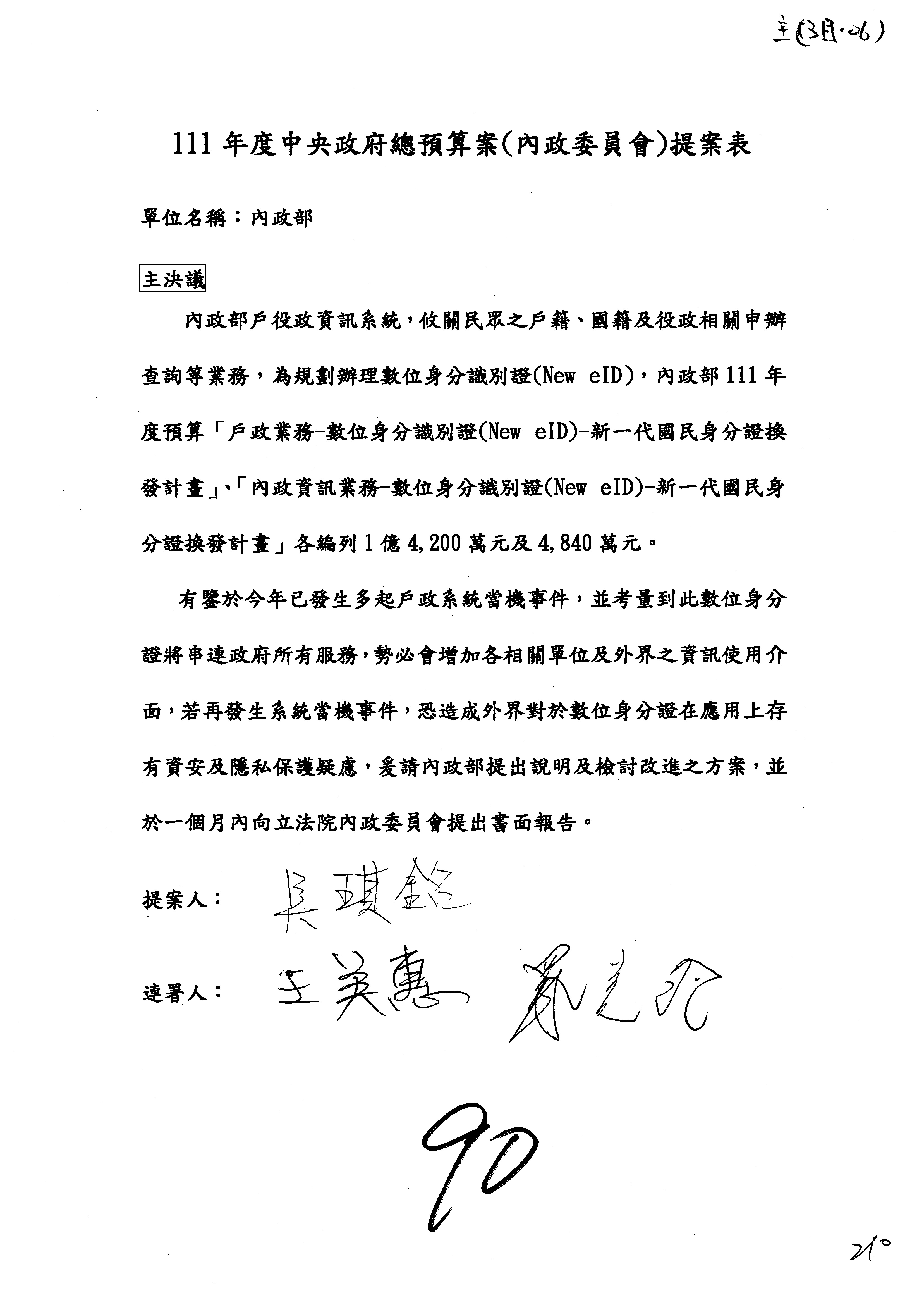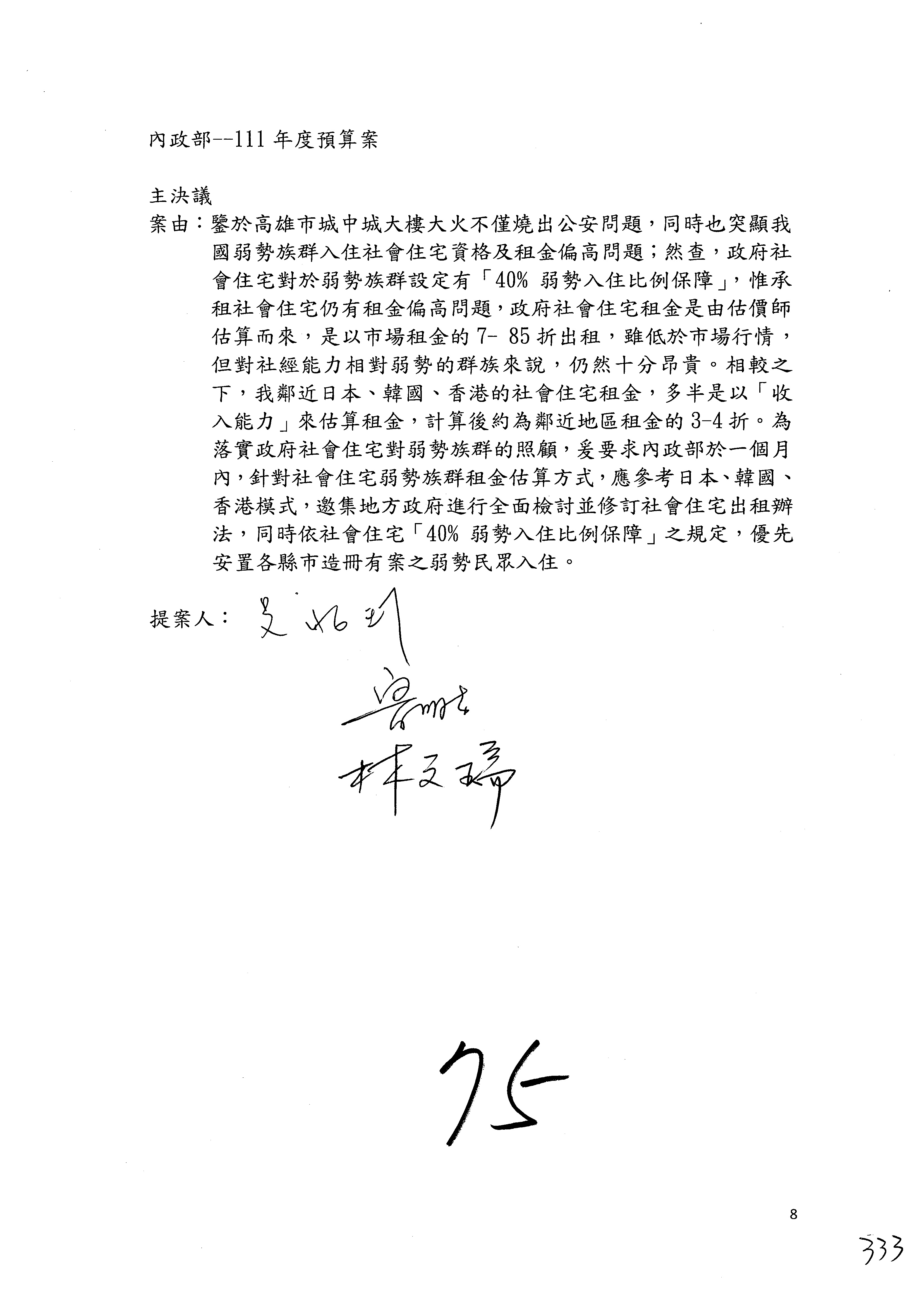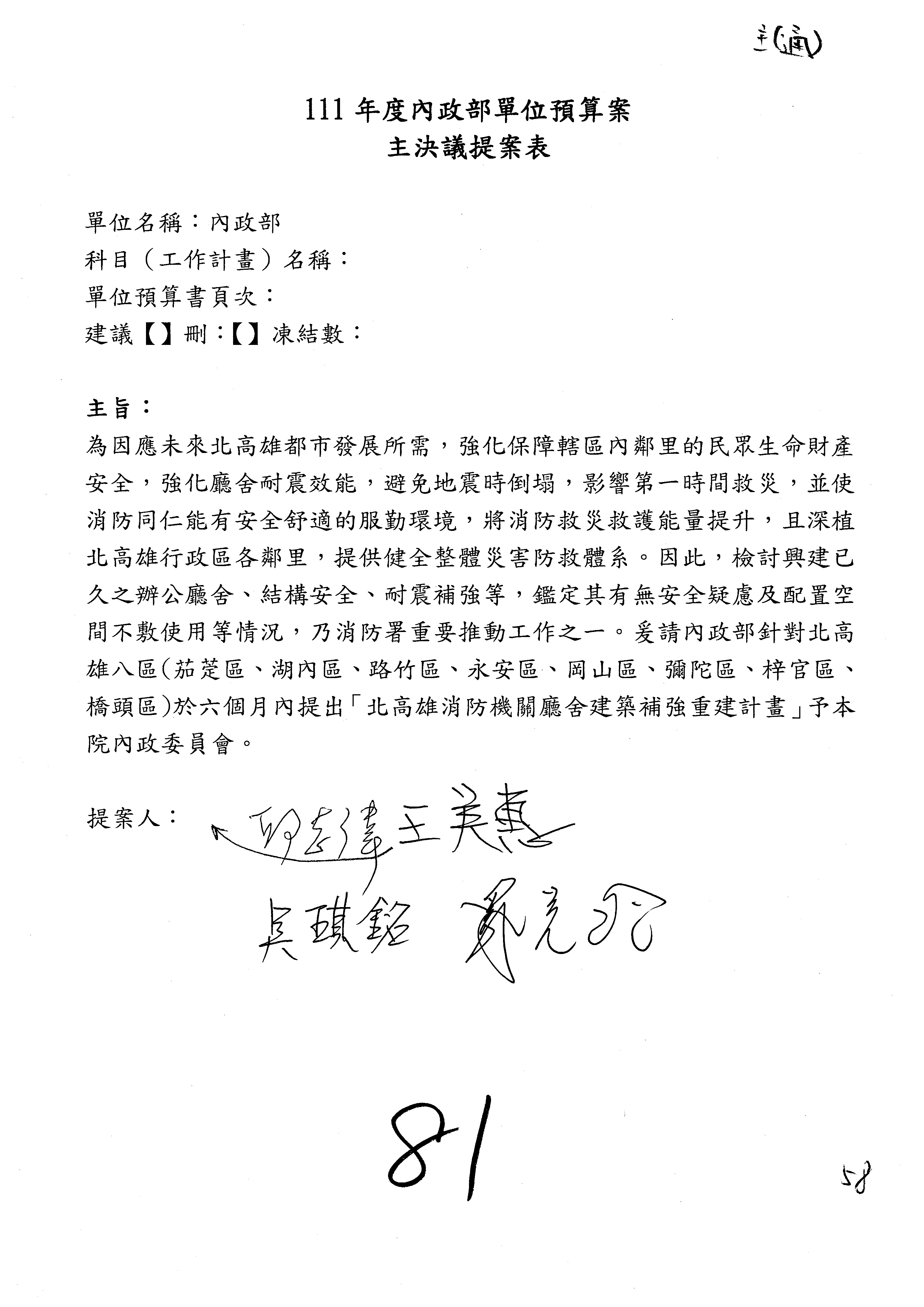 主決議修正部分:第73案倒數第二行末段修正為「請內政部就其弱勢條件提供社宅租金上的優惠,於三個月內向立法院內政委員會提出書面報告」;第74案第二段修正為「爰要求內政部營建署應協同經濟部依照再生水資源發展條例第四條,訂定臺灣用水大戶再生水使用比例辦法,及制定再生水交易、交換機制,以及妥為善用有限之水資源」;第75案倒數第四行「應參考日本、韓國……」等文字修正為「邀集地方政府同時依社會住宅『40%弱勢入住比例』保障之規定,研商落實照顧各縣市弱勢民眾居住需求」;第76案第三行修正為:「爰要求內政部全面清查各縣市老舊危險複合用途建築物及大樓,並邀集地方政府就建物管理……」,其餘文字照案通過;第77案除將第四段修正為「爰要求內政部加強給與移民署撰寫報告之相關資源,並請移民署針對撰寫首次國家報告、辦理國際審查及後續每4年提出1次報告事等之相關規劃,於3個月內提出書面報告」外,其餘文字照案通過;第78案第四段首句增列「移工權益如何保障、如何減少失聯移工及避免黑戶寶寶之產生」等文字,「失聯移工……有待加強」等文字予以刪除,其餘文字照案通過;第79案倒數第四行後段修正為「爰請內政部於一個月提供北高雄八區(茄萣區、湖內區、路竹區、永安區、岡山區、彌陀區、梓官區、橋頭區)申請公所辦公廳舍、村(里)集會所(活動中心)建築補強、補助情形之書面報告予立法院內政委員會」;第80案將「北高雄機關廳舍建築補強重建計畫」之「重建計畫」刪除,其後增加「書面報告」等文字,其餘文字照案通過;第81案末句修正為「於一個月內提出書面報告予立法院內政委員會」;第83案將倒數第三行後段「補助嘉義市」修正為「優先協助嘉義市」,並將「1個月」修正為「2個月」,其餘文字照案通過;第84案倒數第三行末句修正為「爰要求內政部參考健保恢復之方案,於1個月研議就疫情期間國人若出境逾2年戶籍遷出者,回國後仍享有投票權之可行性」,其餘文字照案通過;第88案倒數第三行末句修正為「請內政部就該部因應人口問題相關作為三個月內提出書面報告」,其餘文字照案通過;第90案第三行之後修正為「內政部111年度預算『內政資訊業務─數位身分識別證(New eID)─新一代國民身分證換發計畫』4,840萬元,有鑑於數位身分證將串連政府所有服務,為避免外界對於數位身分證在應用上存有資安及隱私保護疑慮,爰請內政部提出說明及改進之方案,並於三個月向立法院內政委員會提出書面報告」,其餘文字照案通過;第91案第三段末句修正為「於三個月內說明不動產市場指標之分析方向及所參考之數據來源,並說明未公開之原因」,其餘文字照案通過;第95案倒數第二行修正為「請內政部研議抵價地原則性50%之規定合宜性及土地徵收條例第三十九條第二項所稱特殊情況,保障民眾權益,內政部應於三個月內,針對上述事項,向內政委員會提出書面報告」;第89案將「1個月」修正為「3個月」。