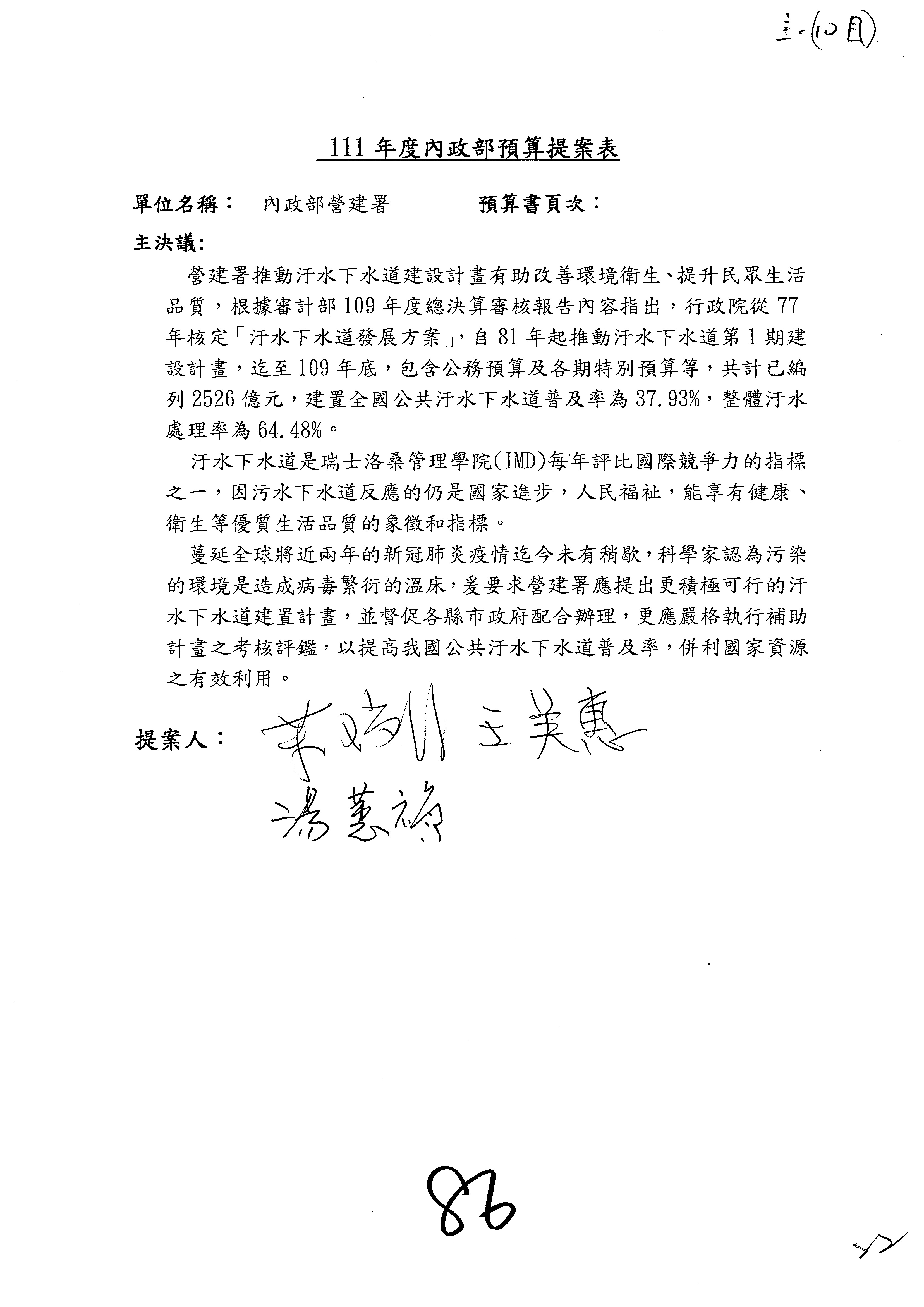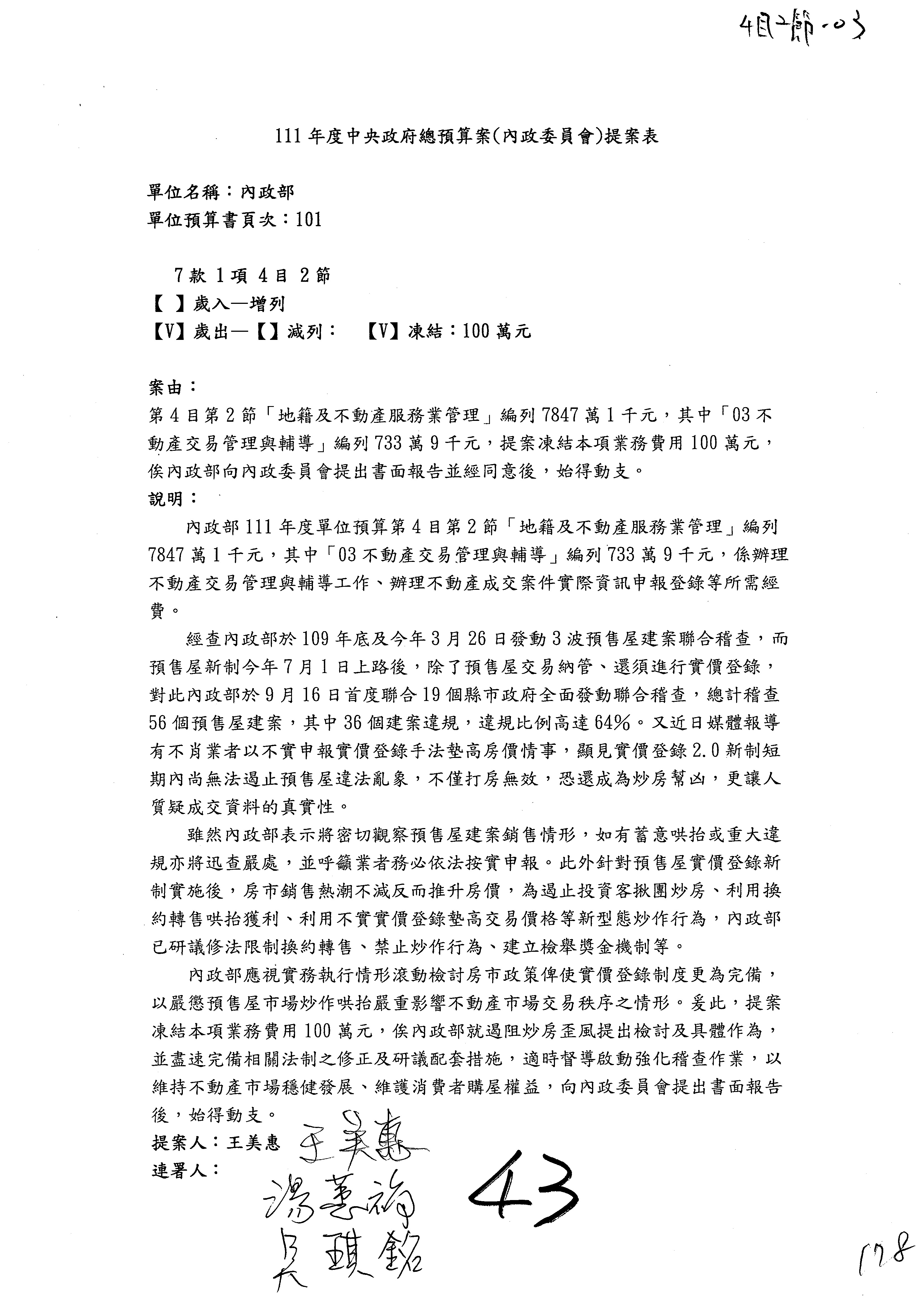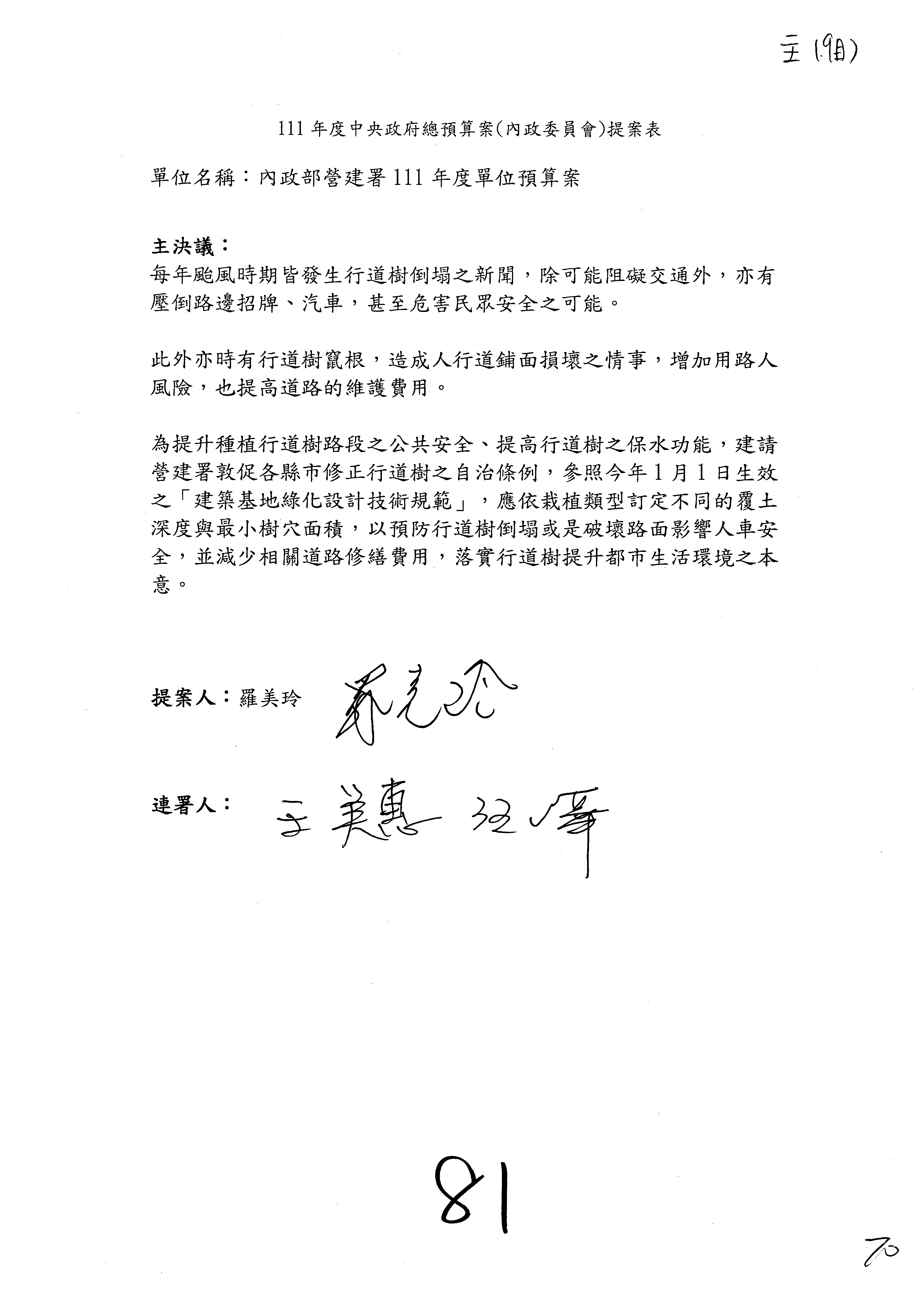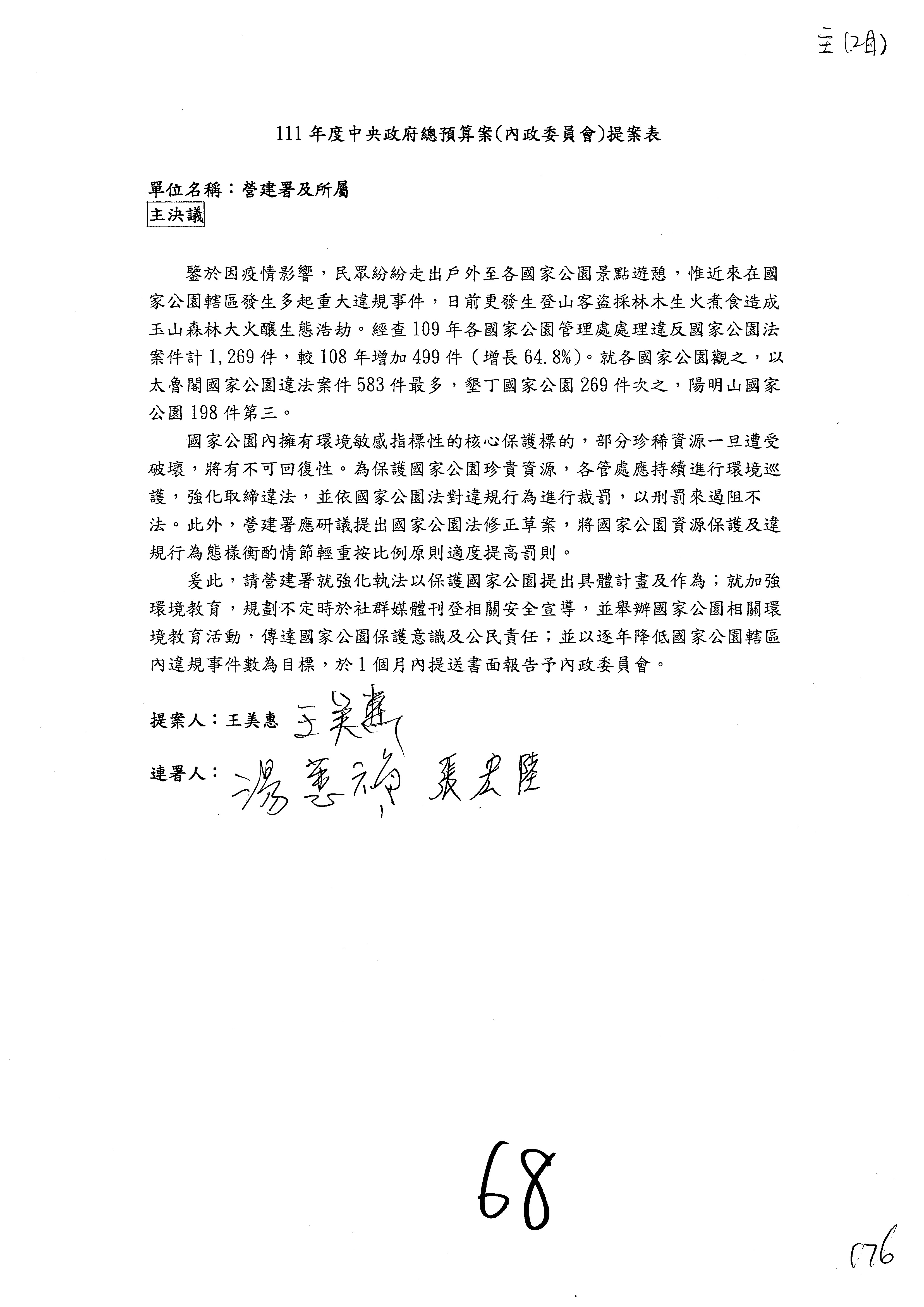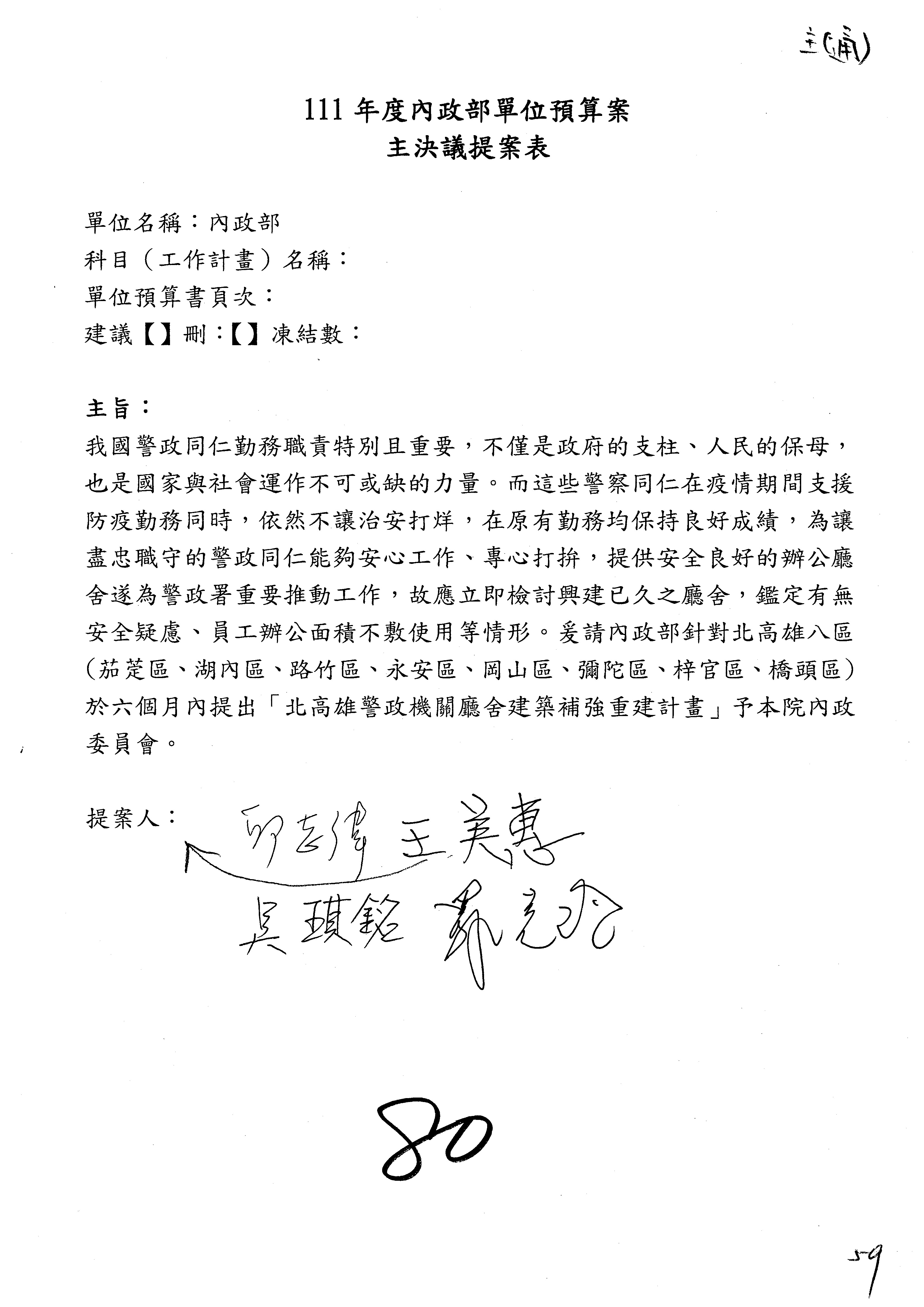 主決議修正部分:第73案倒數第二行末段修正為「請內政部就其弱勢條件提供社宅租金上的優惠,於三個月內向立法院內政委員會提出書面報告」;第74案第二段修正為「爰要求內政部營建署應協同經濟部依照再生水資源發展條例第四條,訂定臺灣用水大戶再生水使用比例辦法,及制定再生水交易、交換機制,以及妥為善用有限之水資源」;第75案倒數第四行「應參考日本、韓國……」等文字修正為「邀集地方政府同時依社會住宅『40%弱勢入住比例』保障之規定,研商落實照顧各縣市弱勢民眾居住需求」;第76案第三行修正為:「爰要求內政部全面清查各縣市老舊危險複合用途建築物及大樓,並邀集地方政府就建物管理……」,其餘文字照案通過;第77案除將第四段修正為「爰要求內政部加強給與移民署撰寫報告之相關資源,並請移民署針對撰寫首次國家報告、辦理國際審查及後續每4年提出1次報告事等之相關規劃,於3個月內提出書面報告」外,其餘文字照案通過;第78案第四段首句增列「移工權益如何保障、如何減少失聯移工及避免黑戶寶寶之產生」等文字,「失聯移工……有待加強」等文字予以刪除,其餘文字照案通過;第79案倒數第四行後段修正為「爰請內政部於一個月提供北高雄八區(茄萣區、湖內區、路竹區、永安區、岡山區、彌陀區、梓官區、橋頭區)申請公所辦公廳舍、村(里)集會所(活動中心)建築補強、補助情形之書面報告予立法院內政委員會」;第80案將「北高雄機關廳舍建築補強重建計畫」之「重建計畫」刪除,其後增加「書面報告」等文字,其餘文字照案通過;第81案末句修正為「於一個月內提出書面報告予立法院內政委員會」;第83案將倒數第三行後段「補助嘉義市」修正為「優先協助嘉義市」,並將「1個月」修正為「2個月」,其餘文字照案通過;第84案倒數第三行末句修正為「爰要求內政部參考健保恢復之方案,於1個月研議就疫情期間國人若出境逾2年戶籍遷出者,回國後仍享有投票權之可行性」,其餘文字照案通過;第88案倒數第三行末句修正為「請內政部就該部因應人口問題相關作為三個月內提出書面報告」,其餘文字照案通過;第90案第三行之後修正為「內政部111年度預算『內政資訊業務─數位身分識別證(New eID)─新一代國民身分證換發計畫』4,840萬元,有鑑於數位身分證將串連政府所有服務,為避免外界對於數位身分證在應用上存有資安及隱私保護疑慮,爰請內政部提出說明及改進之方案,並於三個月向立法院內政委員會提出書面報告」,其餘文字照案通過;第91案第三段末句修正為「於三個月內說明不動產市場指標之分析方向及所參考之數據來源,並說明未公開之原因」,其餘文字照案通過;第95案倒數第二行修正為「請內政部研議抵價地原則性50%之規定合宜性及土地徵收條例第三十九條第二項所稱特殊情況,保障民眾權益,內政部應於三個月內,針對上述事項,向內政委員會提出書面報告」;第89案將「1個月」修正為「3個月」。