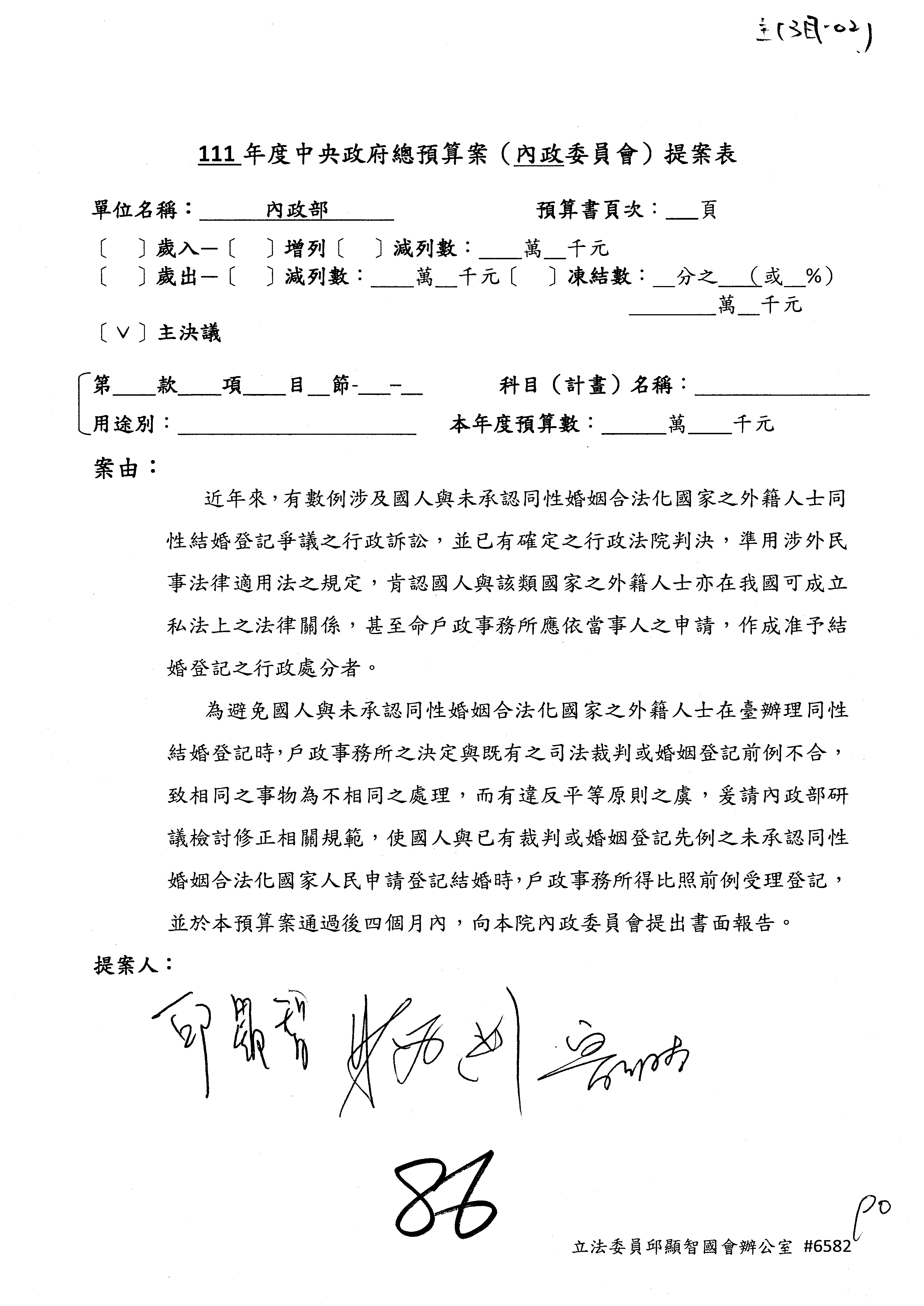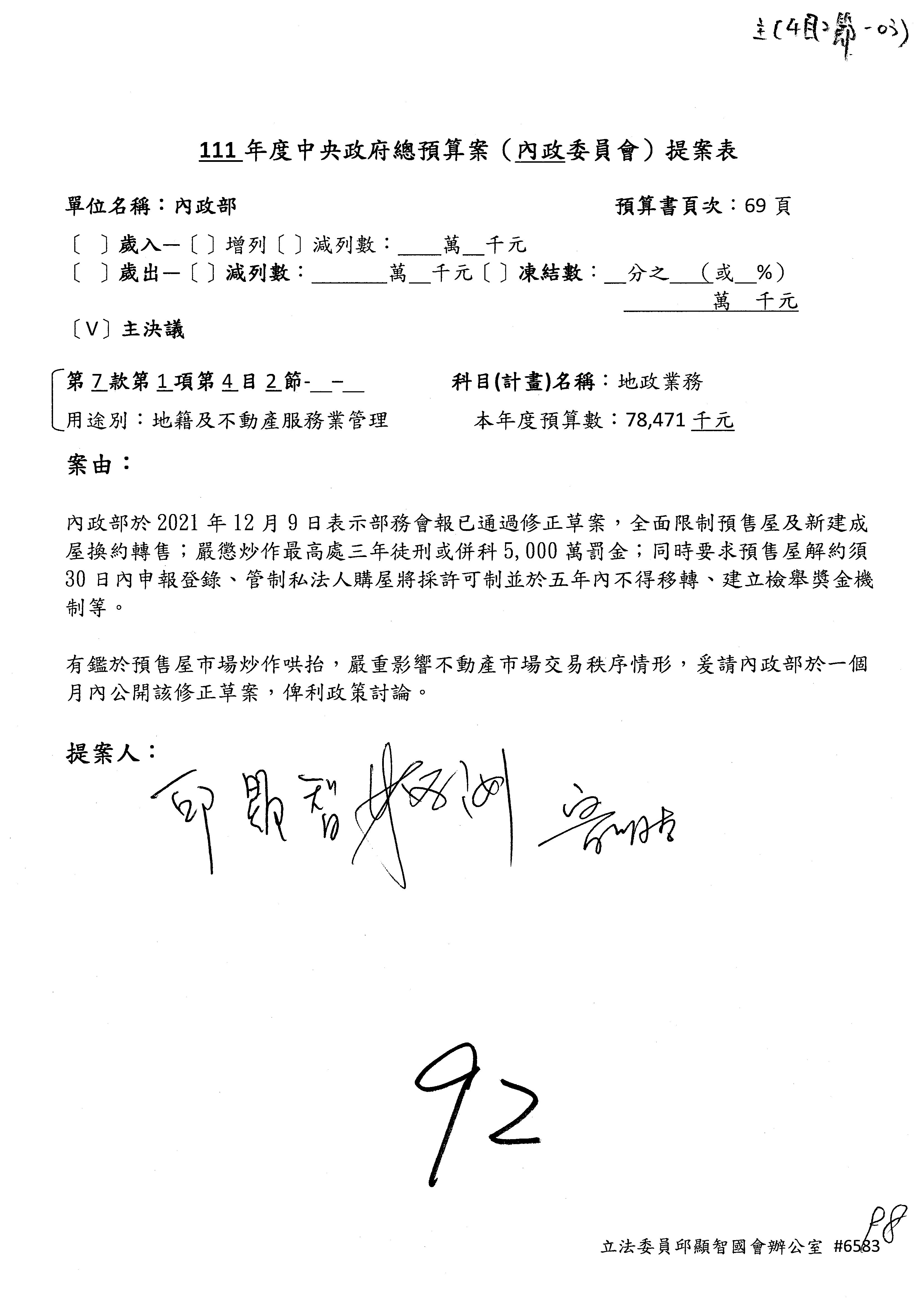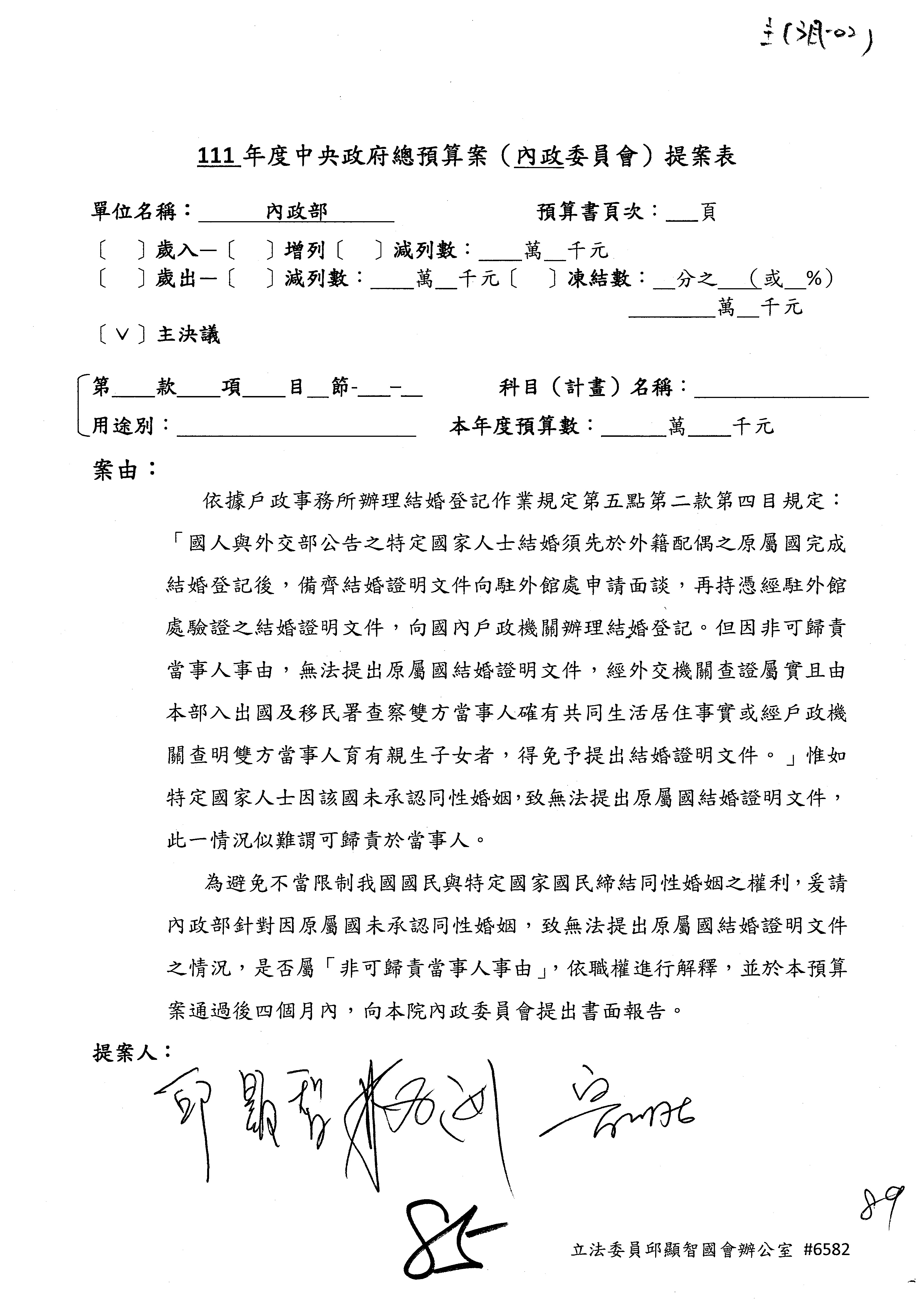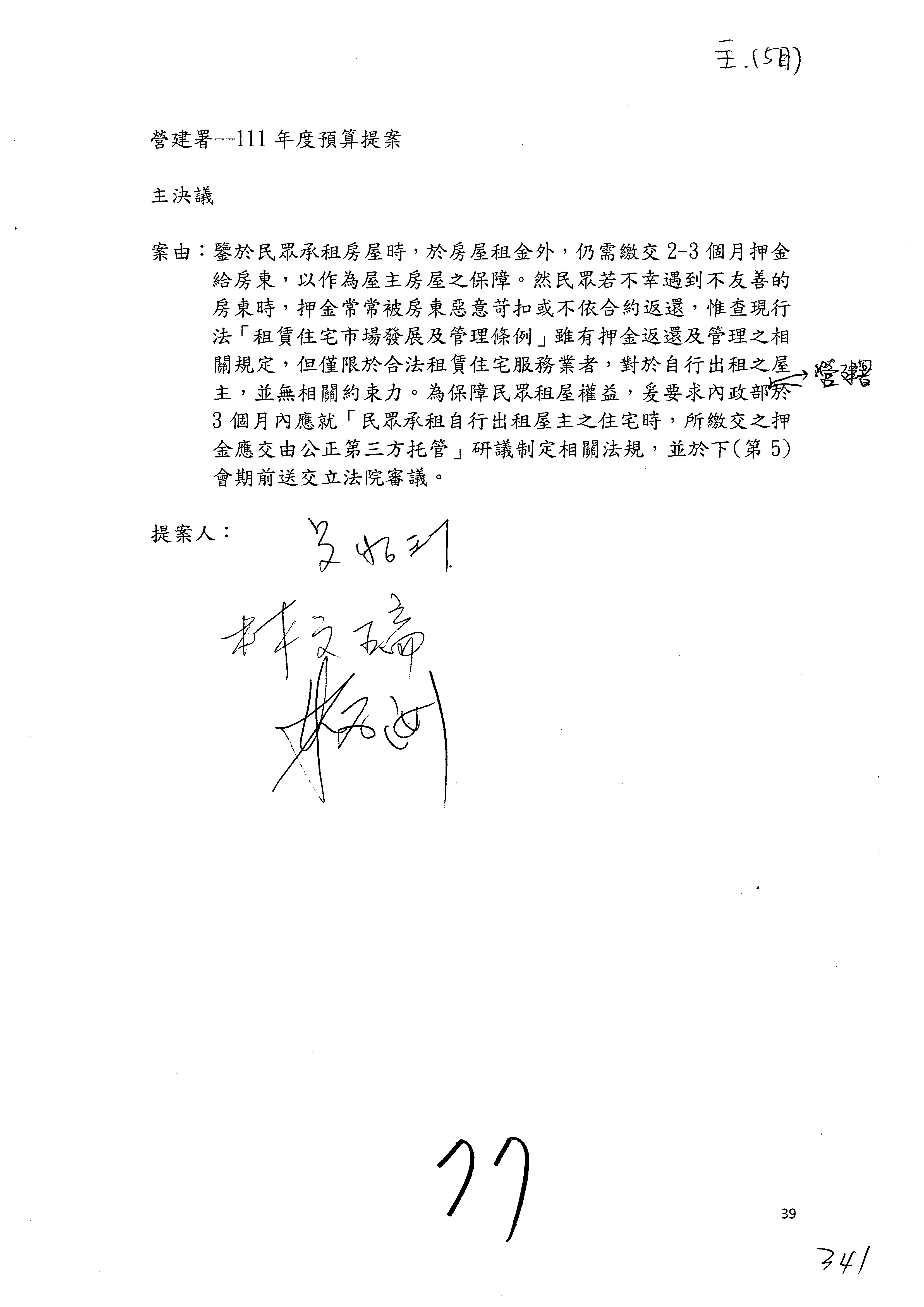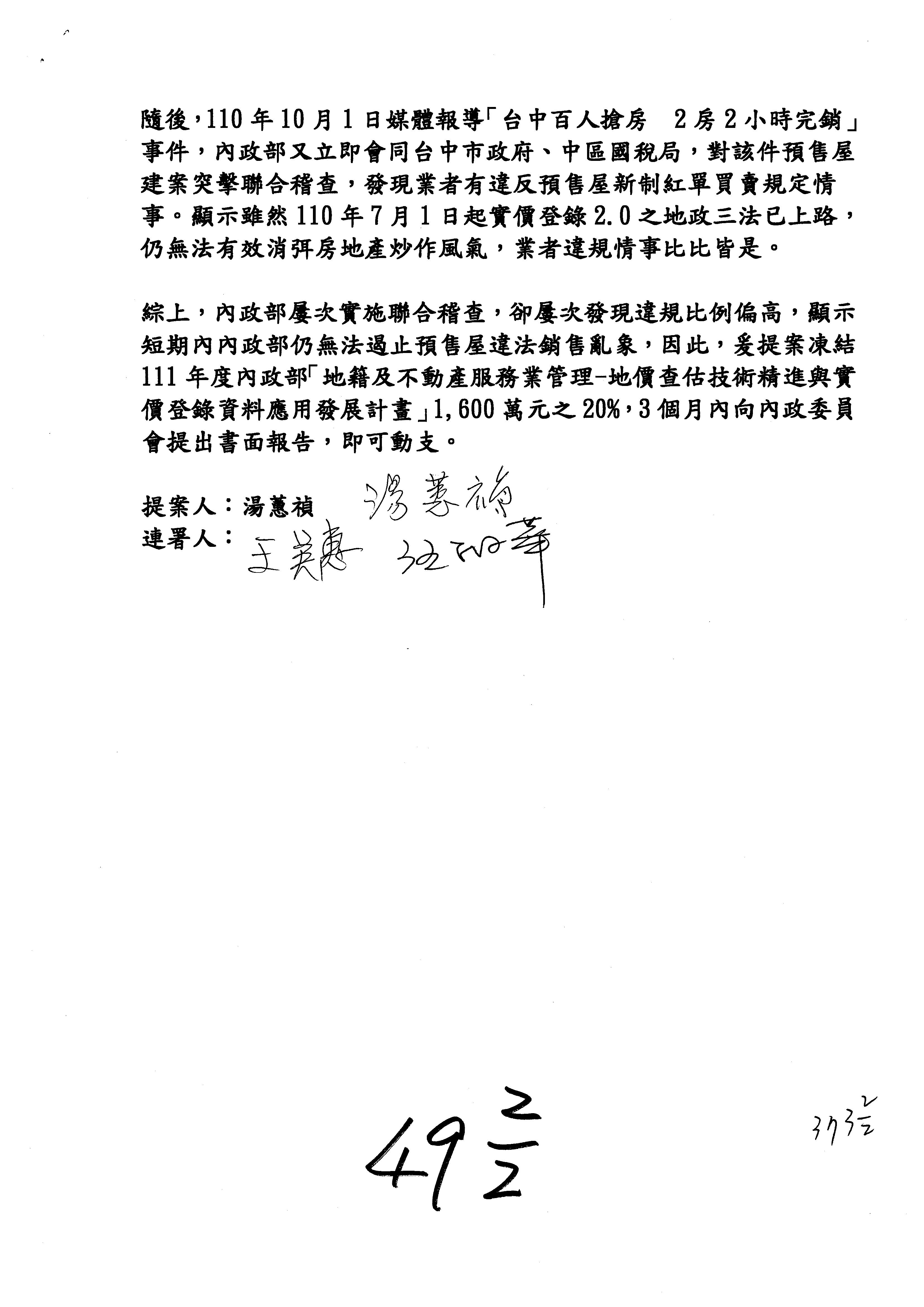主決議修正部分:第73案倒數第二行末段修正為「請內政部就其弱勢條件提供社宅租金上的優惠,於三個月內向立法院內政委員會提出書面報告」;第74案第二段修正為「爰要求內政部營建署應協同經濟部依照再生水資源發展條例第四條,訂定臺灣用水大戶再生水使用比例辦法,及制定再生水交易、交換機制,以及妥為善用有限之水資源」;第75案倒數第四行「應參考日本、韓國……」等文字修正為「邀集地方政府同時依社會住宅『40%弱勢入住比例』保障之規定,研商落實照顧各縣市弱勢民眾居住需求」;第76案第三行修正為:「爰要求內政部全面清查各縣市老舊危險複合用途建築物及大樓,並邀集地方政府就建物管理……」,其餘文字照案通過;第77案除將第四段修正為「爰要求內政部加強給與移民署撰寫報告之相關資源,並請移民署針對撰寫首次國家報告、辦理國際審查及後續每4年提出1次報告事等之相關規劃,於3個月內提出書面報告」外,其餘文字照案通過;第78案第四段首句增列「移工權益如何保障、如何減少失聯移工及避免黑戶寶寶之產生」等文字,「失聯移工……有待加強」等文字予以刪除,其餘文字照案通過;第79案倒數第四行後段修正為「爰請內政部於一個月提供北高雄八區(茄萣區、湖內區、路竹區、永安區、岡山區、彌陀區、梓官區、橋頭區)申請公所辦公廳舍、村(里)集會所(活動中心)建築補強、補助情形之書面報告予立法院內政委員會」;第80案將「北高雄機關廳舍建築補強重建計畫」之「重建計畫」刪除,其後增加「書面報告」等文字,其餘文字照案通過;第81案末句修正為「於一個月內提出書面報告予立法院內政委員會」;第83案將倒數第三行後段「補助嘉義市」修正為「優先協助嘉義市」,並將「1個月」修正為「2個月」,其餘文字照案通過;第84案倒數第三行末句修正為「爰要求內政部參考健保恢復之方案,於1個月研議就疫情期間國人若出境逾2年戶籍遷出者,回國後仍享有投票權之可行性」,其餘文字照案通過;第88案倒數第三行末句修正為「請內政部就該部因應人口問題相關作為三個月內提出書面報告」,其餘文字照案通過;第90案第三行之後修正為「內政部111年度預算『內政資訊業務─數位身分識別證(New eID)─新一代國民身分證換發計畫』4,840萬元,有鑑於數位身分證將串連政府所有服務,為避免外界對於數位身分證在應用上存有資安及隱私保護疑慮,爰請內政部提出說明及改進之方案,並於三個月向立法院內政委員會提出書面報告」,其餘文字照案通過;第91案第三段末句修正為「於三個月內說明不動產市場指標之分析方向及所參考之數據來源,並說明未公開之原因」,其餘文字照案通過;第95案倒數第二行修正為「請內政部研議抵價地原則性50%之規定合宜性及土地徵收條例第三十九條第二項所稱特殊情況,保障民眾權益,內政部應於三個月內,針對上述事項,向內政委員會提出書面報告」;第89案將「1個月」修正為「3個月」。