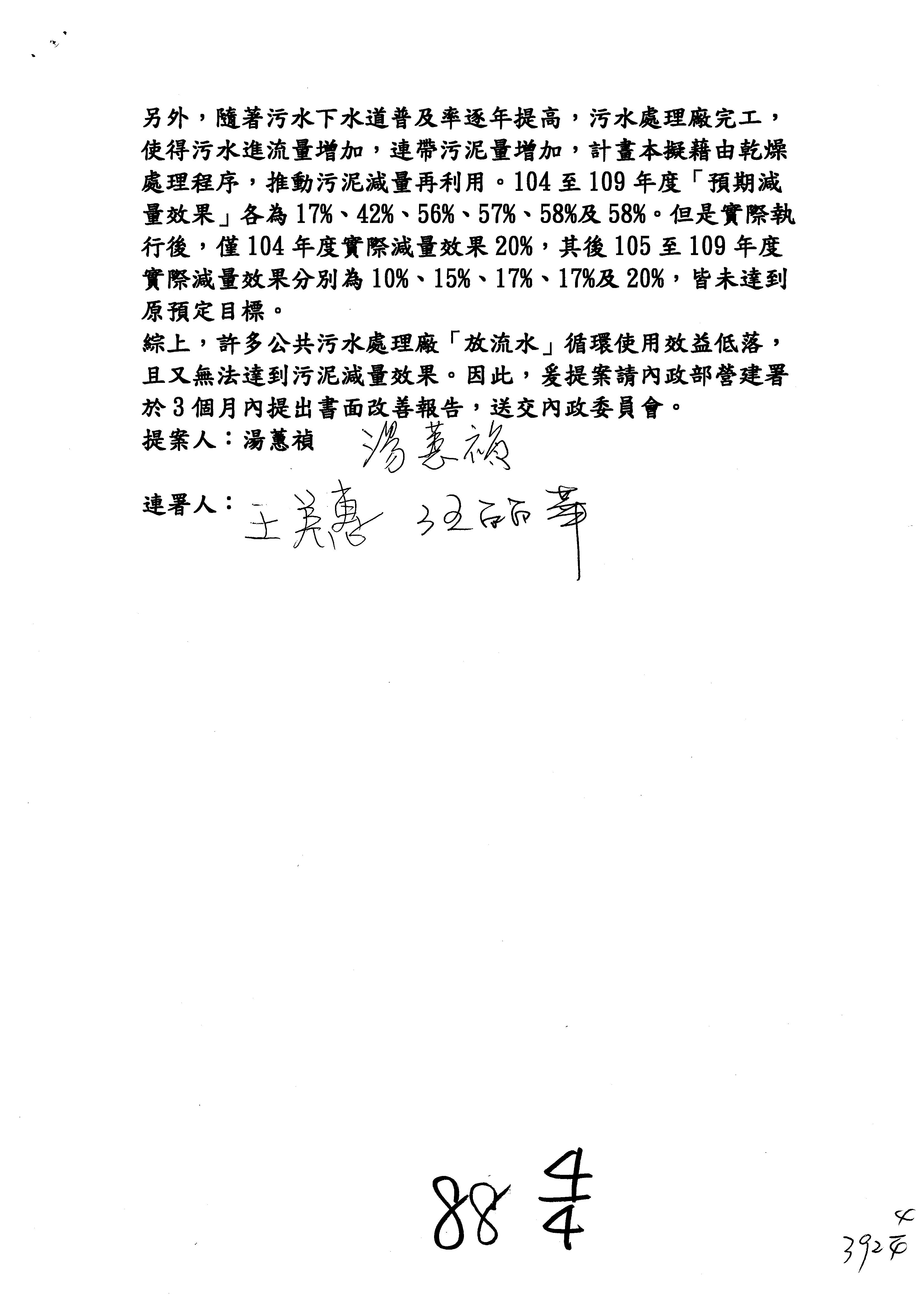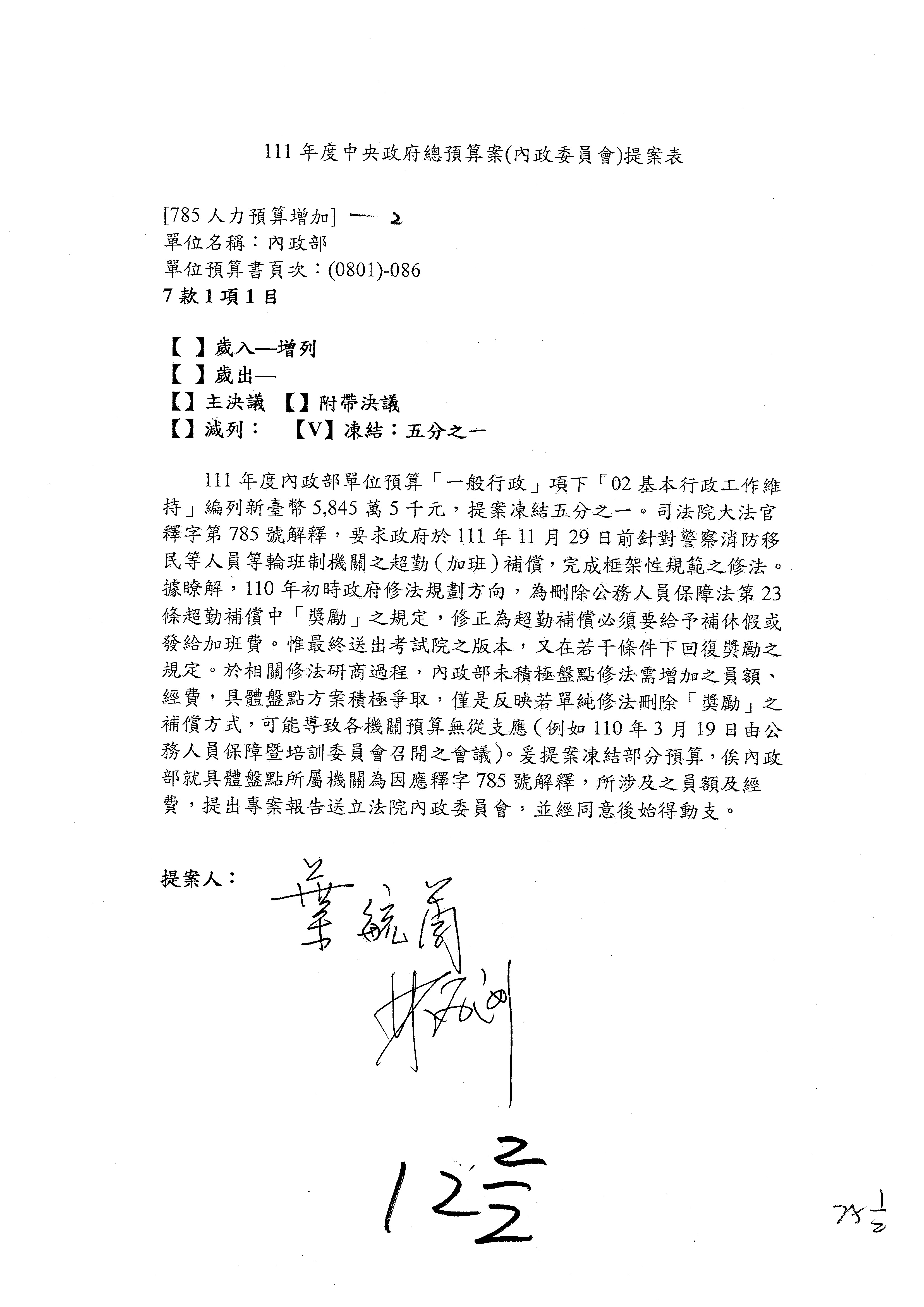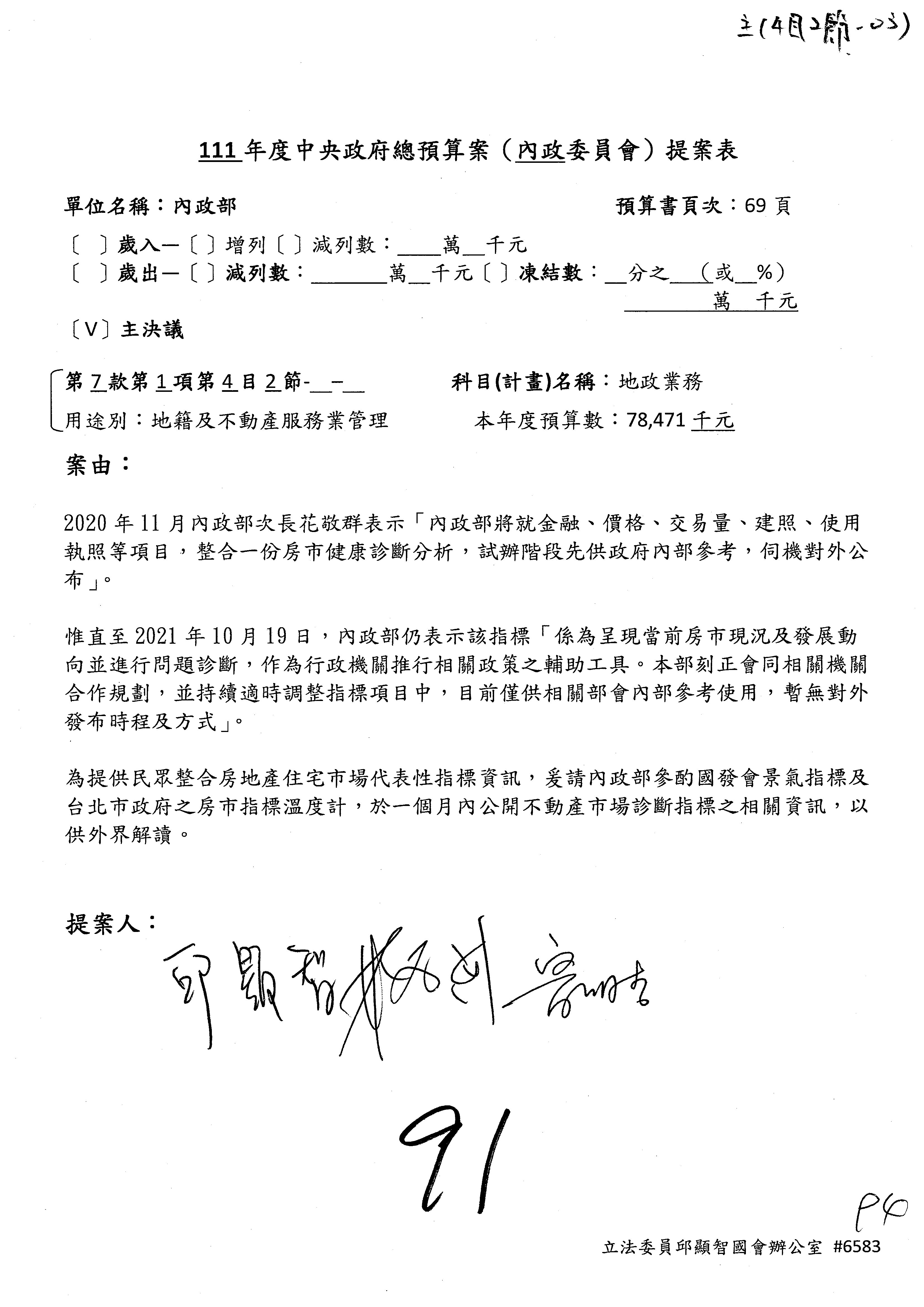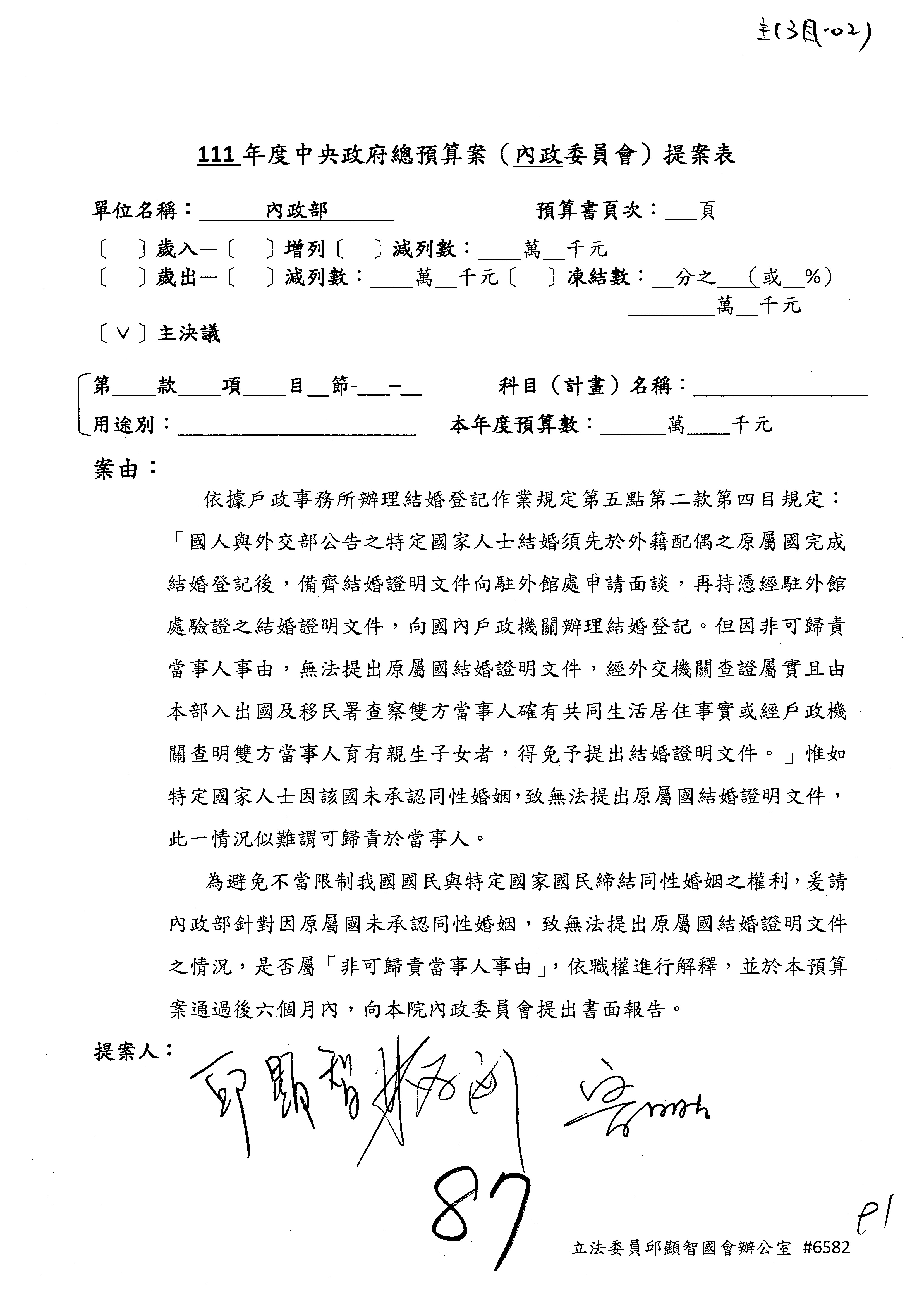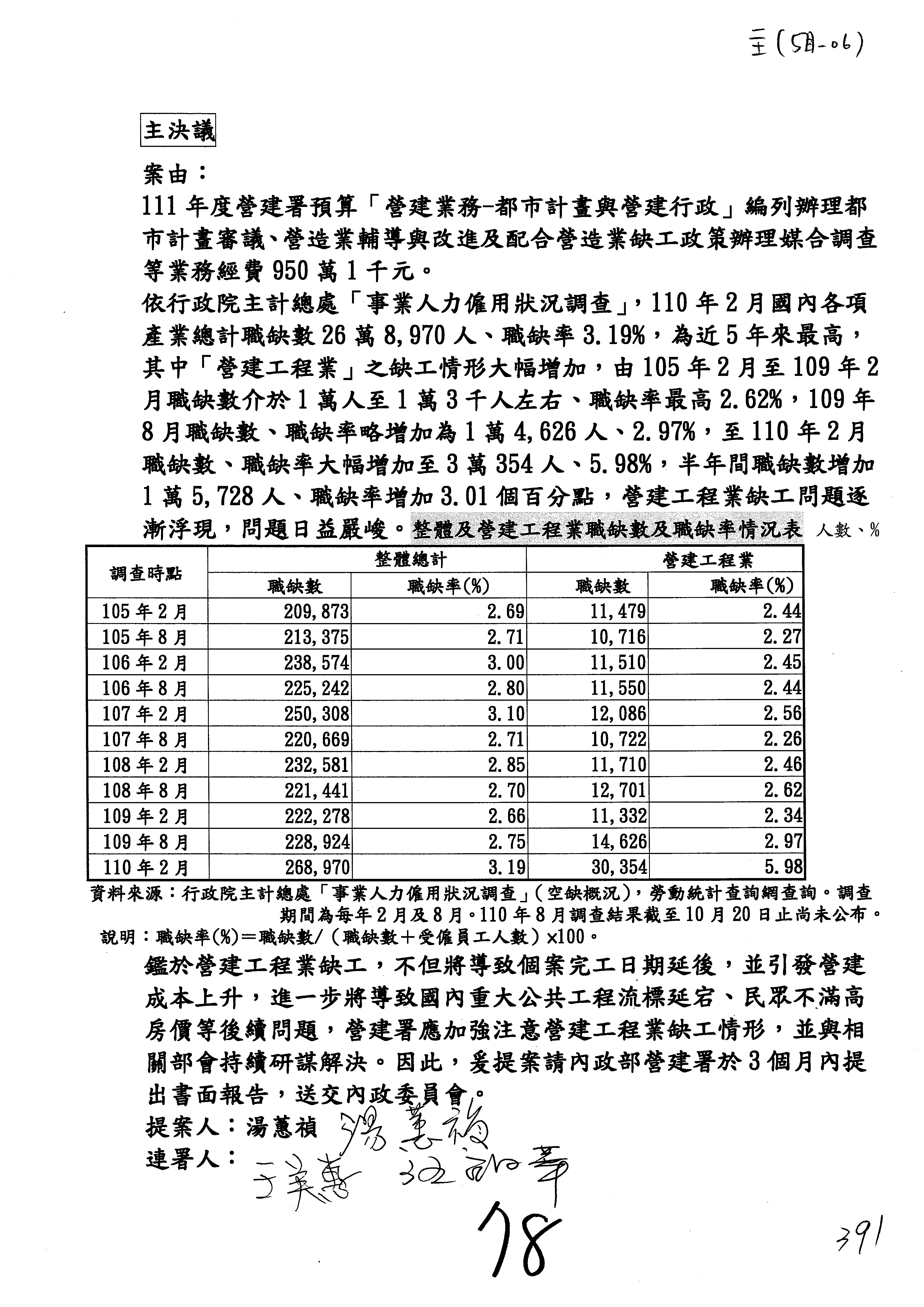 主決議修正部分:第73案倒數第二行末段修正為「請內政部就其弱勢條件提供社宅租金上的優惠,於三個月內向立法院內政委員會提出書面報告」;第74案第二段修正為「爰要求內政部營建署應協同經濟部依照再生水資源發展條例第四條,訂定臺灣用水大戶再生水使用比例辦法,及制定再生水交易、交換機制,以及妥為善用有限之水資源」;第75案倒數第四行「應參考日本、韓國……」等文字修正為「邀集地方政府同時依社會住宅『40%弱勢入住比例』保障之規定,研商落實照顧各縣市弱勢民眾居住需求」;第76案第三行修正為:「爰要求內政部全面清查各縣市老舊危險複合用途建築物及大樓,並邀集地方政府就建物管理……」,其餘文字照案通過;第77案除將第四段修正為「爰要求內政部加強給與移民署撰寫報告之相關資源,並請移民署針對撰寫首次國家報告、辦理國際審查及後續每4年提出1次報告事等之相關規劃,於3個月內提出書面報告」外,其餘文字照案通過;第78案第四段首句增列「移工權益如何保障、如何減少失聯移工及避免黑戶寶寶之產生」等文字,「失聯移工……有待加強」等文字予以刪除,其餘文字照案通過;第79案倒數第四行後段修正為「爰請內政部於一個月提供北高雄八區(茄萣區、湖內區、路竹區、永安區、岡山區、彌陀區、梓官區、橋頭區)申請公所辦公廳舍、村(里)集會所(活動中心)建築補強、補助情形之書面報告予立法院內政委員會」;第80案將「北高雄機關廳舍建築補強重建計畫」之「重建計畫」刪除,其後增加「書面報告」等文字,其餘文字照案通過;第81案末句修正為「於一個月內提出書面報告予立法院內政委員會」;第83案將倒數第三行後段「補助嘉義市」修正為「優先協助嘉義市」,並將「1個月」修正為「2個月」,其餘文字照案通過;第84案倒數第三行末句修正為「爰要求內政部參考健保恢復之方案,於1個月研議就疫情期間國人若出境逾2年戶籍遷出者,回國後仍享有投票權之可行性」,其餘文字照案通過;第88案倒數第三行末句修正為「請內政部就該部因應人口問題相關作為三個月內提出書面報告」,其餘文字照案通過;第90案第三行之後修正為「內政部111年度預算『內政資訊業務─數位身分識別證(New eID)─新一代國民身分證換發計畫』4,840萬元,有鑑於數位身分證將串連政府所有服務,為避免外界對於數位身分證在應用上存有資安及隱私保護疑慮,爰請內政部提出說明及改進之方案,並於三個月向立法院內政委員會提出書面報告」,其餘文字照案通過;第91案第三段末句修正為「於三個月內說明不動產市場指標之分析方向及所參考之數據來源,並說明未公開之原因」,其餘文字照案通過;第95案倒數第二行修正為「請內政部研議抵價地原則性50%之規定合宜性及土地徵收條例第三十九條第二項所稱特殊情況,保障民眾權益,內政部應於三個月內,針對上述事項,向內政委員會提出書面報告」;第89案將「1個月」修正為「3個月」。