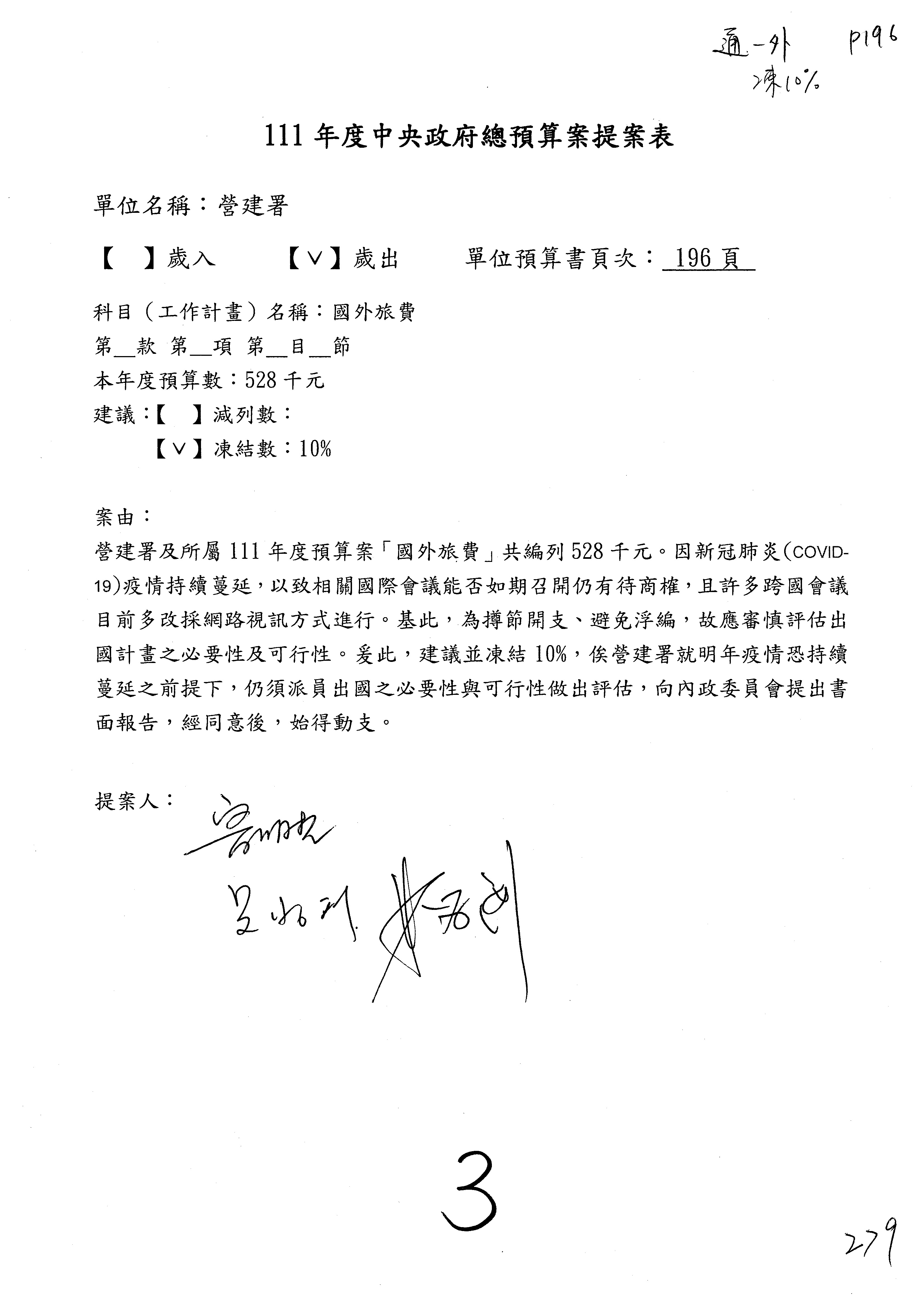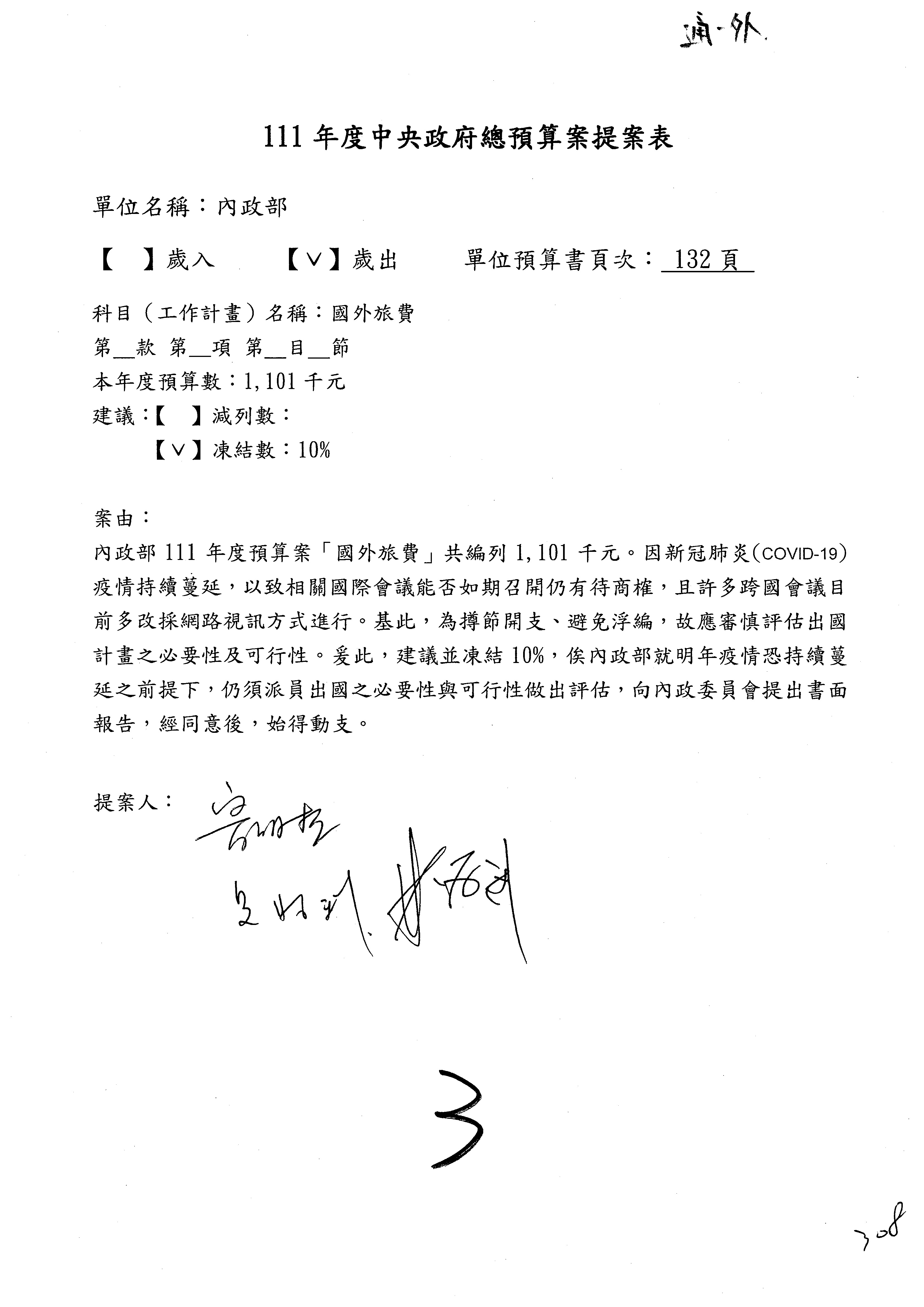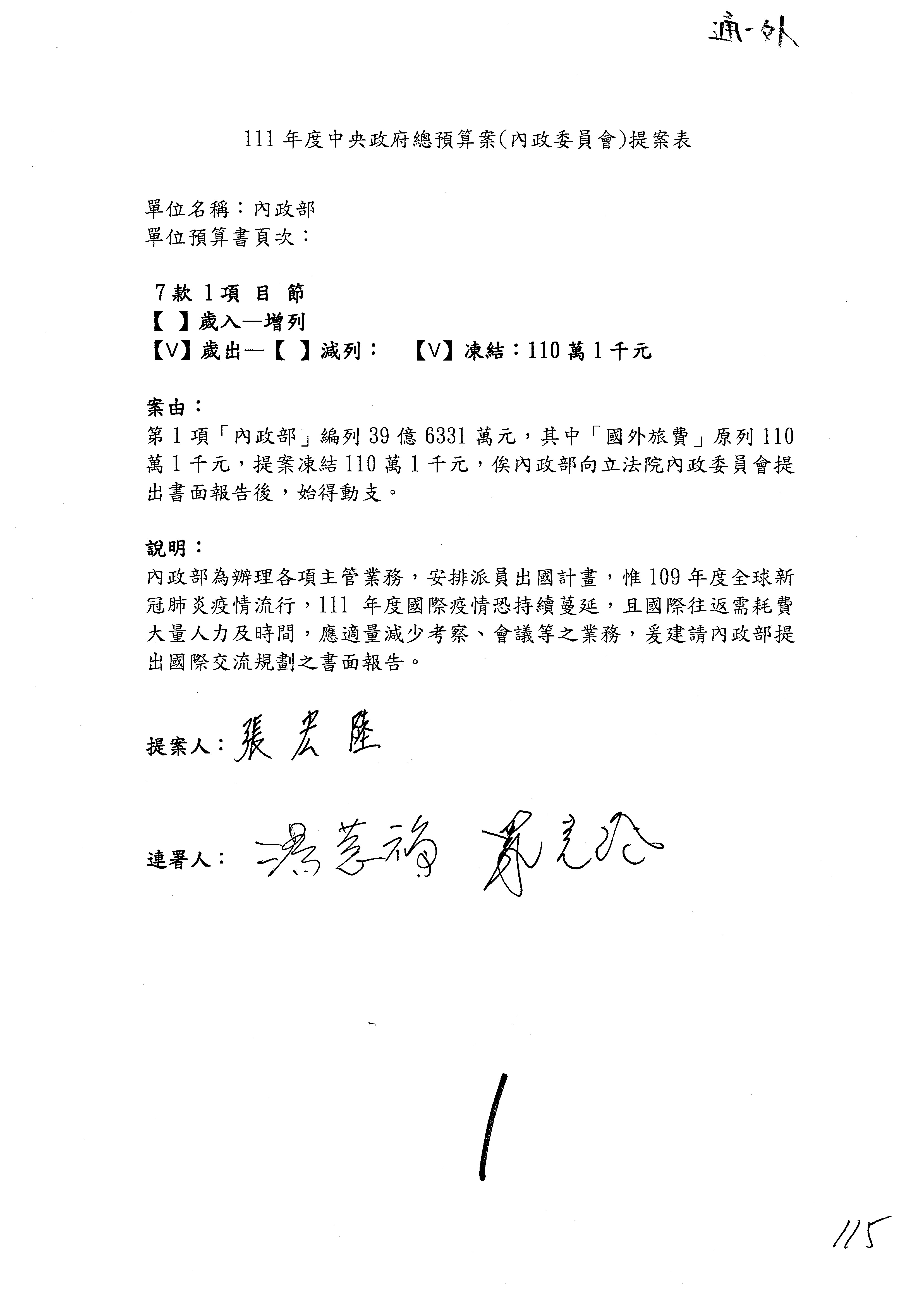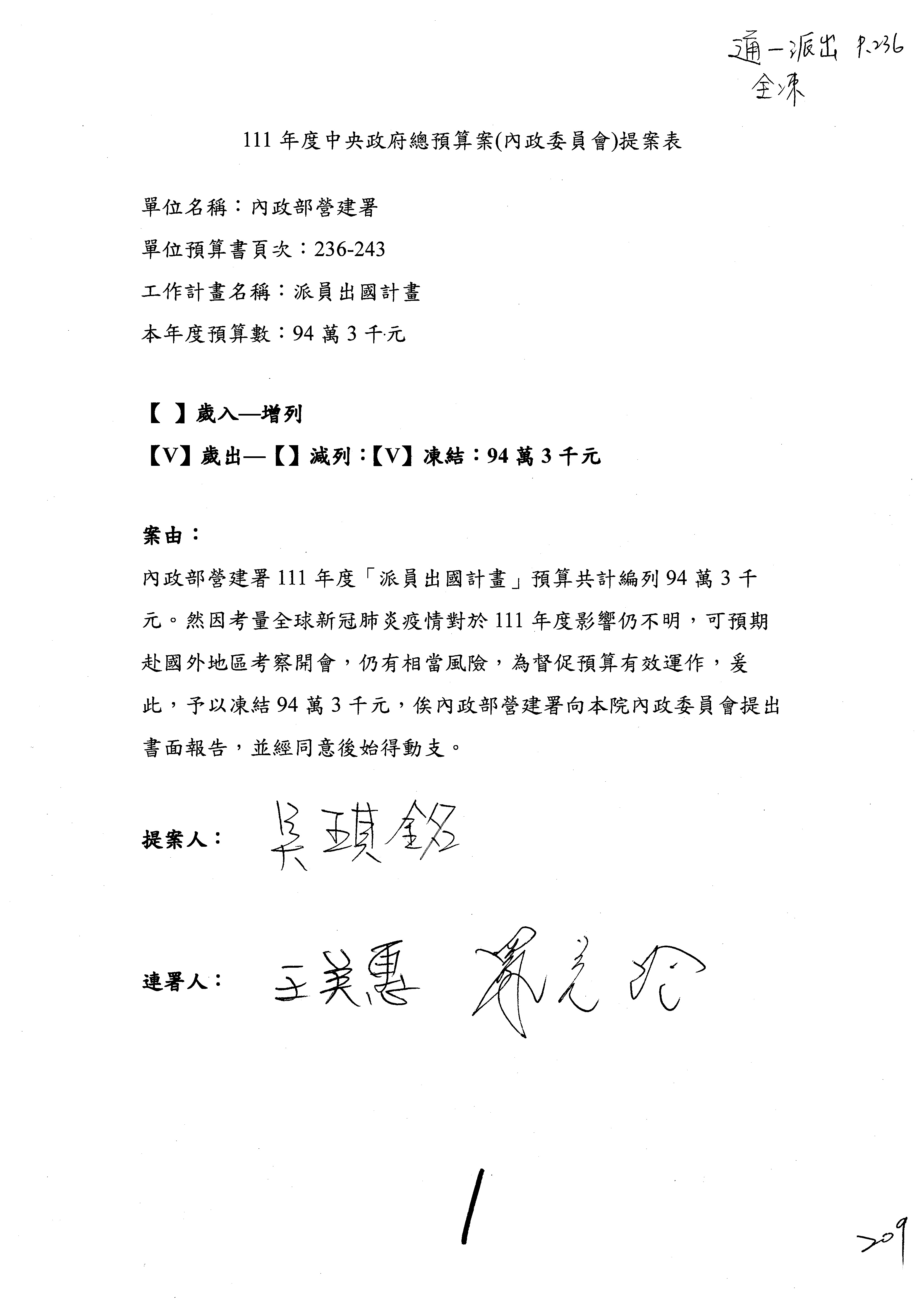 歲出通案部分有4案「國外旅費」要怎麼凍結?怎麼減列?提案減列的委員為林思銘委員提2案,然後提案凍結的委員為張宏陸委員、魯明哲委員。
