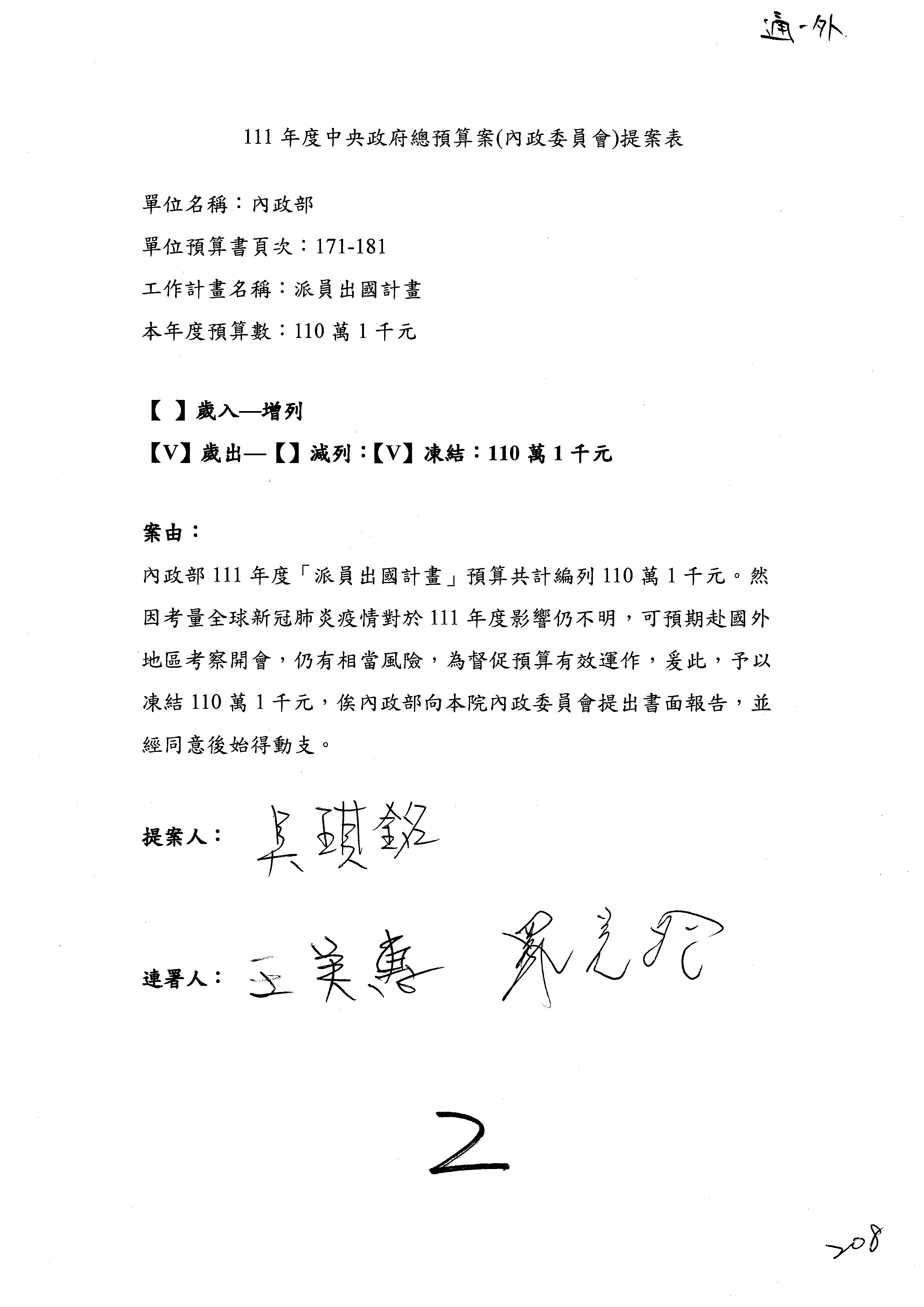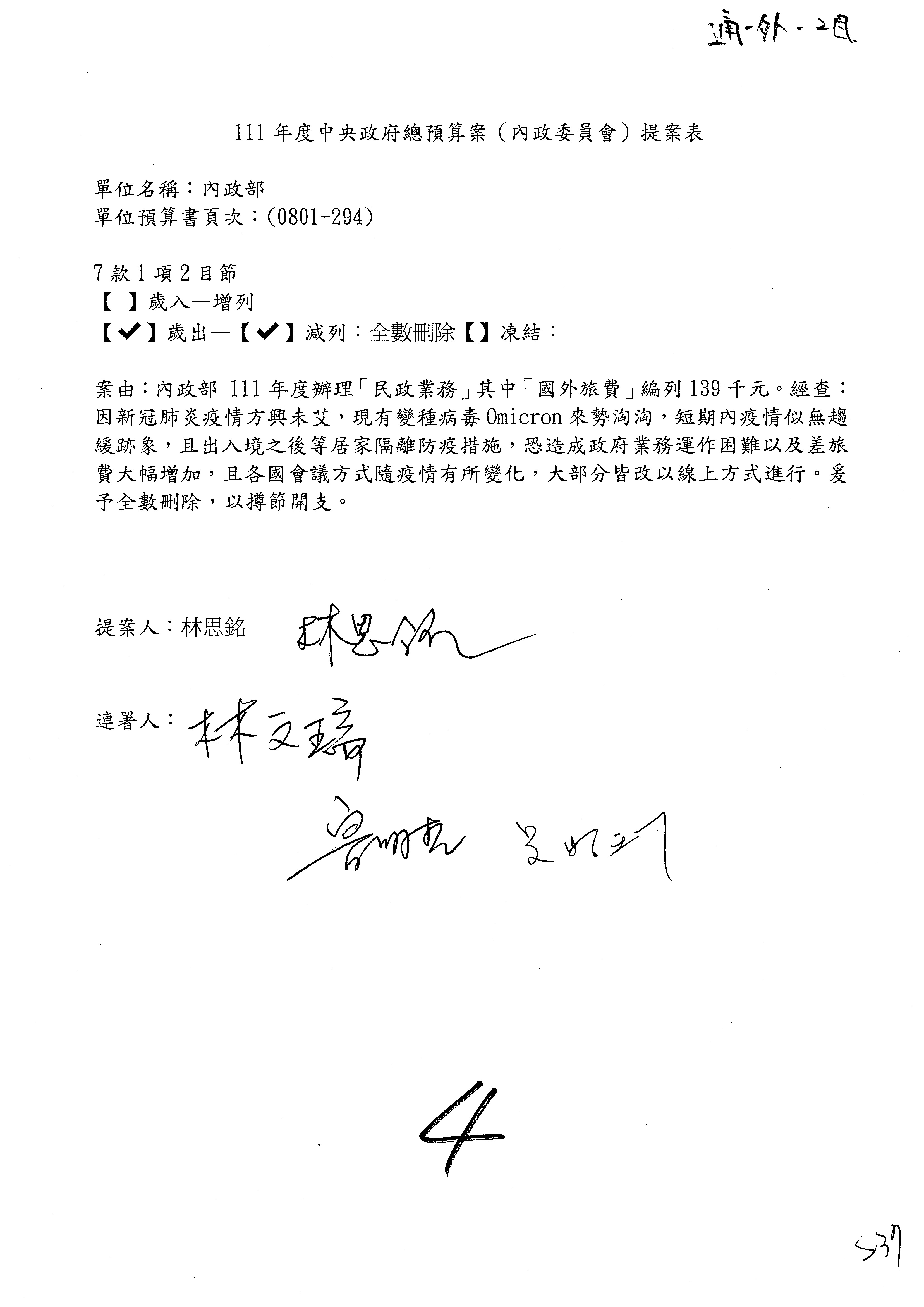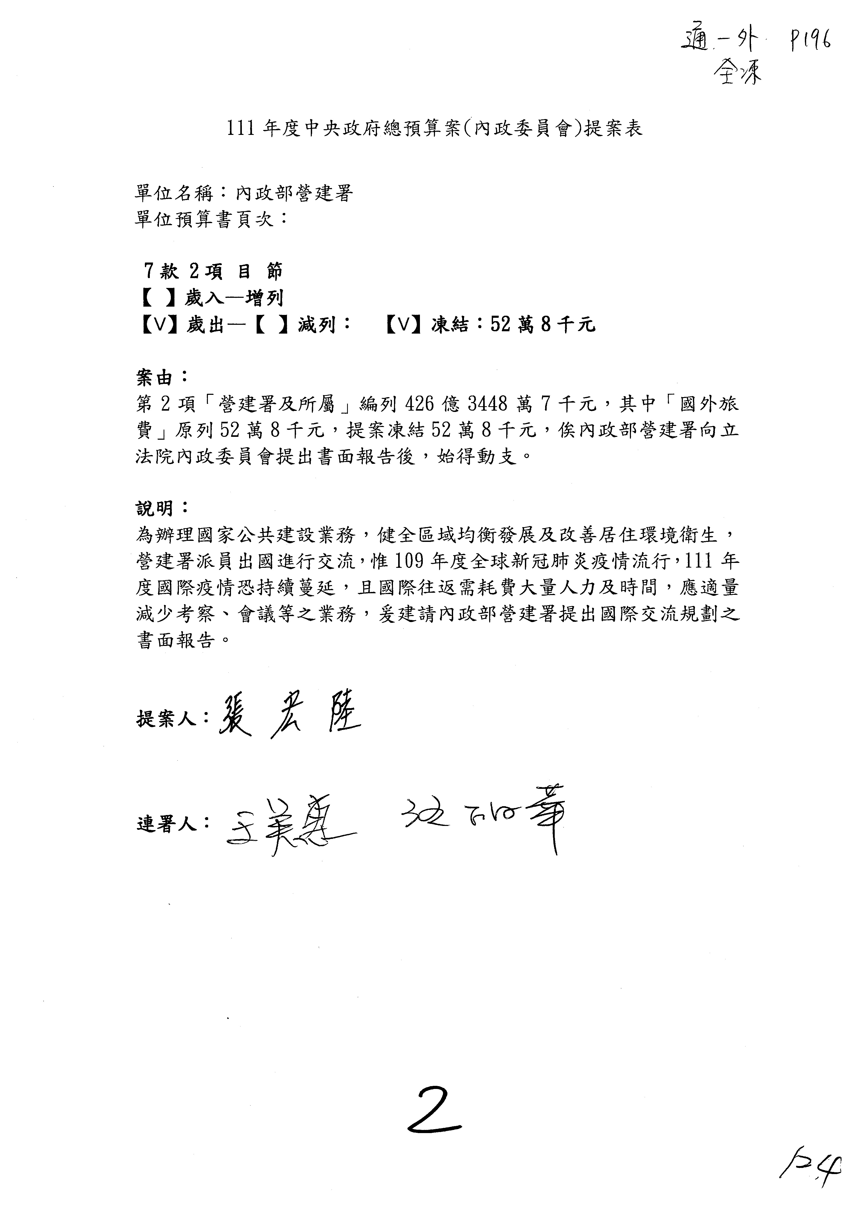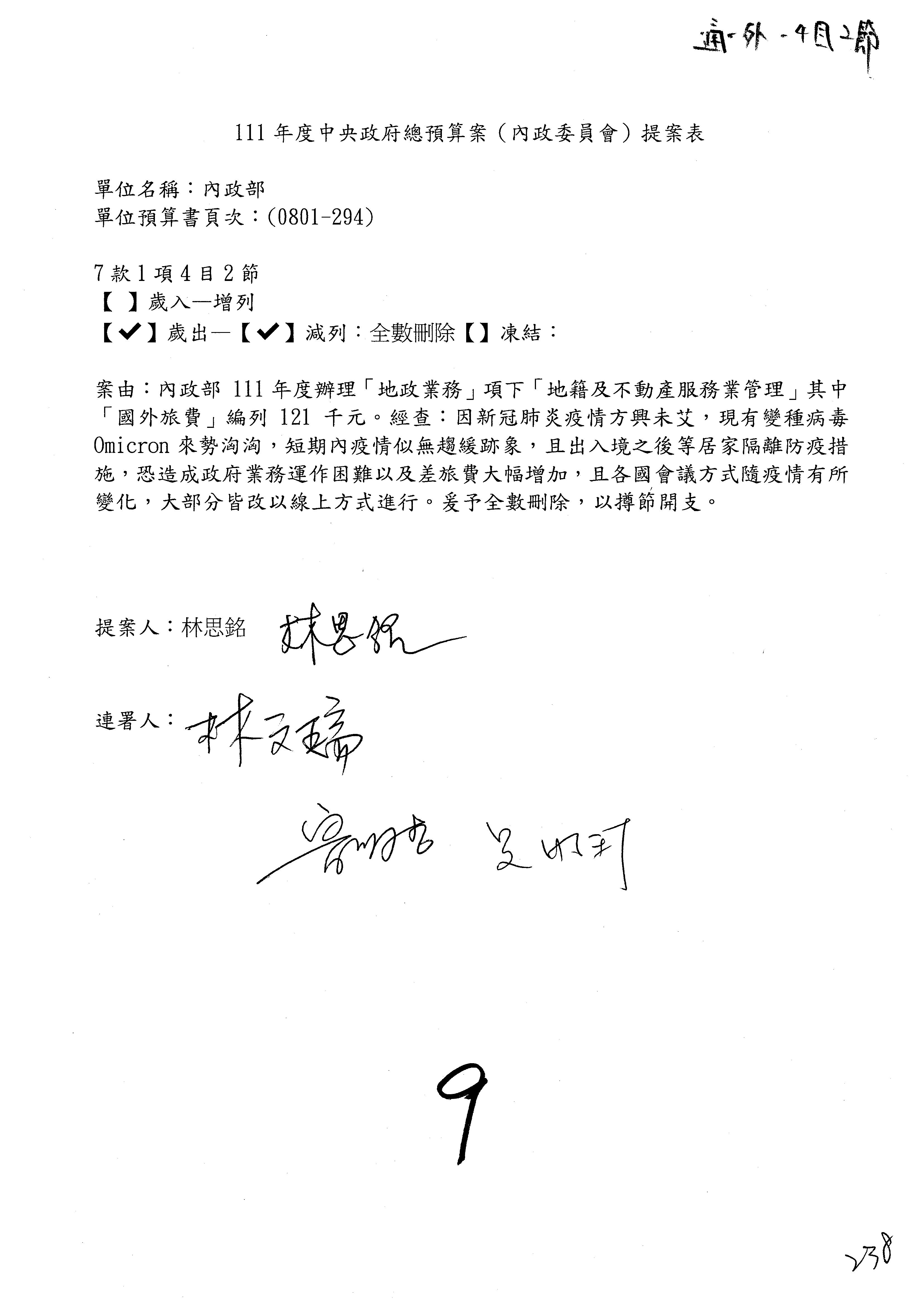 歲出通案部分有4案「國外旅費」要怎麼凍結?怎麼減列?提案減列的委員為林思銘委員提2案,然後提案凍結的委員為張宏陸委員、魯明哲委員。