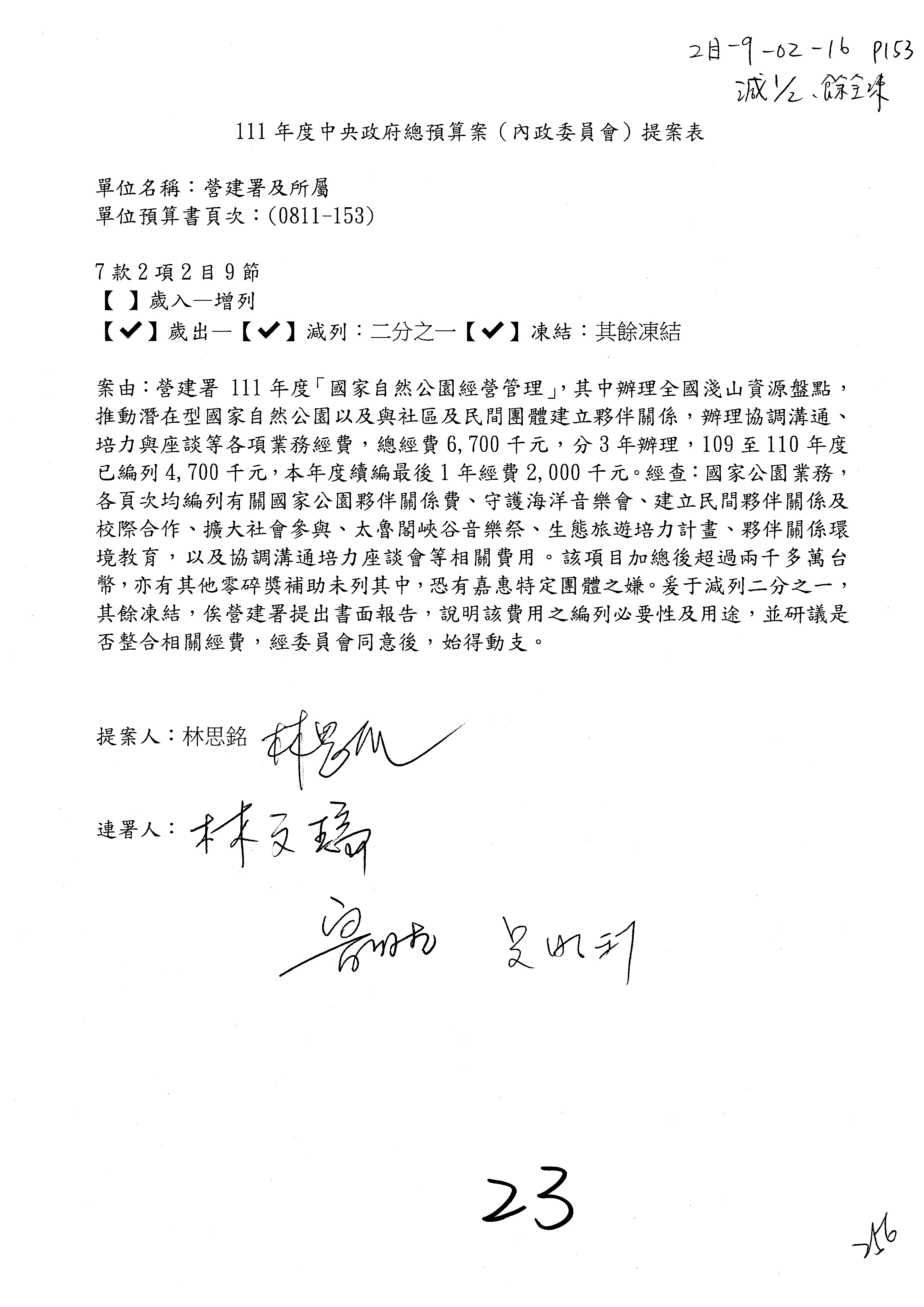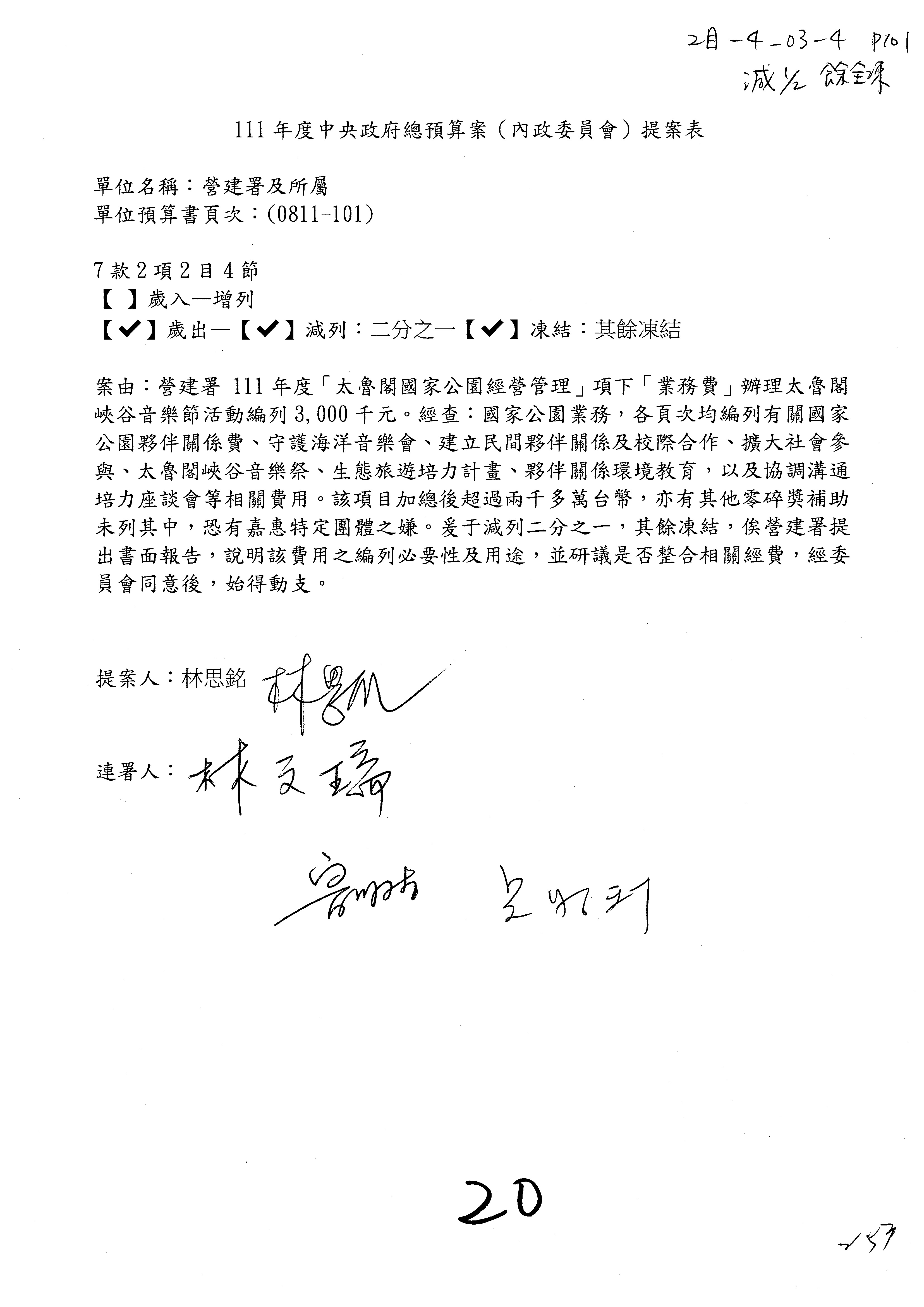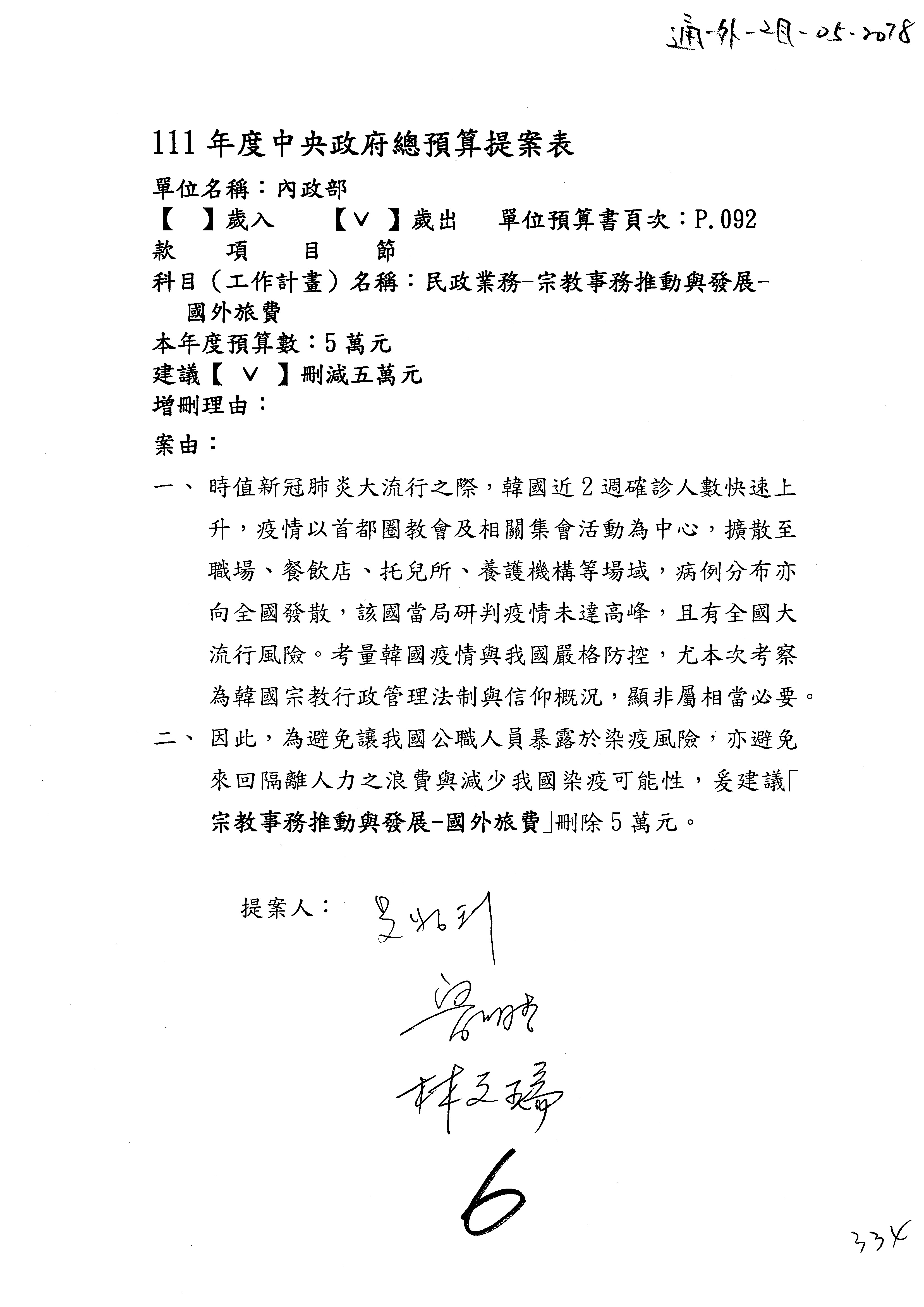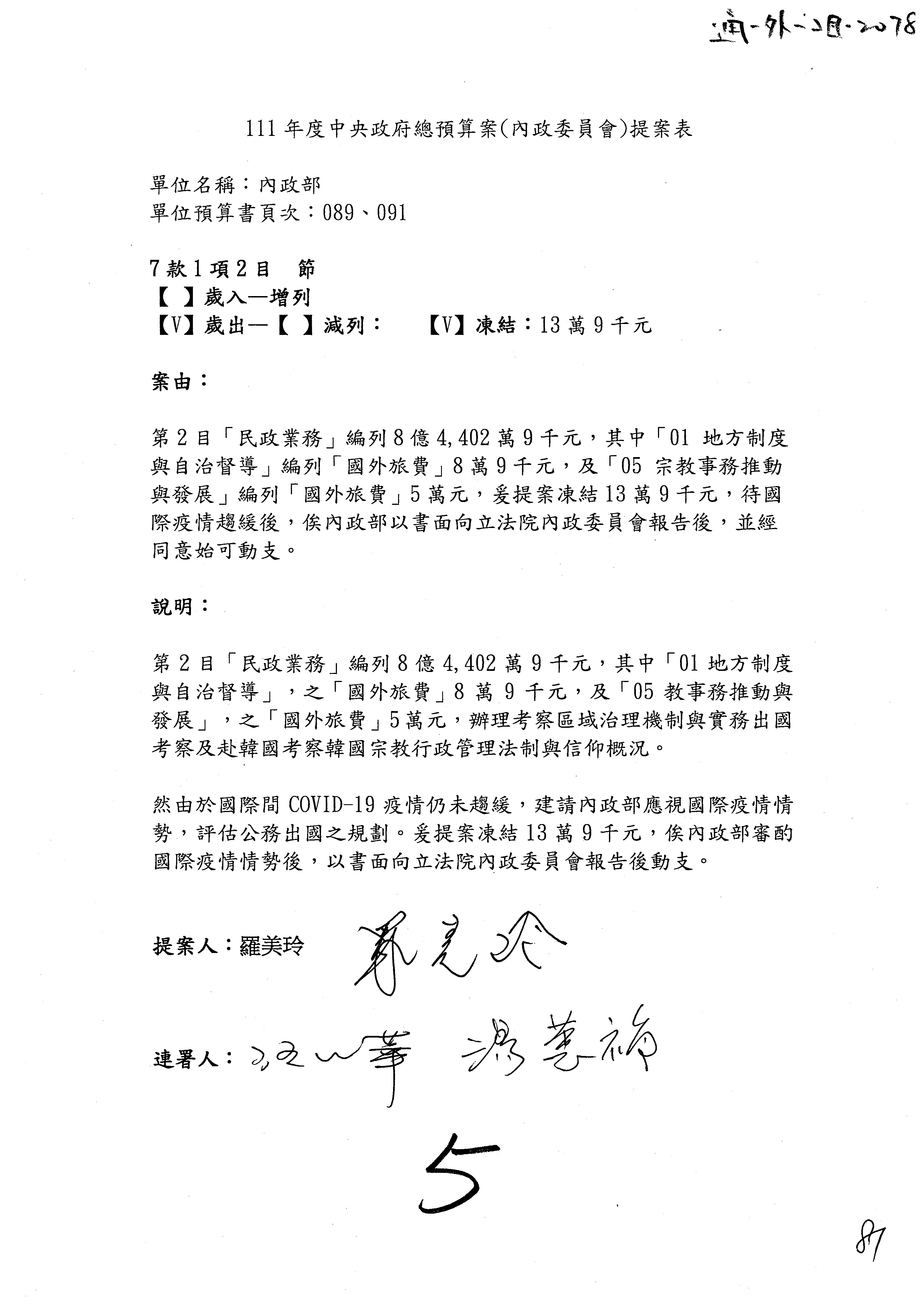 歲出通案部分有4案「國外旅費」要怎麼凍結?怎麼減列?提案減列的委員為林思銘委員提2案,然後提案凍結的委員為張宏陸委員、魯明哲委員。