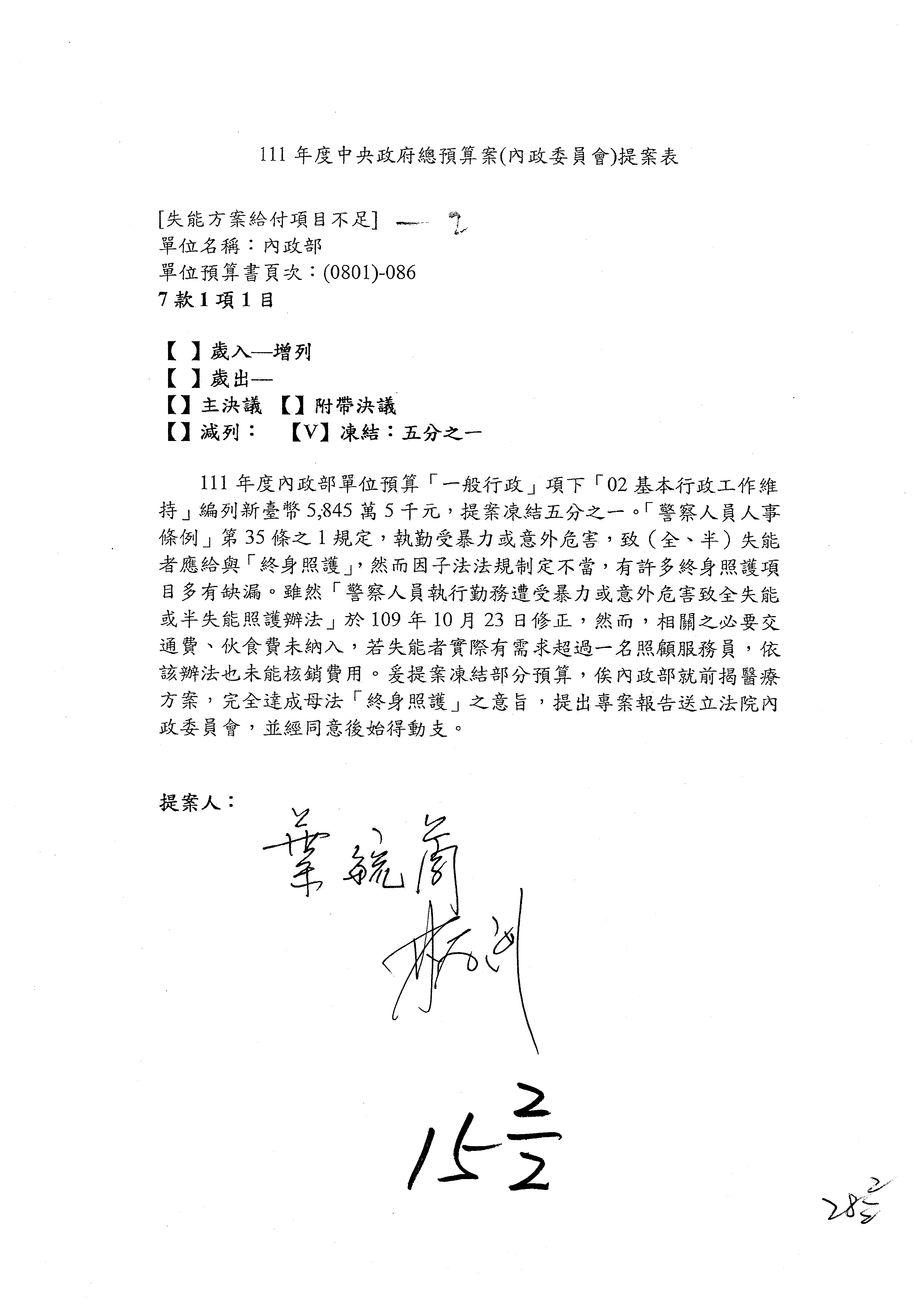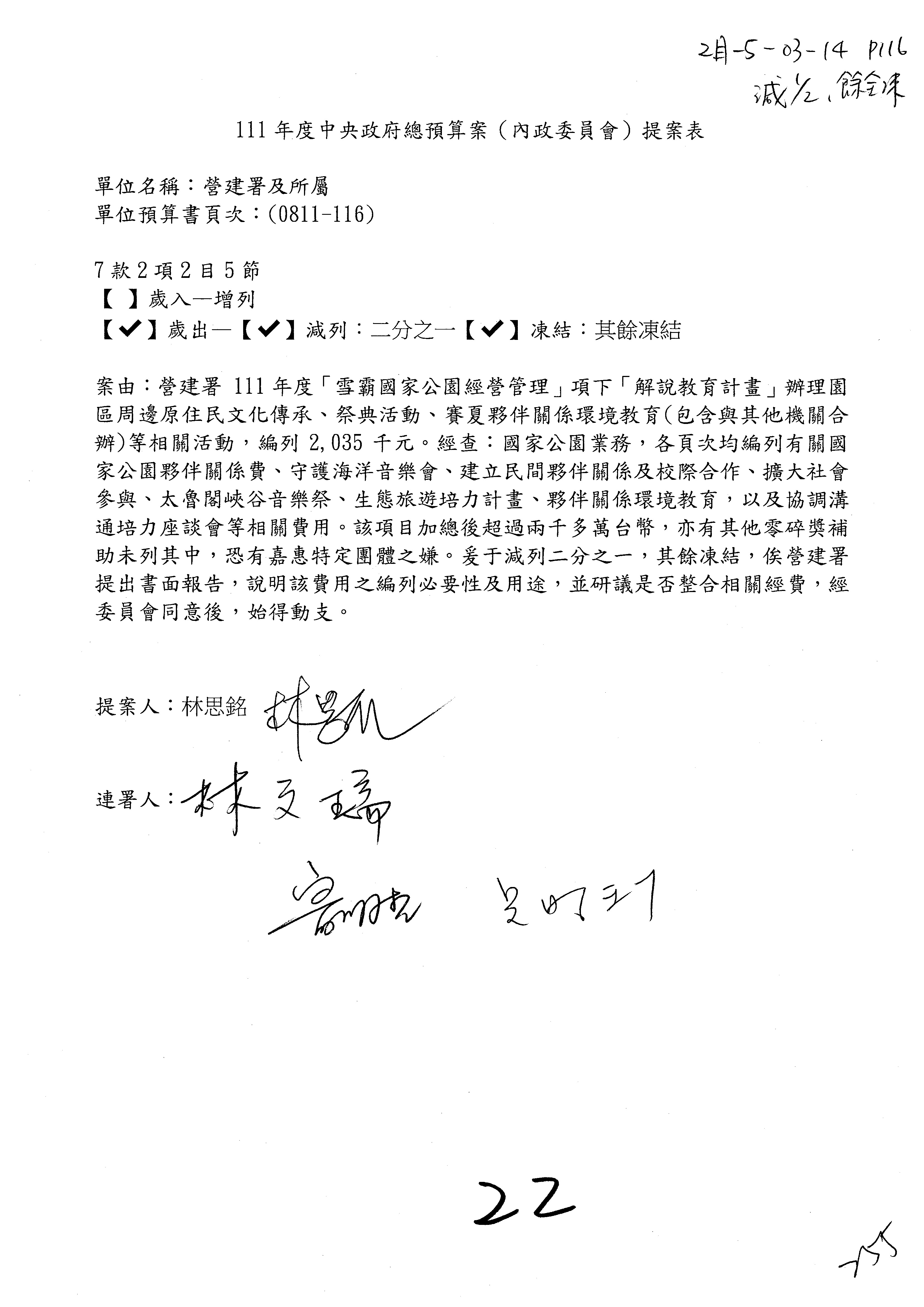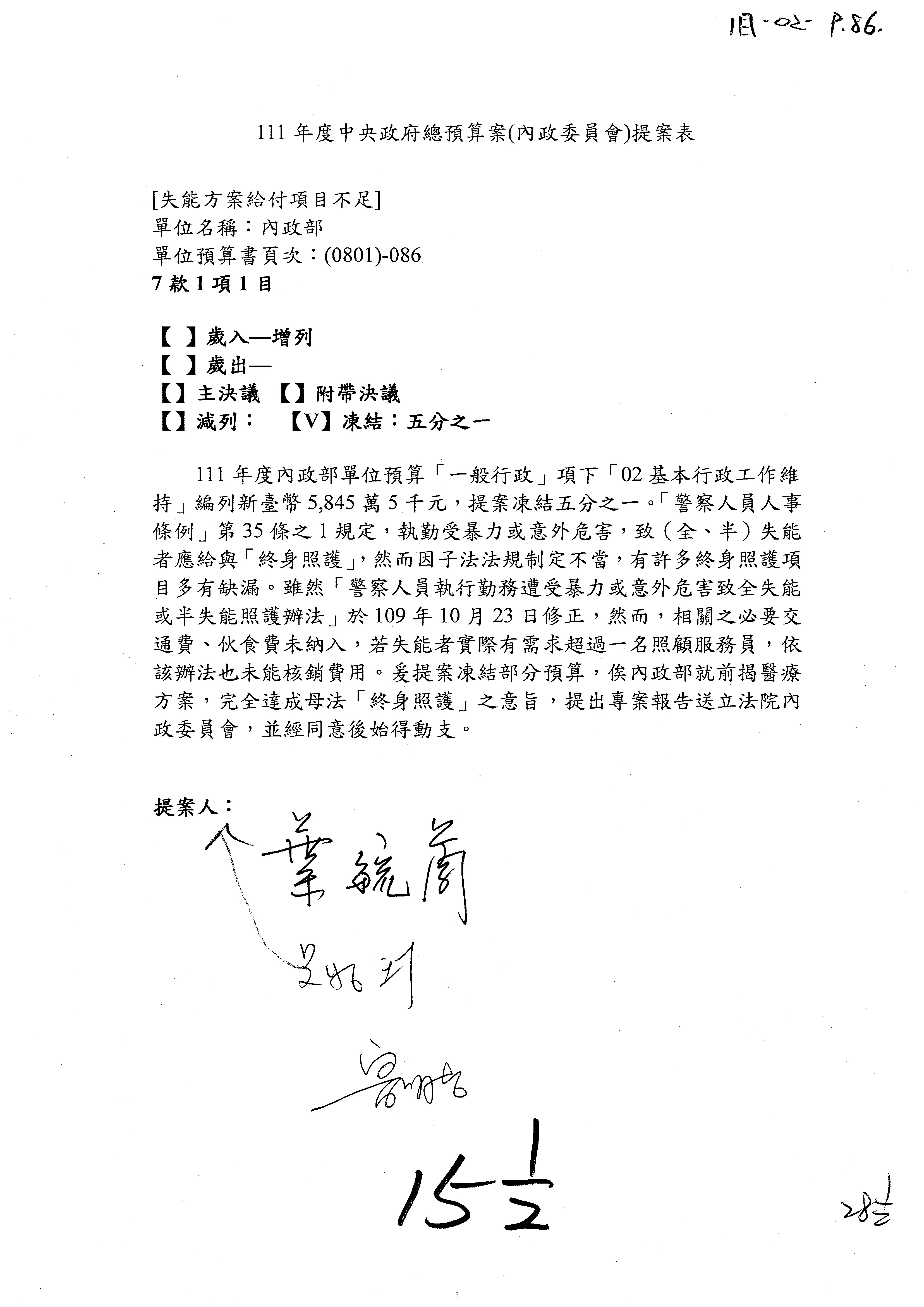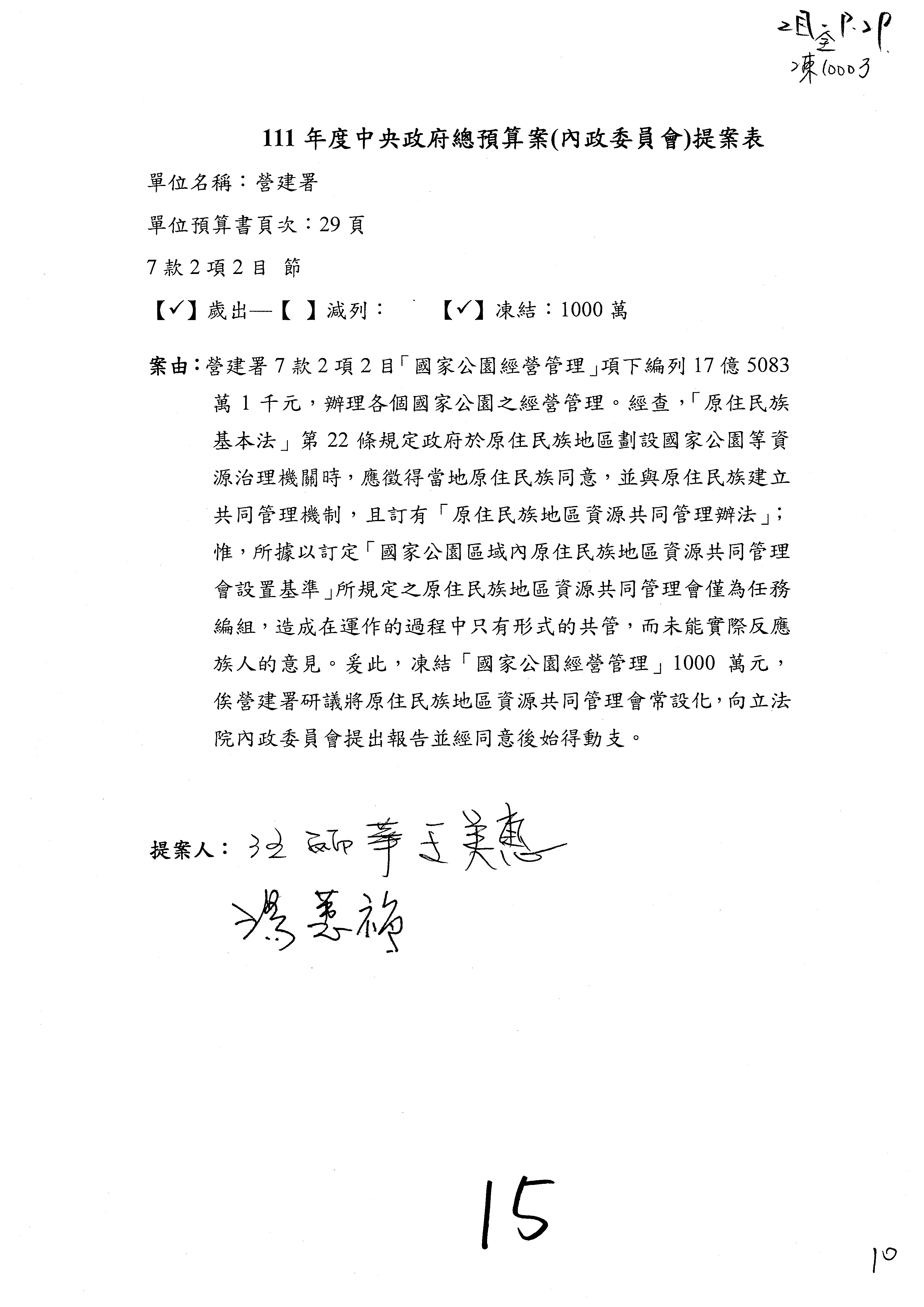 改主決議部分:第15案第一句「111年度……提案凍結五分之一。」等文字、倒數第三行「爰提案凍結部分預算,」等文字均予刪除,「專案報告」改為「書面報告」,「,並經同意後始得動支」等文字予以刪除,其餘文字照案通過。