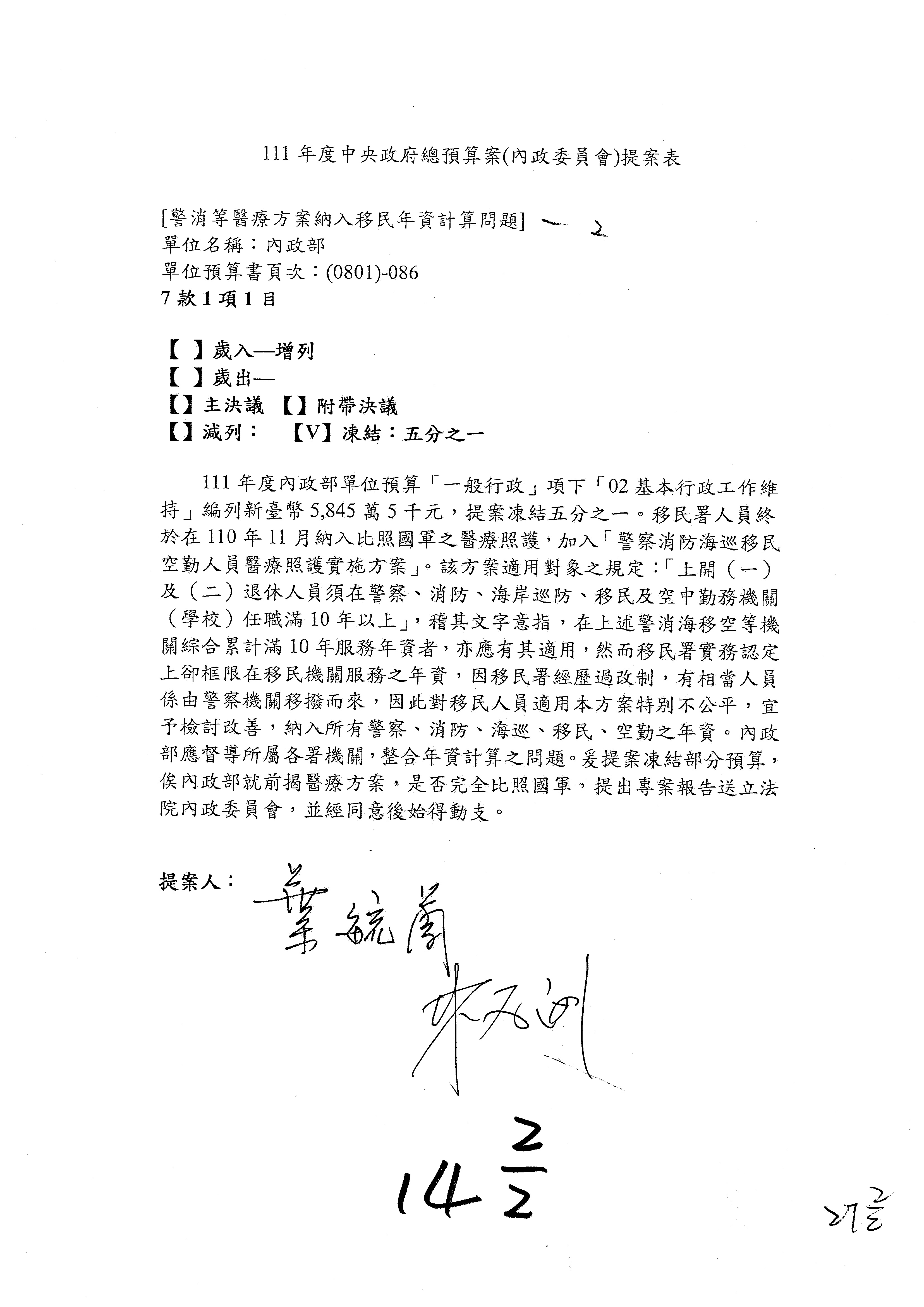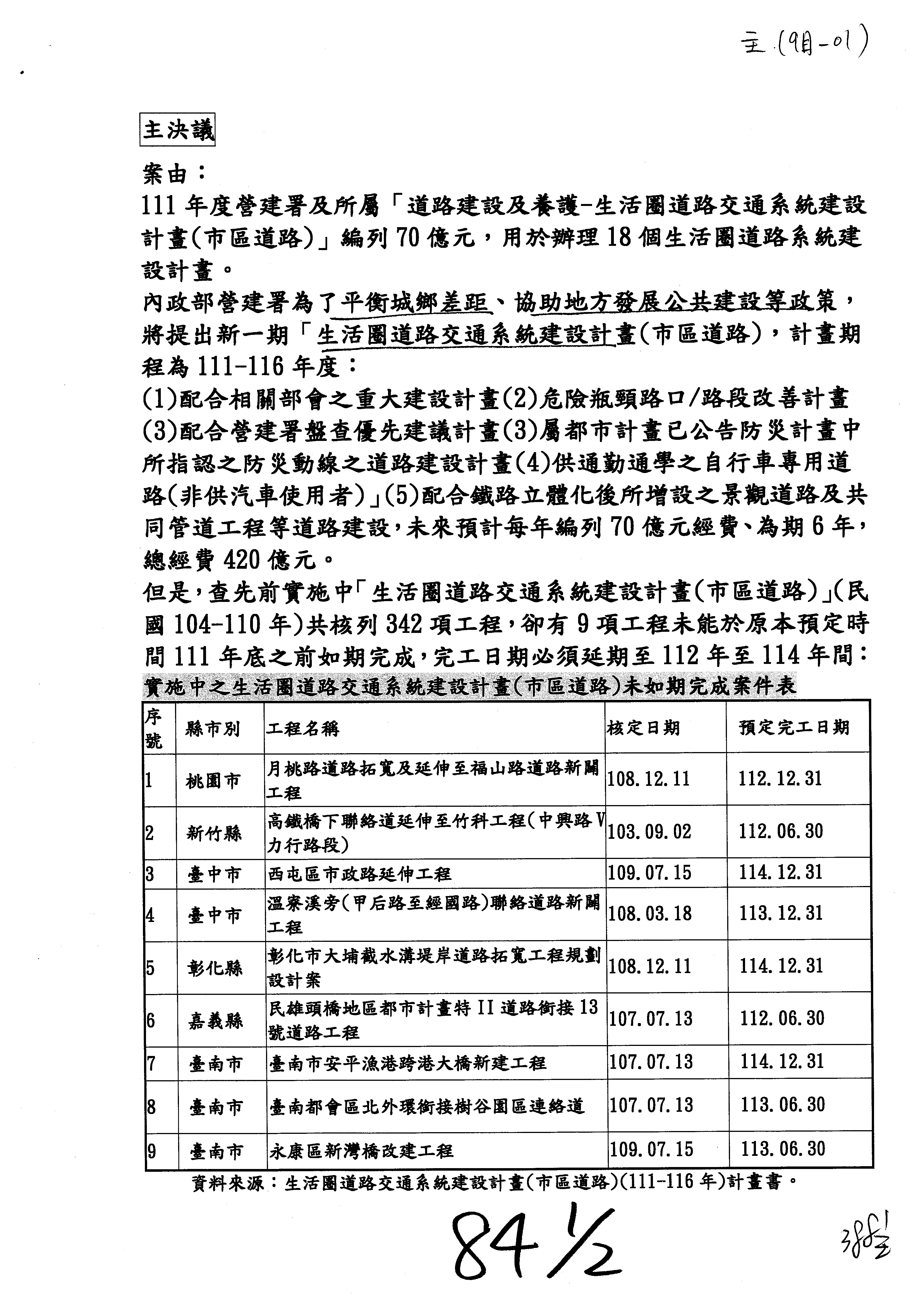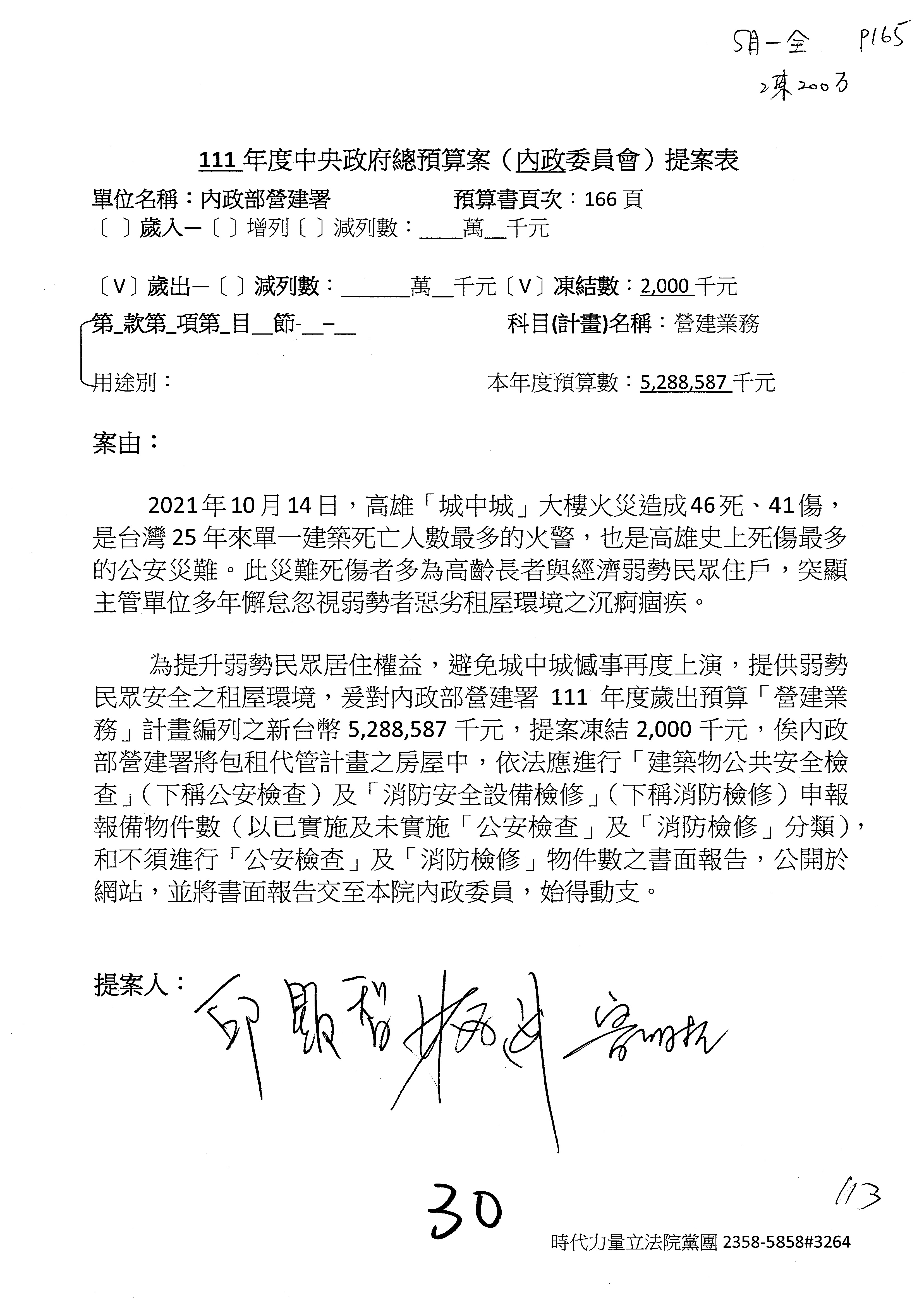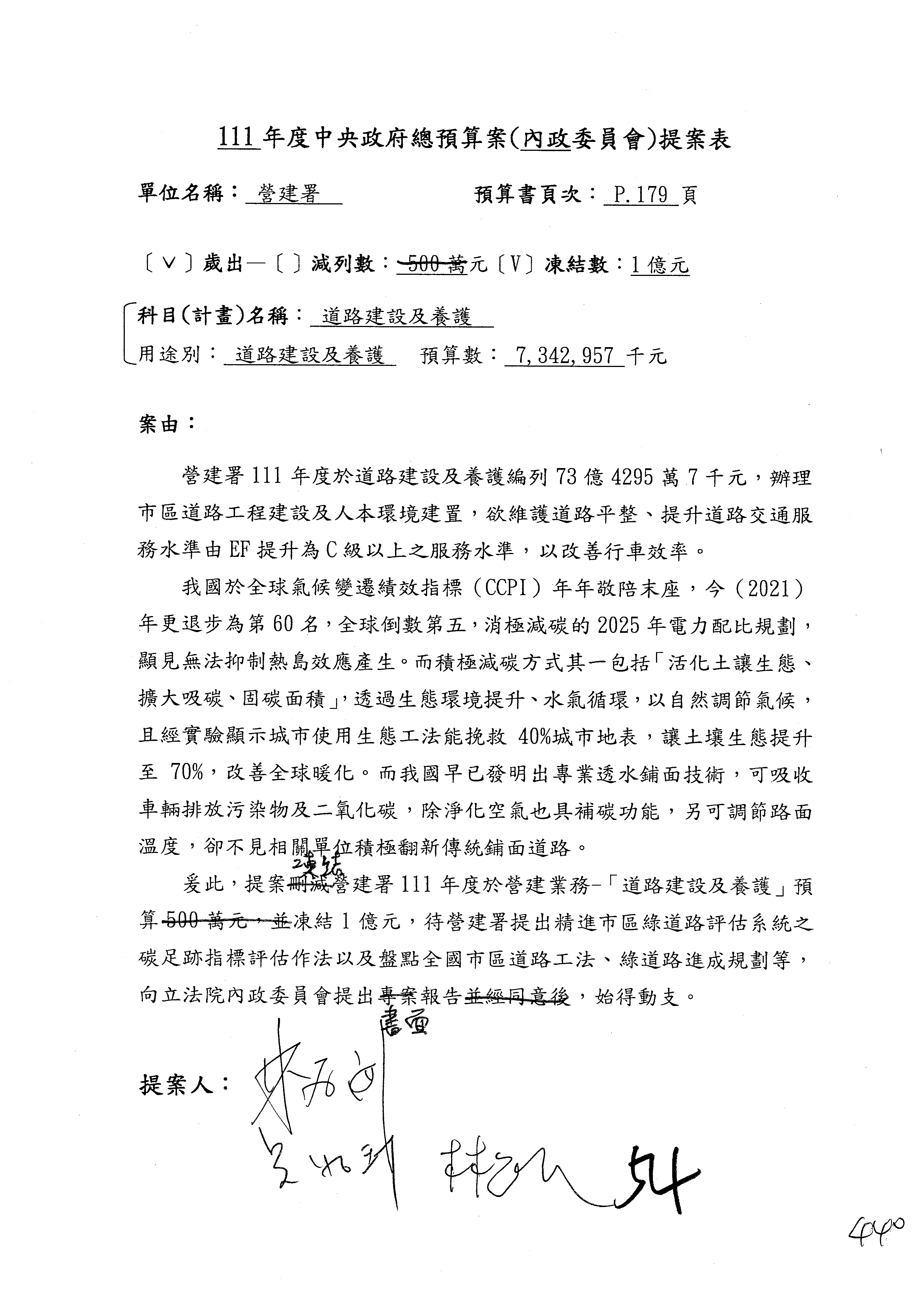 改主決議部分:第15案第一句「111年度……提案凍結五分之一。」等文字、倒數第三行「爰提案凍結部分預算,」等文字均予刪除,「專案報告」改為「書面報告」,「,並經同意後始得動支」等文字予以刪除,其餘文字照案通過。