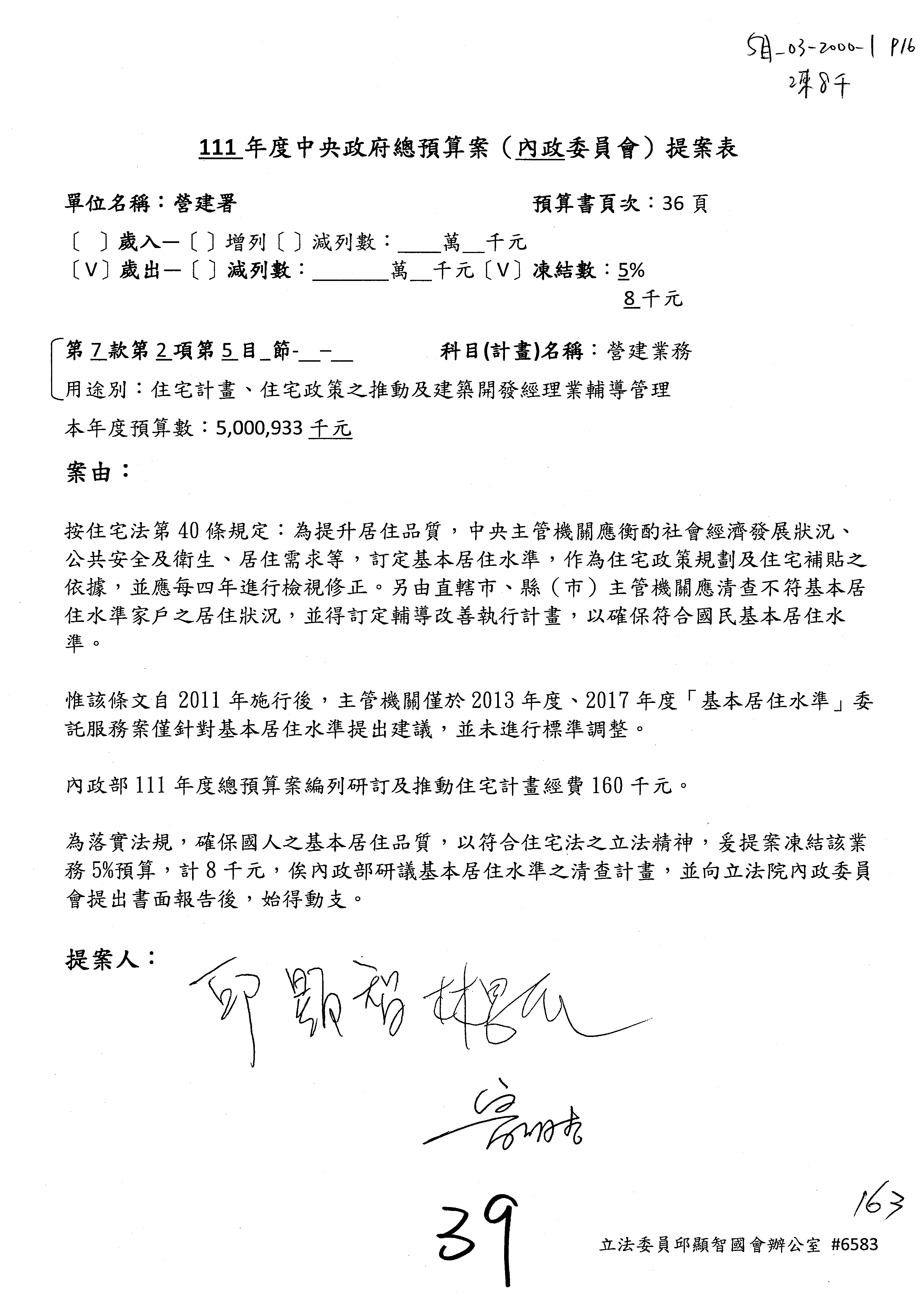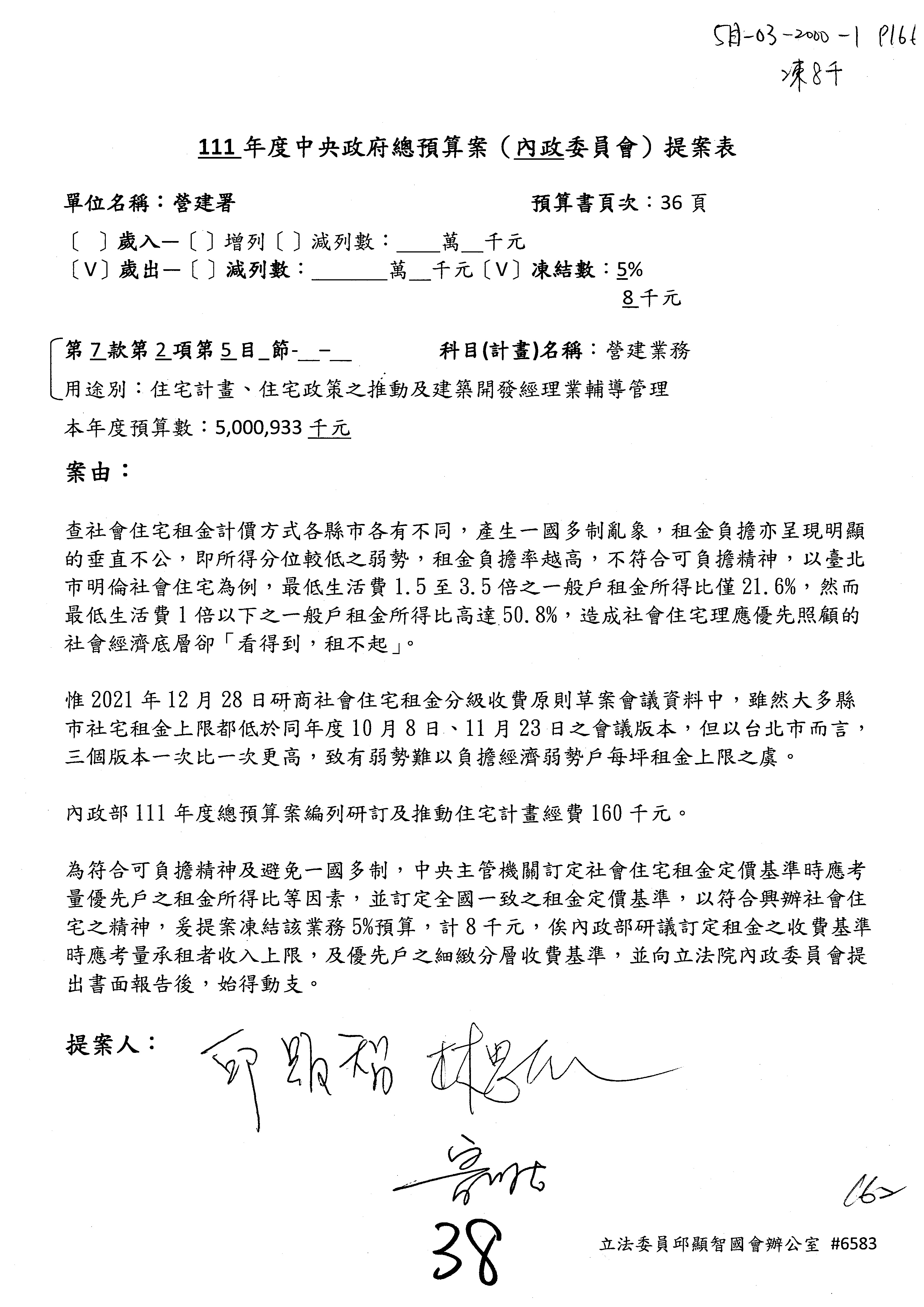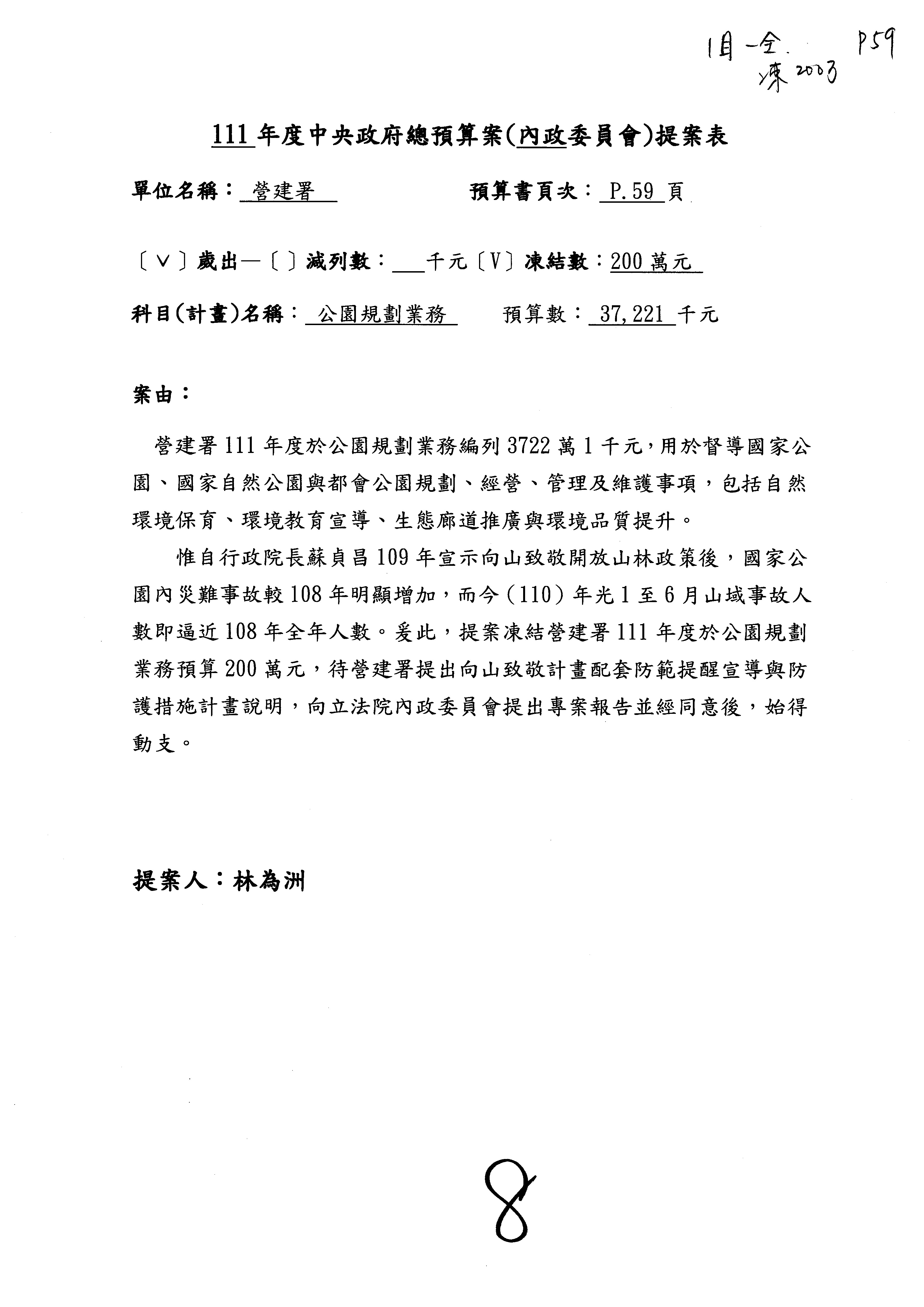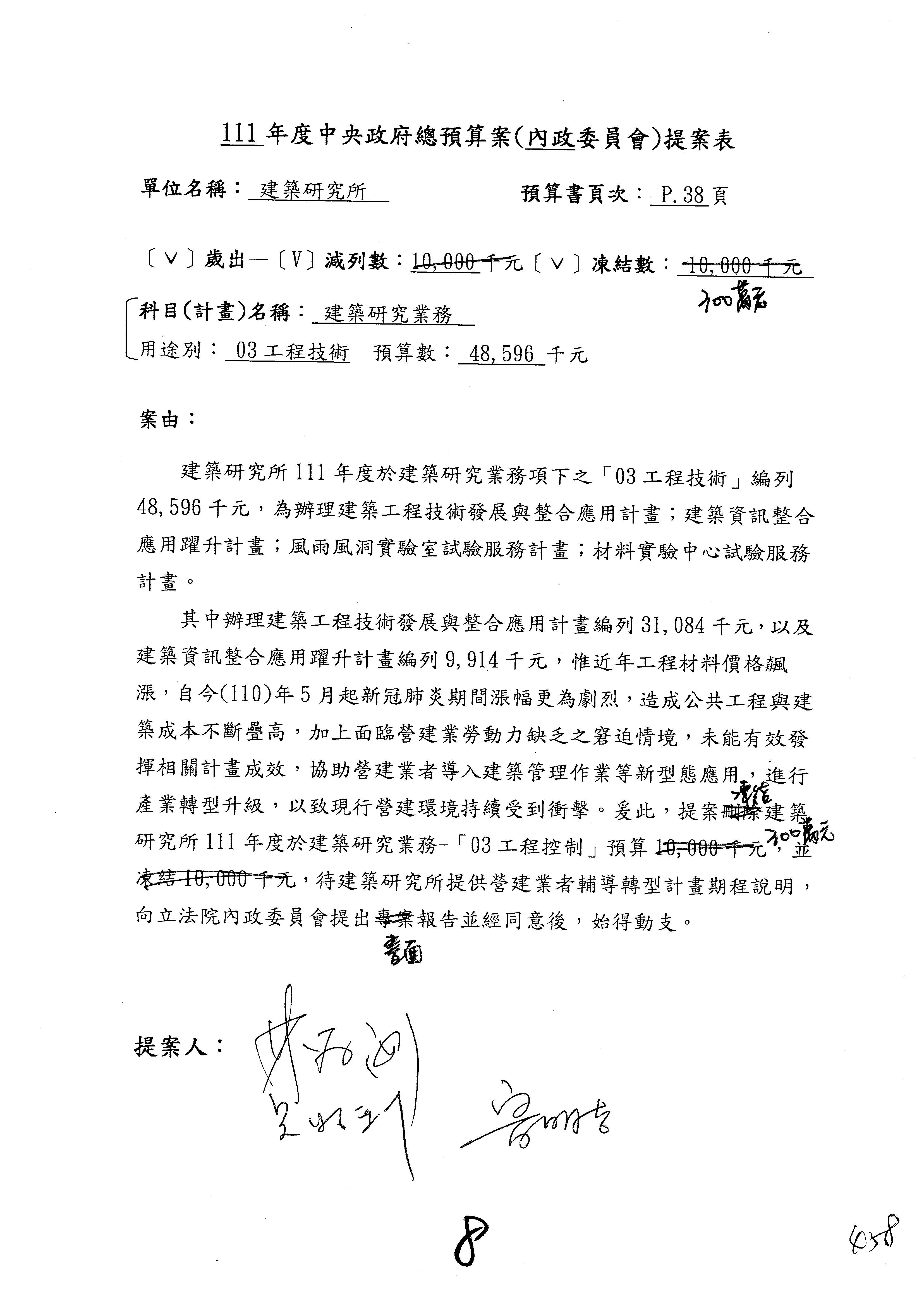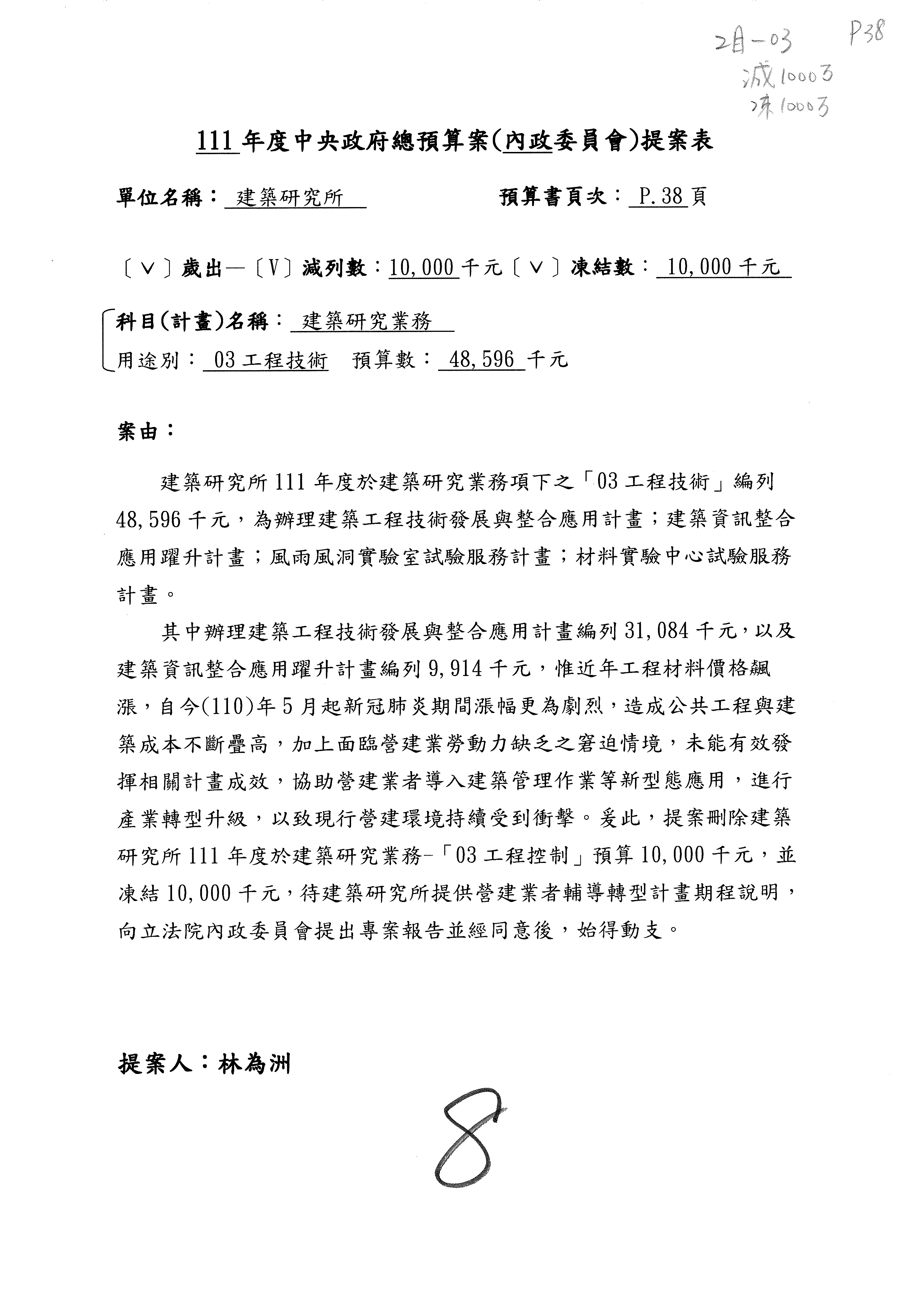 處理第8案。「工程技術」減列1,000萬元、凍結1,000萬元。