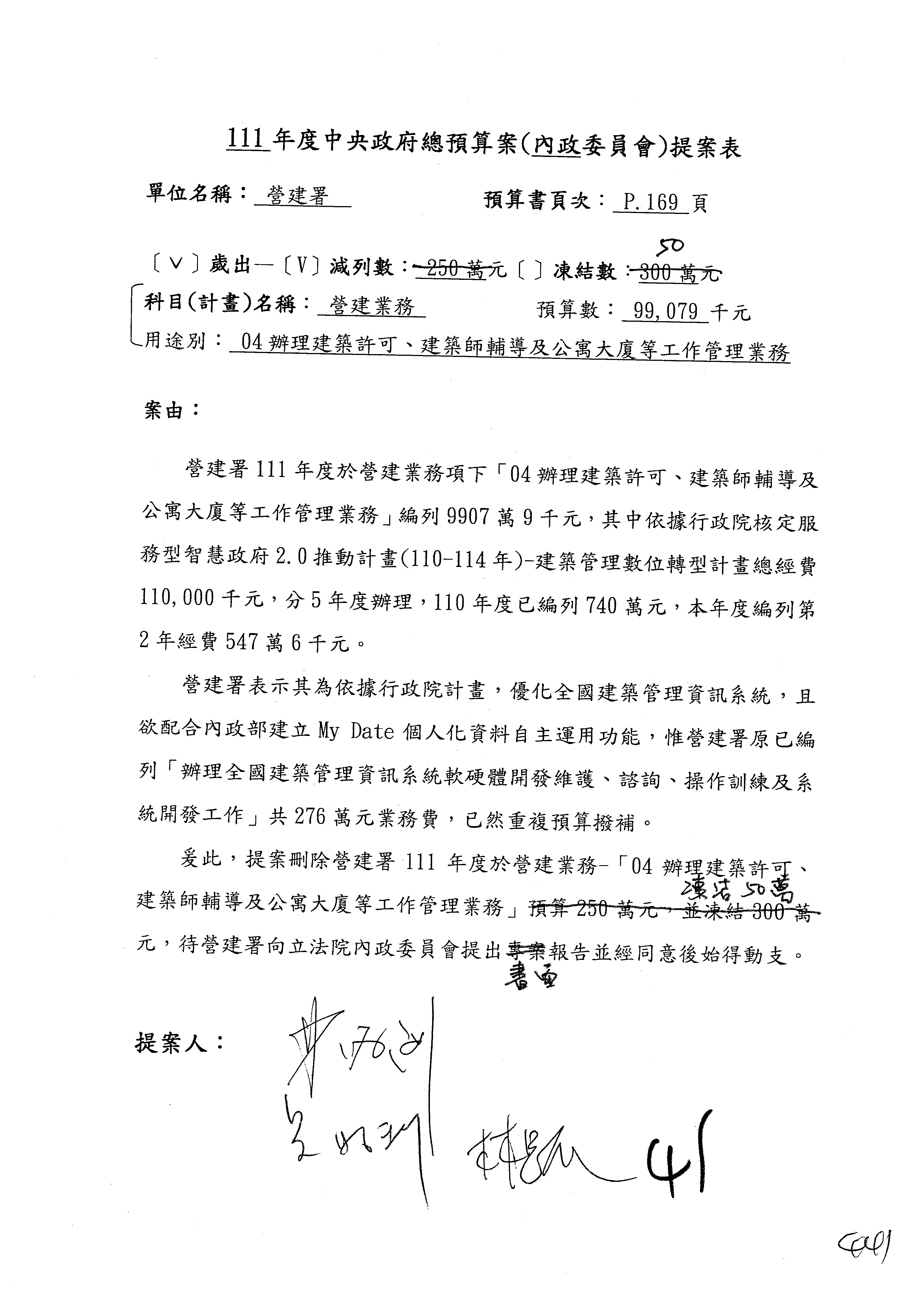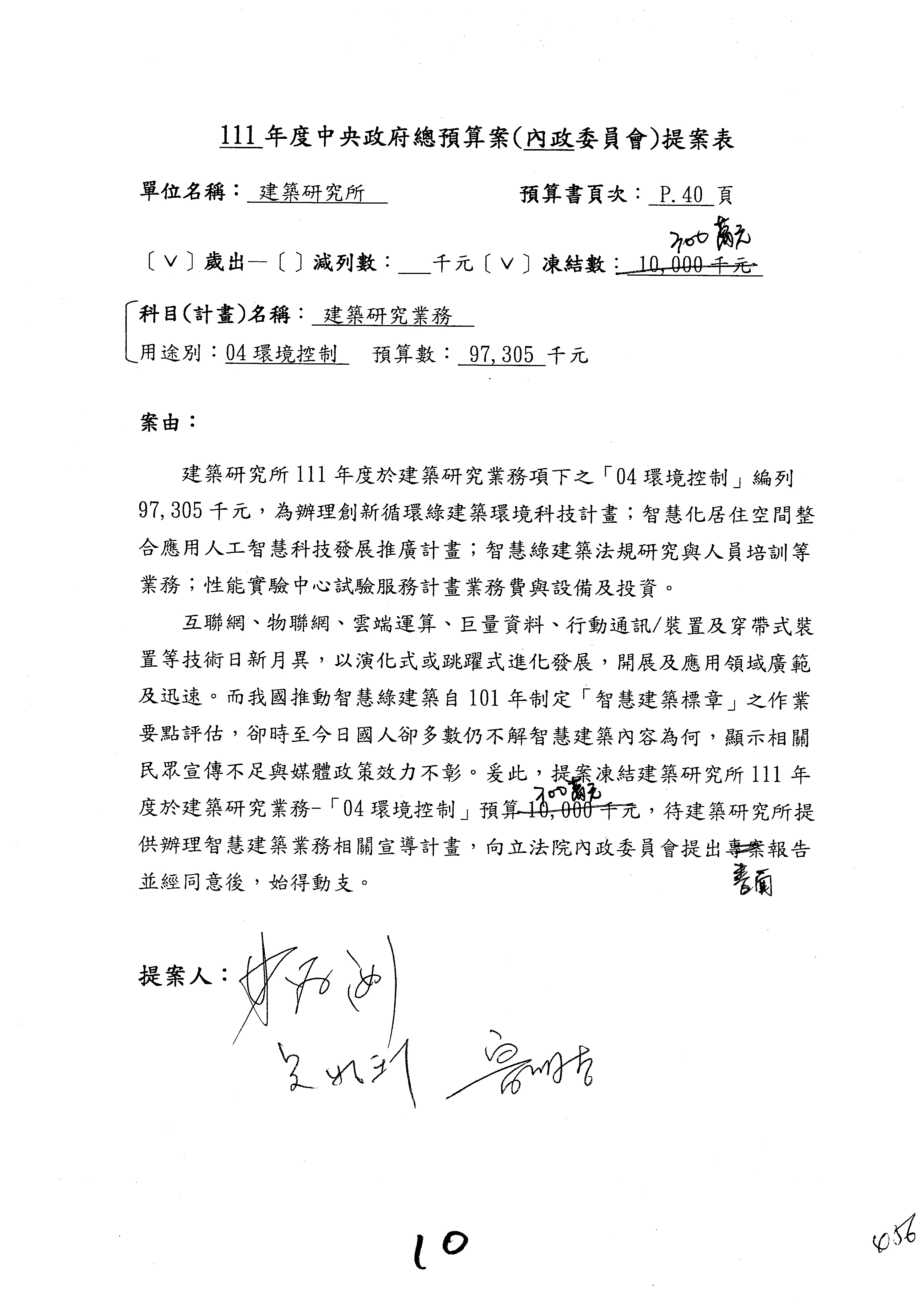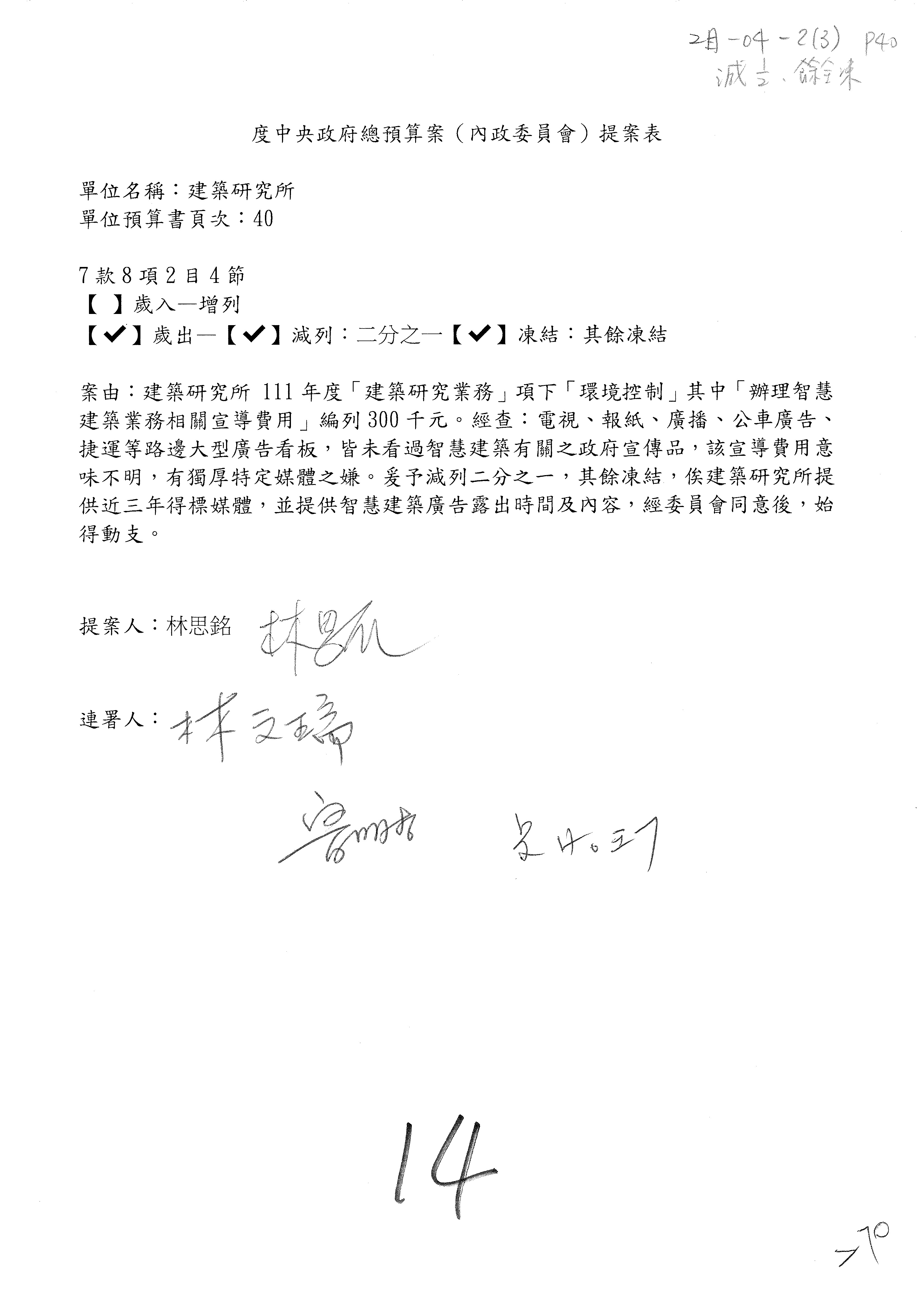 歲入部分,委員無相關提案,預算照列。歲出部分,通案第1案至第4案合併處理,凍結10萬元,書面報告;第1目一般行政,委員無相關提案,預算照列;第2目建築研究業務第5案至第14案,第5案、第6案合併處理,凍結50萬元,書面報告,第7案改為主決議,第8案凍結300萬元,書面報告,第9案至第13案,合併處理,凍結20萬元,書面報告,第14案撤案;第3目第一預備金,委員無相關提案,預算照列。