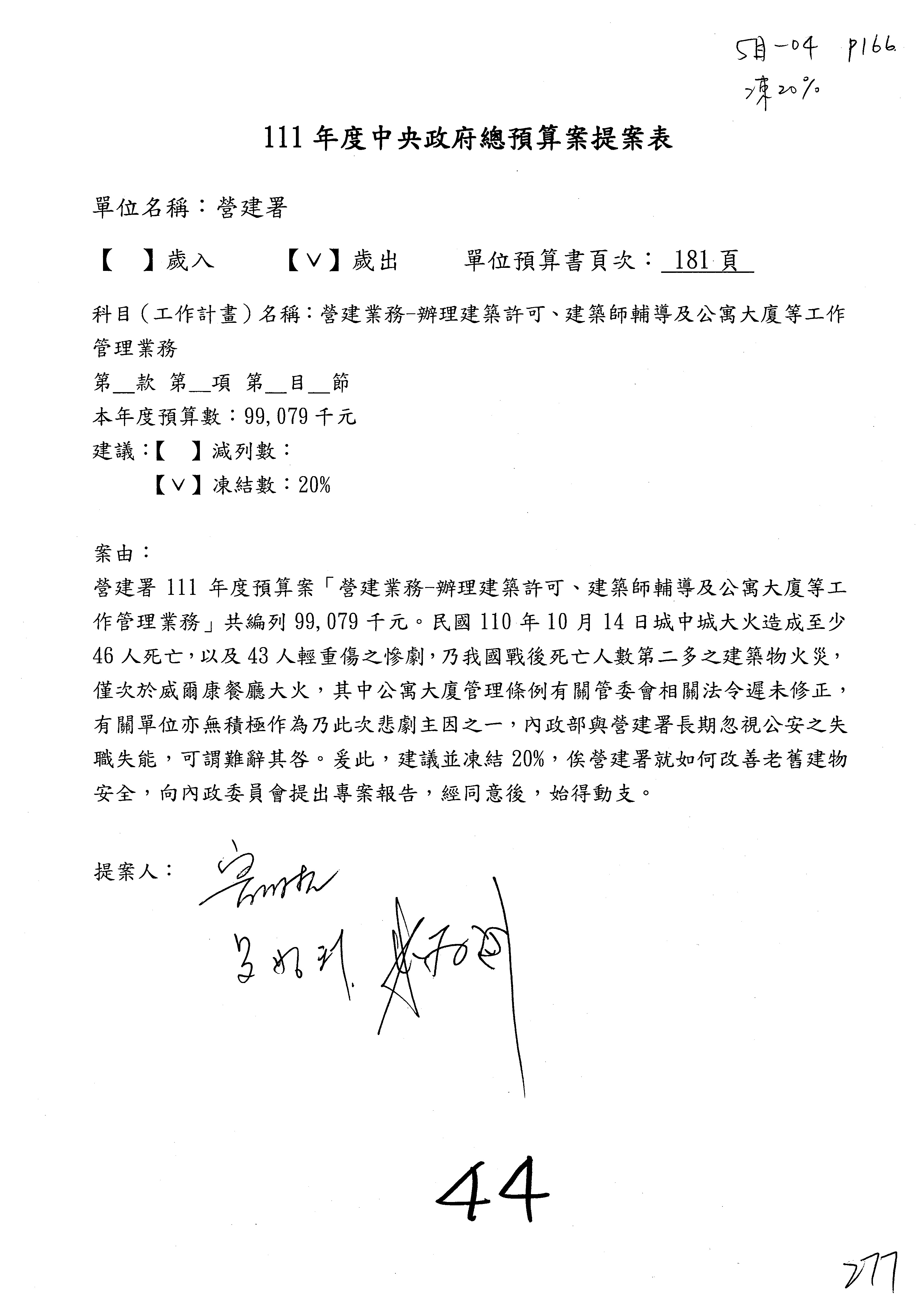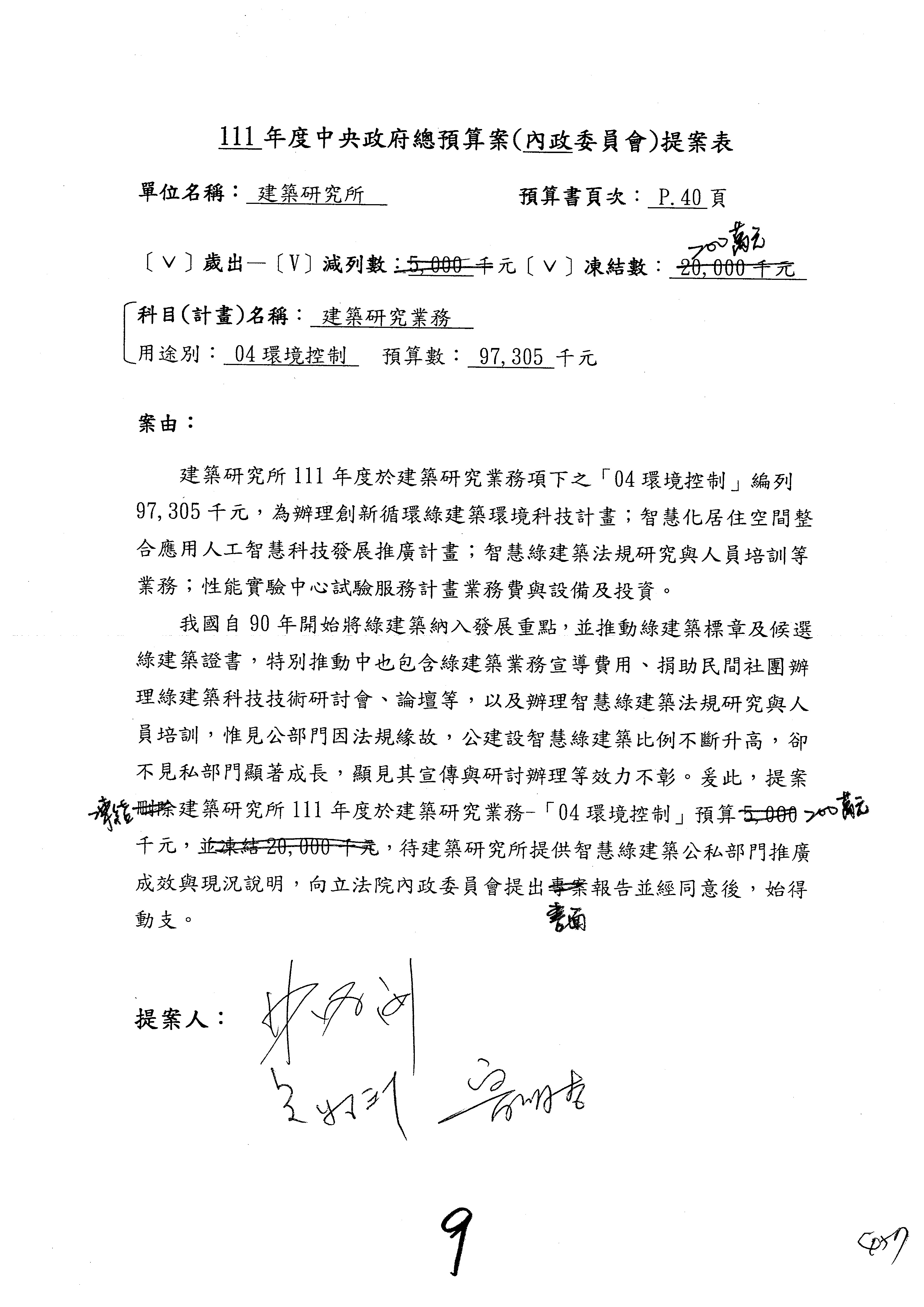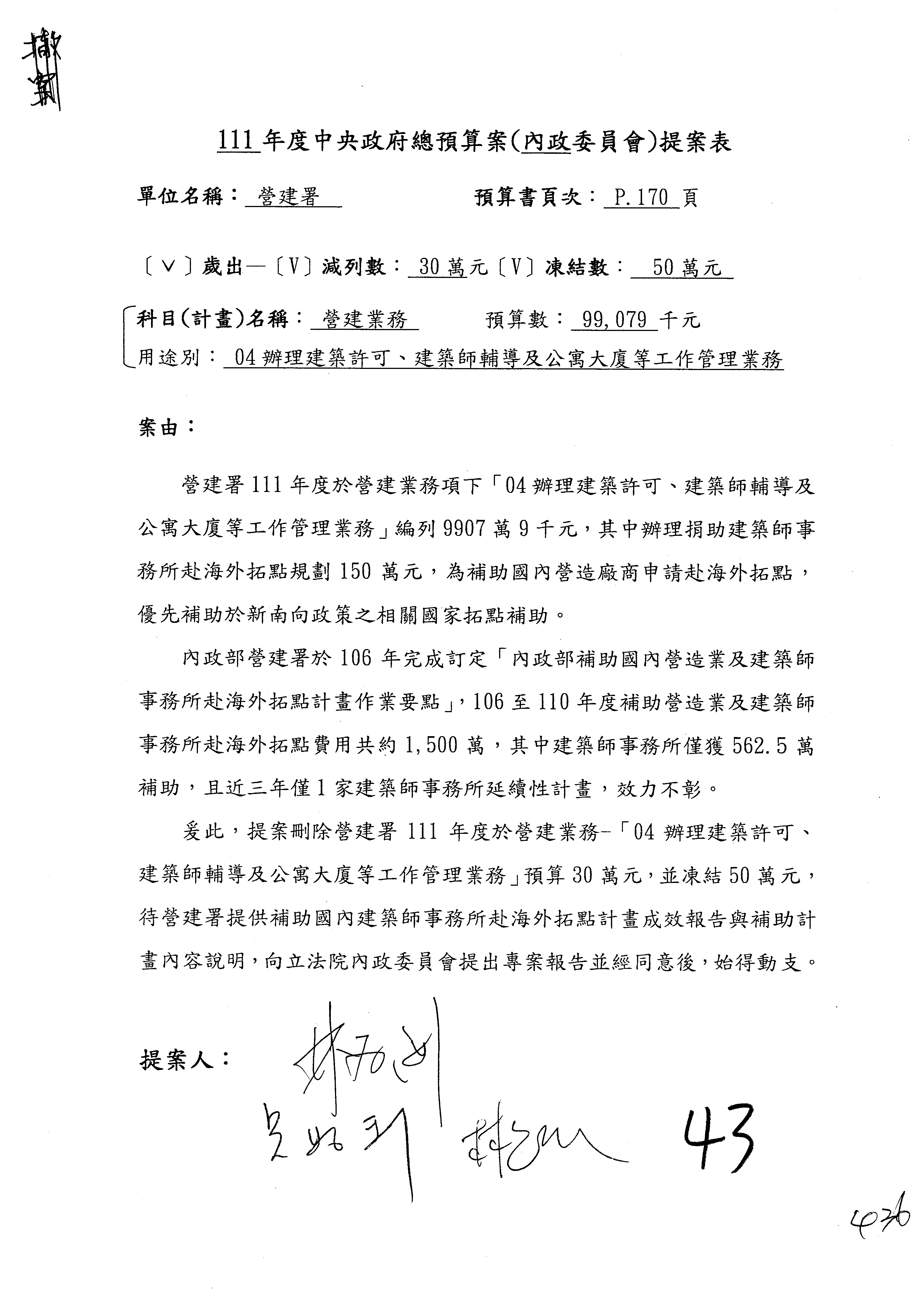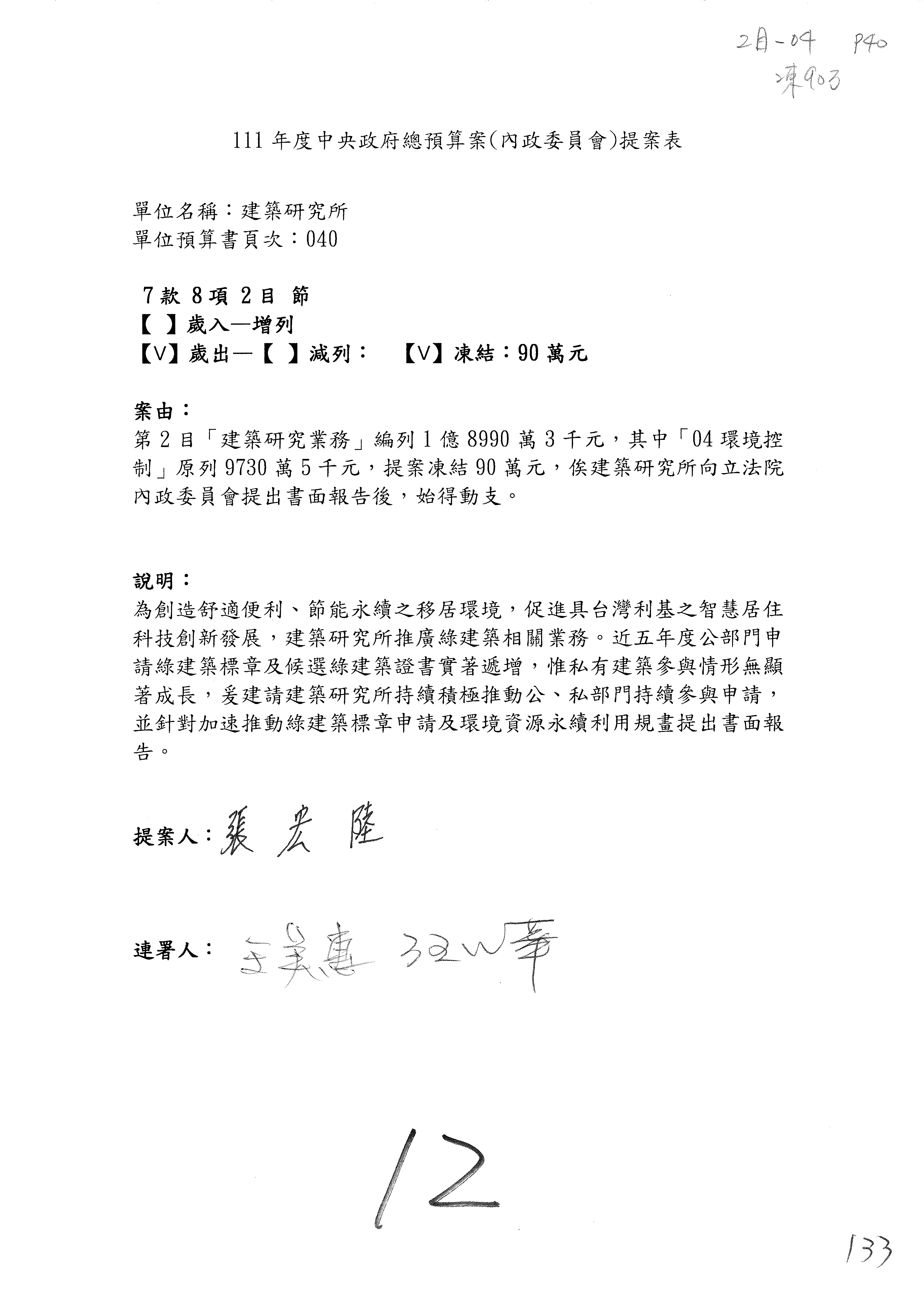 歲入部分,委員無相關提案,預算照列。歲出部分,通案第1案至第4案合併處理,凍結10萬元,書面報告;第1目一般行政,委員無相關提案,預算照列;第2目建築研究業務第5案至第14案,第5案、第6案合併處理,凍結50萬元,書面報告,第7案改為主決議,第8案凍結300萬元,書面報告,第9案至第13案,合併處理,凍結20萬元,書面報告,第14案撤案;第3目第一預備金,委員無相關提案,預算照列。