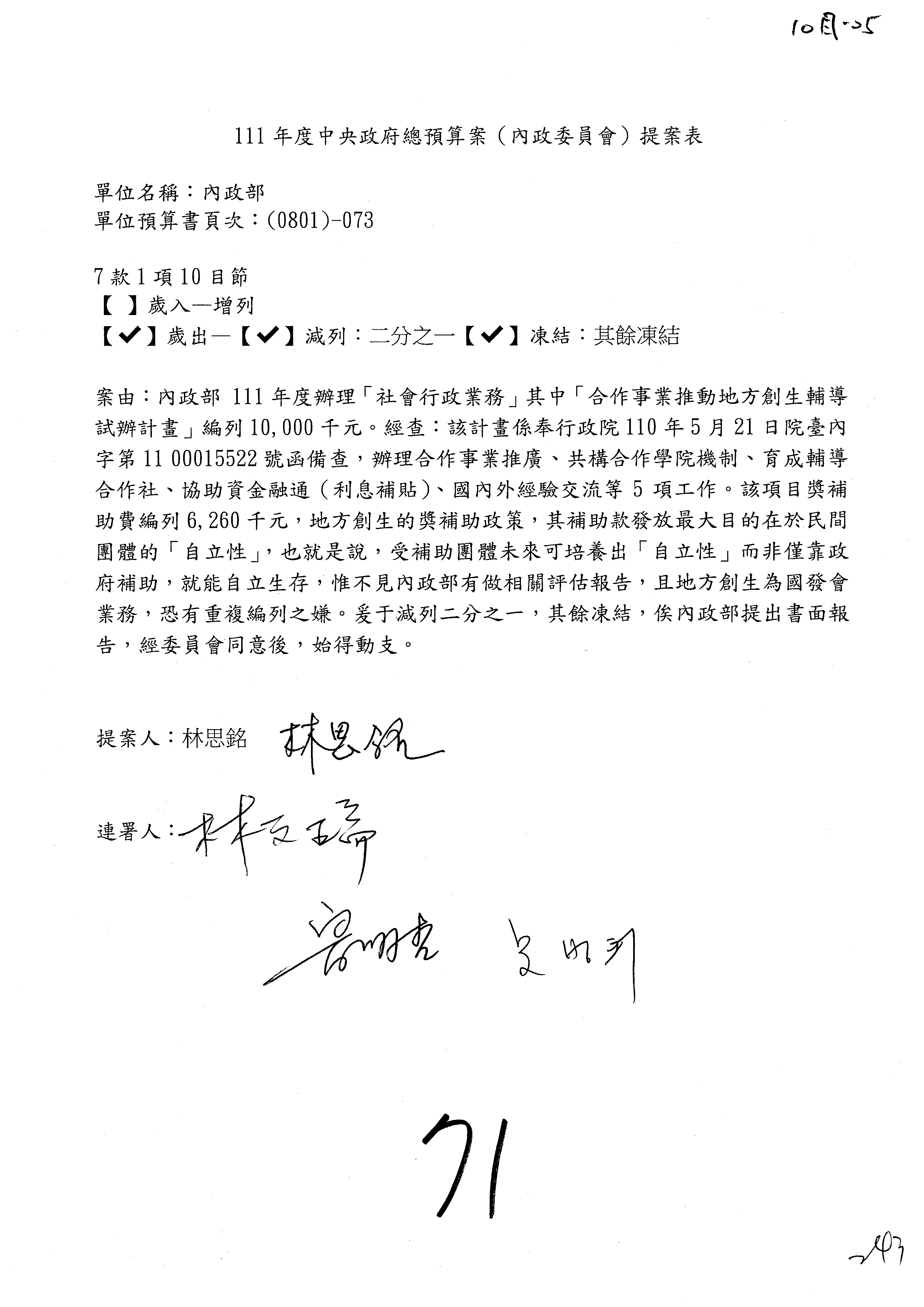 第71案倒數第三行後段之「且地方創生……始得動支」等文字修正為「爰請內政部針對試辦計畫實施期程、具體措施及預期效益,向立法院內政委員會提出書面報告」,其餘文字照案通過。