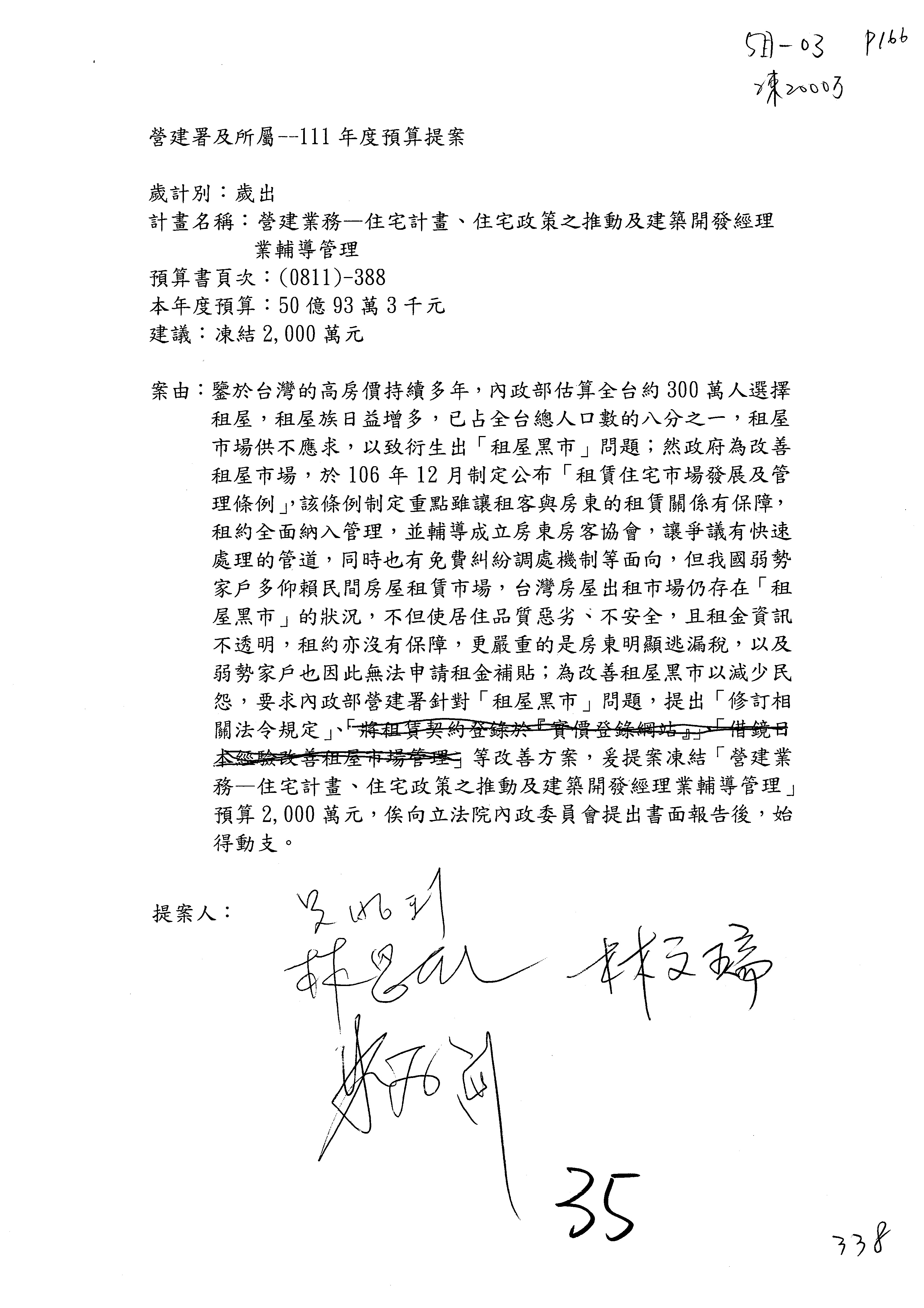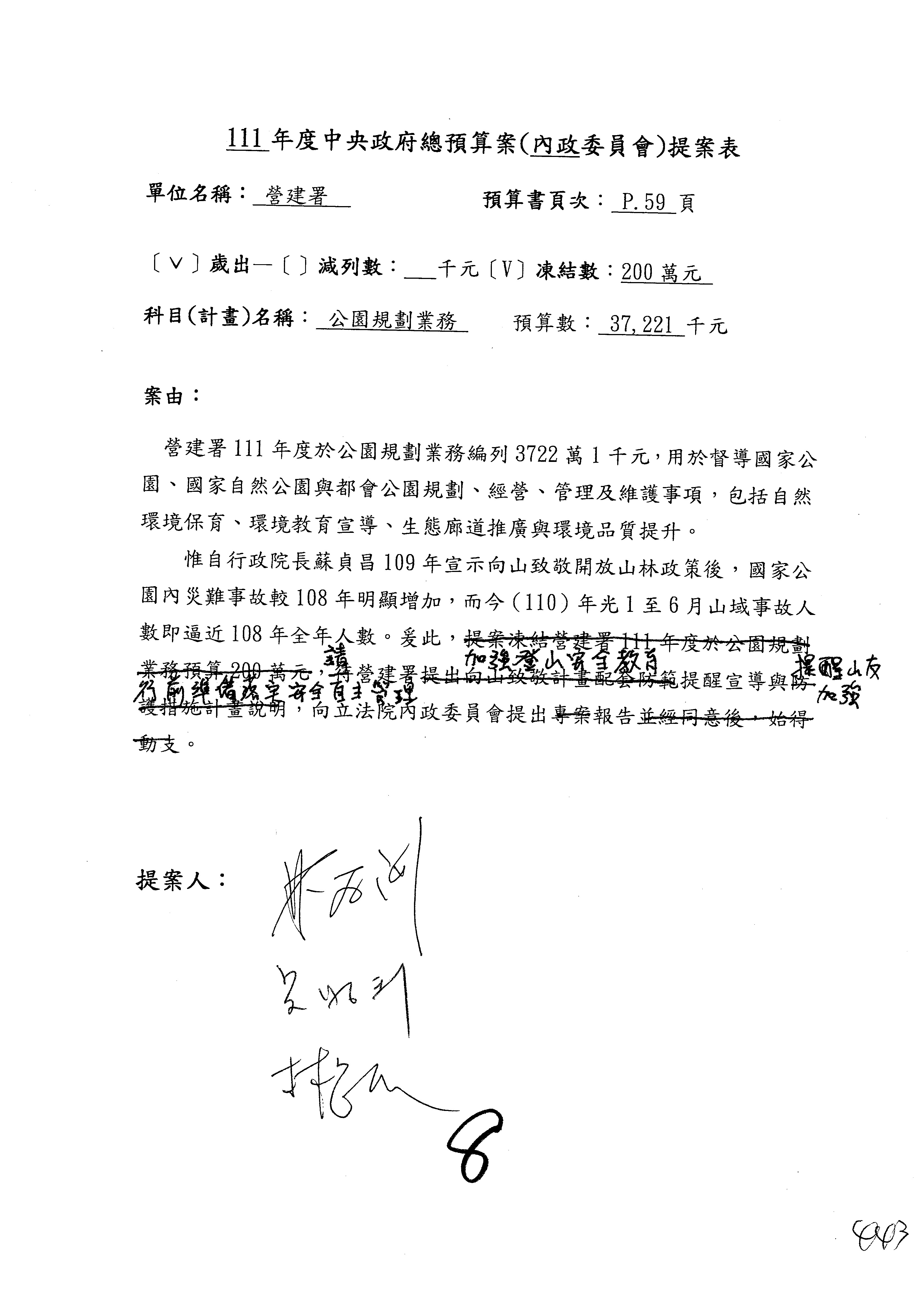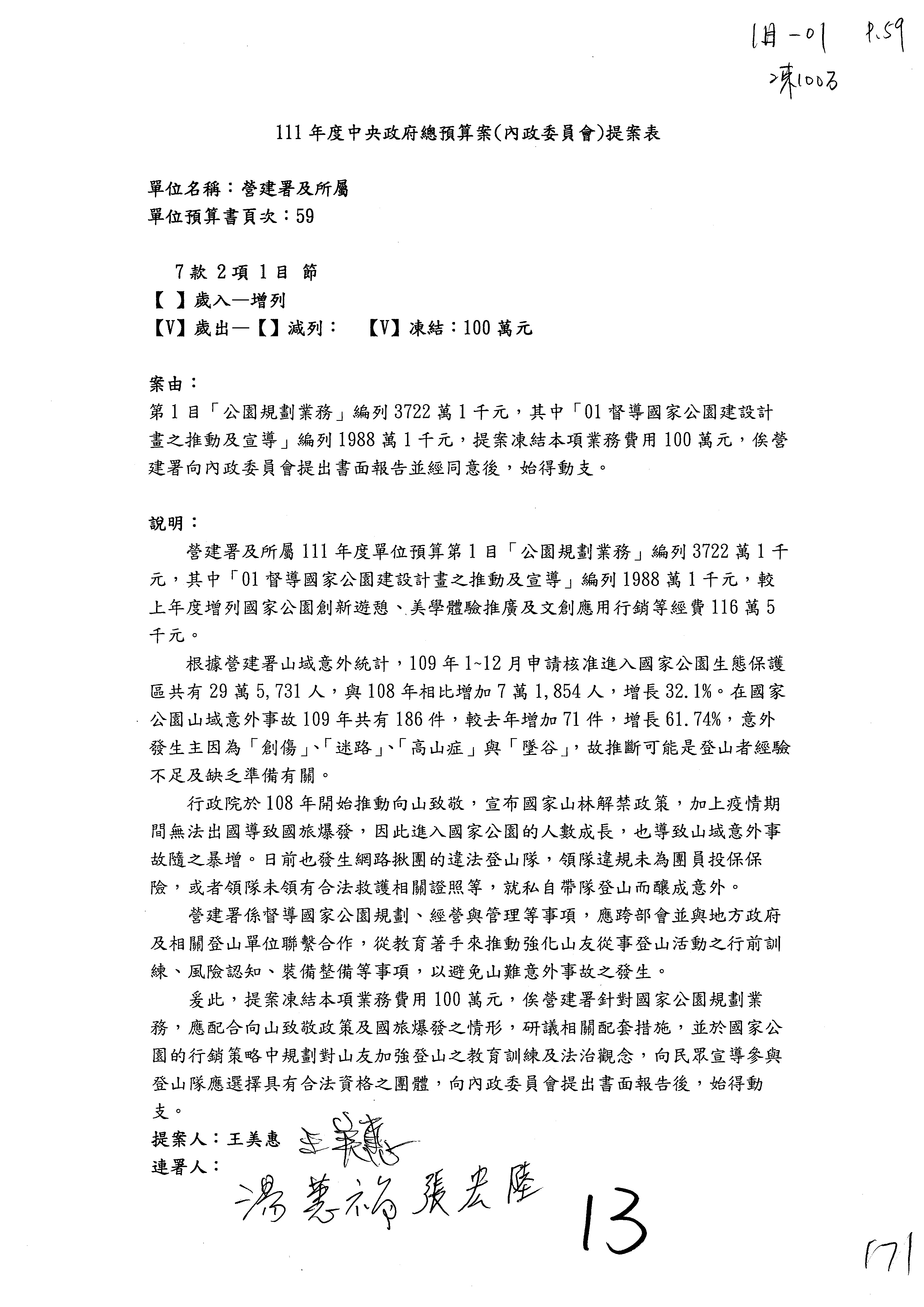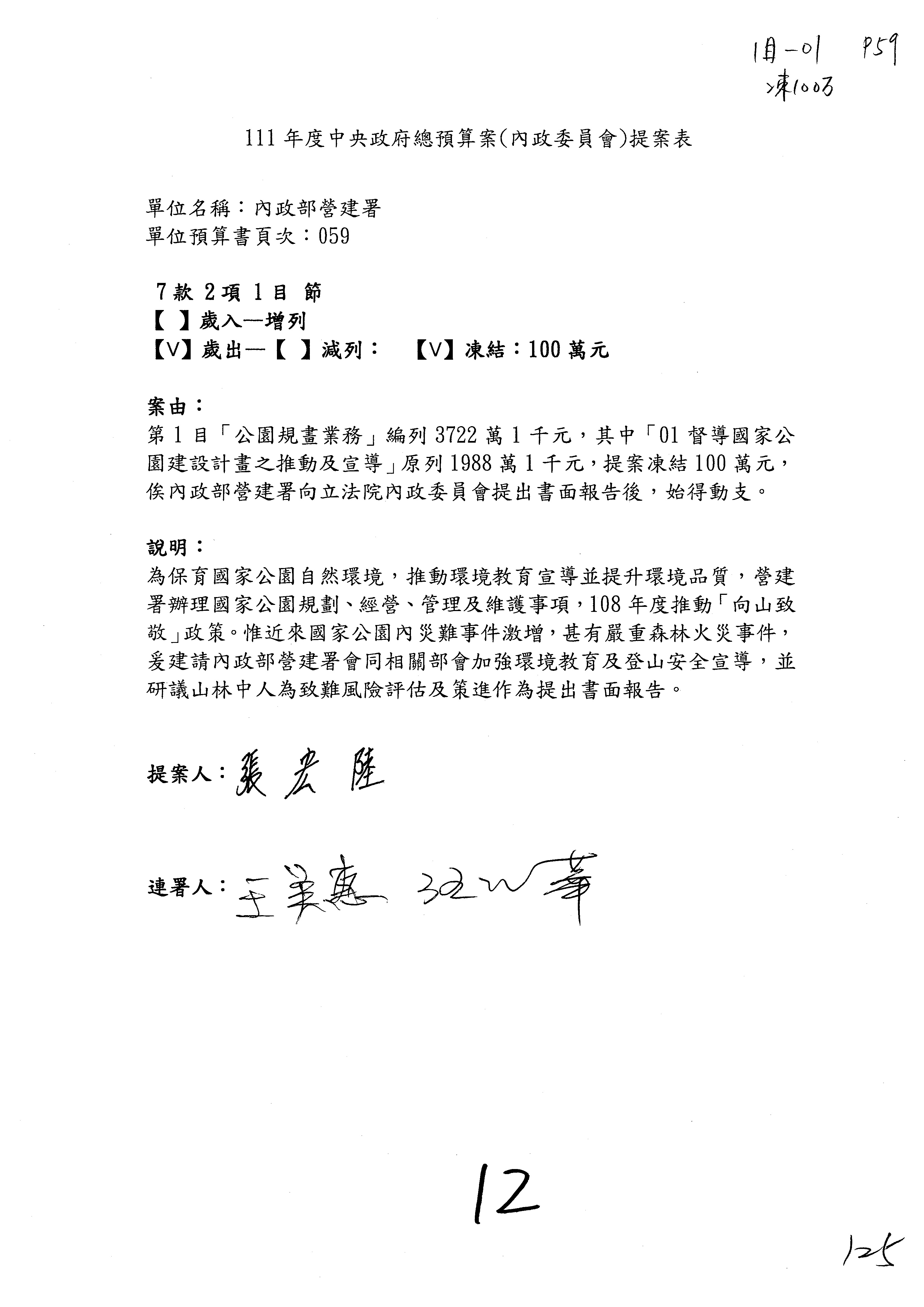 主席:書面答復都要針對個別委員的提案內容做不同的答復。那就併案到第9案到第12案裡,等於是第9案到第13案合併凍結200萬元,向個別委員提書面報告後,始得動支。