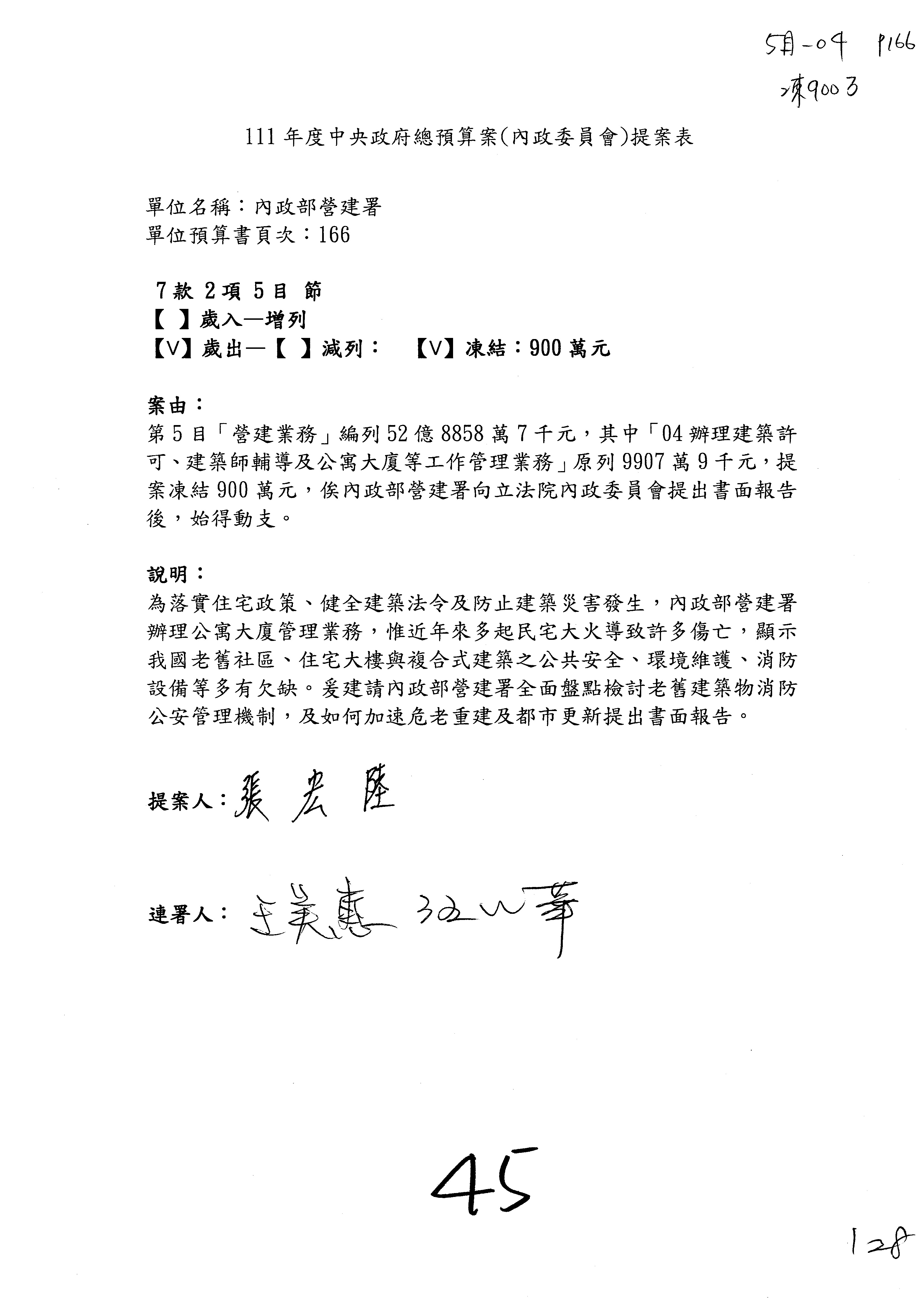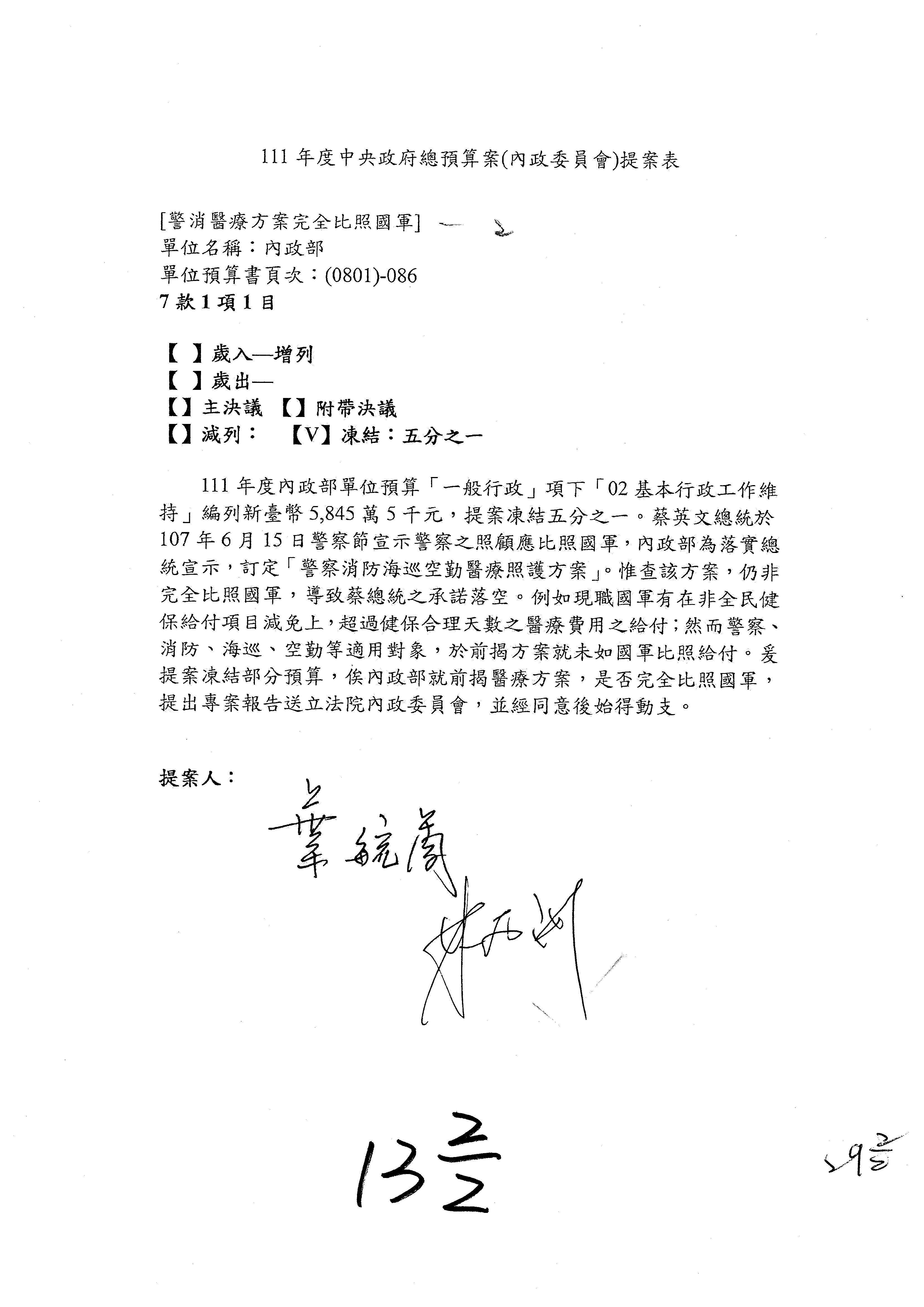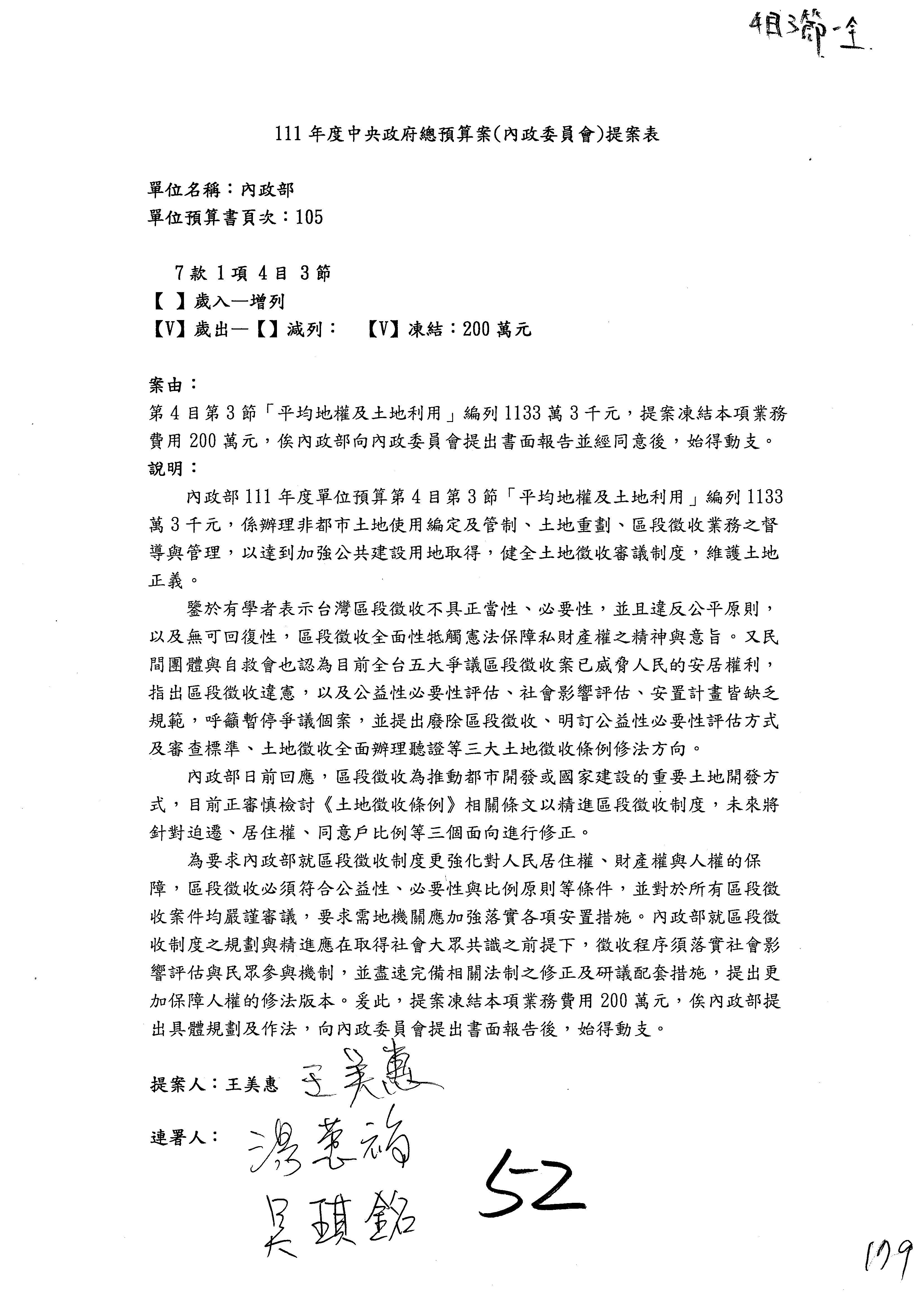 主席:書面答復都要針對個別委員的提案內容做不同的答復。那就併案到第9案到第12案裡,等於是第9案到第13案合併凍結200萬元,向個別委員提書面報告後,始得動支。