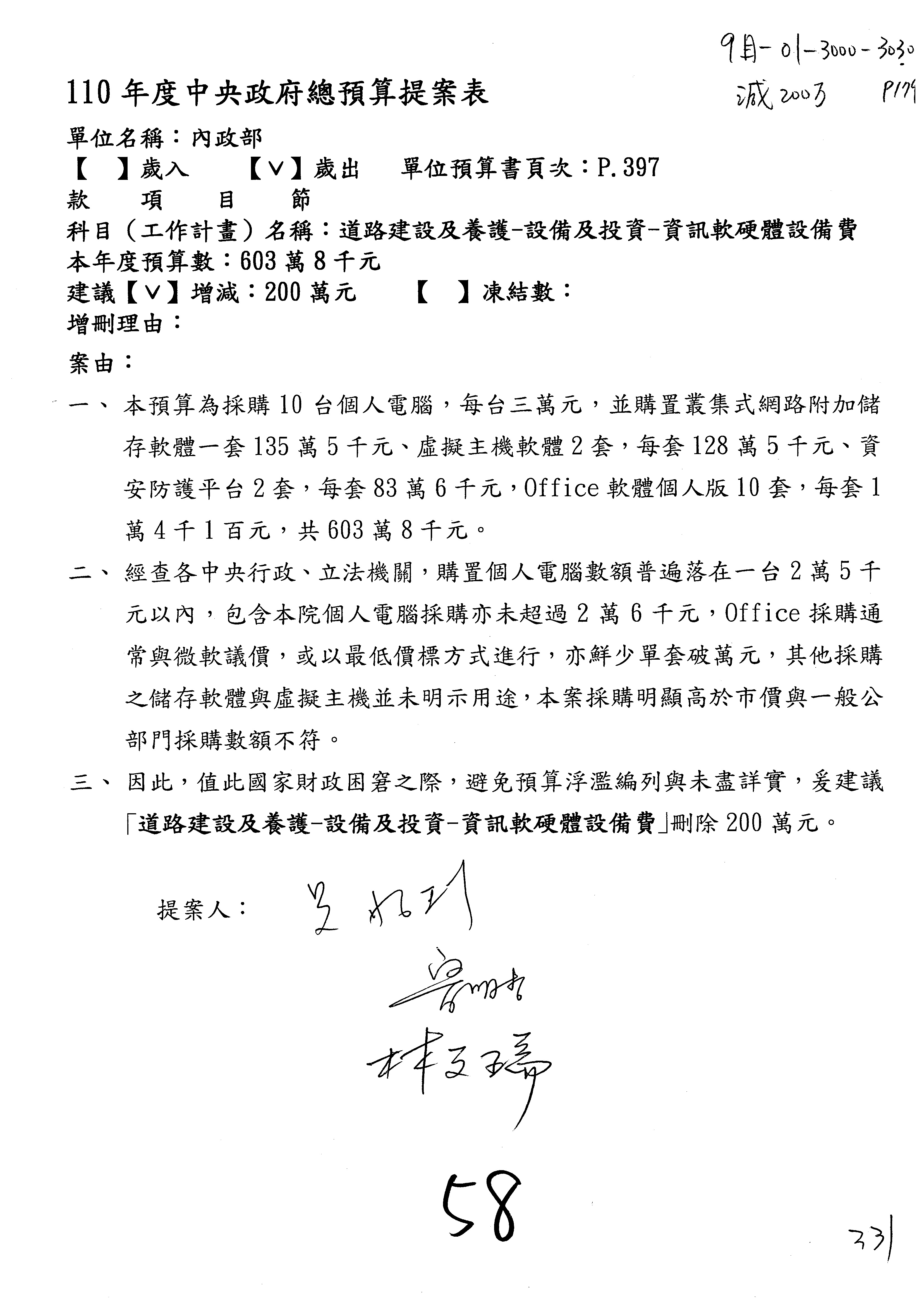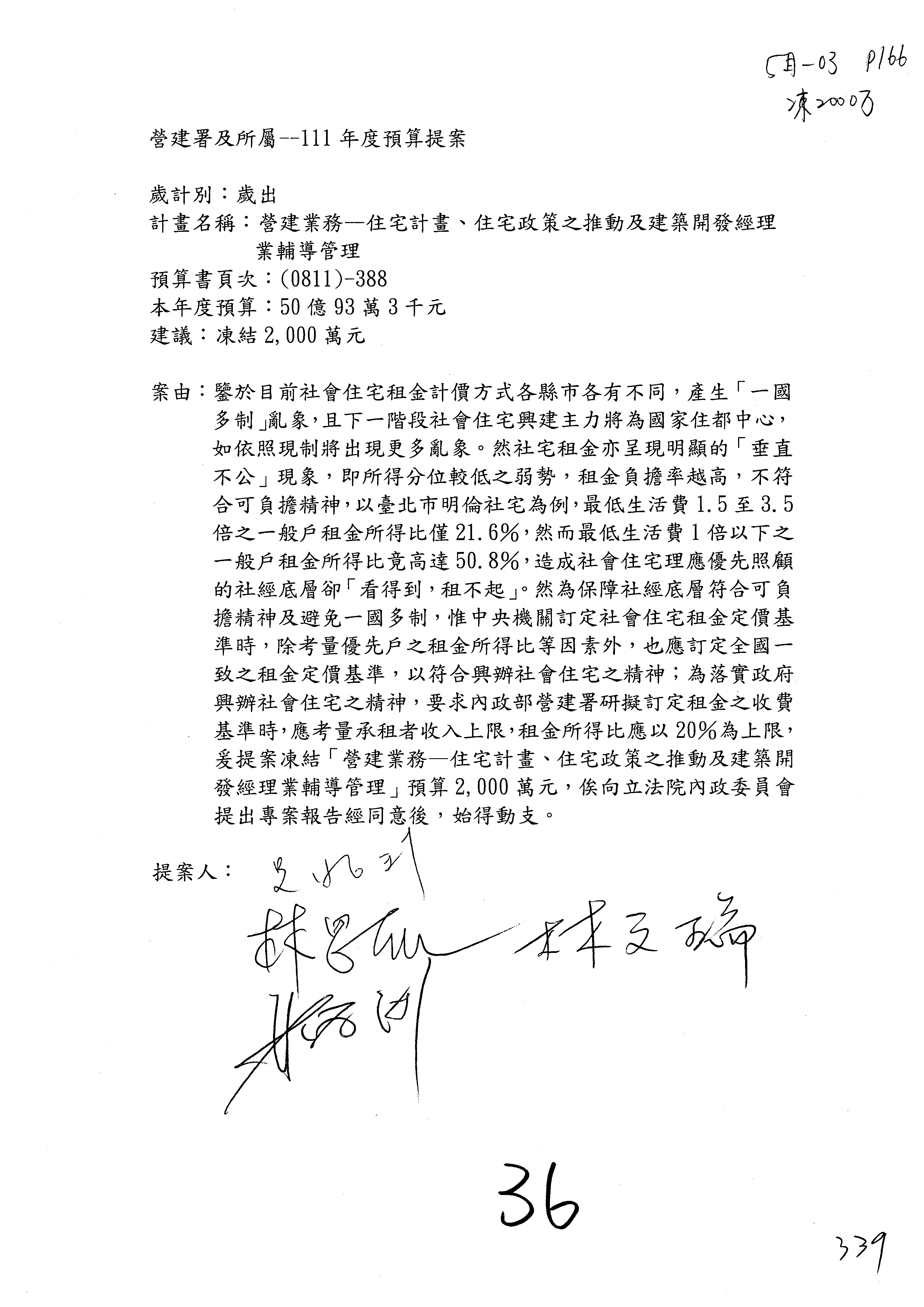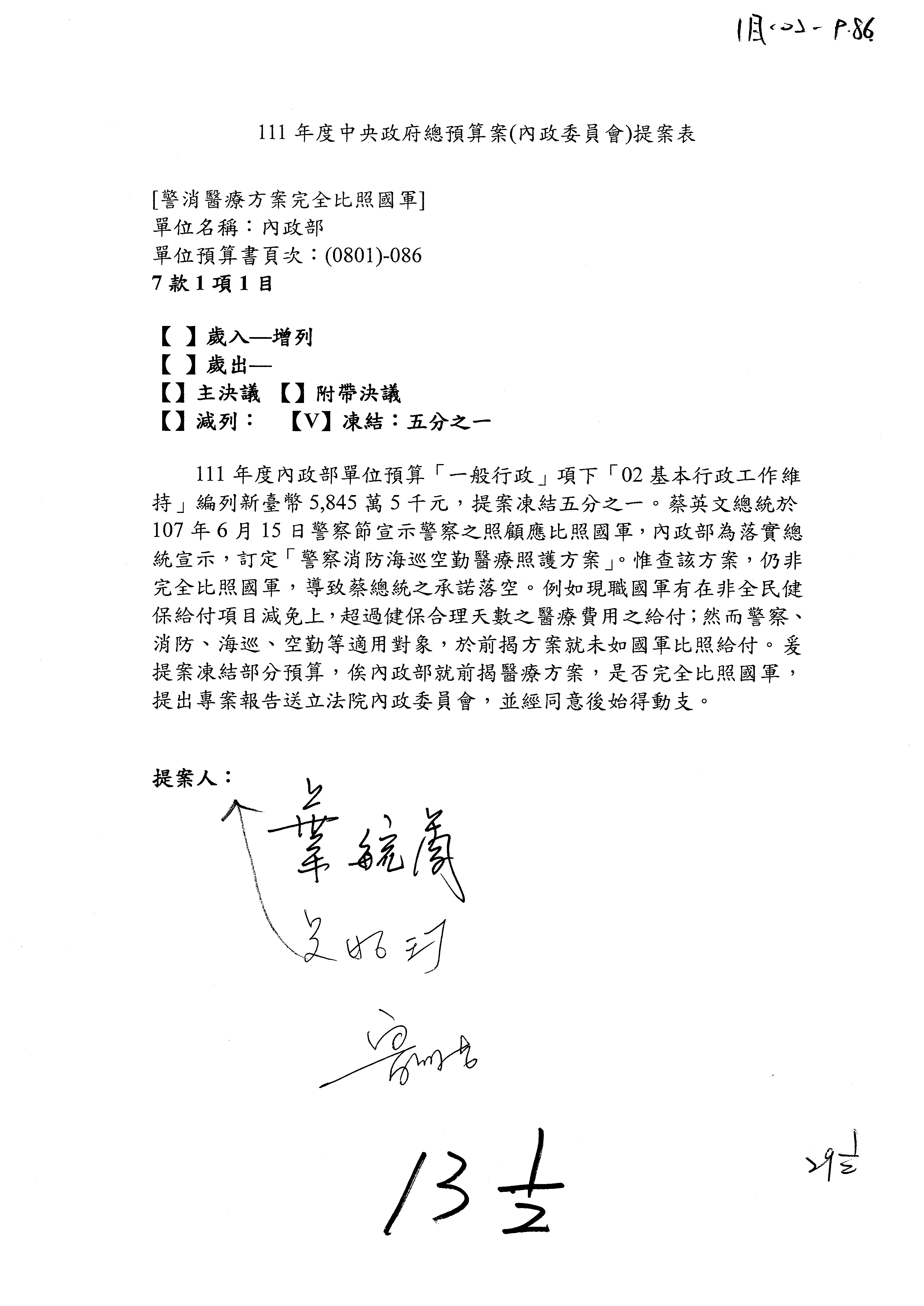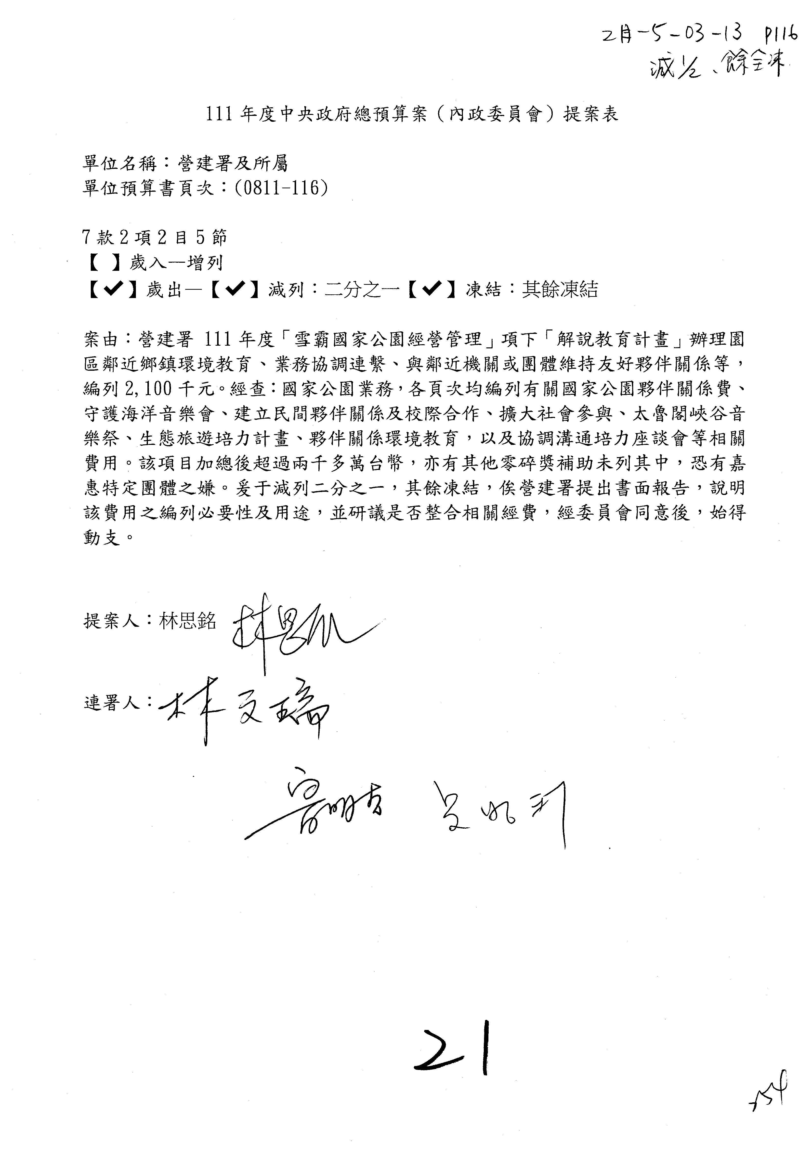主席:書面答復都要針對個別委員的提案內容做不同的答復。那就併案到第9案到第12案裡,等於是第9案到第13案合併凍結200萬元,向個別委員提書面報告後,始得動支。