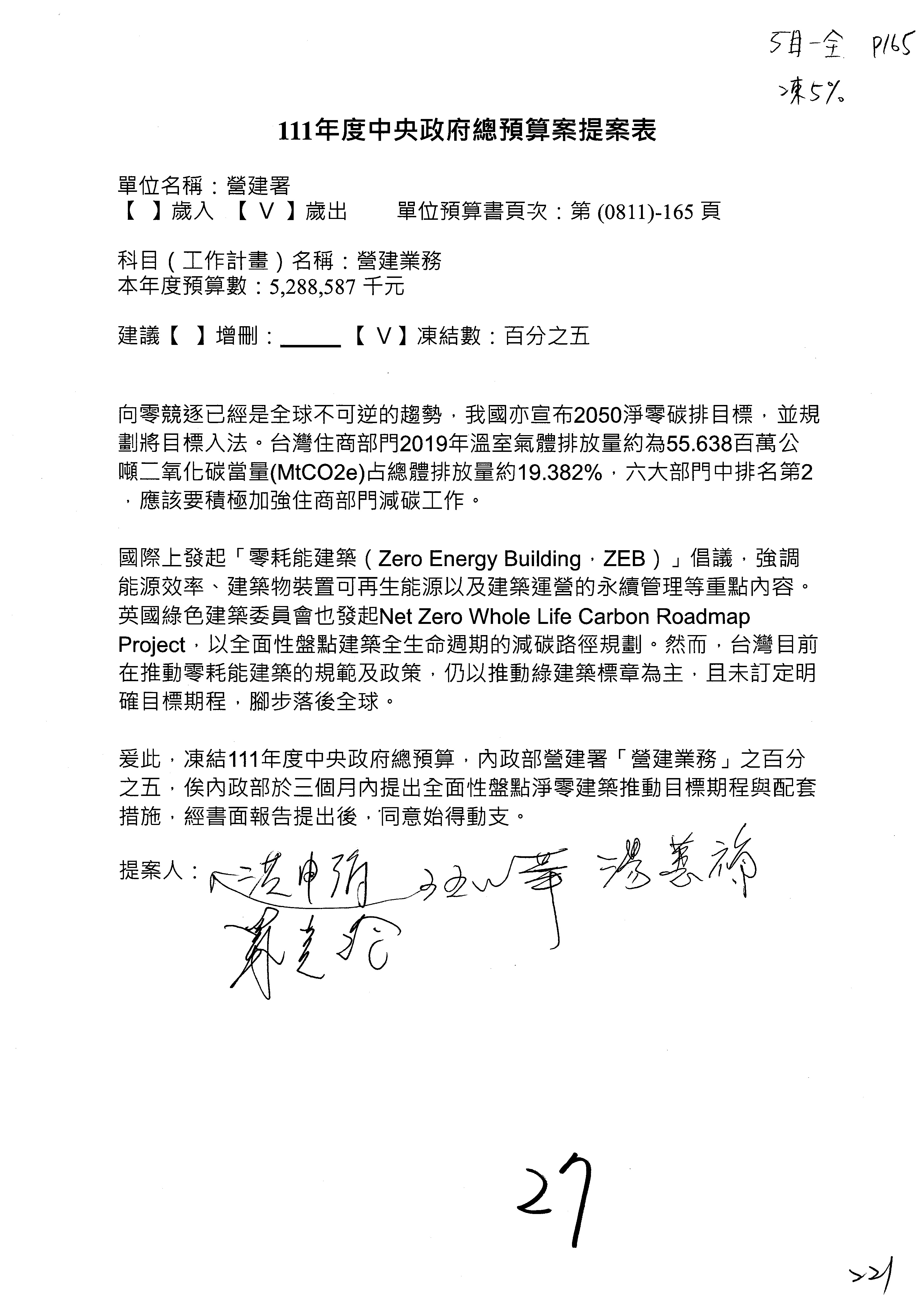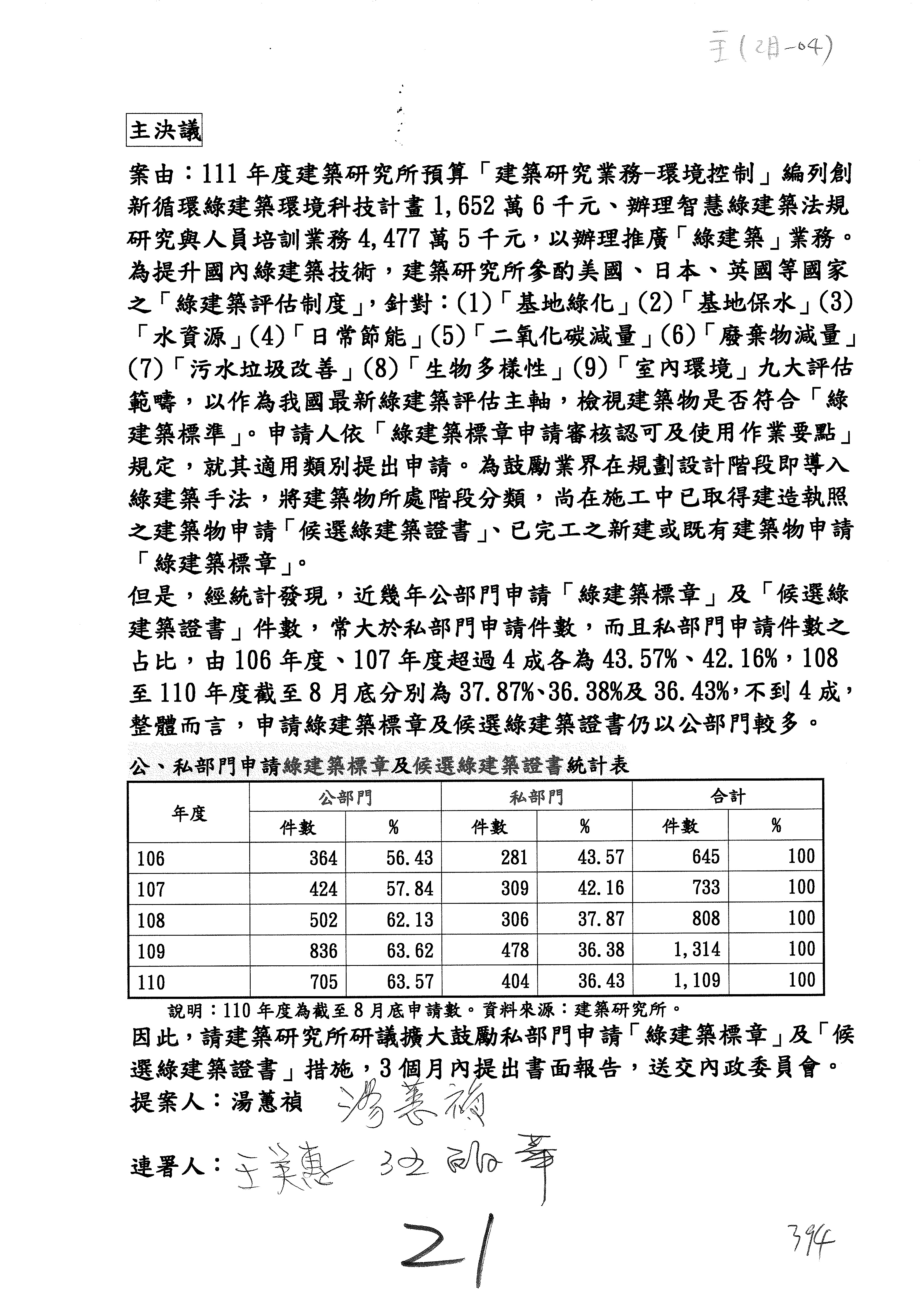 魯委員明哲:我提的是第13案,主要針對綠建築環境科技計畫總共編了一千六百五十幾萬元,我提案凍結10%,你們也有來溝通過,因為我們看到一些預算中心的數字,從106年私部門申請綠建築的比例,每一年都有下降的趨勢,從106年的43.57%,一直到109年的36.38%,數據上,110年本來是36.43%,但是你們說110年好像有回升到46%。建議在過去幾年申請比例持續下降的情況下,就產業界私部門的想法,對他們而言,不光是一種標章,也不光是光榮;而對於綠建築來講,建築本身有節能省碳、資源再利用,對於當地環境非常友善,所以我希望能夠多鼓勵,然後也希望建築研究所能夠掌握並瞭解私部門的參加意願,至於總體要怎麼樣去做處理,尊重主席。
