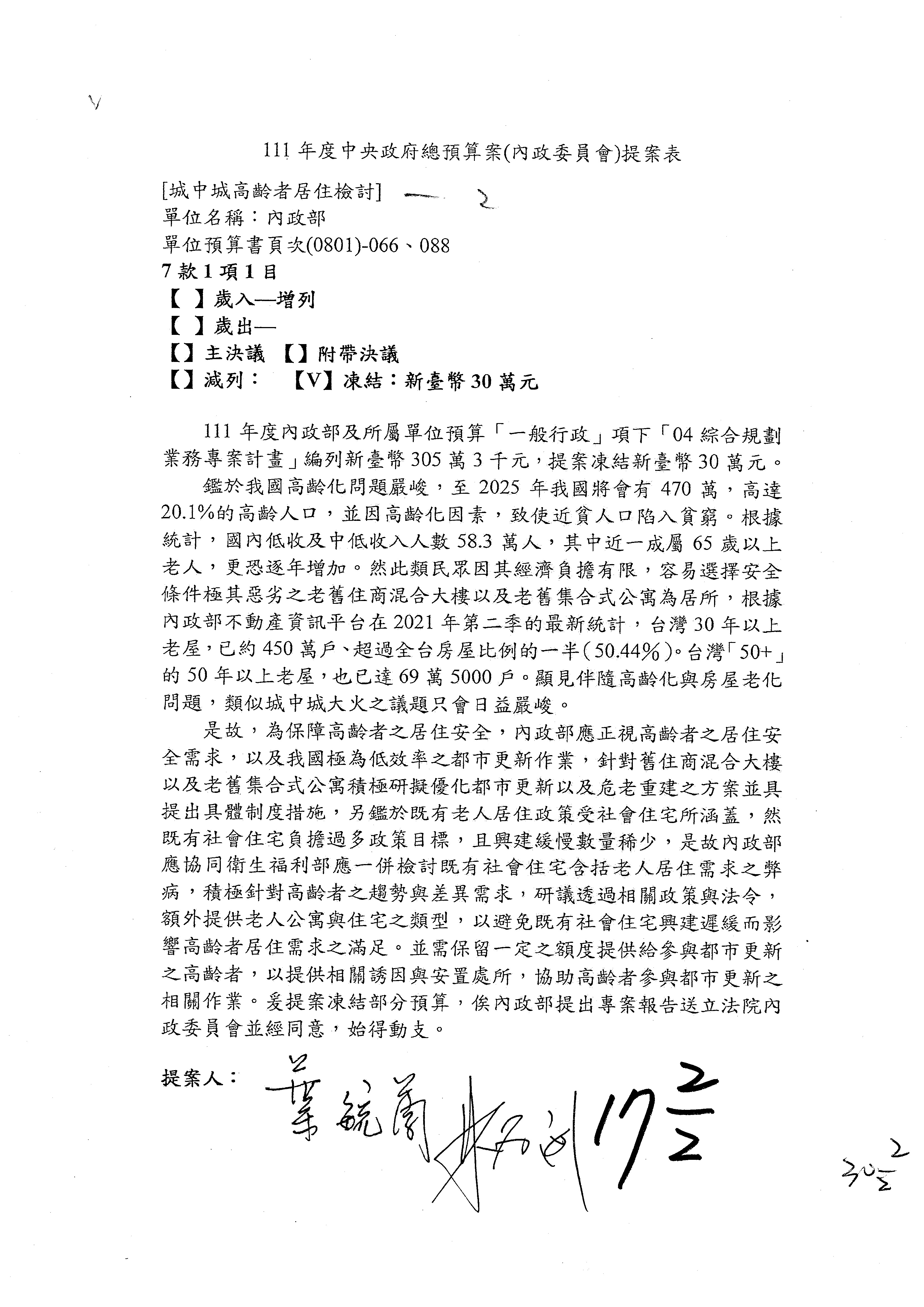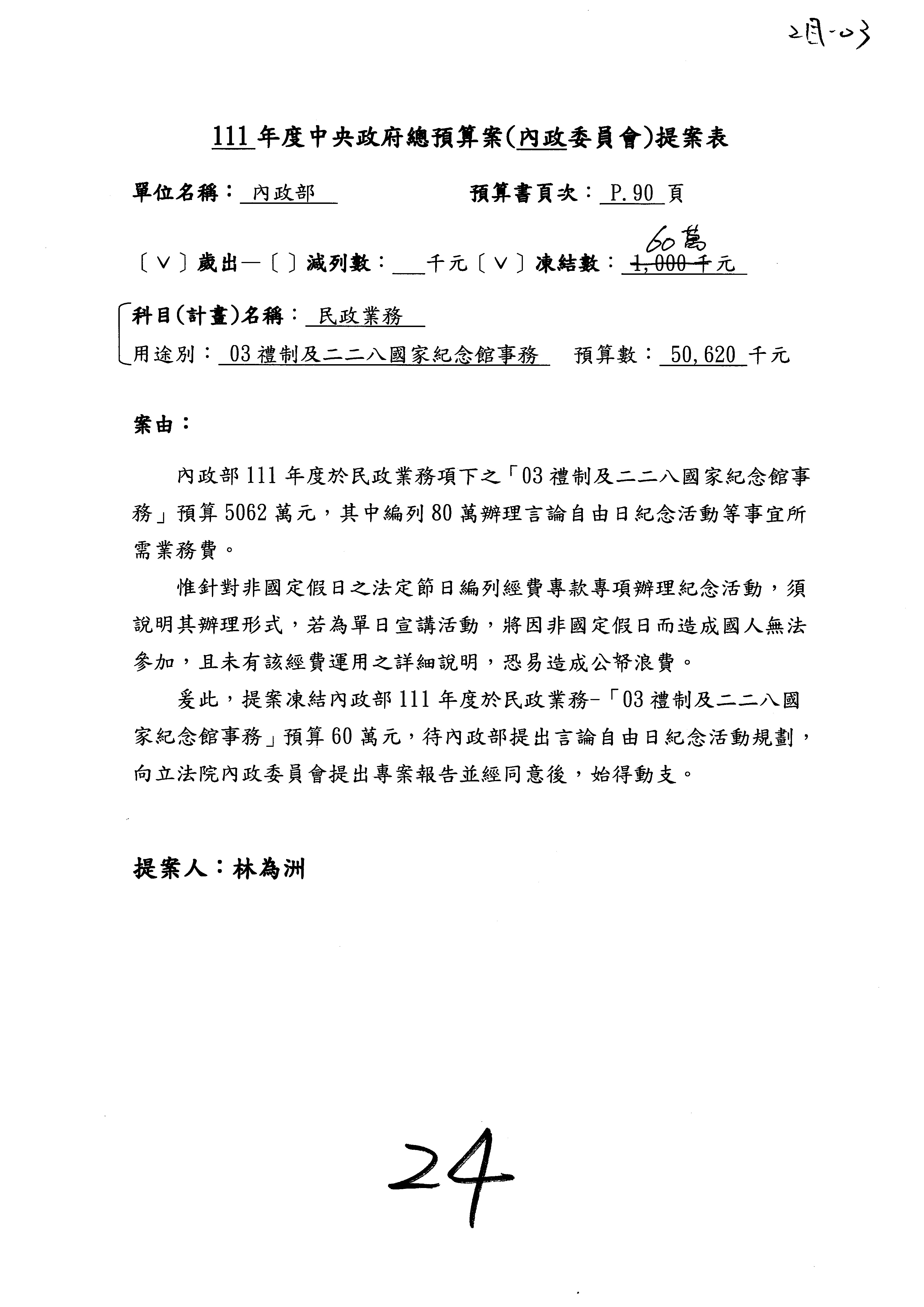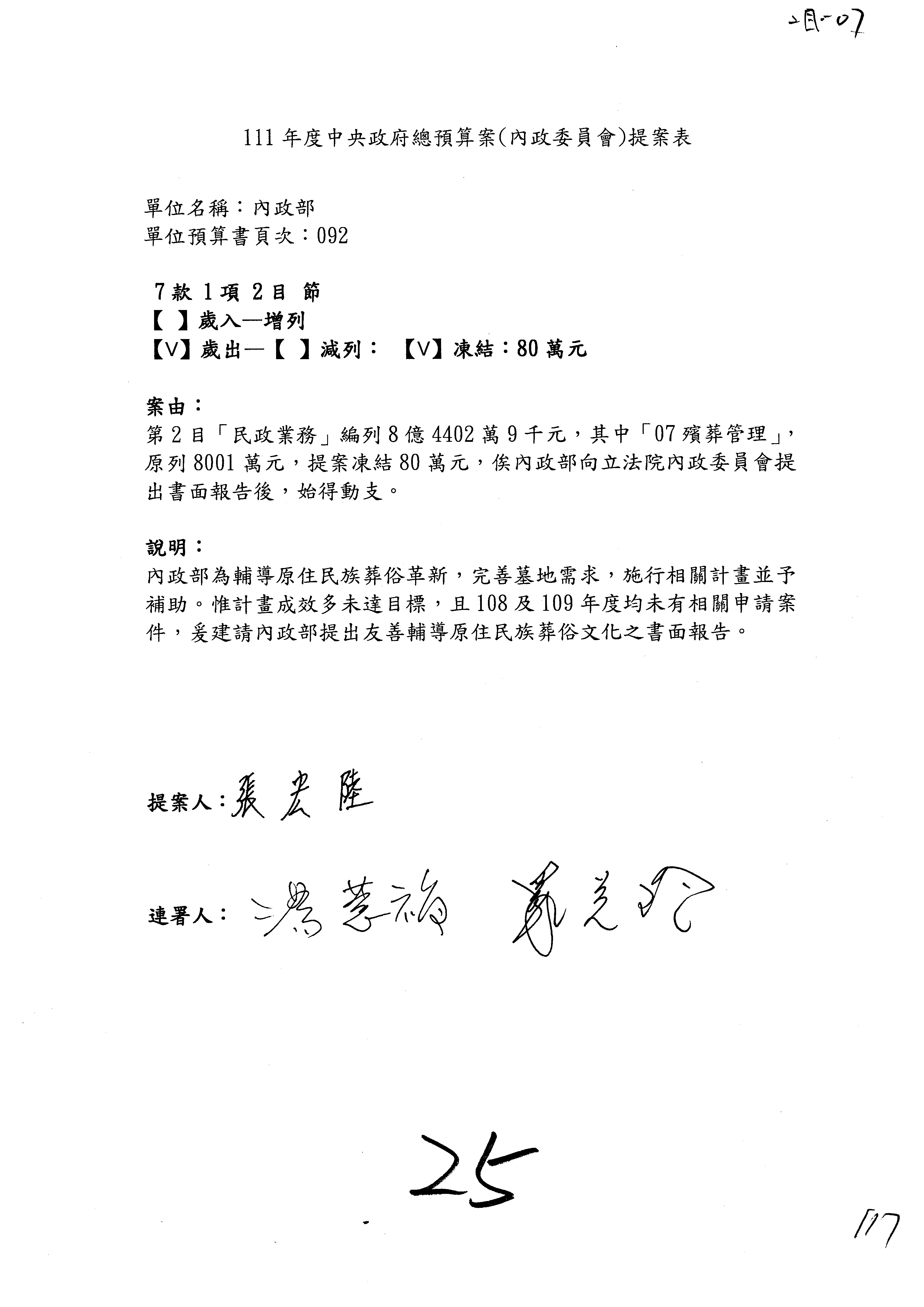 第2目「民政業務」,第23案、第25案撤案;第20案、第21案、第22案、第22-1案、第26案、第27案改主決議;第24案凍結10萬元,提出書面報告後,始得動支,其餘預算均照列。