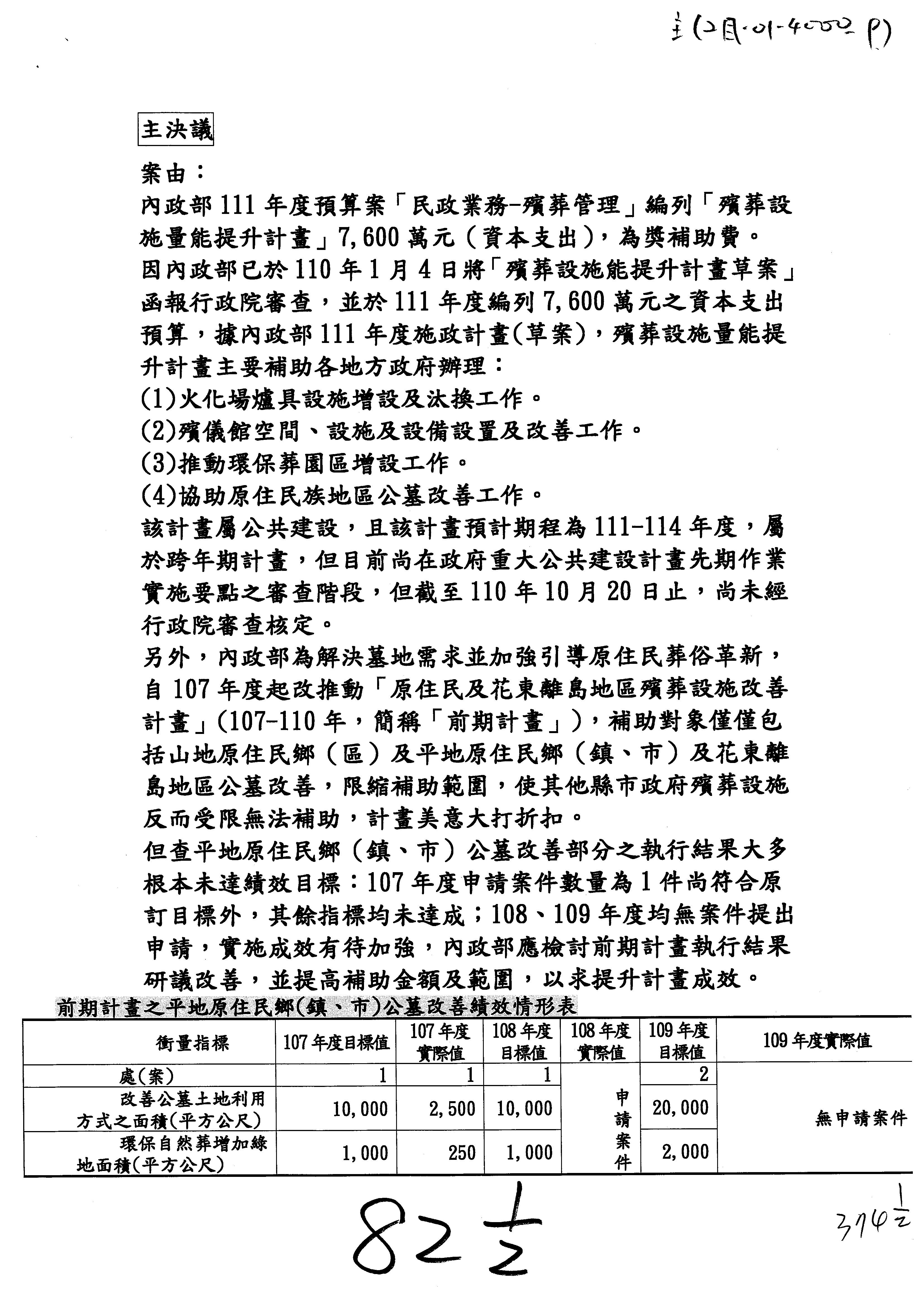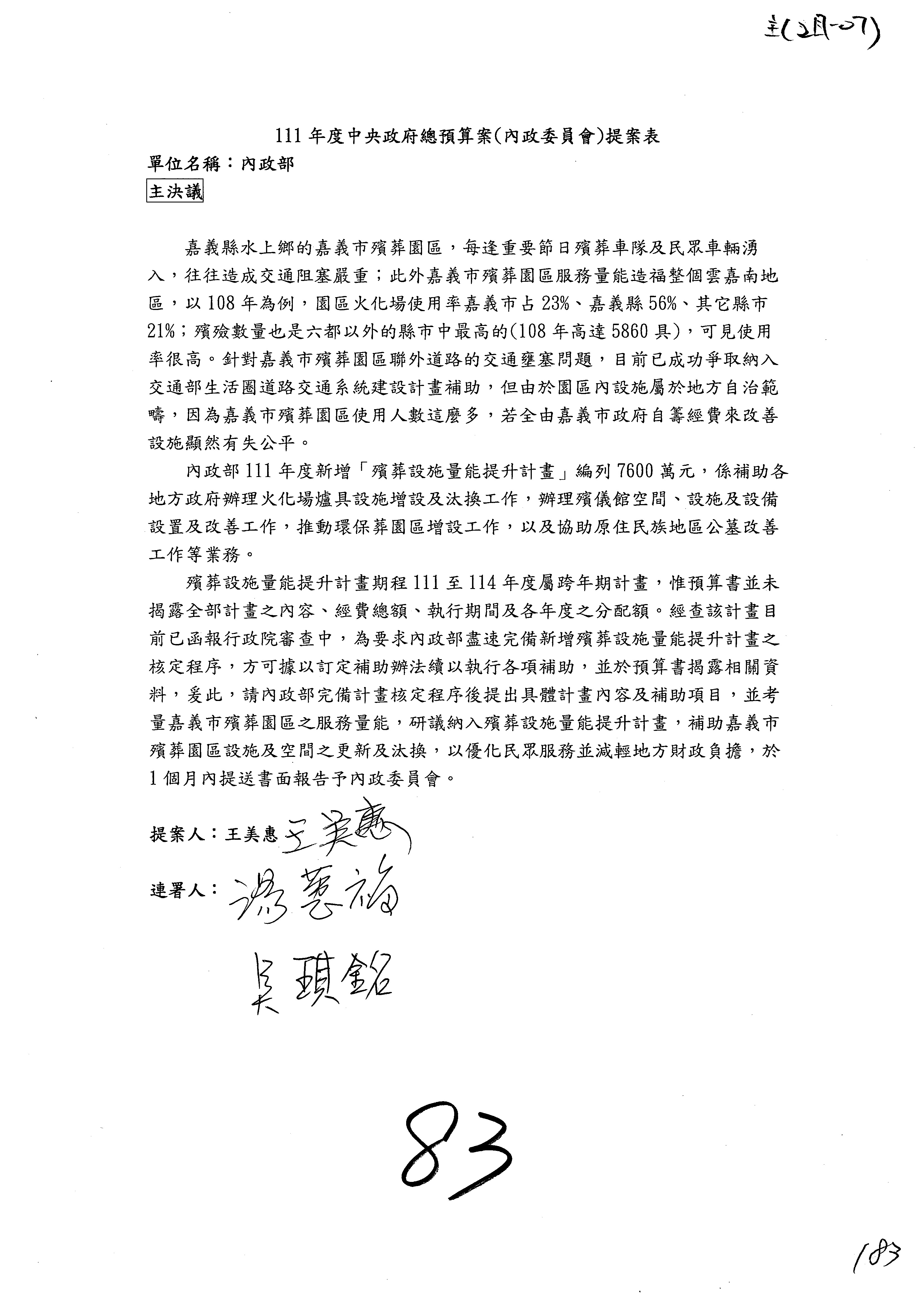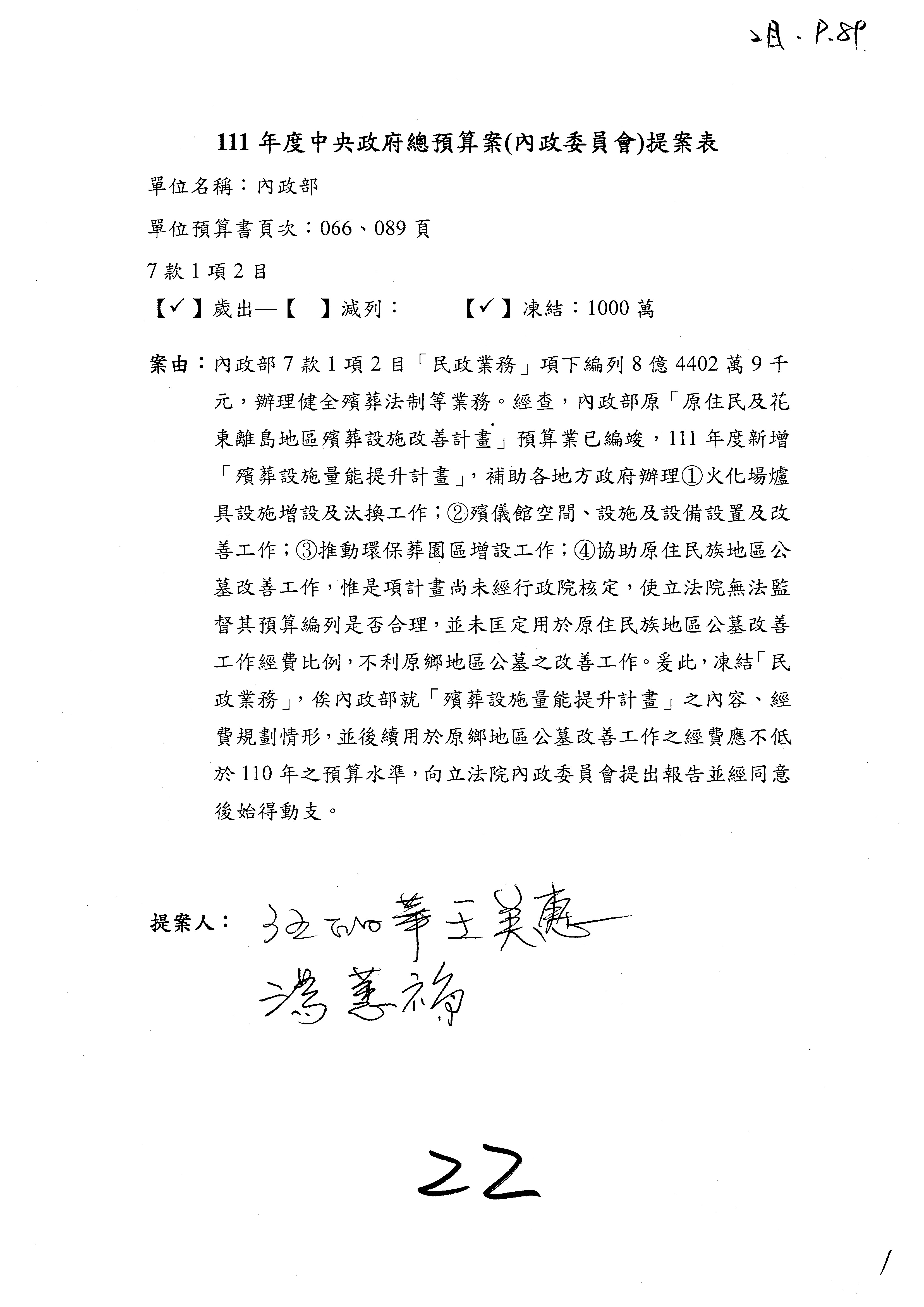 第22案第七行之「惟是項計畫尚未經行政院核定,使立法院無法監督其預算編列是否合理」予以刪除,「並未」改為「但未」;第五行末段修正為「爰此,內政部就『殯葬設施量能提升計畫』之內容、經費規劃情形,並後續用於原鄉地區公墓改善工作之經費應不低於107至110年合計預算水準,向立法院內政委員會提出書面報告」,其餘文字照案通過。
