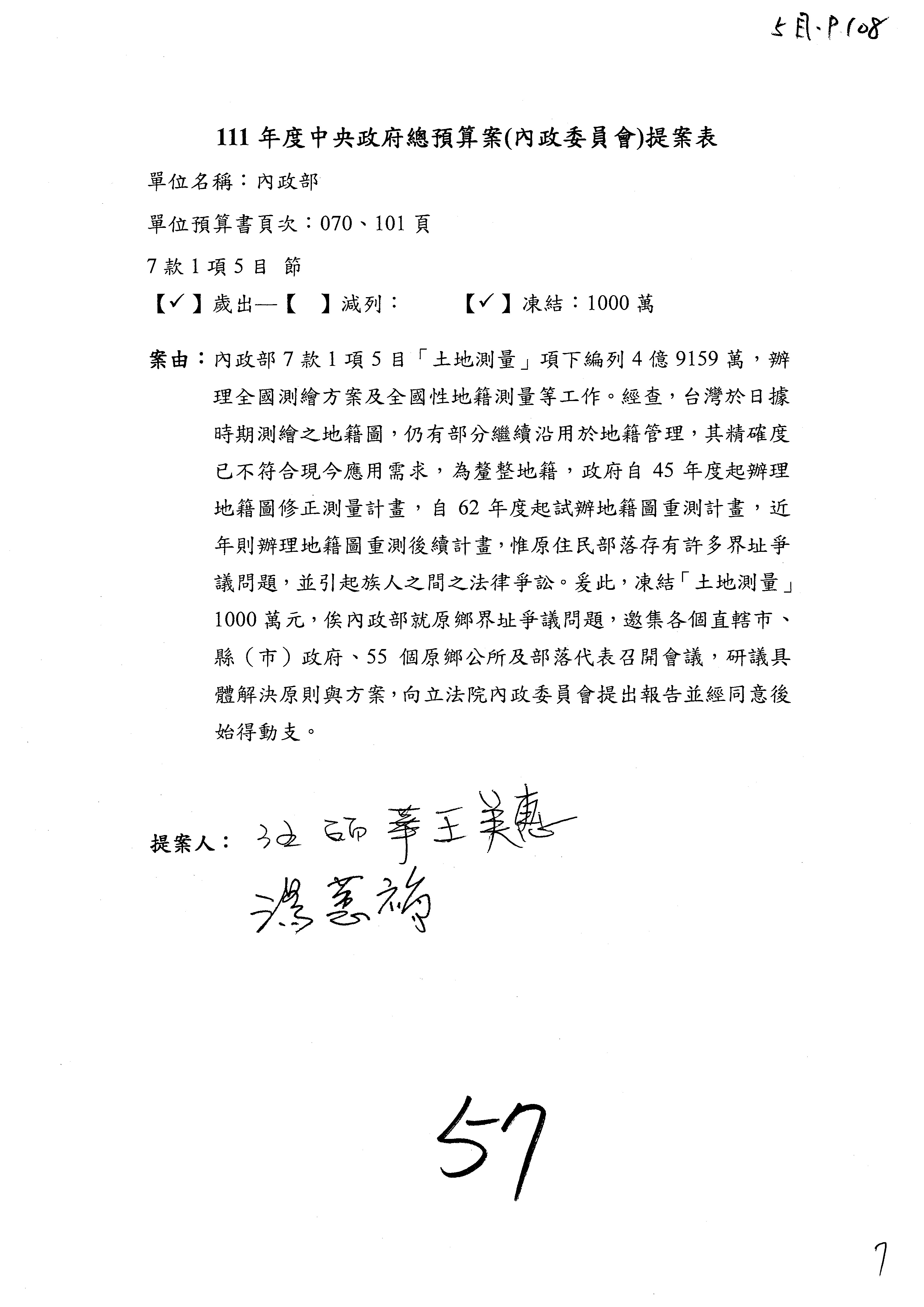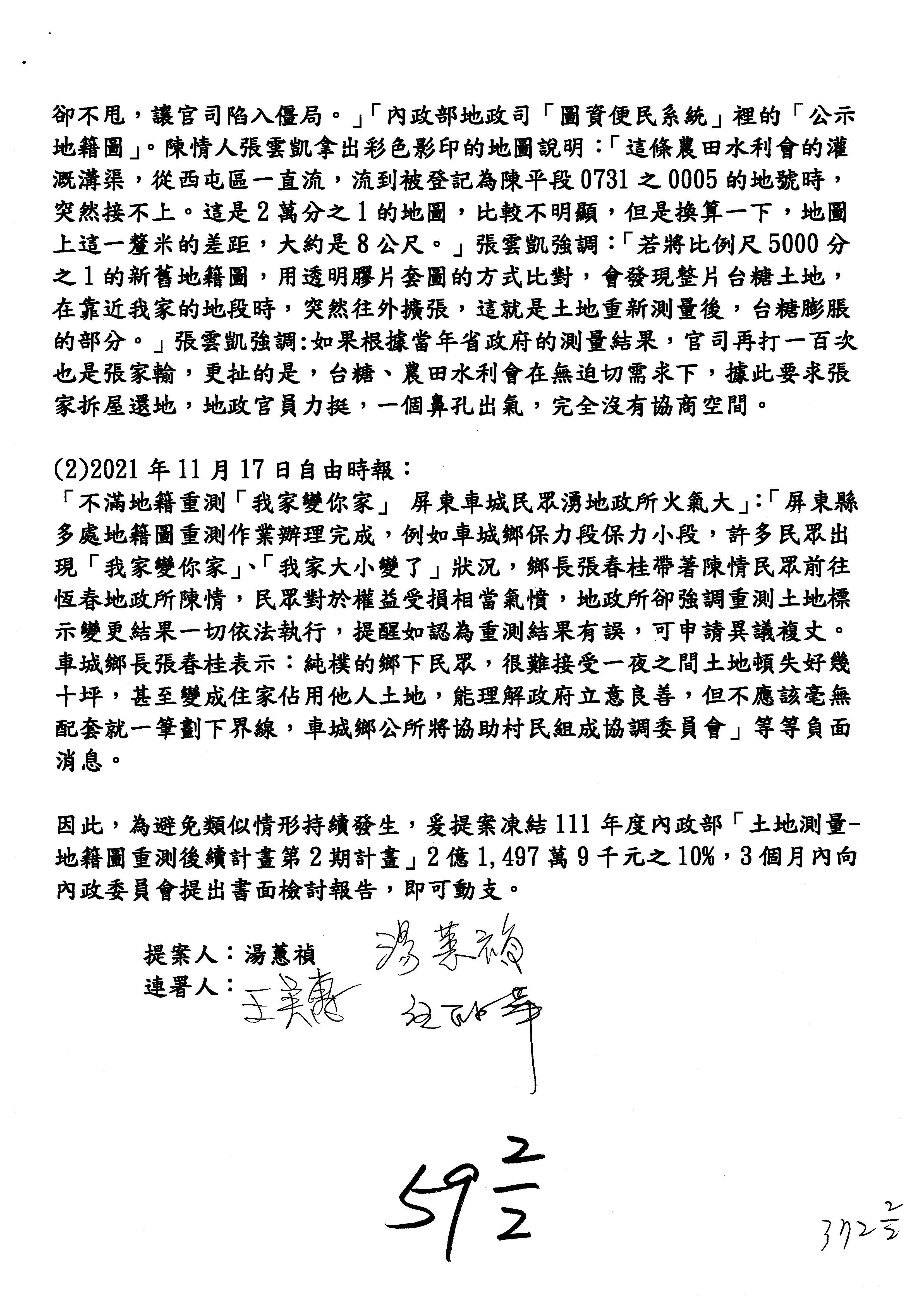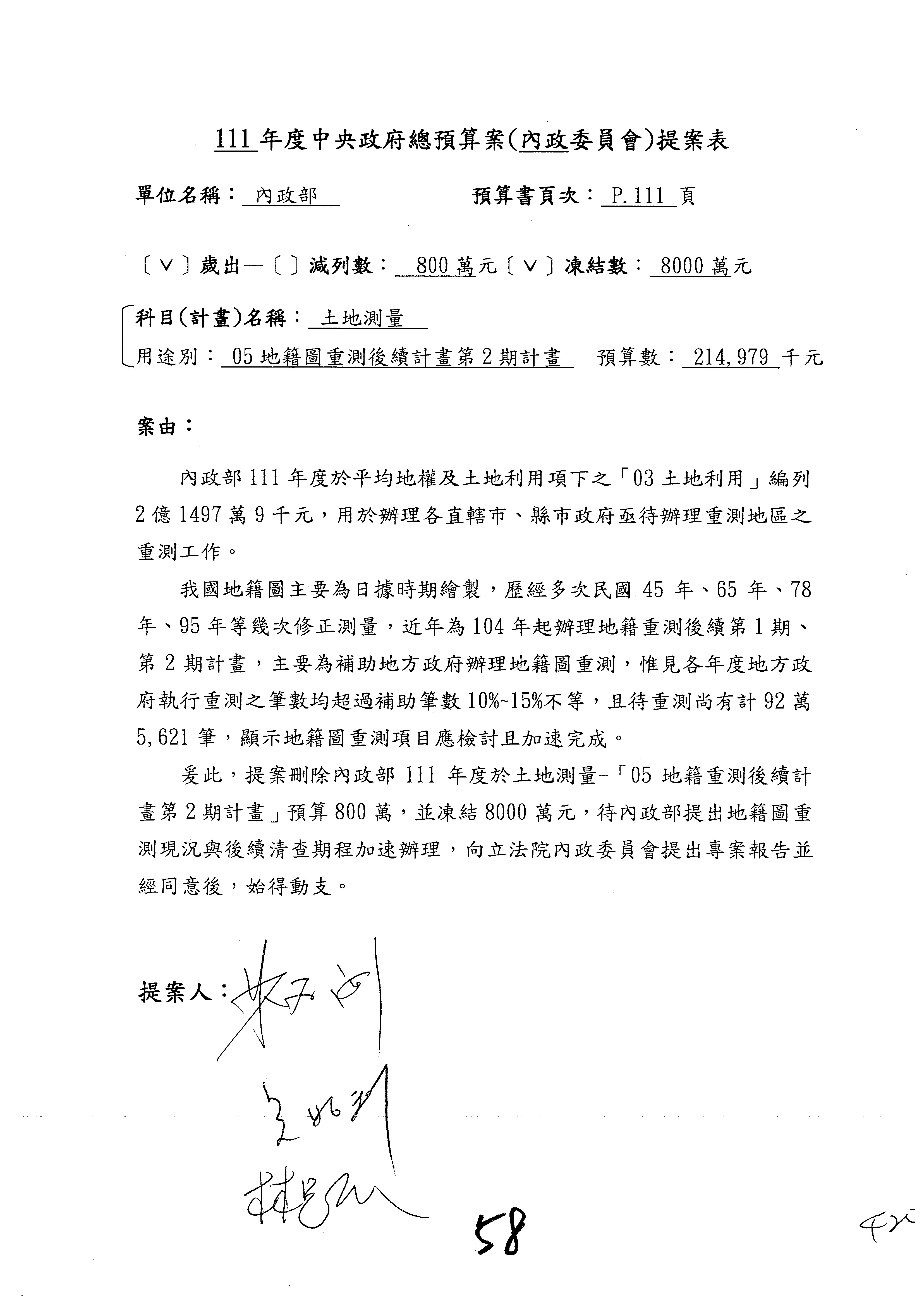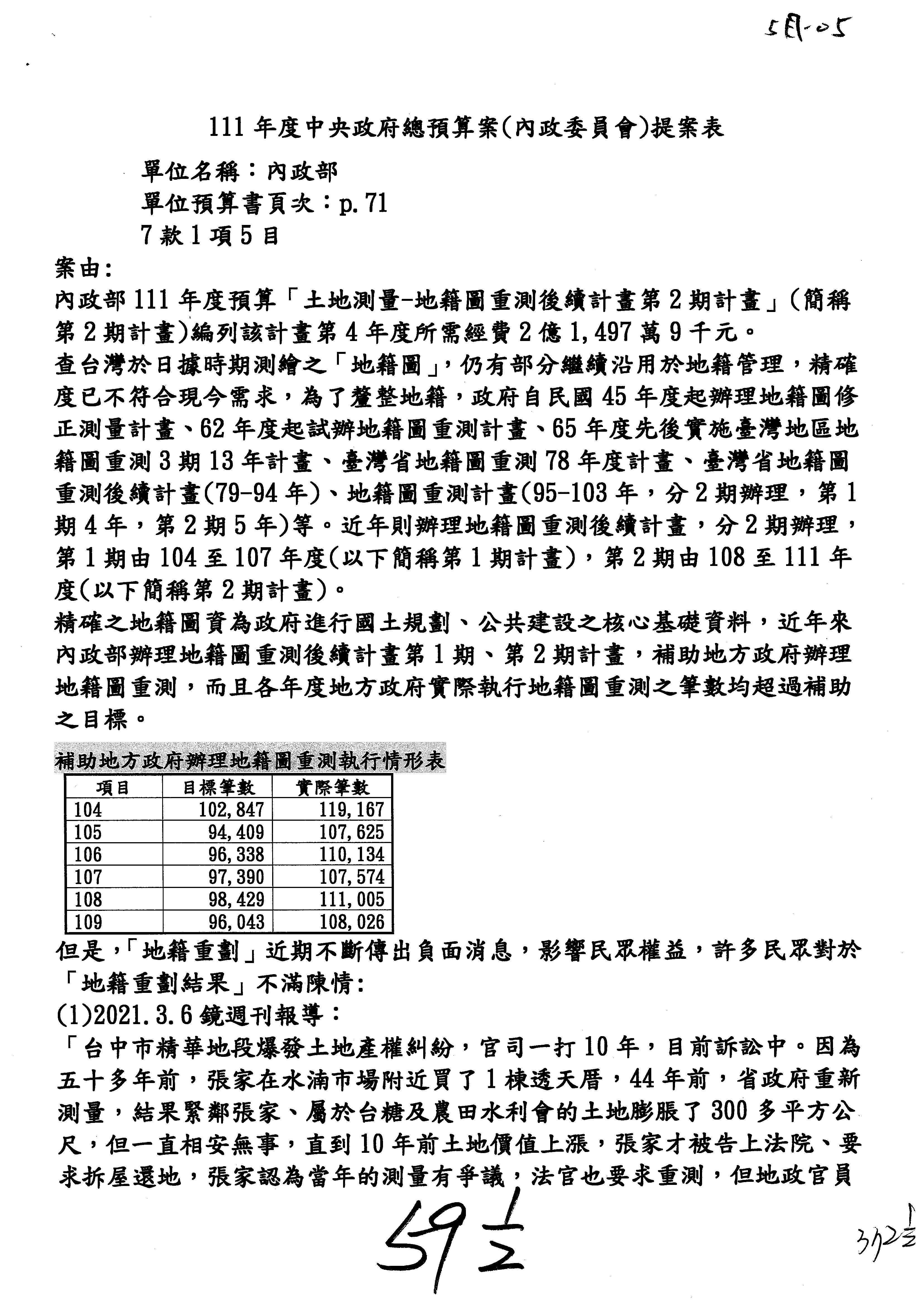 第5目「土地測量」,第57案改為主決議;第58案及第59案凍結500萬元,提出書面報告後,始得動支。