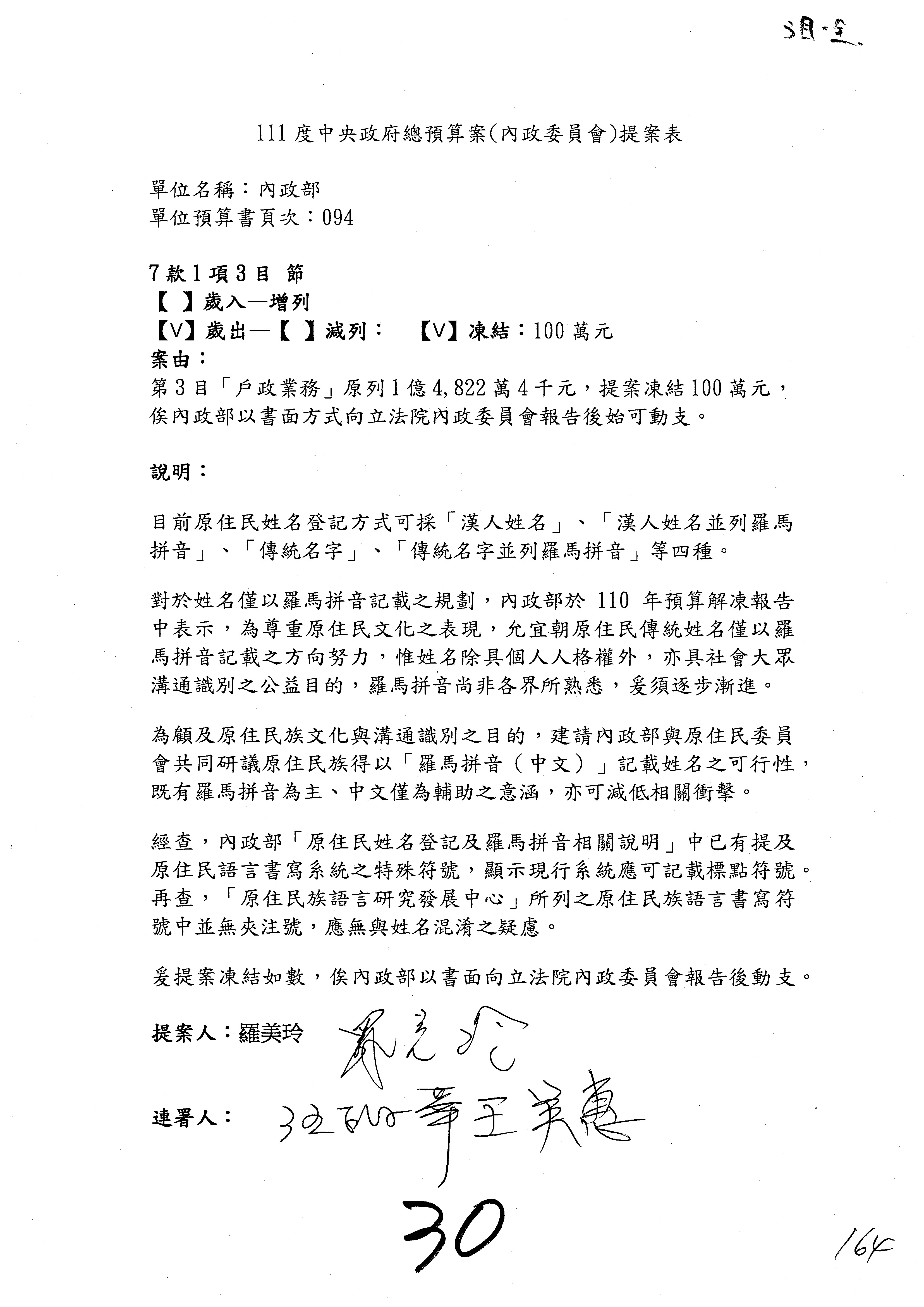 第30案第四段予以刪除;第五段修正為「爰請內政部於四個月內向立法院內政委員會提出書面報告」,「後動支」文字予以刪除。