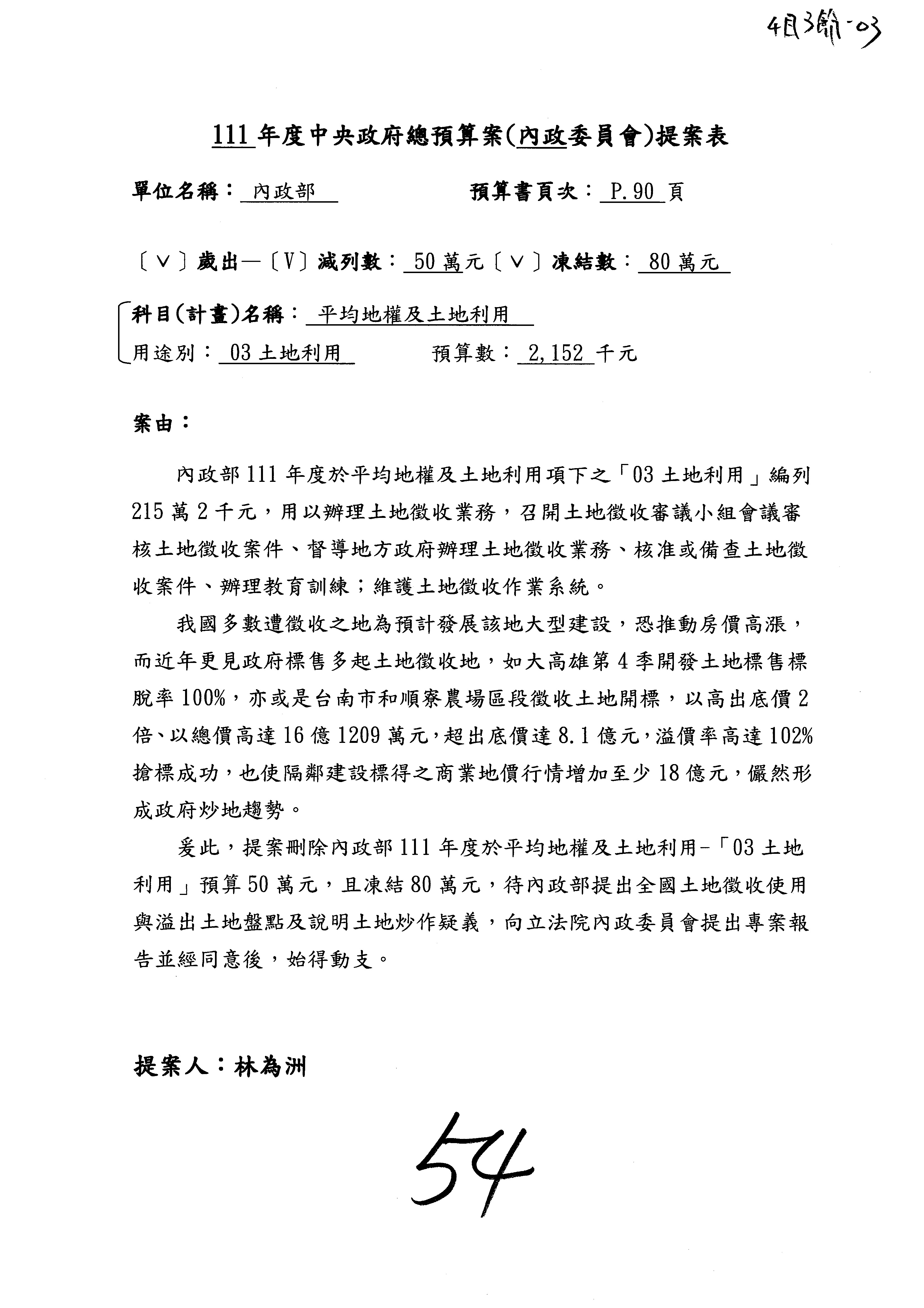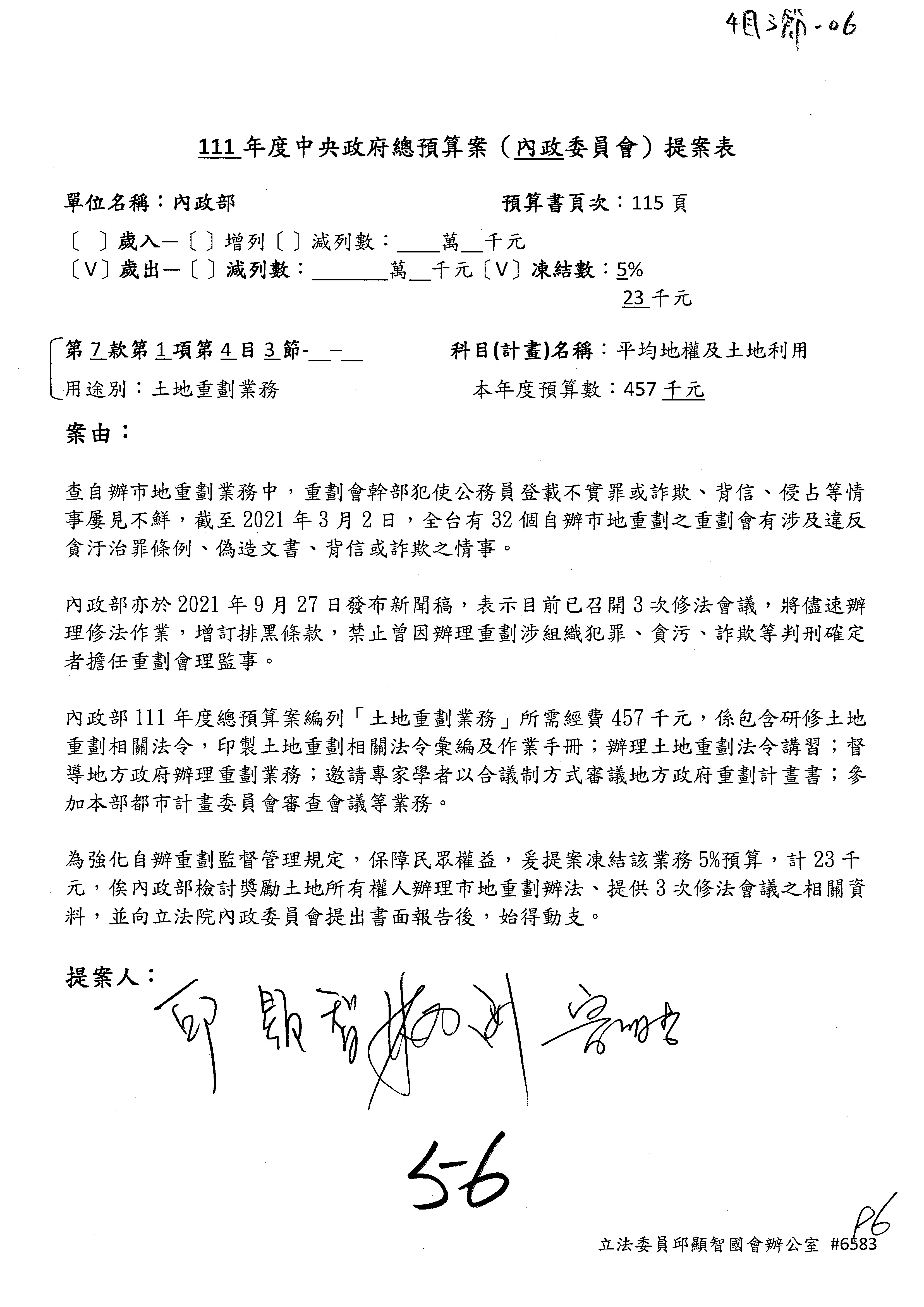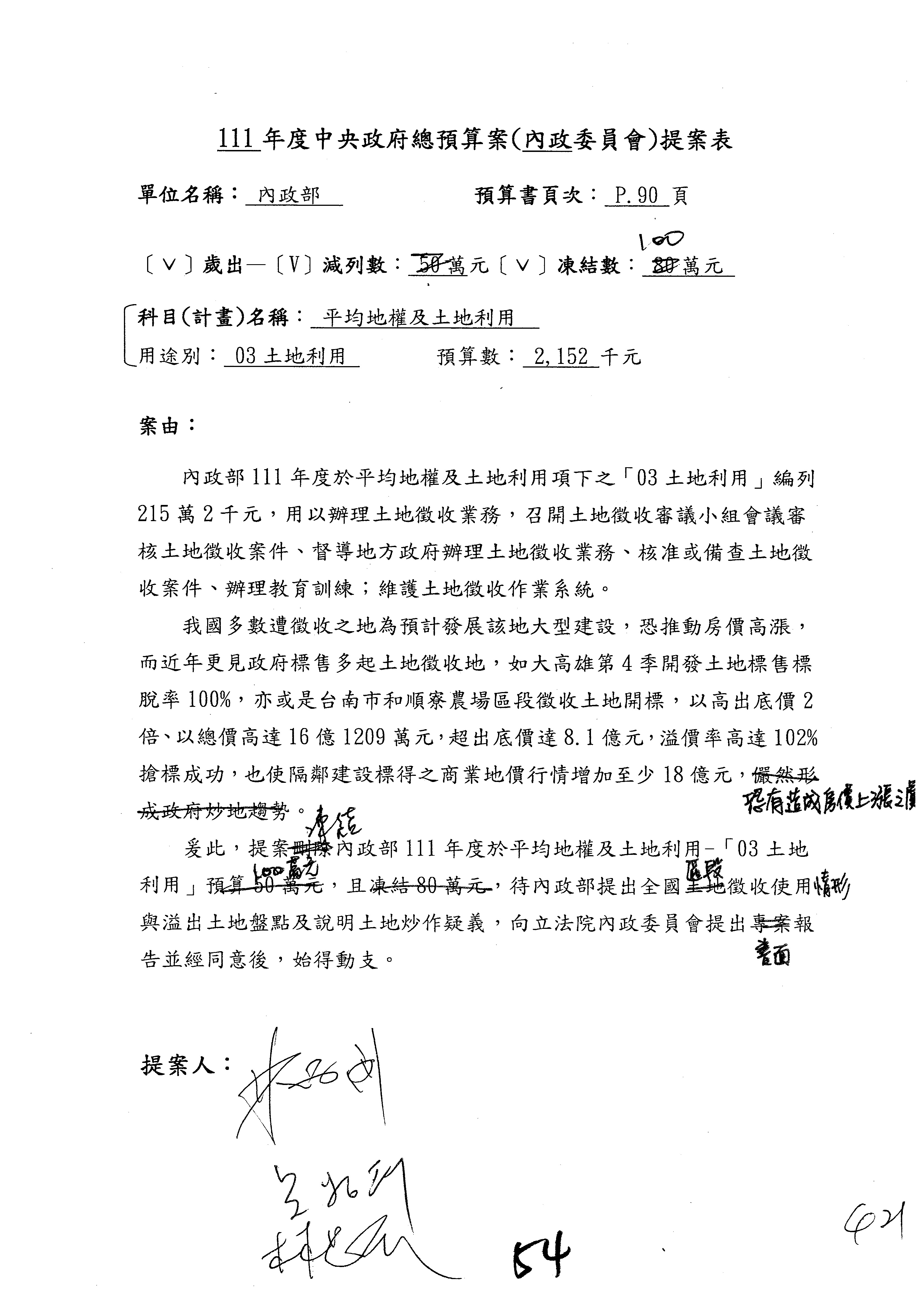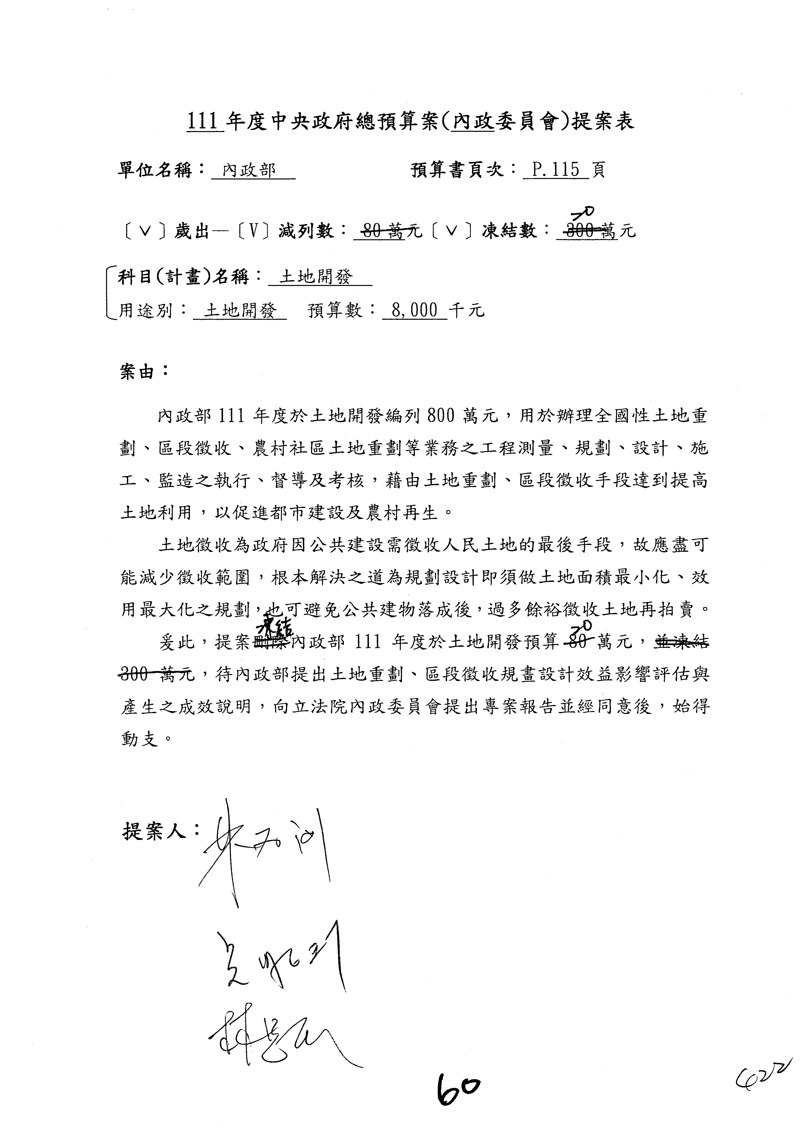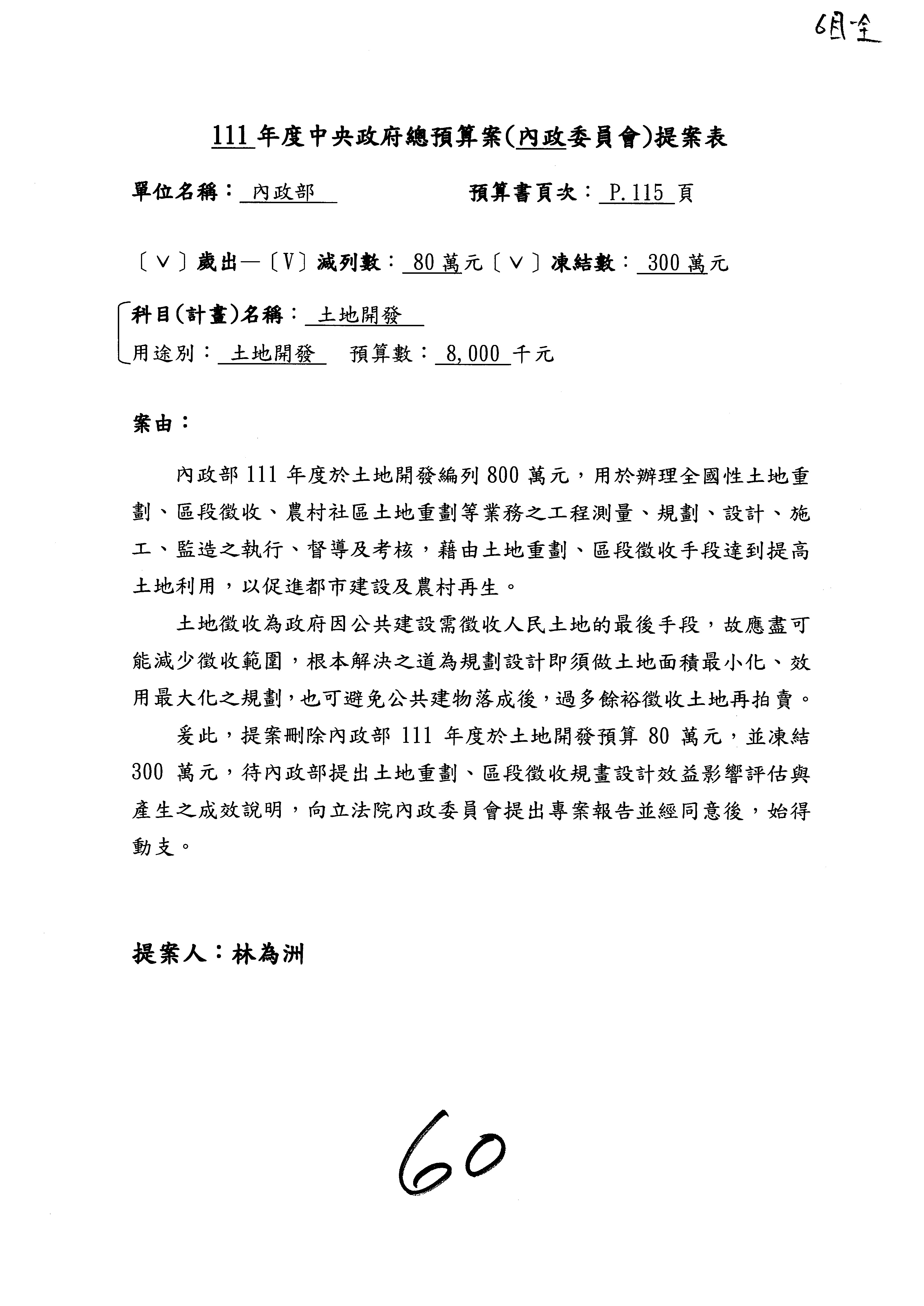 第6目「土地開發」,凍結20萬元,提出書面報告後,始得動支。